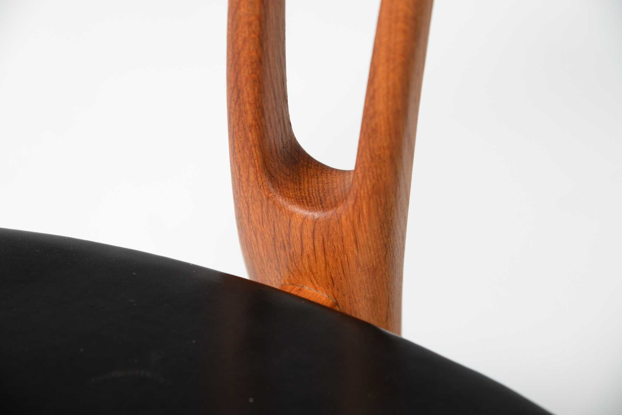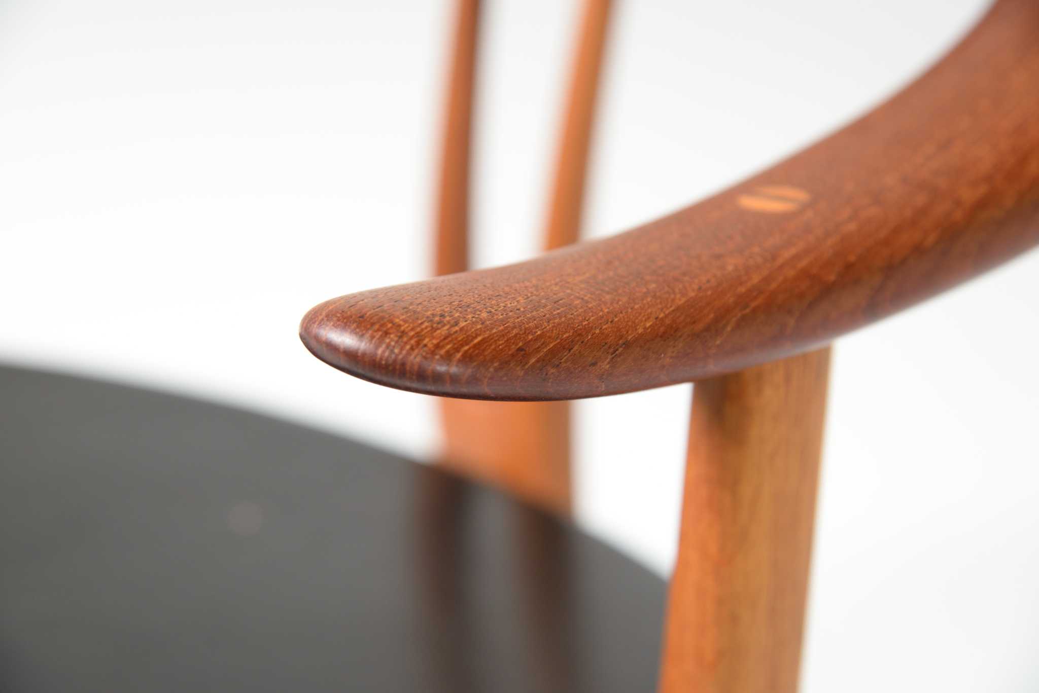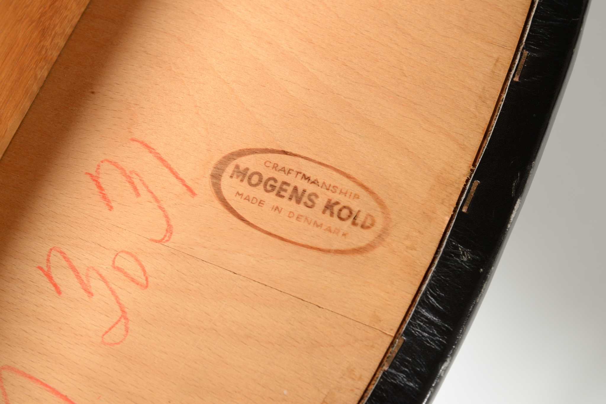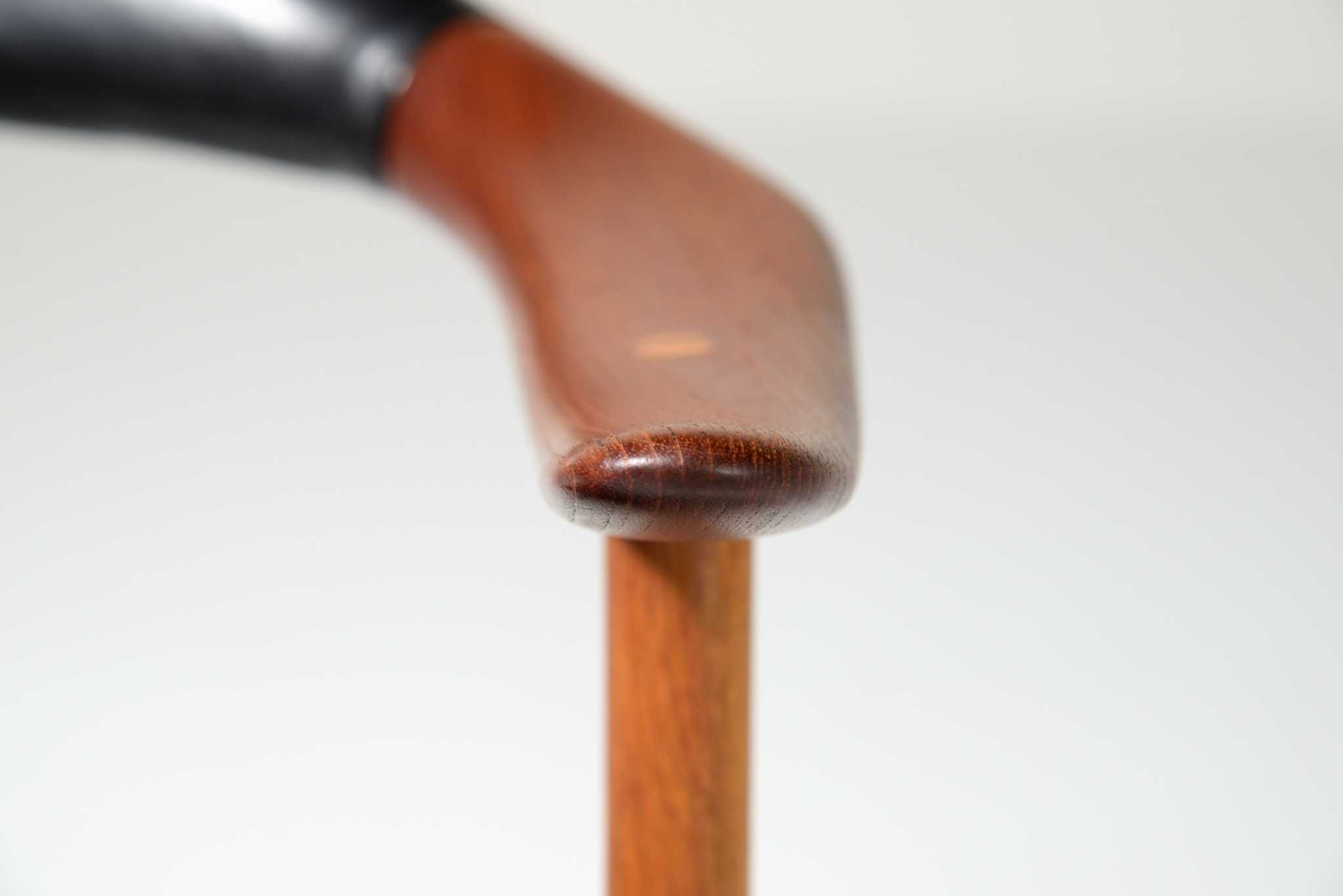 20世紀前中葉のデンマークで活躍した家具デザイナー、Arne Hovmand Olsen/アルネ・ホフマンド・オルセンによるアームチェアです。反り上がったアームと3本脚の構造が特徴的なモデルで、同年代の他の椅子に比べても異彩を放っています。思ったよりは安定しており座り心地も悪くはないですが、スカルプチャー的な用途が良さそうです。実用であれば比較的高身長の方におすすめです。皮革はオリジナルのようで、時代感も見応えがあります。