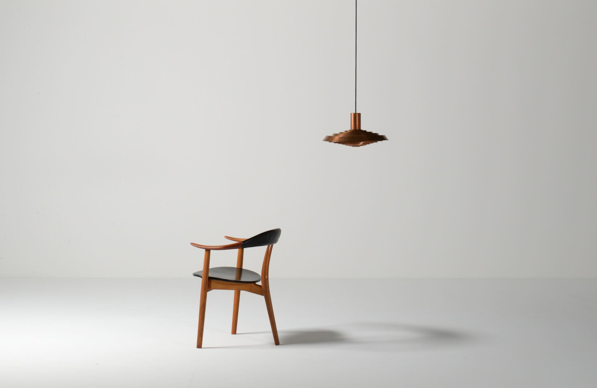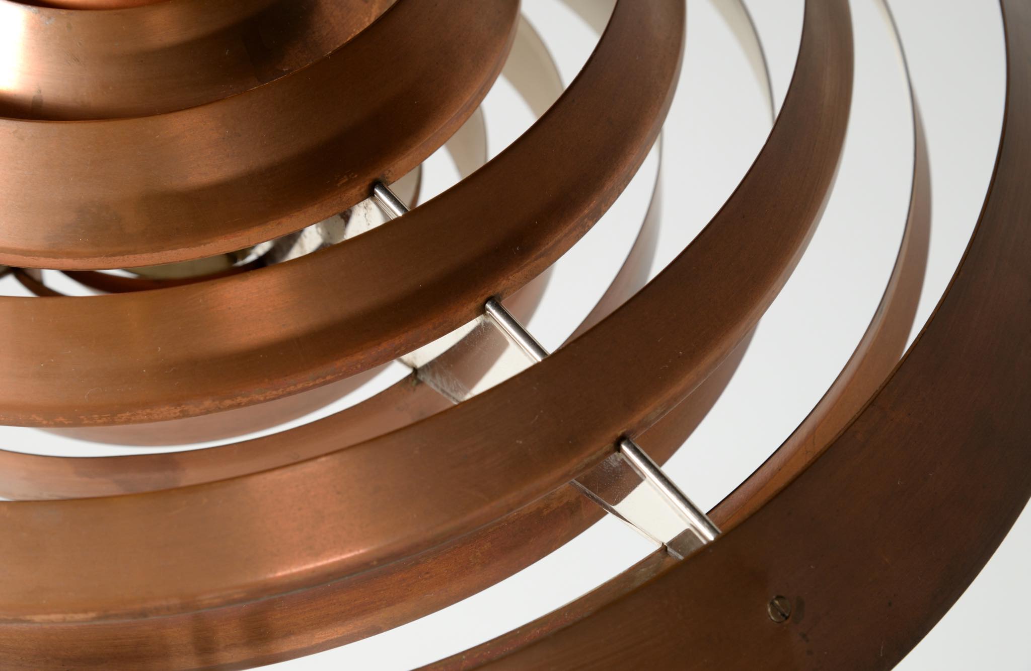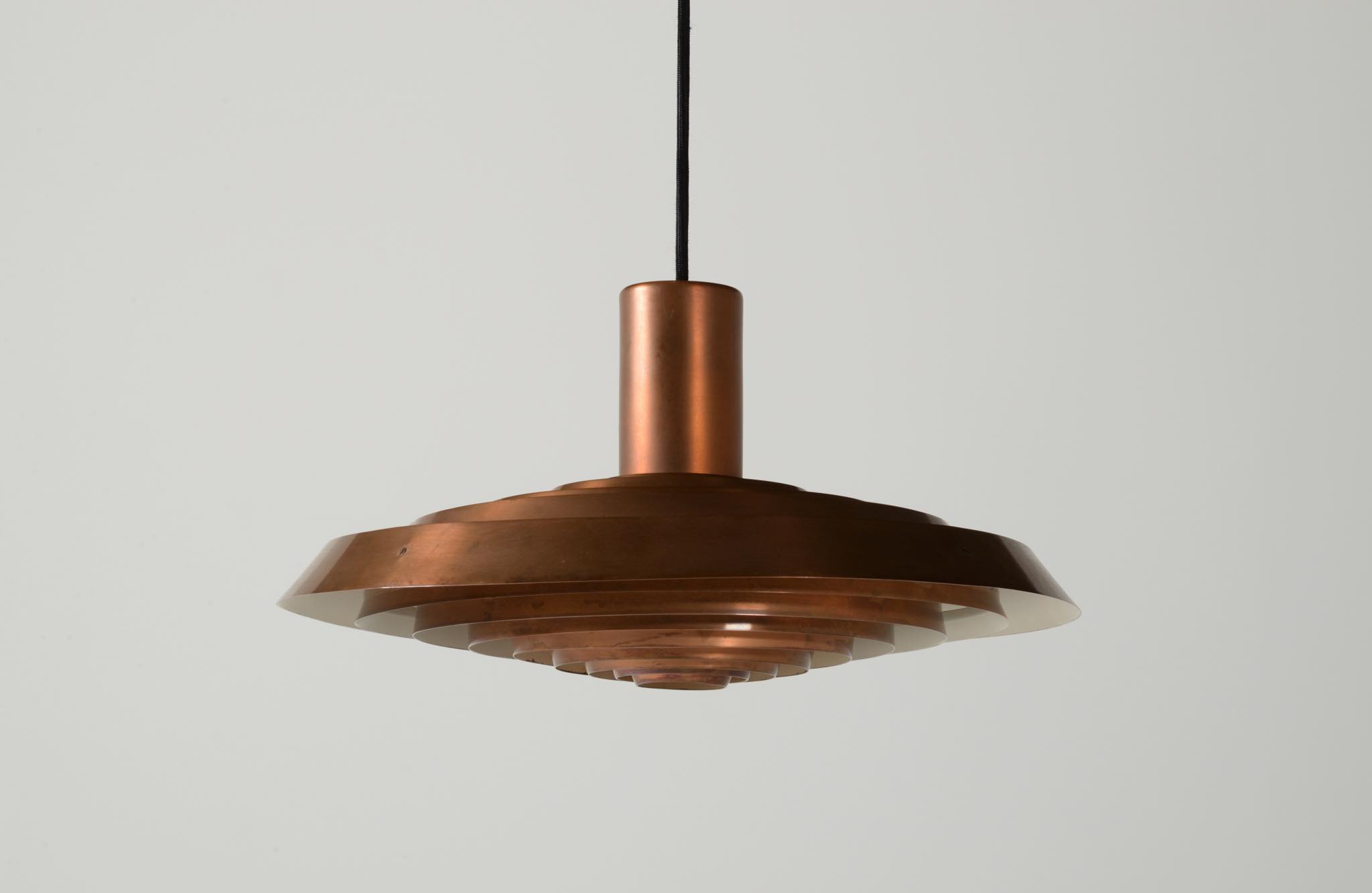デンマークのデザイナー、ポール・ヘニングセンによってデザインされたペンダントランプです。コペンハーゲンのウォーターフロント、人魚姫の近くに位置するランゲリーニパビリオンのために設計、1958年に発表されました。「Tallerken/お皿」と称されたモデルで、銅の平板を用いており、ずしりと重量があります。銅素材の経年変化にも見応えがあります。柔らかい素材のため多少の歪みが生じていますが、それほど気にはならない程度です。