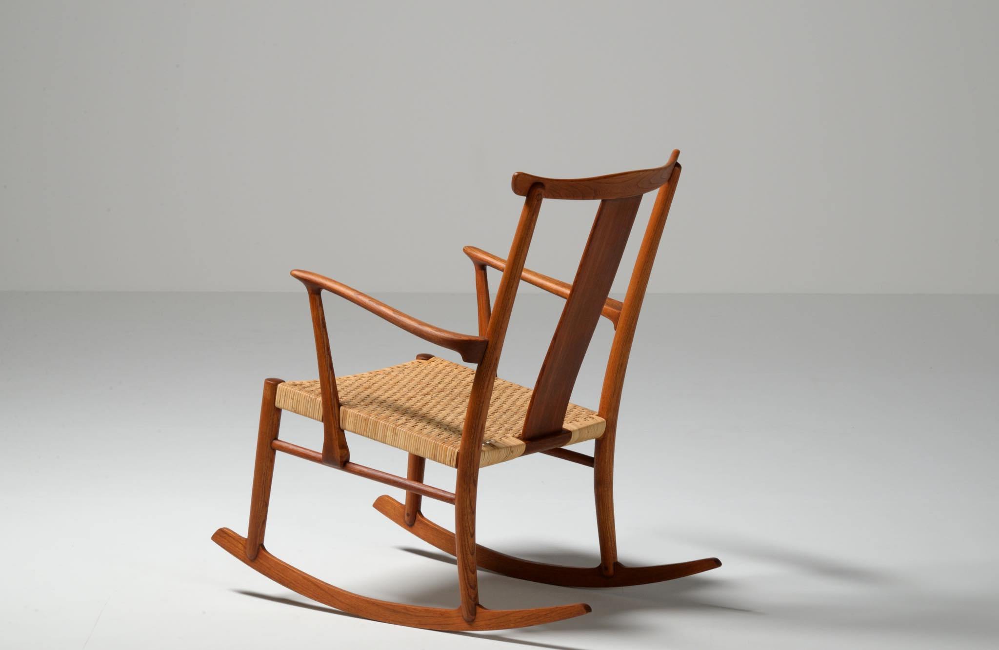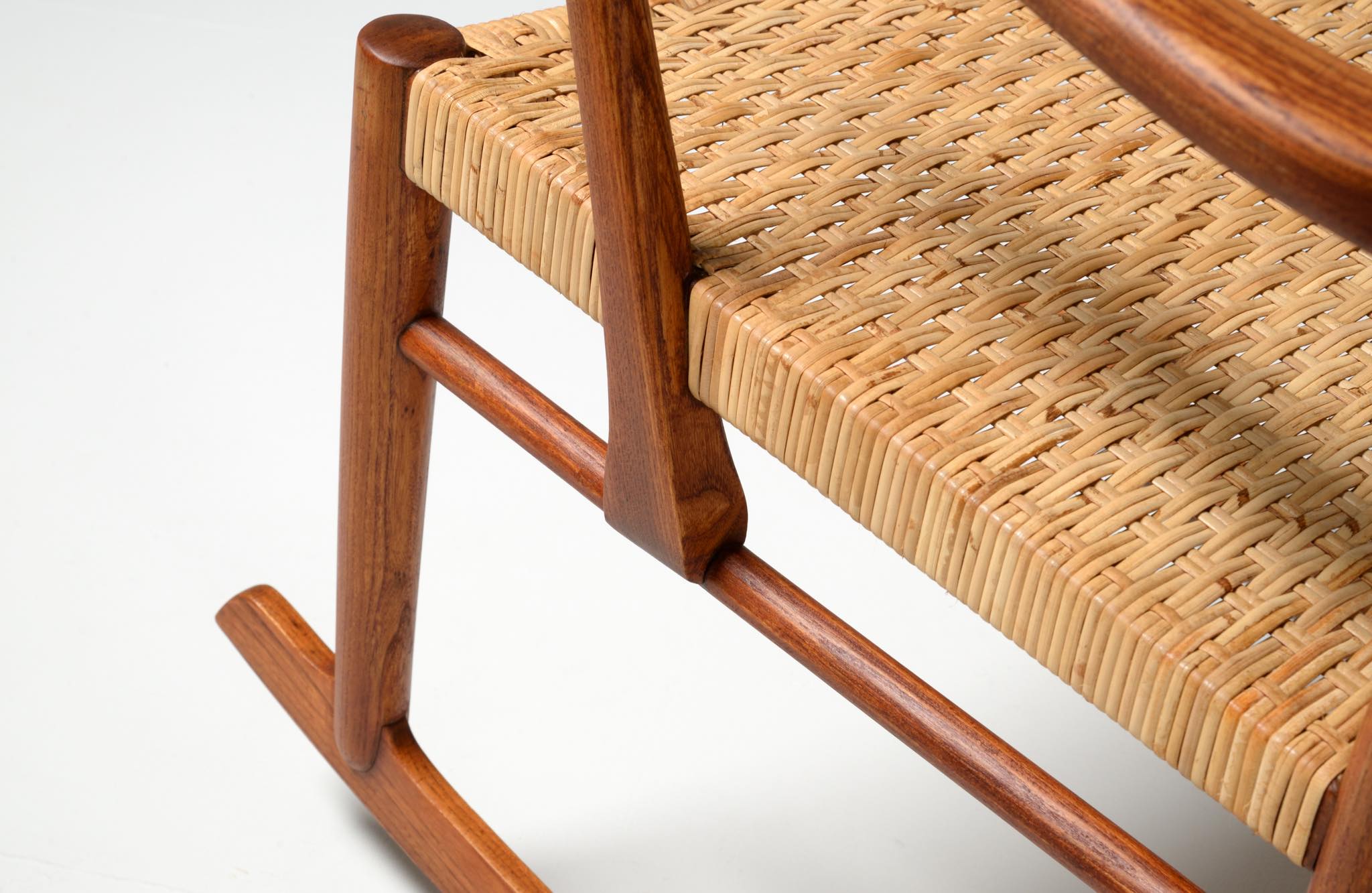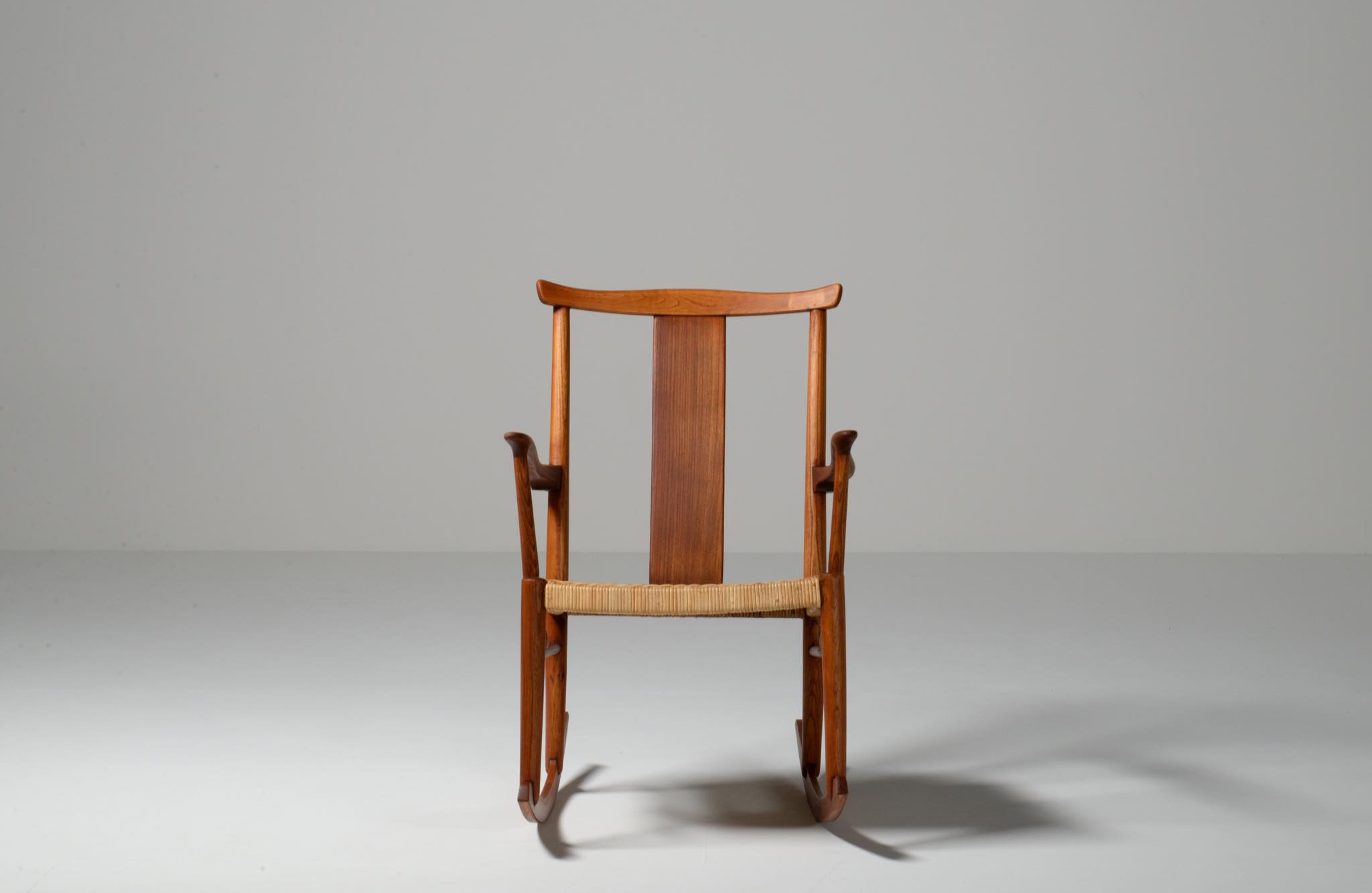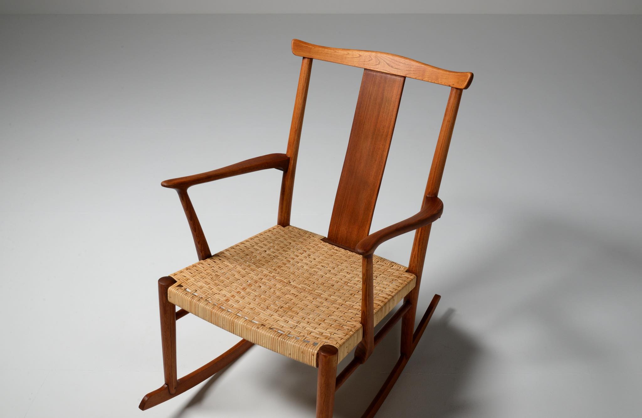 デンマークの家具デザイナー、Aksel O. Larsen/アクセル・ラーセンによる"model 1773"ロッキングチェアです。1942年にフリッツ・ハンセン社より発表されたモデルで、中国明時代後期の上流階級の間で流行した、Yoke-back arm chair/ヨークバック (官吏の帽子椅子) からインスパイアされたようです。フレームはエルム材、籐のシートはかつて張り替えられているようで、良い経年感です。