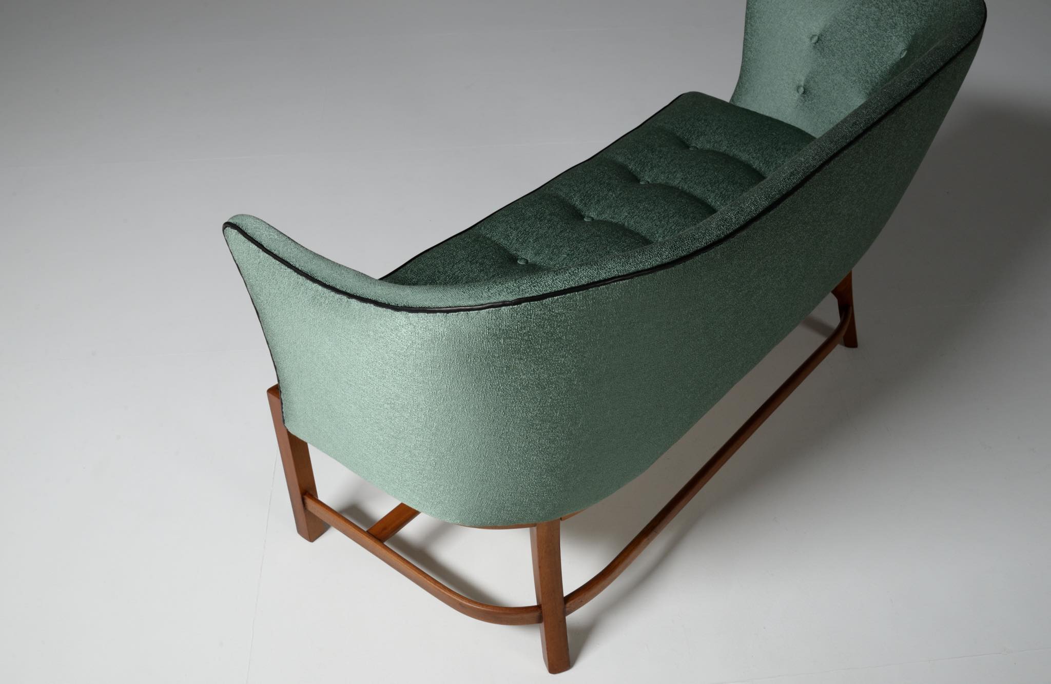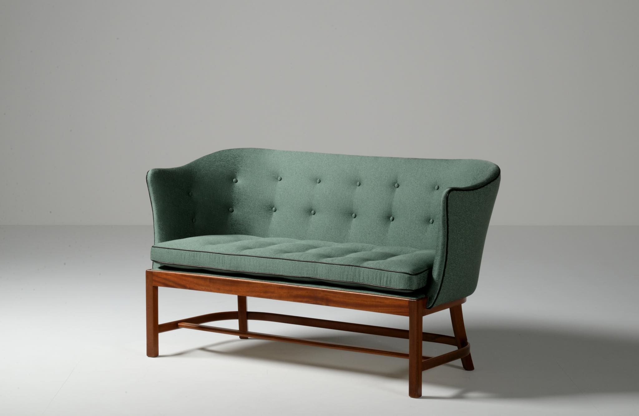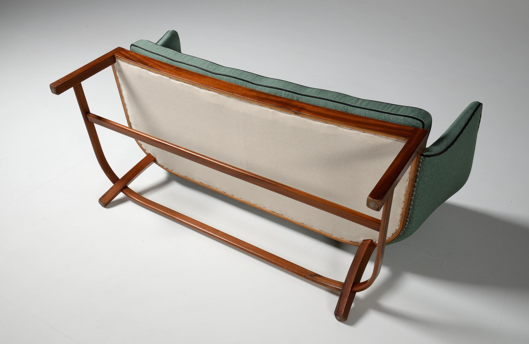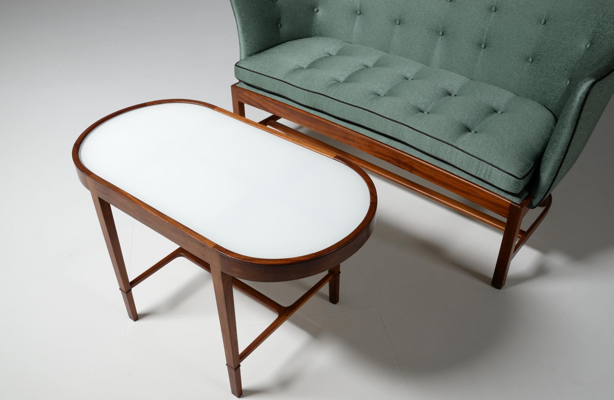 20世紀前中葉に活躍したデンマークの家具デザイナー兼キャビネットメーカーのヤコブ・ケアによるセッティとコーヒーテーブルのセットです。セッティは1945年にデザインされたもので、張り包みのシートを、キューバンマホガニーのフレームに乗せた構造が特徴的です。ファブリックに傷みが見られたため、イタリアのファブリックブランド、ロロ・ピアーナインテリアのコットン系のファブリックを用いて張り替えました。テーブルもヤコブ・ケアによる1940年代の作品として求めたもので、こちらもキューバンマホガニー材が用いられています。白濁したガラストップが特徴的です。こちらはセットでの販売となります。
