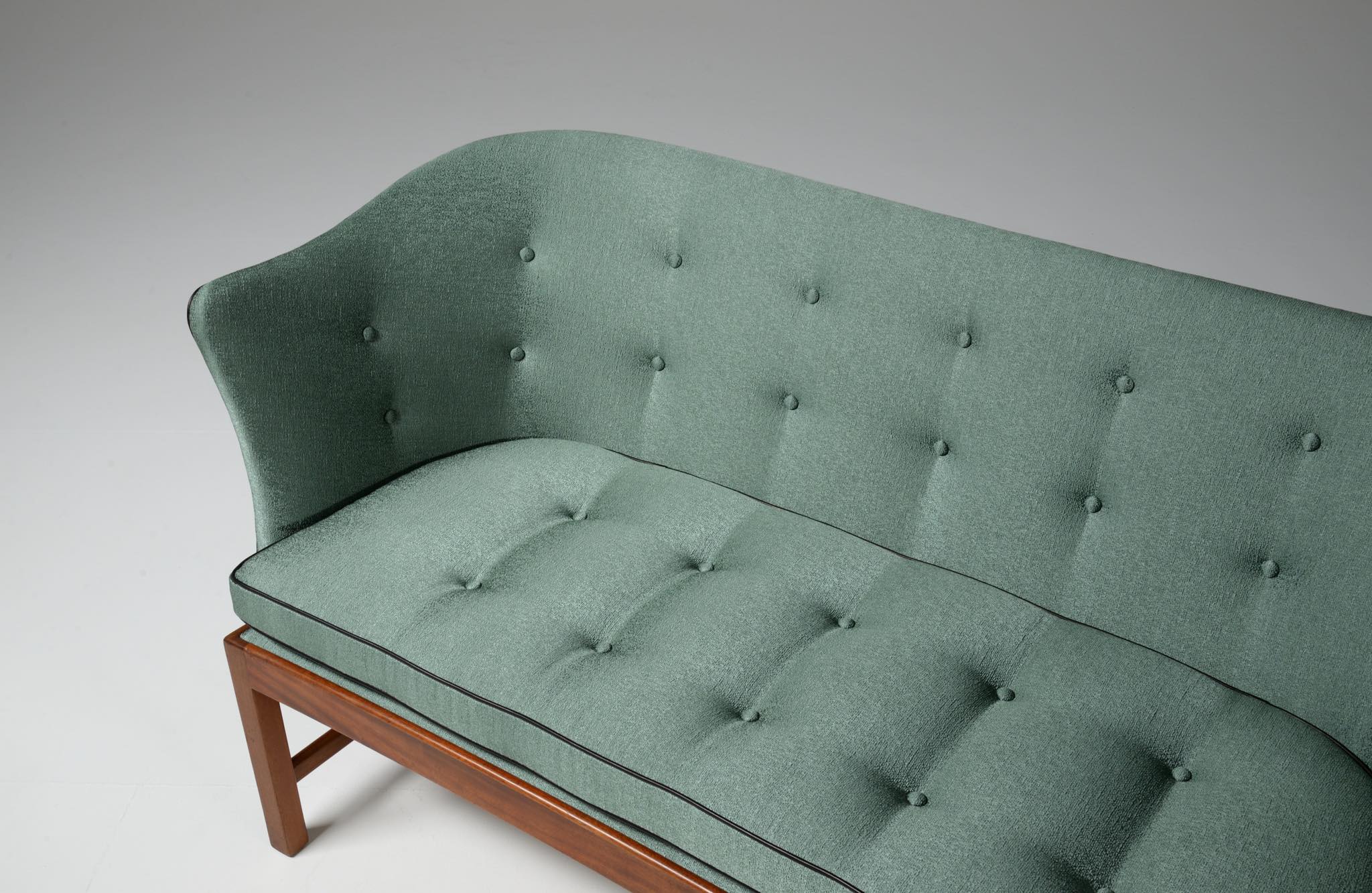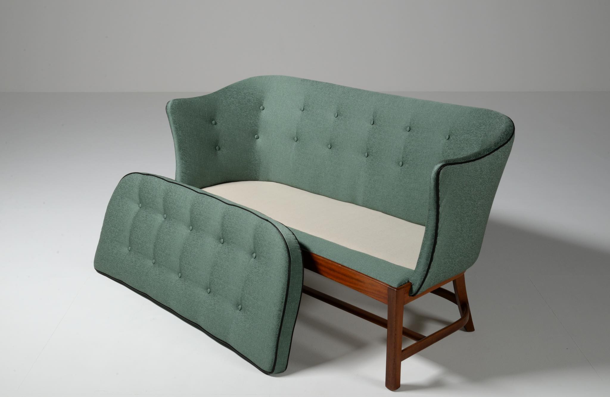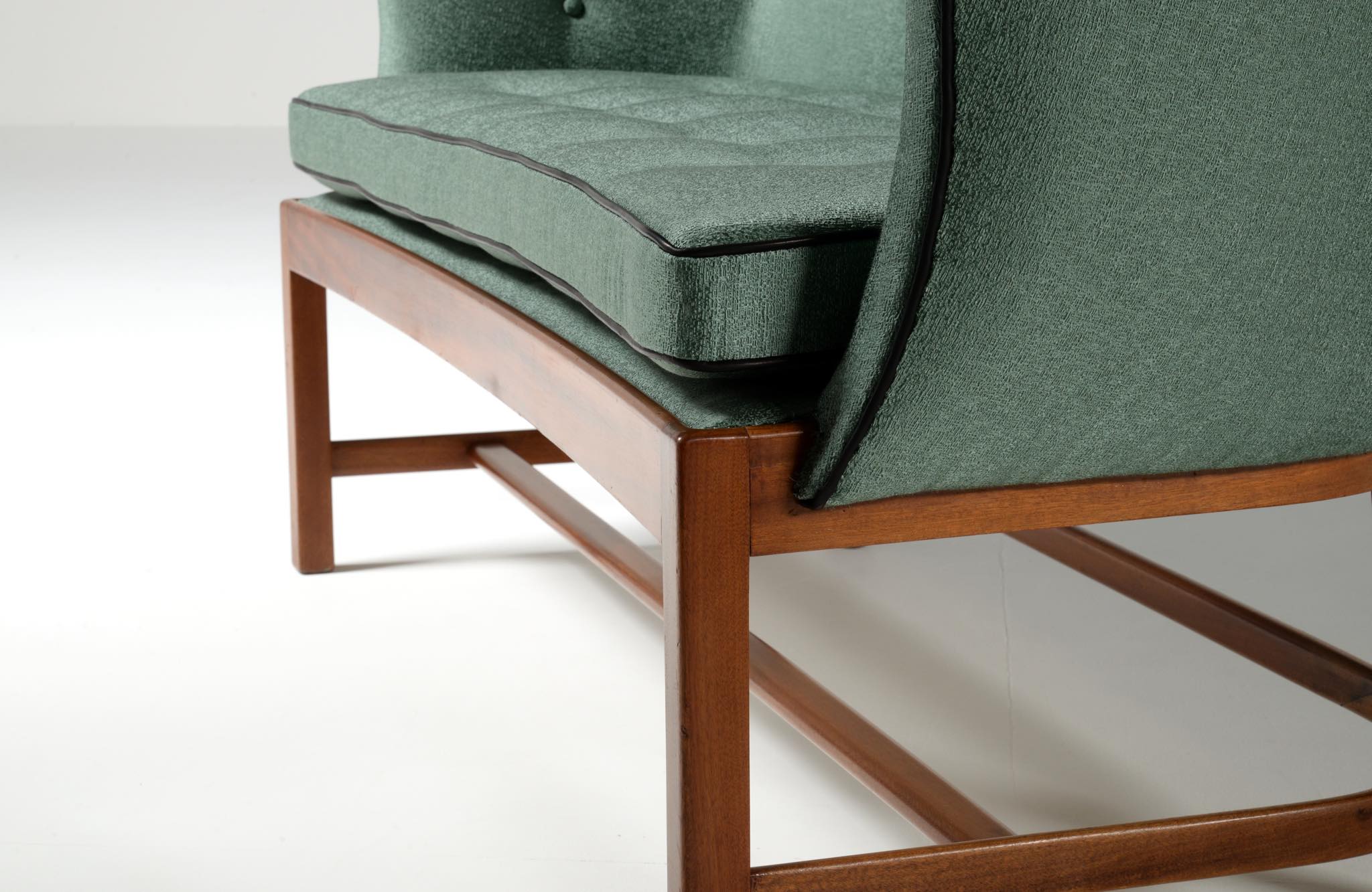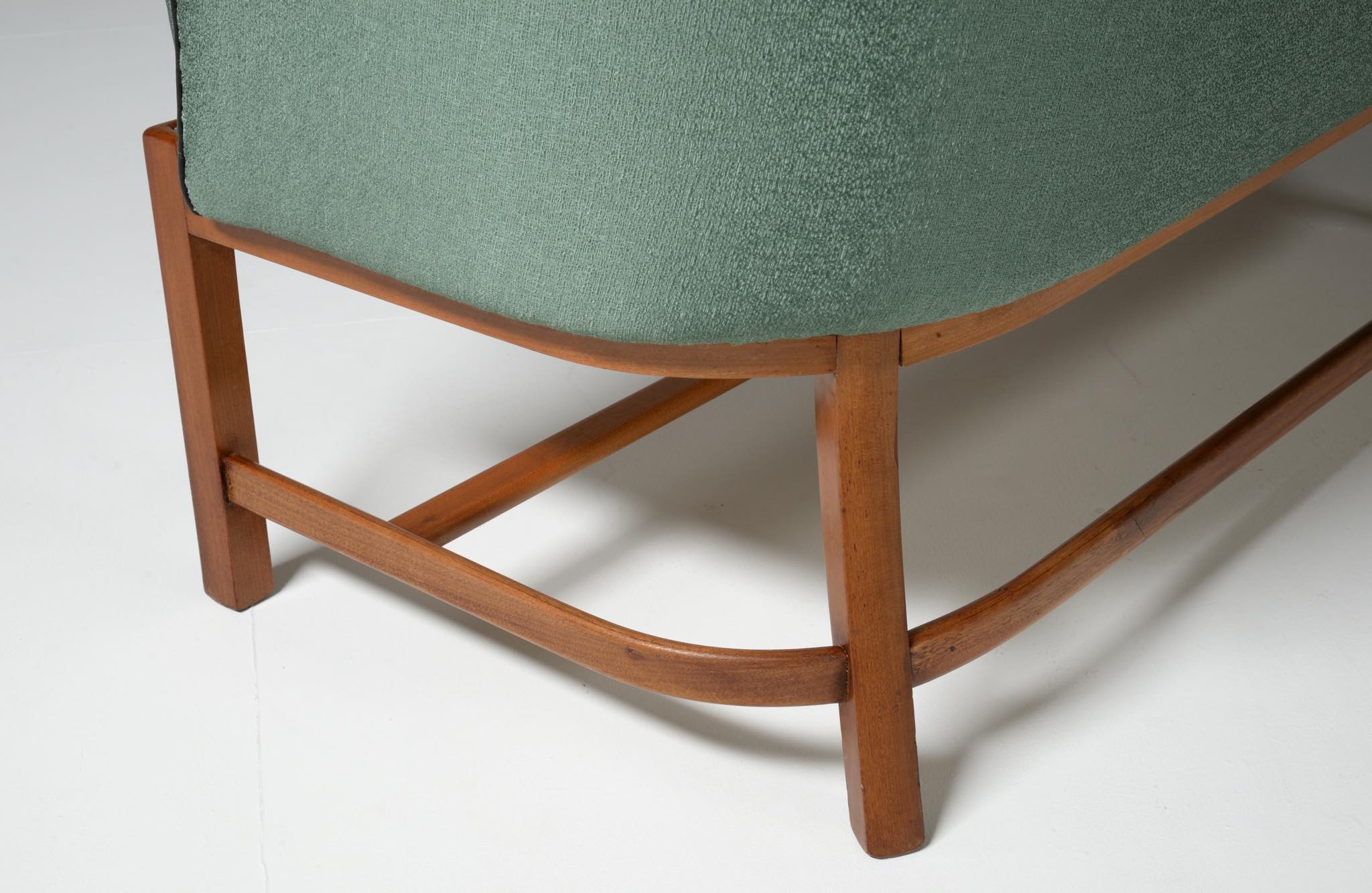 20世紀前中葉に活躍したデンマークの家具デザイナー兼キャビネットメーカーのヤコブ・ケアによるセッティとコーヒーテーブルのセットです。セッティは1945年にデザインされたもので、張り包みのシートを、キューバンマホガニーのフレームに乗せた構造が特徴的です。ファブリックに傷みが見られたため、イタリアのファブリックブランド、ロロ・ピアーナインテリアのコットン系のファブリックを用いて張り替えました。テーブルもヤコブ・ケアによる1940年代の作品として求めたもので、こちらもキューバンマホガニー材が用いられています。白濁したガラストップが特徴的です。こちらはセットでの販売となります。