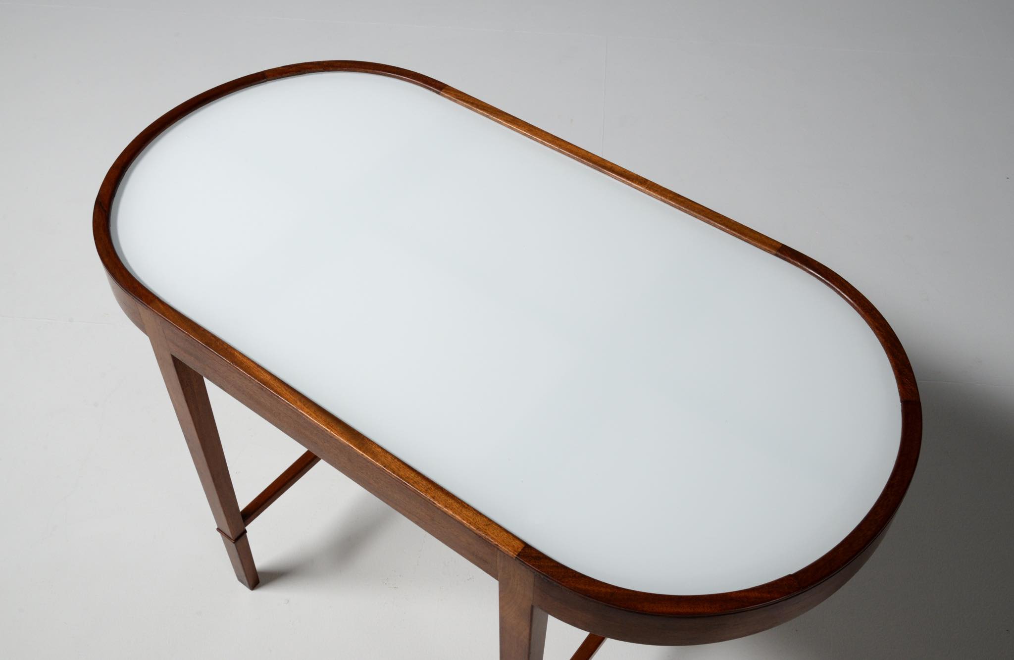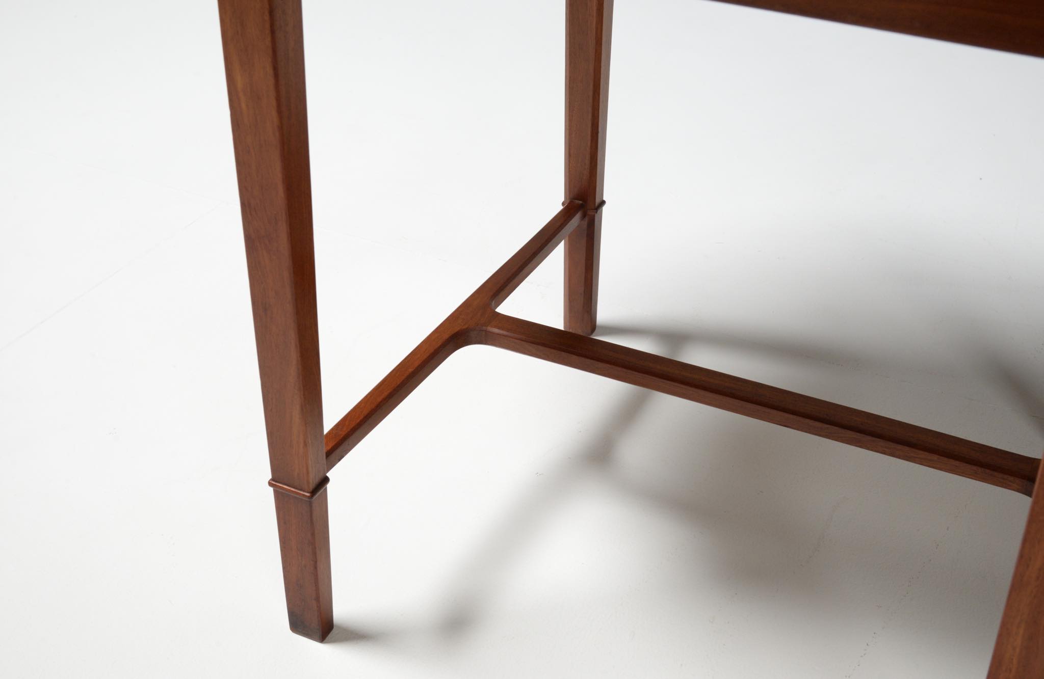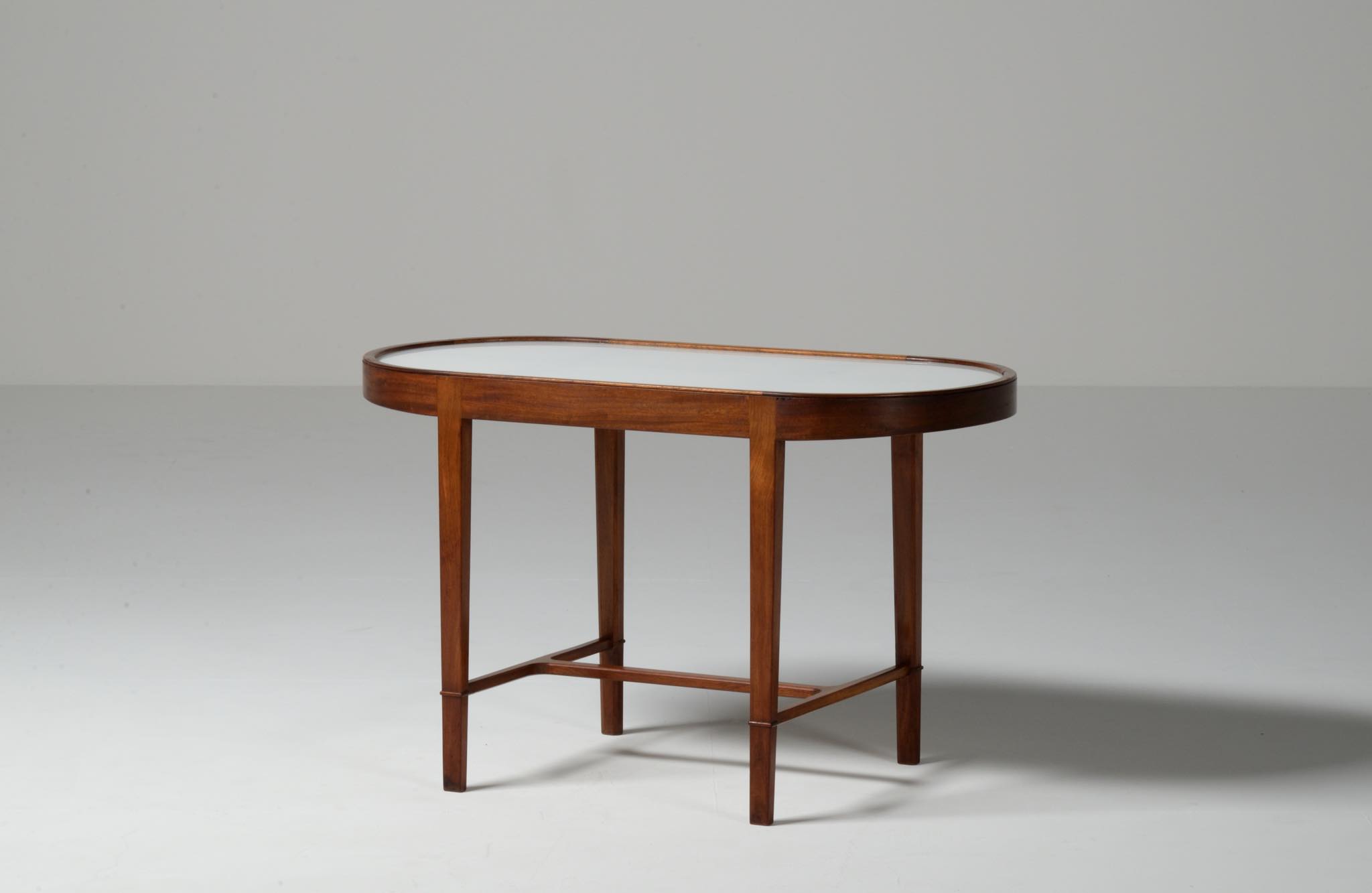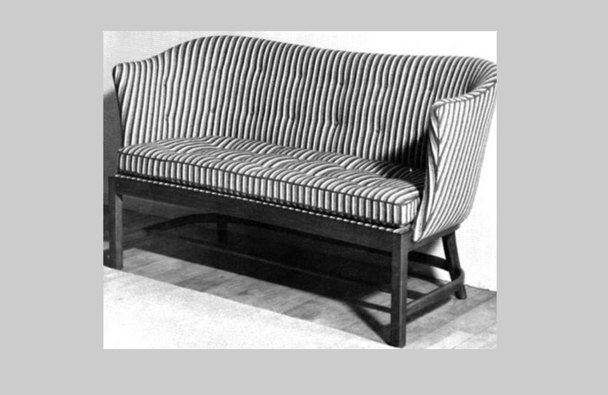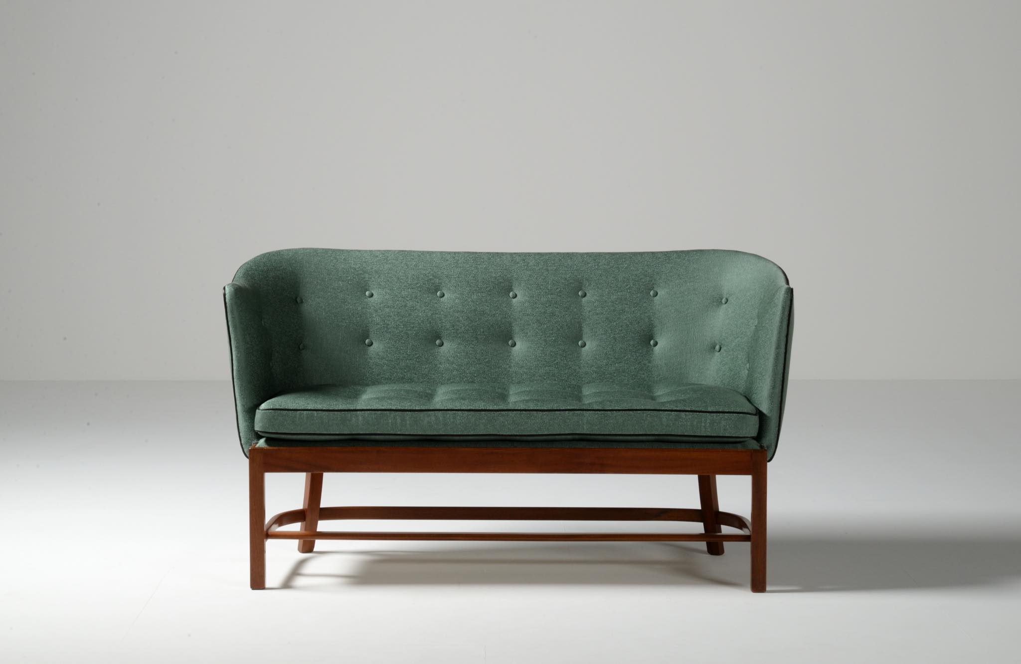 20世紀前中葉に活躍したデンマークの家具デザイナー兼キャビネットメーカーのヤコブ・ケアによるセッティとコーヒーテーブルのセットです。セッティは1945年にデザインされたもので、張り包みのシートを、キューバンマホガニーのフレームに乗せた構造が特徴的です。ファブリックに傷みが見られたため、イタリアのファブリックブランド、ロロ・ピアーナインテリアのコットン系のファブリックを用いて張り替えました。テーブルもヤコブ・ケアによる1940年代の作品として求めたもので、こちらもキューバンマホガニー材が用いられています。白濁したガラストップが特徴的です。こちらはセットでの販売となります。
