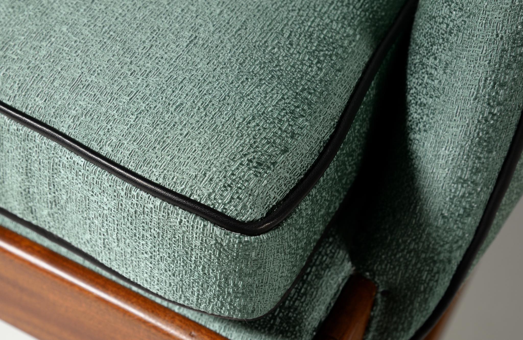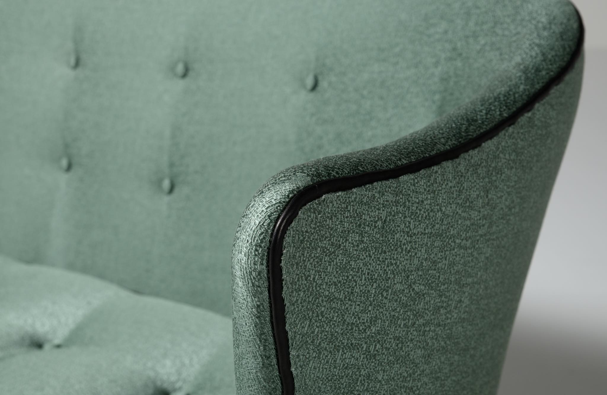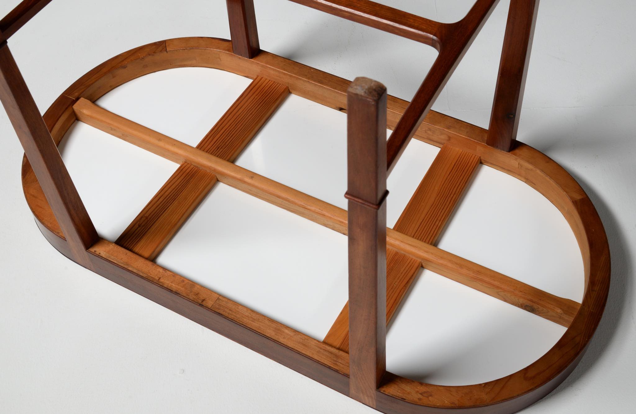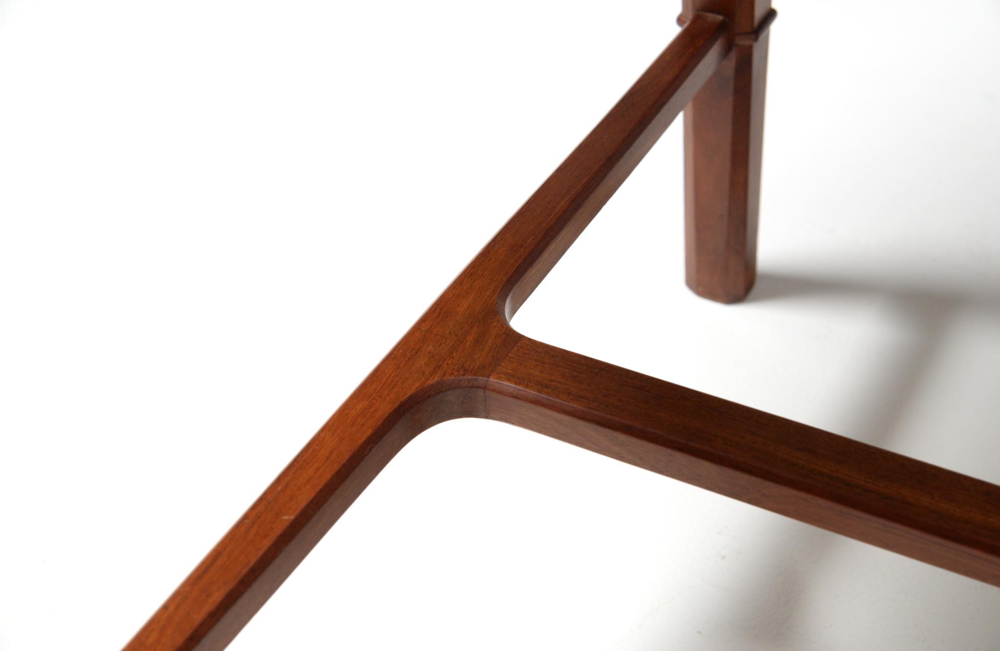 20世紀前中葉に活躍したデンマークの家具デザイナー兼キャビネットメーカーのヤコブ・ケアによるセッティとコーヒーテーブルのセットです。セッティは1945年にデザインされたもので、張り包みのシートを、キューバンマホガニーのフレームに乗せた構造が特徴的です。ファブリックに傷みが見られたため、イタリアのファブリックブランド、ロロ・ピアーナインテリアのコットン系のファブリックを用いて張り替えました。テーブルもヤコブ・ケアによる1940年代の作品として求めたもので、こちらもキューバンマホガニー材が用いられています。白濁したガラストップが特徴的です。こちらはセットでの販売となります。