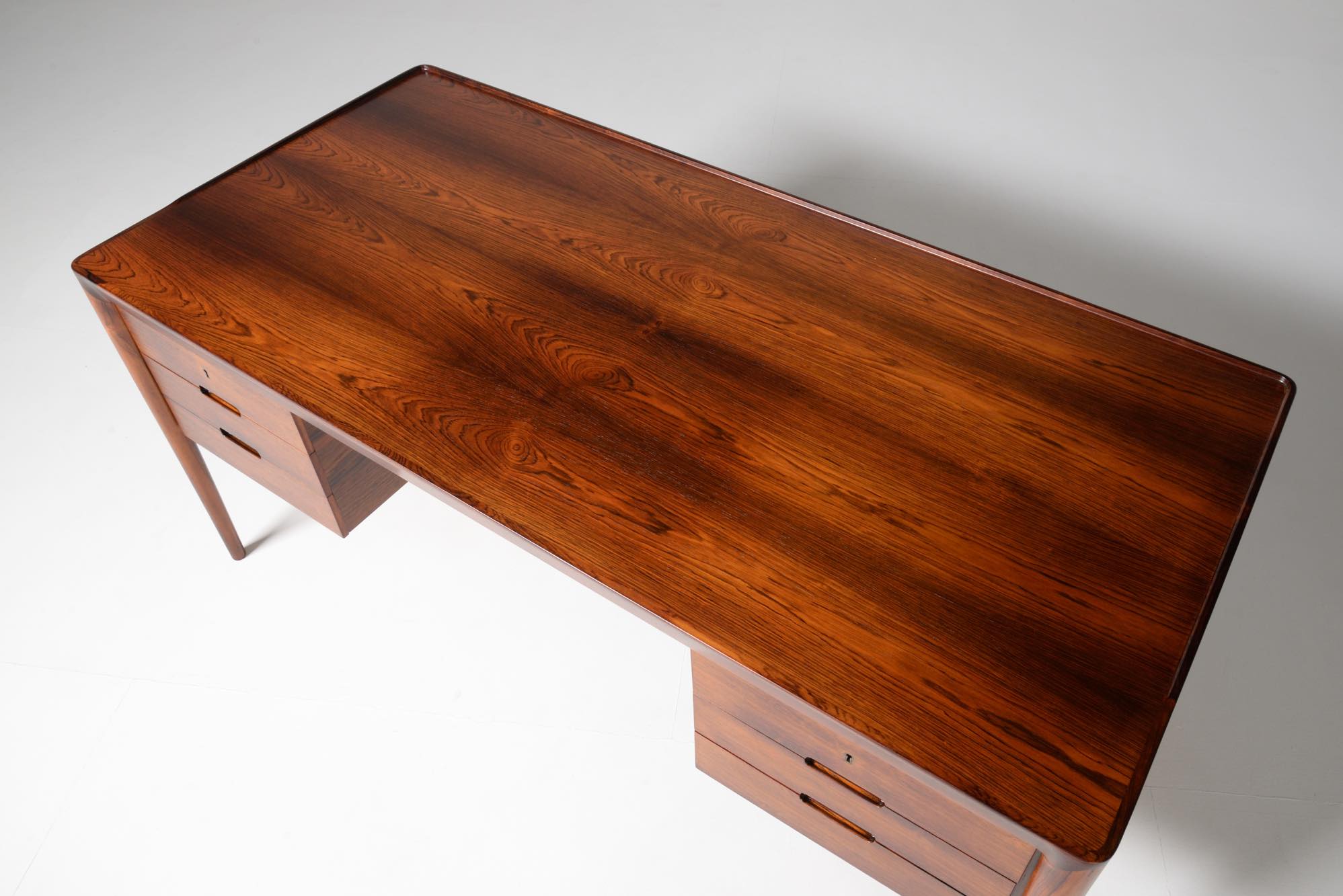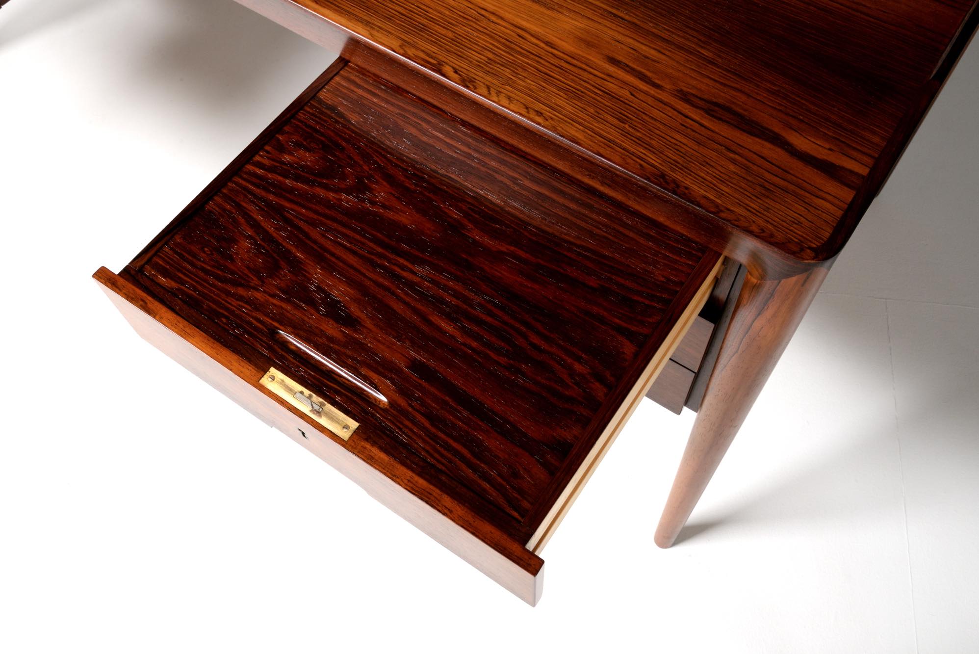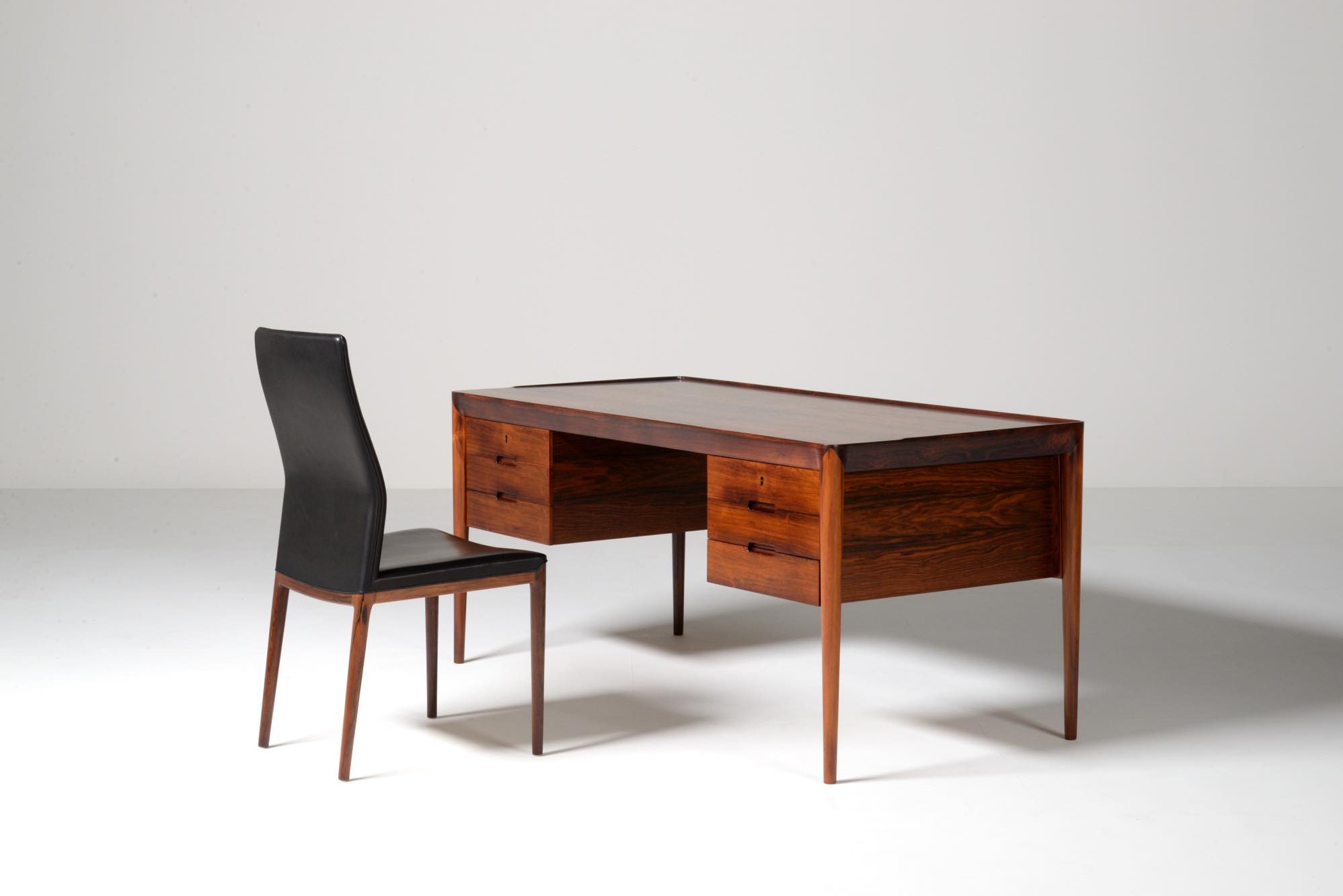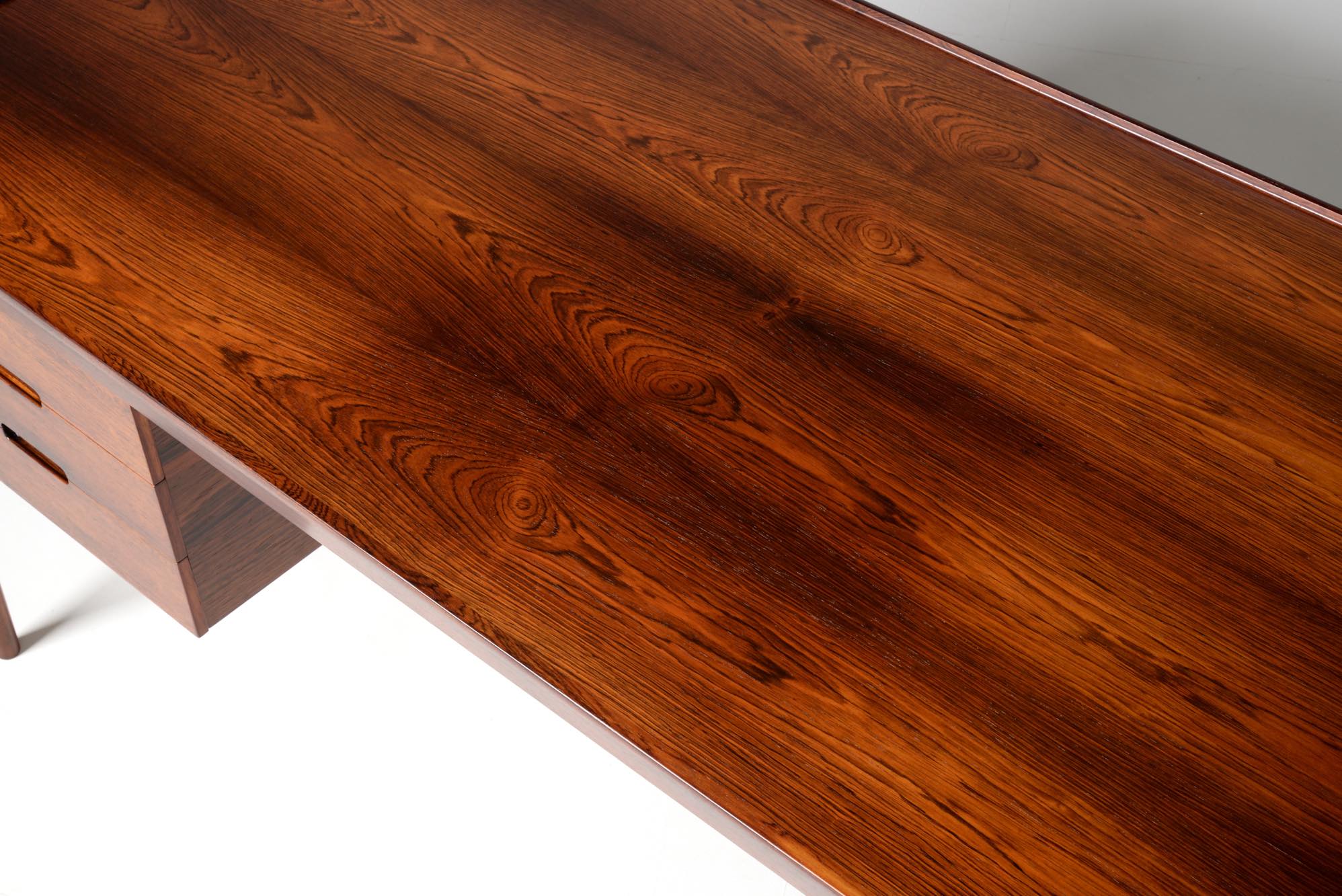 デンマークの家具デザイナー、Erik Riisager Hansen/エリック・リサガー・ハンセンによるライティングデスクです。1960年代に作られたもので、良質なローズウッド材が用いられており、有機的なデザインでの脚の接合や、天板のエッジに備わる筆返しなど、シンプルなデザインでありながら手の込んだ作りのものです。トップの両抽斗にはスライドする蓋が備わり、補助天板として使用可能です。コンディションは良好です。