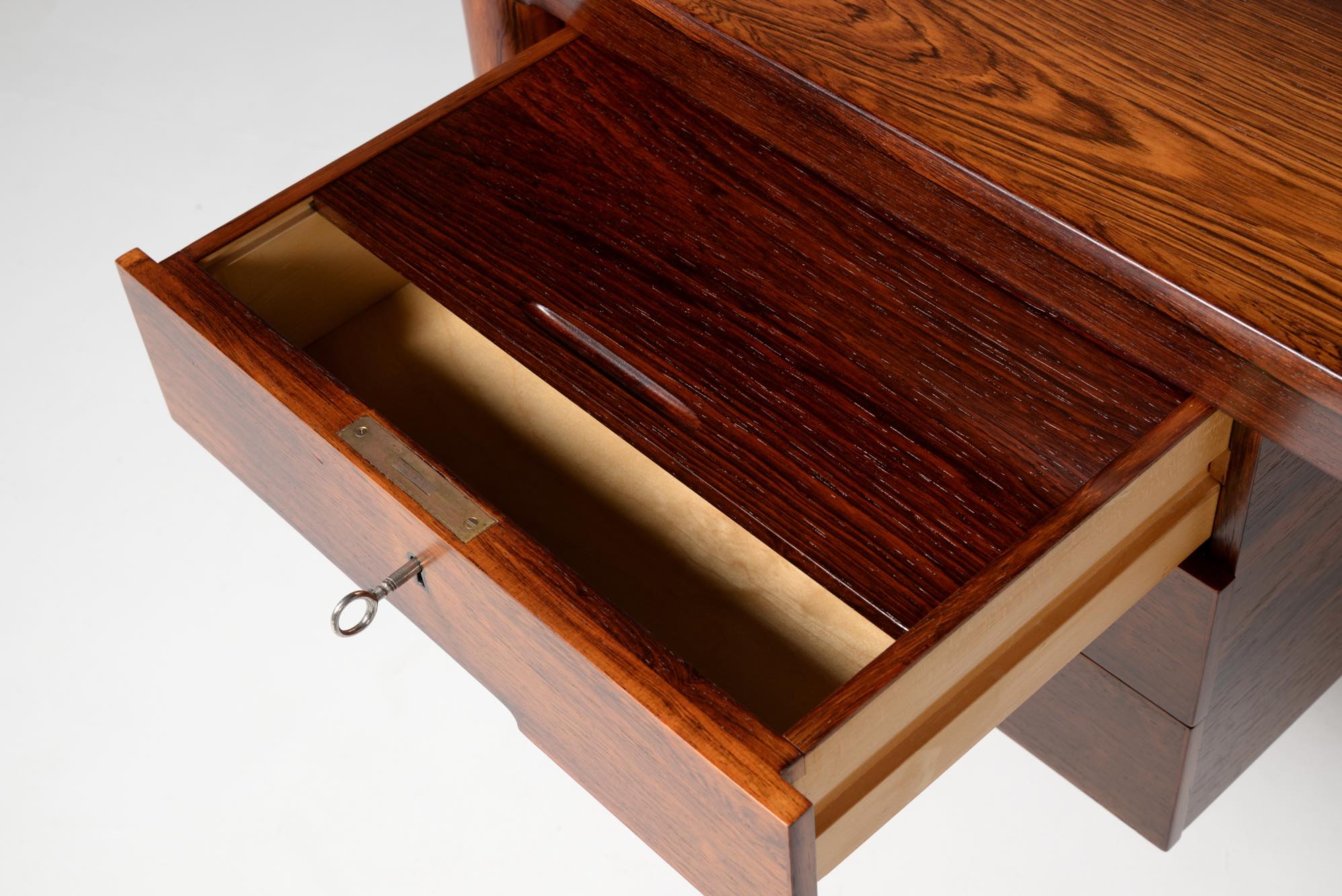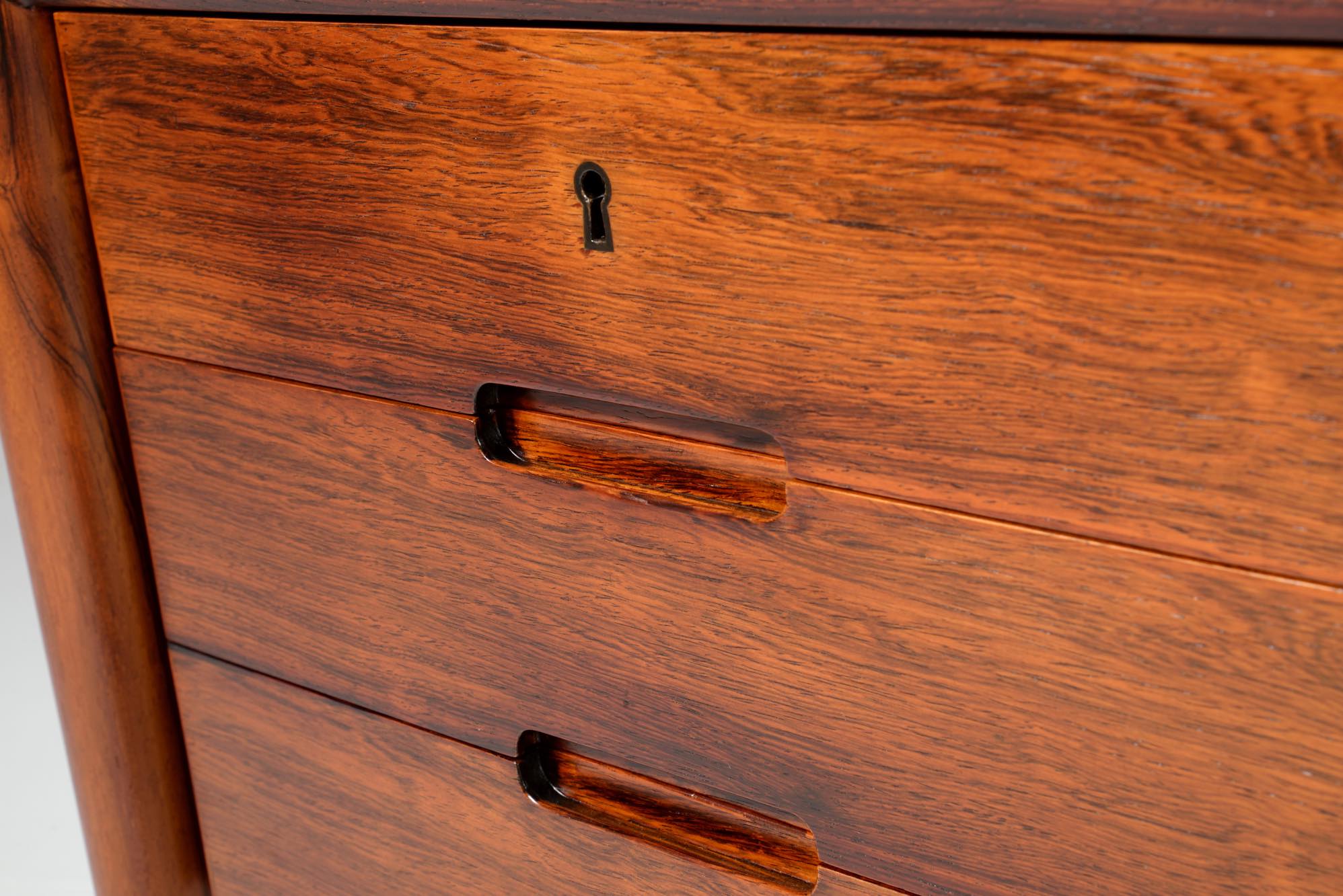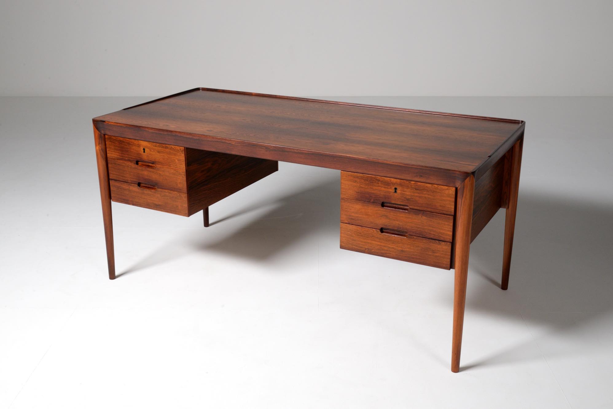 デンマークの家具デザイナー、Erik Riisager Hansen/エリック・リサガー・ハンセンによるライティングデスクです。1960年代に作られたもので、良質なローズウッド材が用いられており、有機的なデザインでの脚の接合や、天板のエッジに備わる筆返しなど、シンプルなデザインでありながら手の込んだ作りのものです。トップの両抽斗にはスライドする蓋が備わり、補助天板として使用可能です。コンディションは良好です。