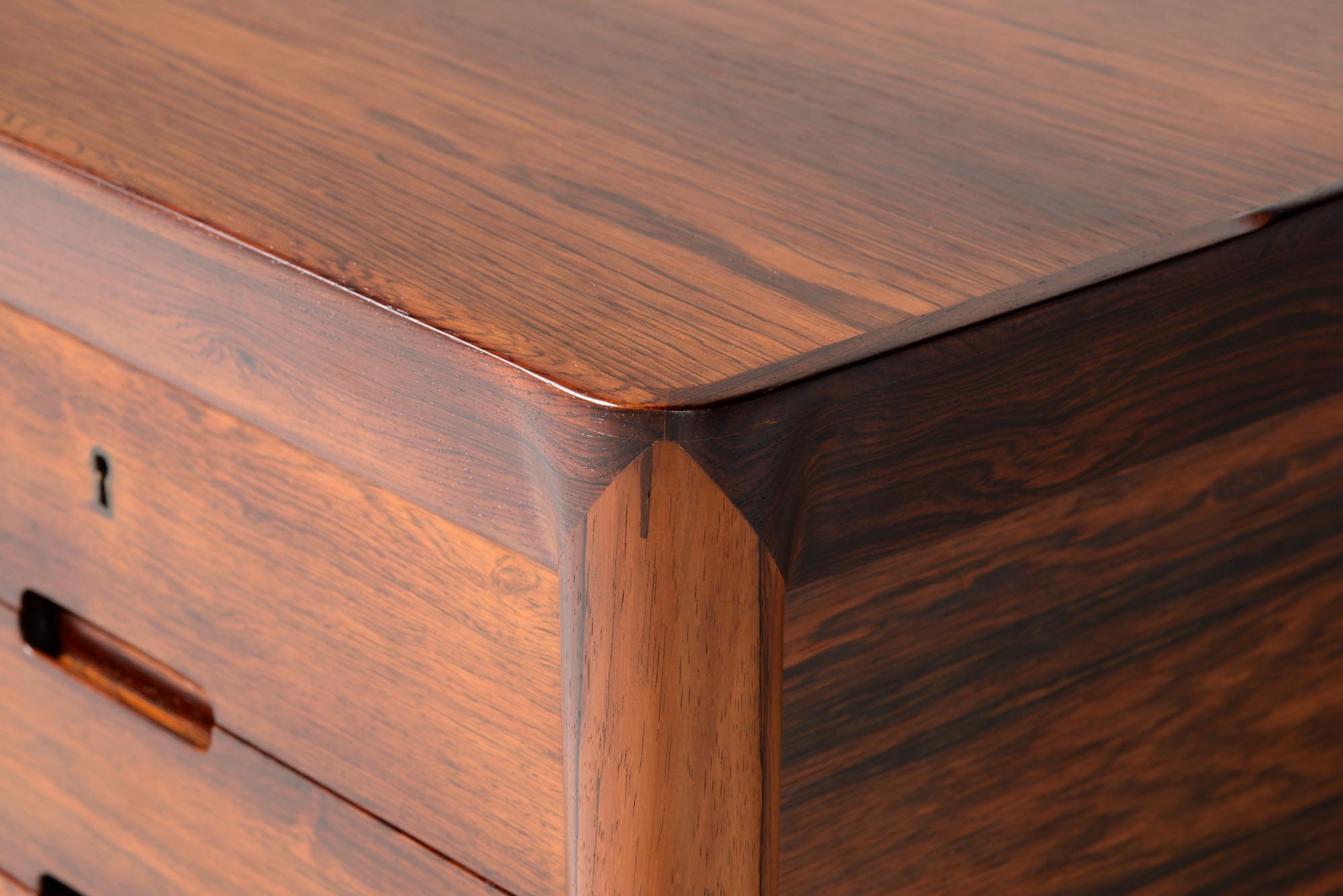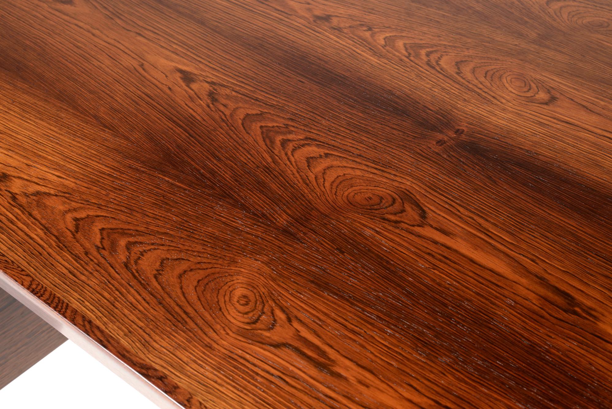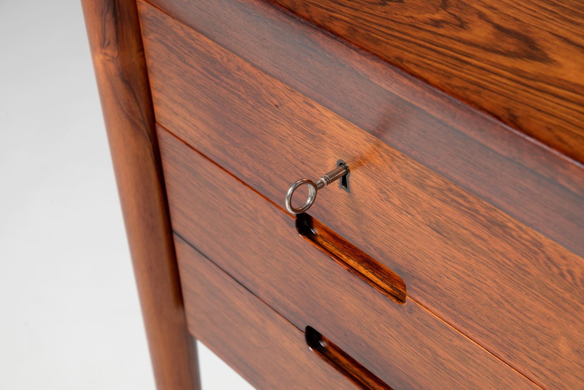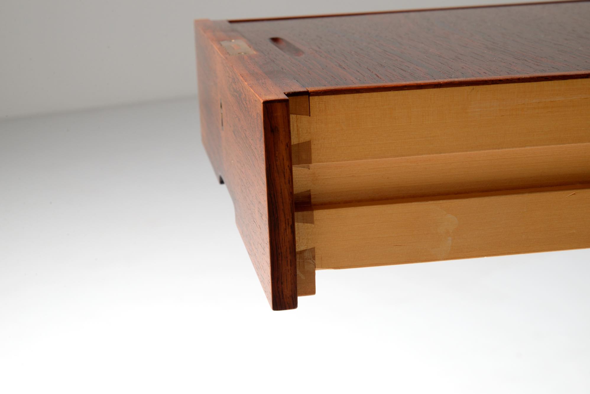 デンマークの家具デザイナー、Erik Riisager Hansen/エリック・リサガー・ハンセンによるライティングデスクです。1960年代に作られたもので、良質なローズウッド材が用いられており、有機的なデザインでの脚の接合や、天板のエッジに備わる筆返しなど、シンプルなデザインでありながら手の込んだ作りのものです。トップの両抽斗にはスライドする蓋が備わり、補助天板として使用可能です。コンディションは良好です。