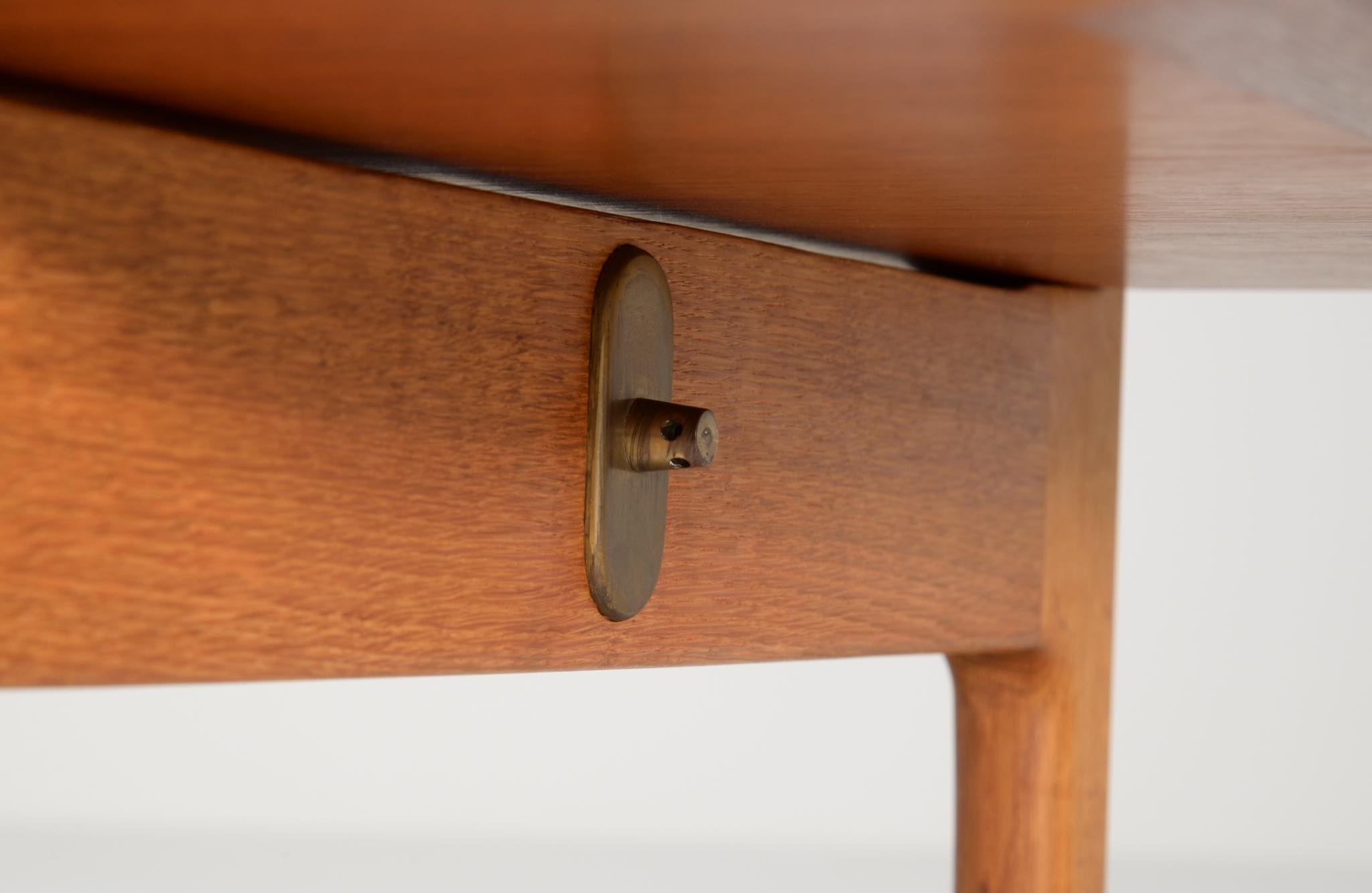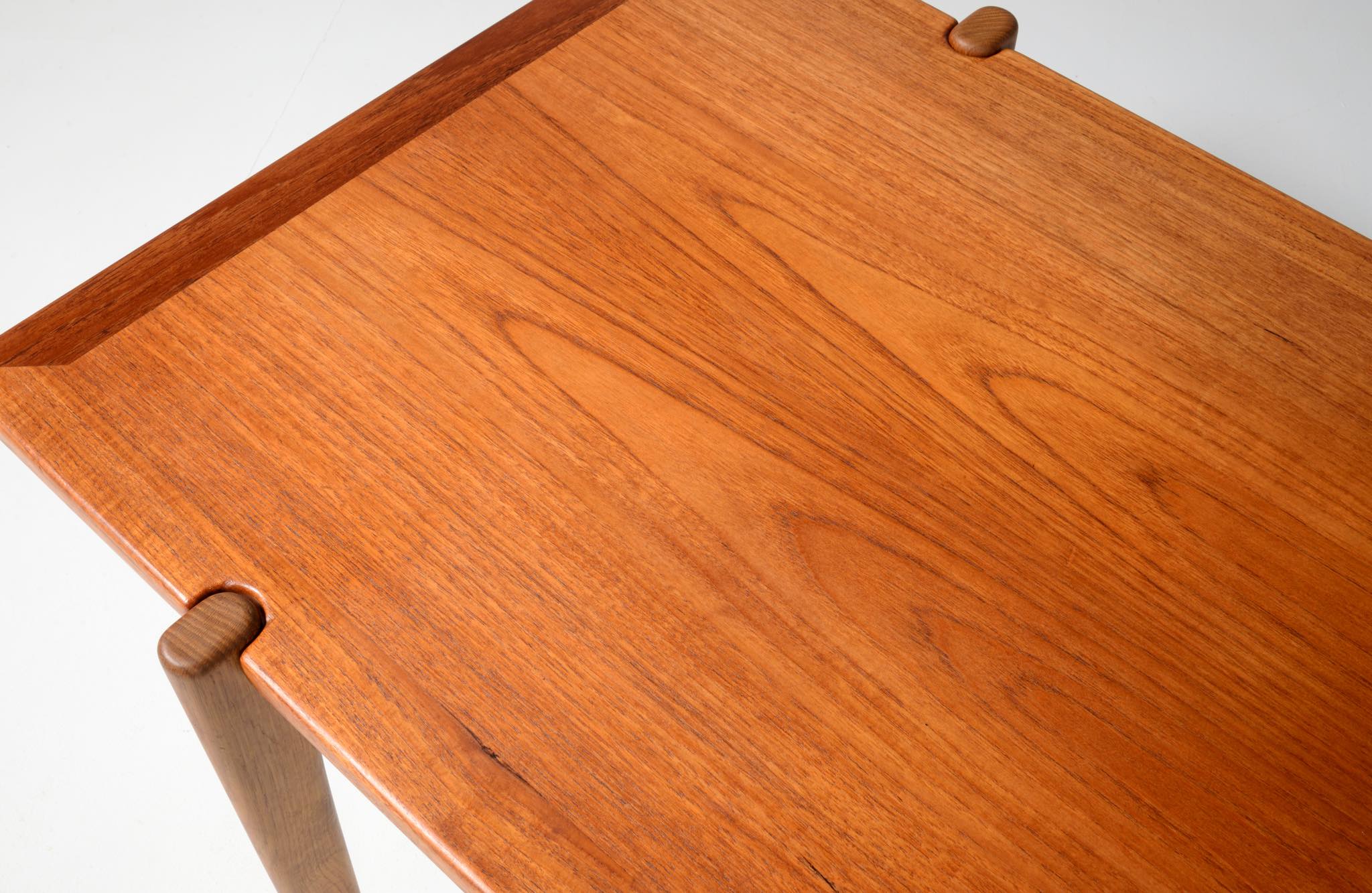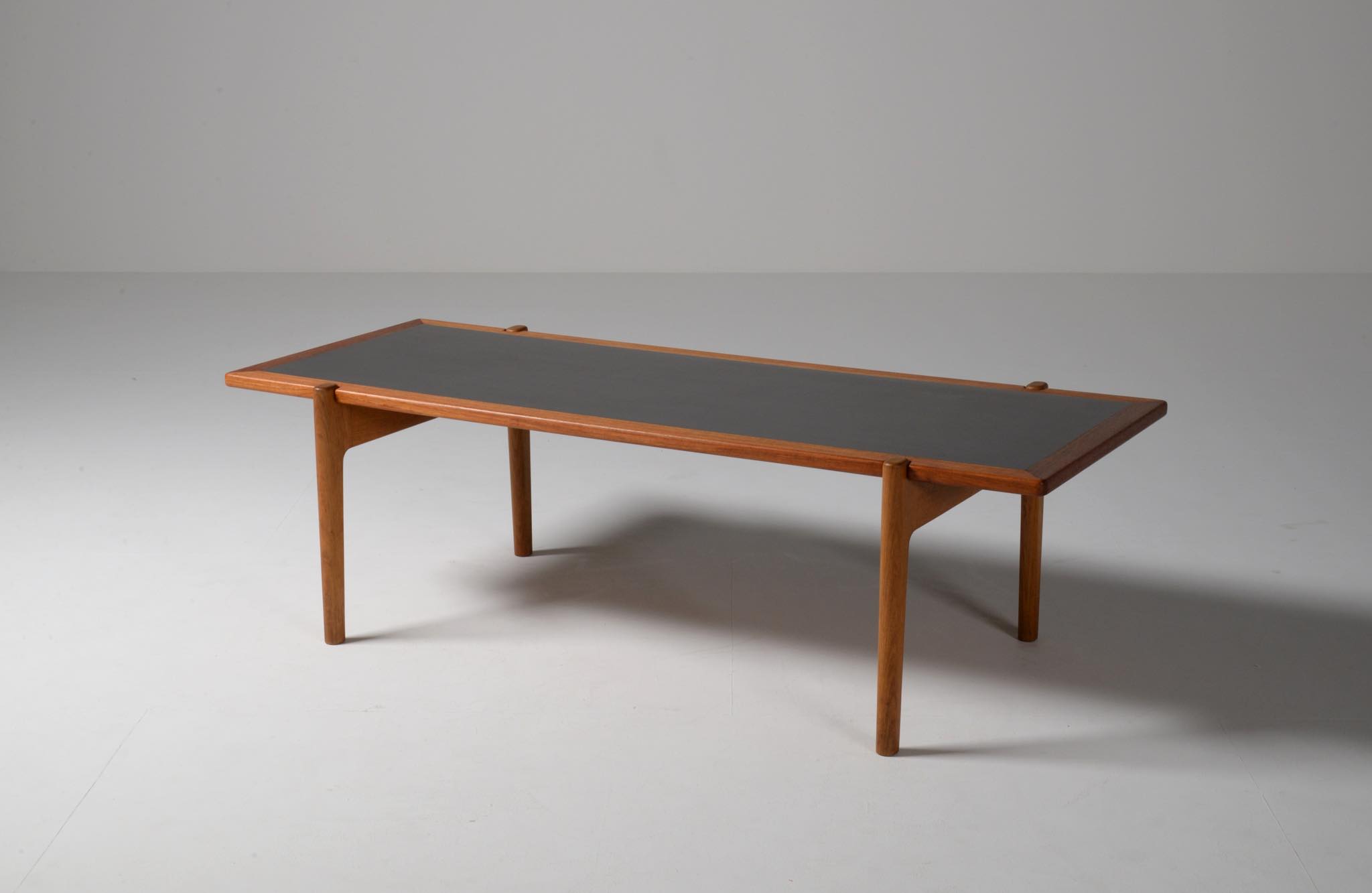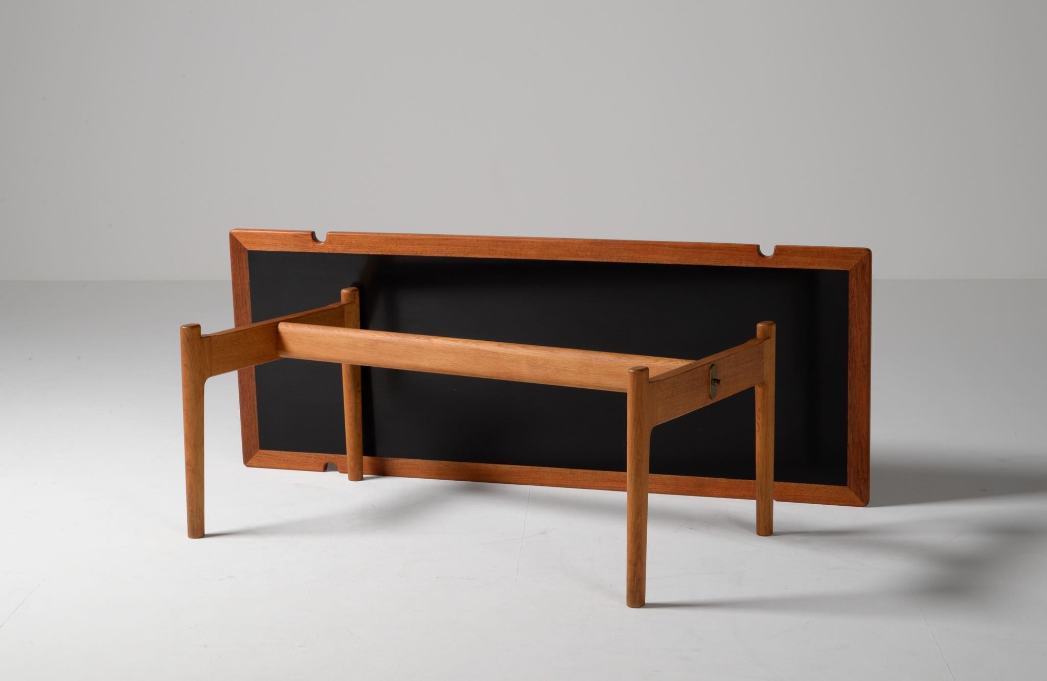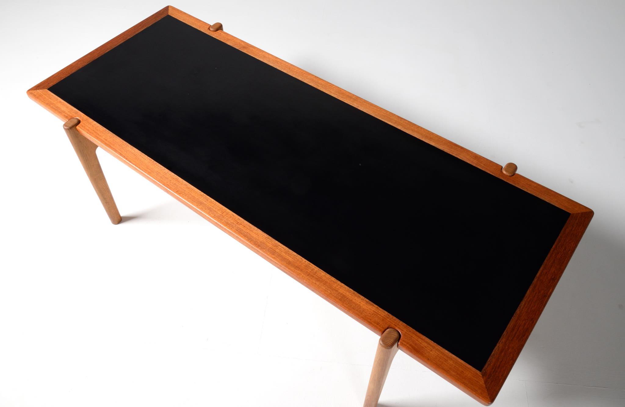 デンマークの家具デザイナー、Hans J. Wegner/ハンス・ウェグナーによるコーヒーテーブルです。1950年代頃に作られたものでしょう。天板がリバーシブル構造となっているモデルで、チーク材の面とブラックフォーマイカの面とを使い分けることが可能です。フォーマイカは樹脂系の素材で、現代でこそ珍しくはありませんが、1950年代当時は水気に強い新素材として人気があったようです。脚部はオーク材で作られています。フォーマイカに経年による小傷が見られますが、経年の割にはとても良い状態です。