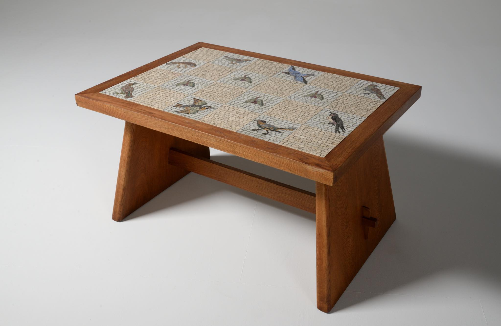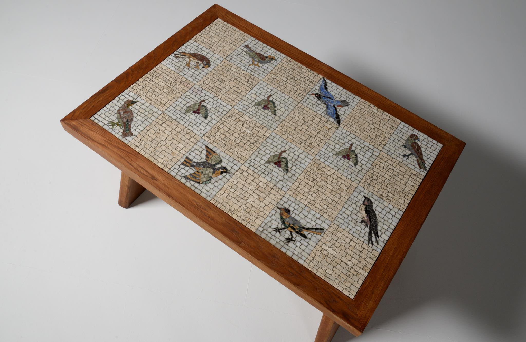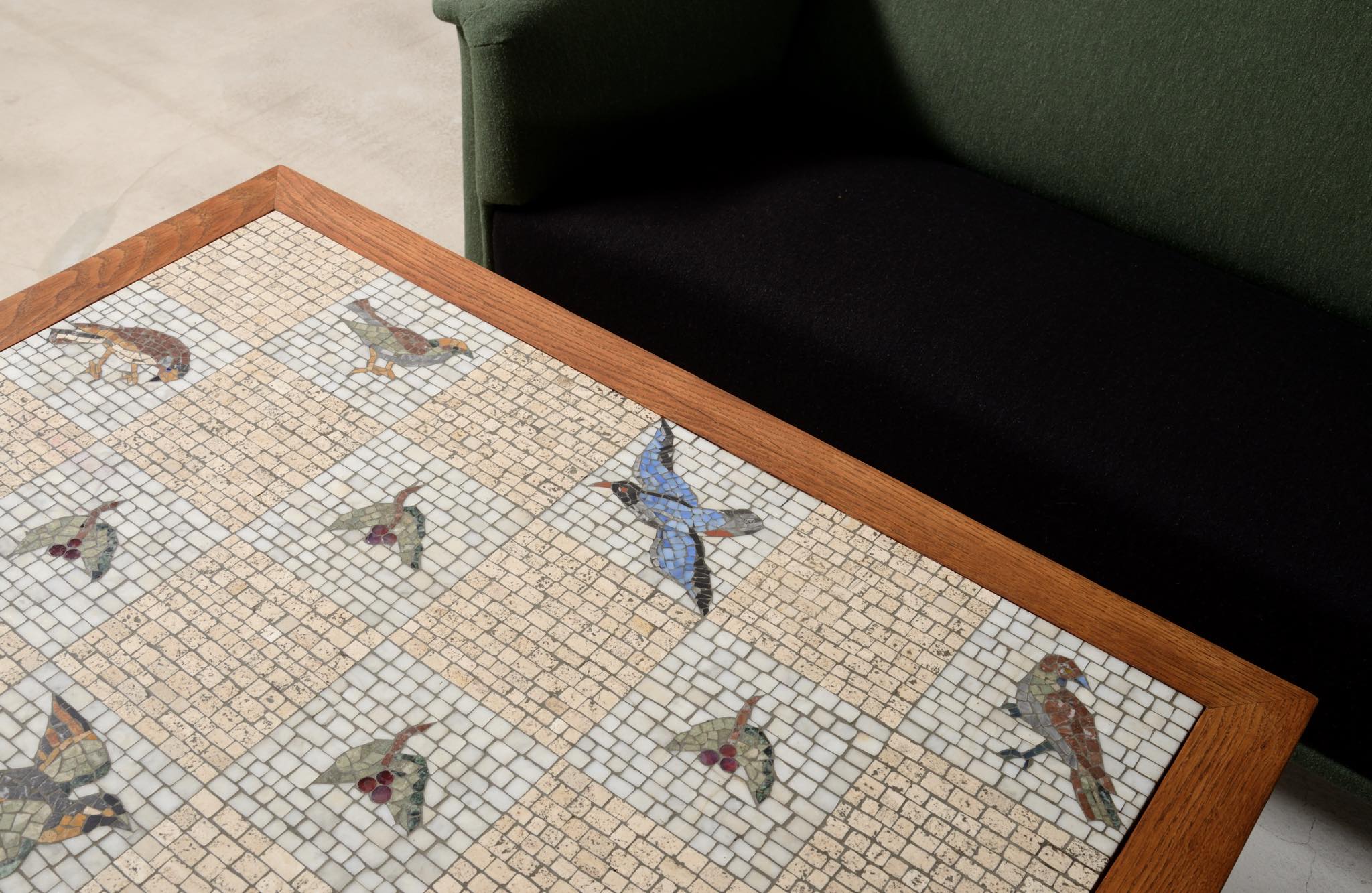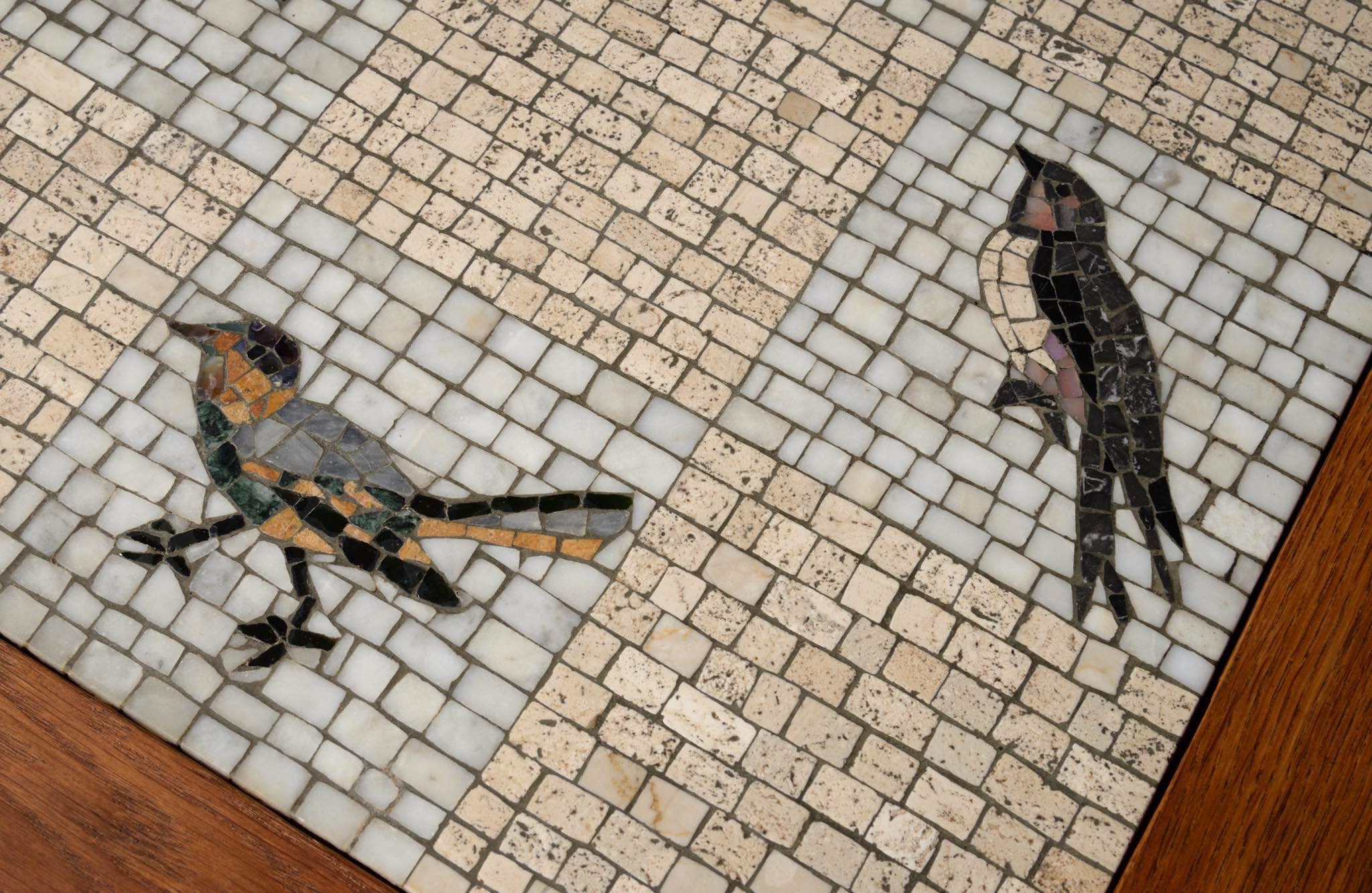 デンマークの芸術家、Kay Simmelhag/カイ・シムヘイの作とされるモザイクテーブルです。1930年代頃に作られたものでしょう。蛇紋岩やトラバーチン、ホワイトカラーラなど、様々な天然石を用いて鳥の外見的特徴や生態、動きなどをモザイクによって表現しています。石の配置や背景の構図、鳥の表現など、カイ・シムヘイによる表現の特徴が現れています。フレームの作者はわかっておりませんが、オークの突板を用いて南欧の古典家具を思わせるデザインはサマーハウス用に作られたものと考えられます。