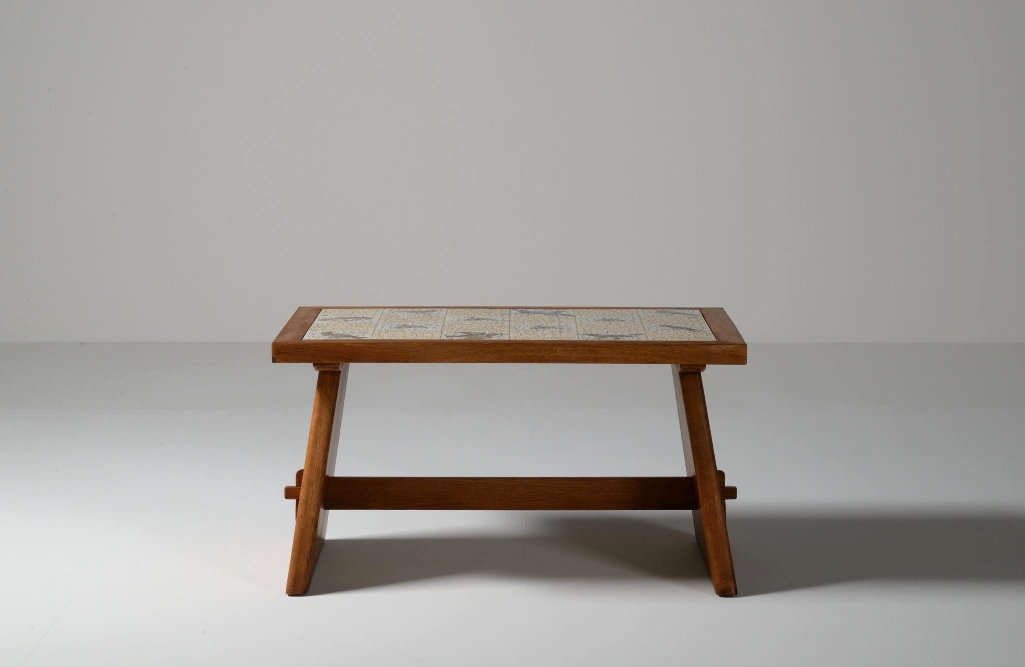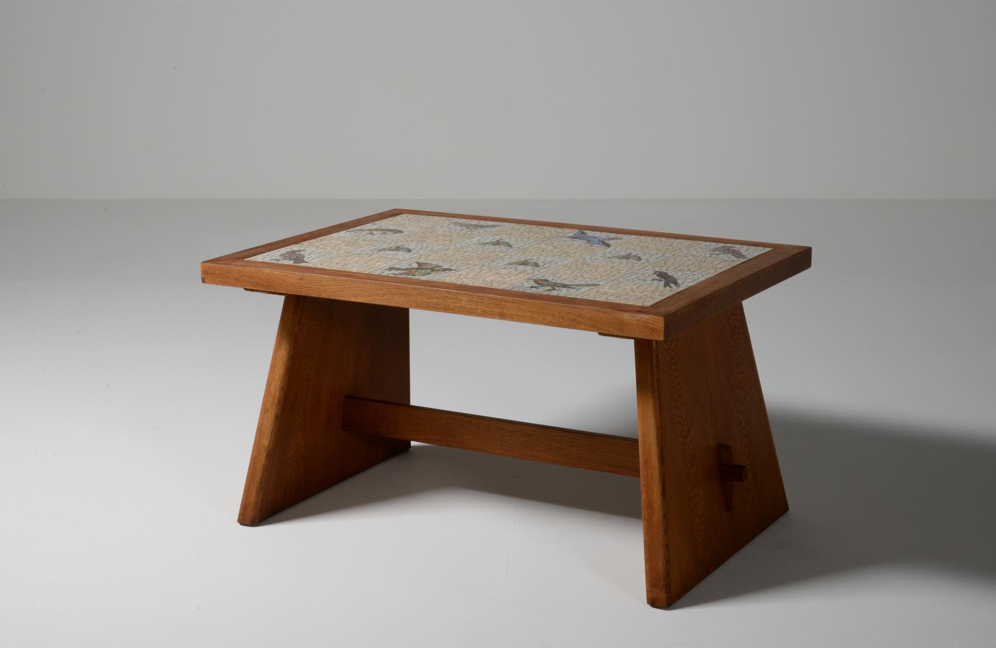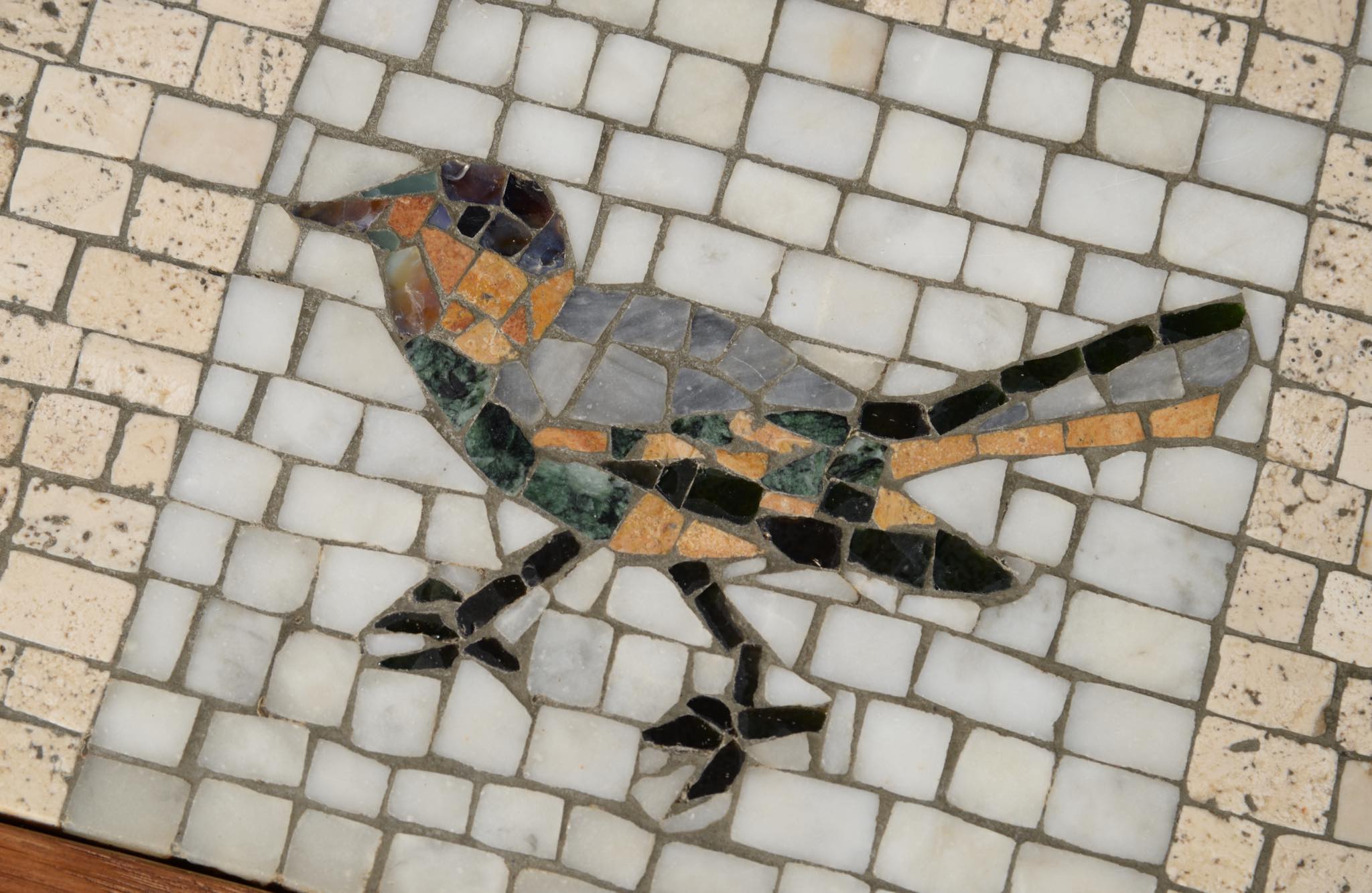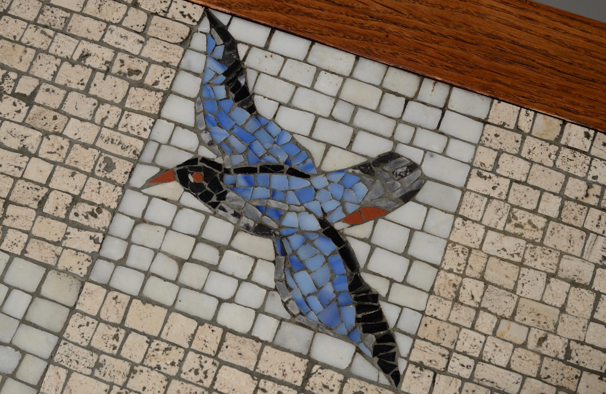 デンマークの芸術家、Kay Simmelhag/カイ・シムヘイの作とされるモザイクテーブルです。1930年代頃に作られたものでしょう。蛇紋岩やトラバーチン、ホワイトカラーラなど、様々な天然石を用いて鳥の外見的特徴や生態、動きなどをモザイクによって表現しています。石の配置や背景の構図、鳥の表現など、カイ・シムヘイによる表現の特徴が現れています。フレームの作者はわかっておりませんが、オークの突板を用いて南欧の古典家具を思わせるデザインはサマーハウス用に作られたものと考えられます。