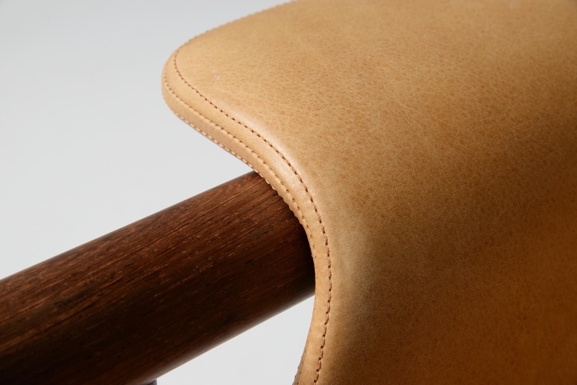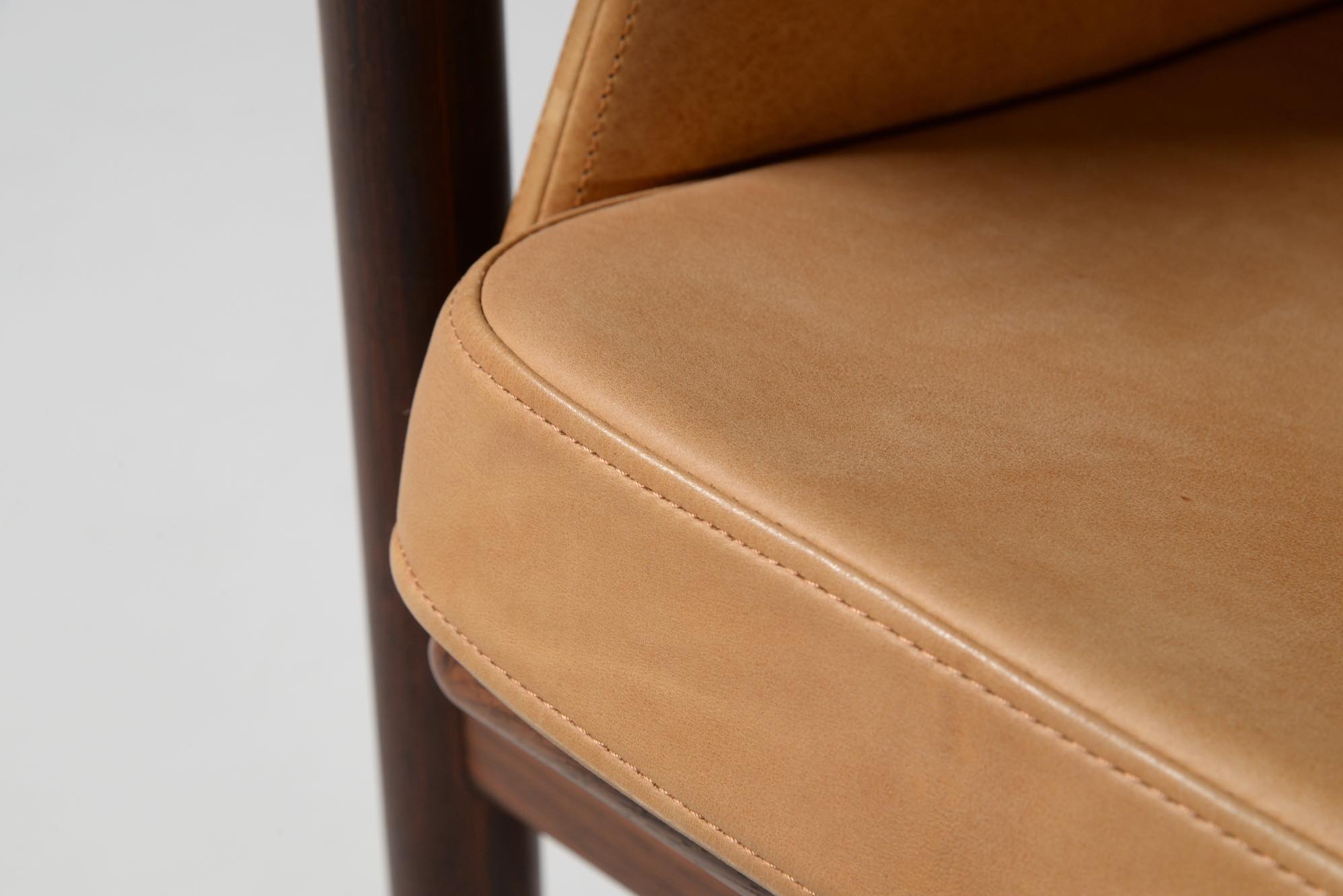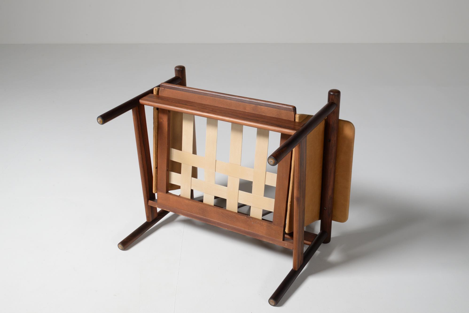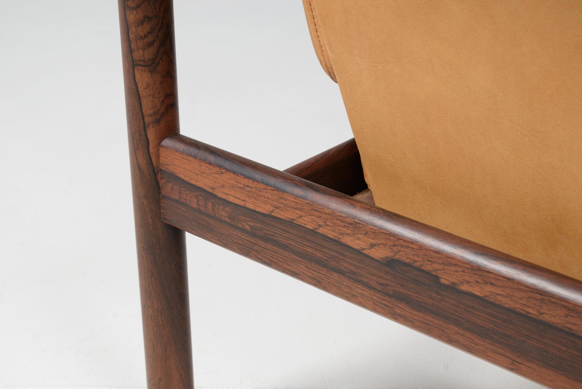 デンマークの家具デザイナー、Illum Wikkelsø/イルム・ヴィッケルソーによる1966年発表の"Wiki" チェア、ローズウッドのモデルです。棒状のフレームに皮革が被さったようなユニークなデザインの椅子で、やや傾斜のあるシート形状は身体がすっぽり収まるような掛け心地です。シートやアームにはナチュラルな色調の皮革が張られており、とても綺麗な状態です。