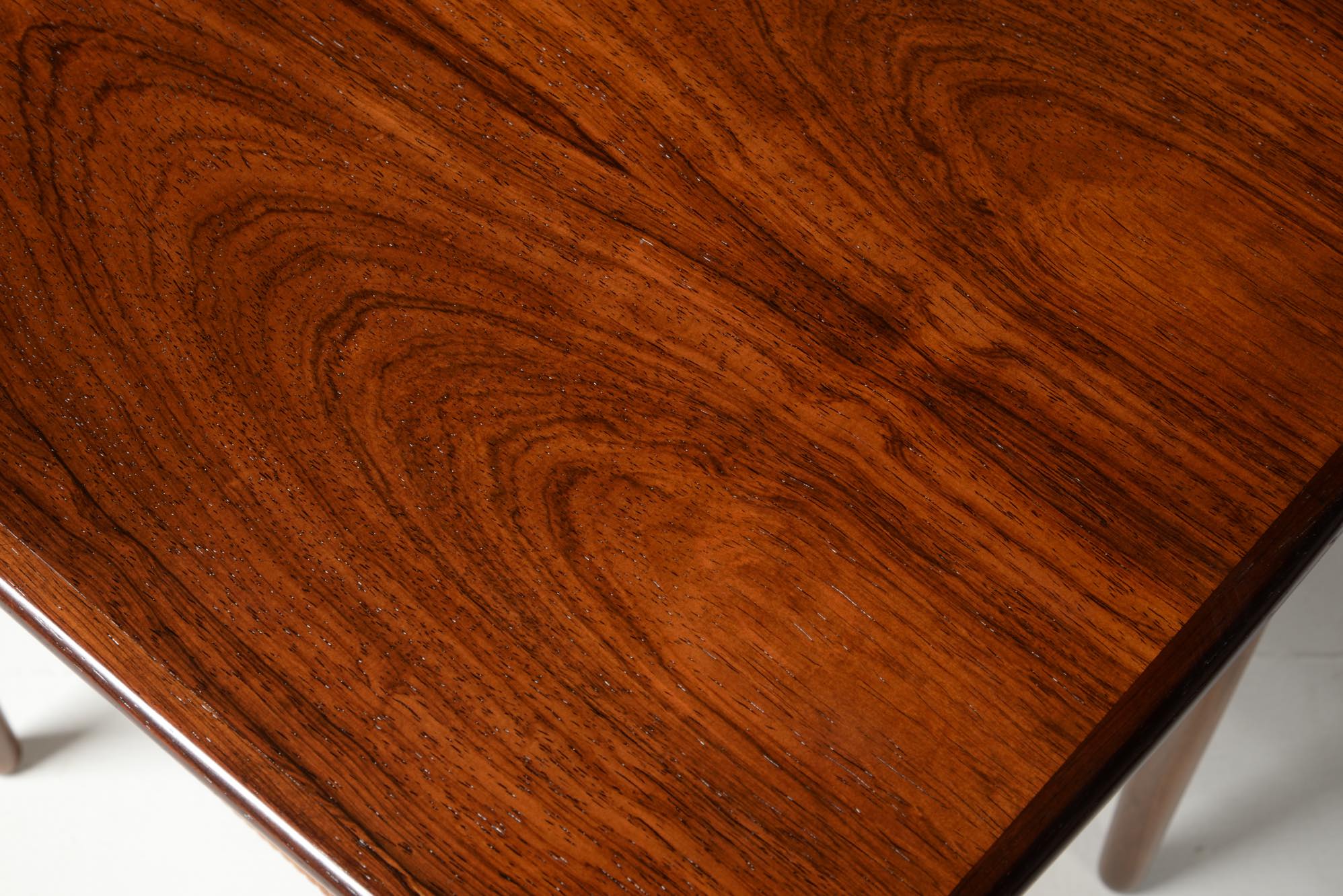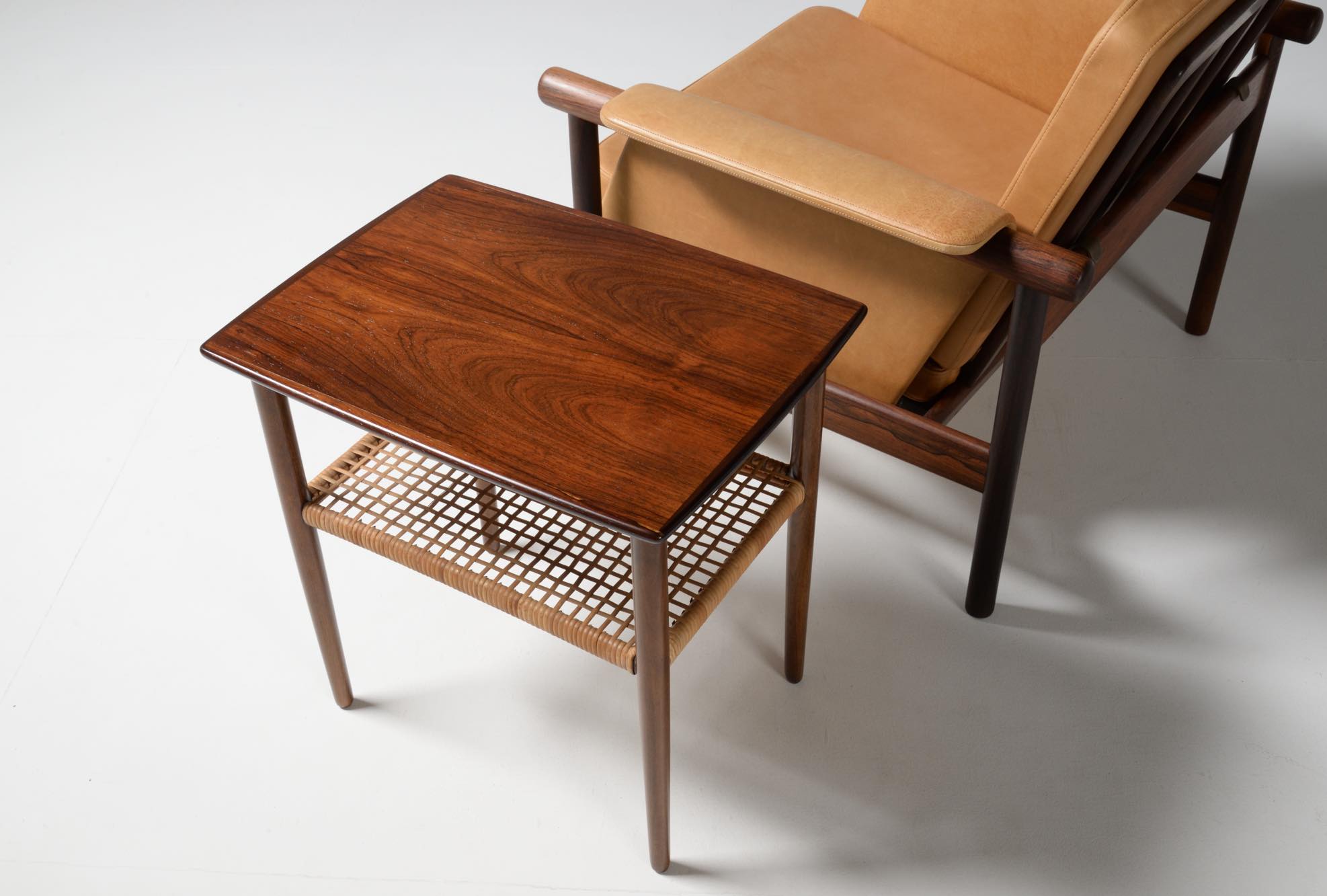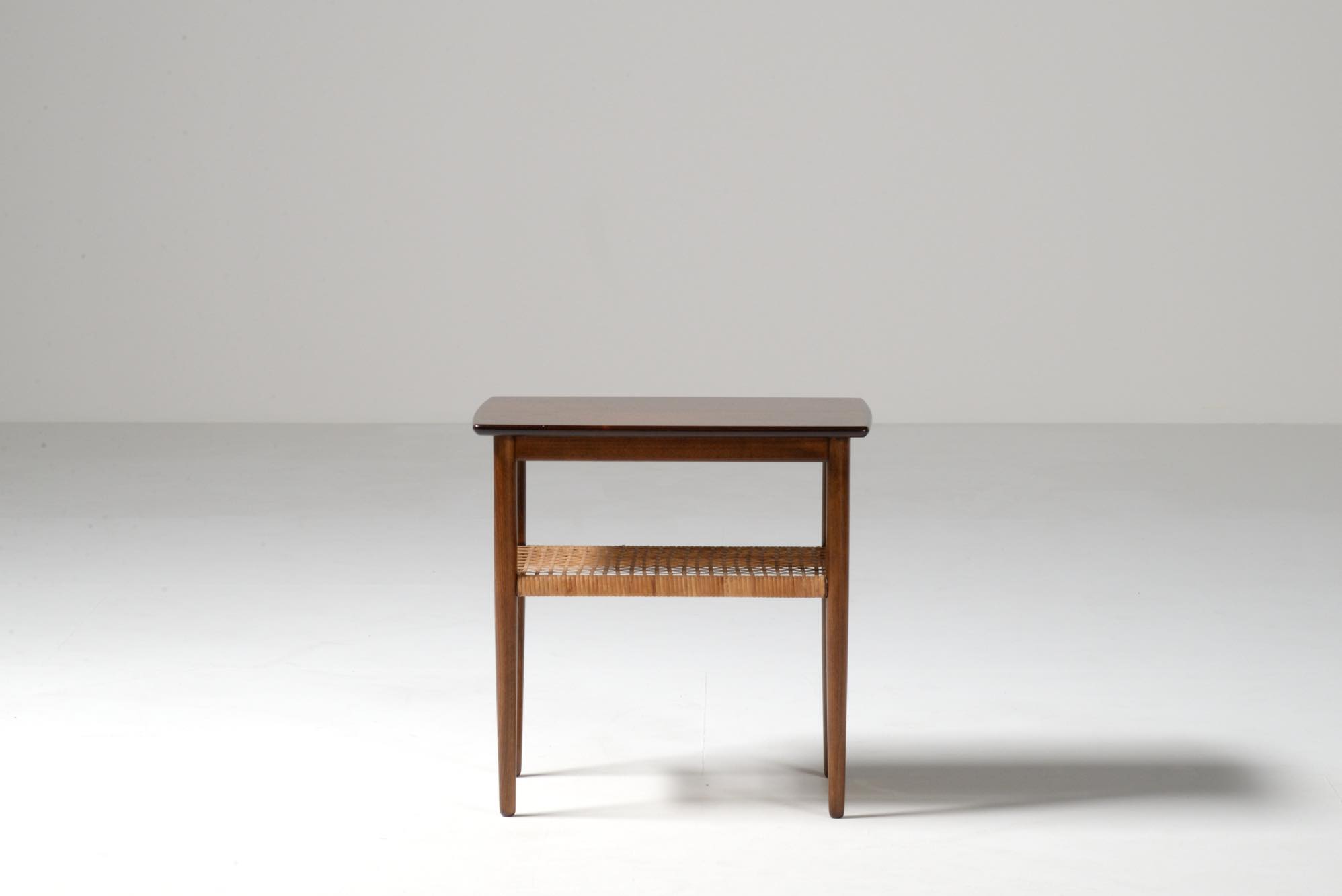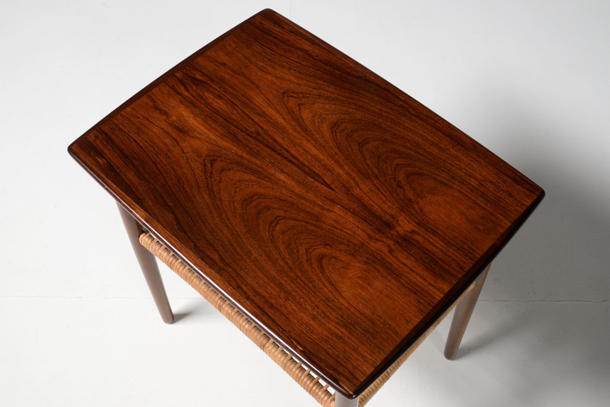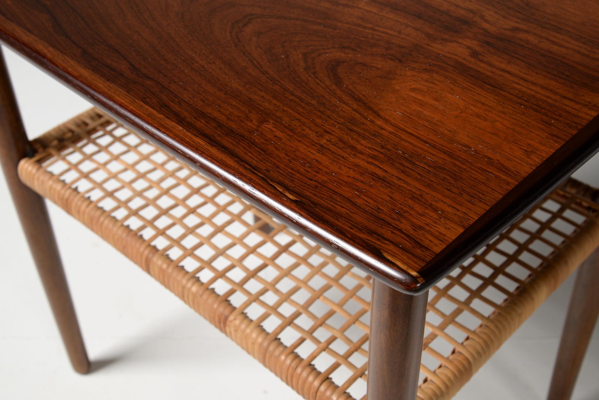 デンマーク製、1950年代頃に作られたサイドテーブルです。ブラジル原産と思しき良質なローズウッドの突き板を張った天板に、ステインされたビーチ材の脚、籐の棚が備わります。天板の木目は、無垢材を薄く割いて左右対称になるように張る技法を用いており、通称ブックマッチと呼ばれています。コンディションは良好です。