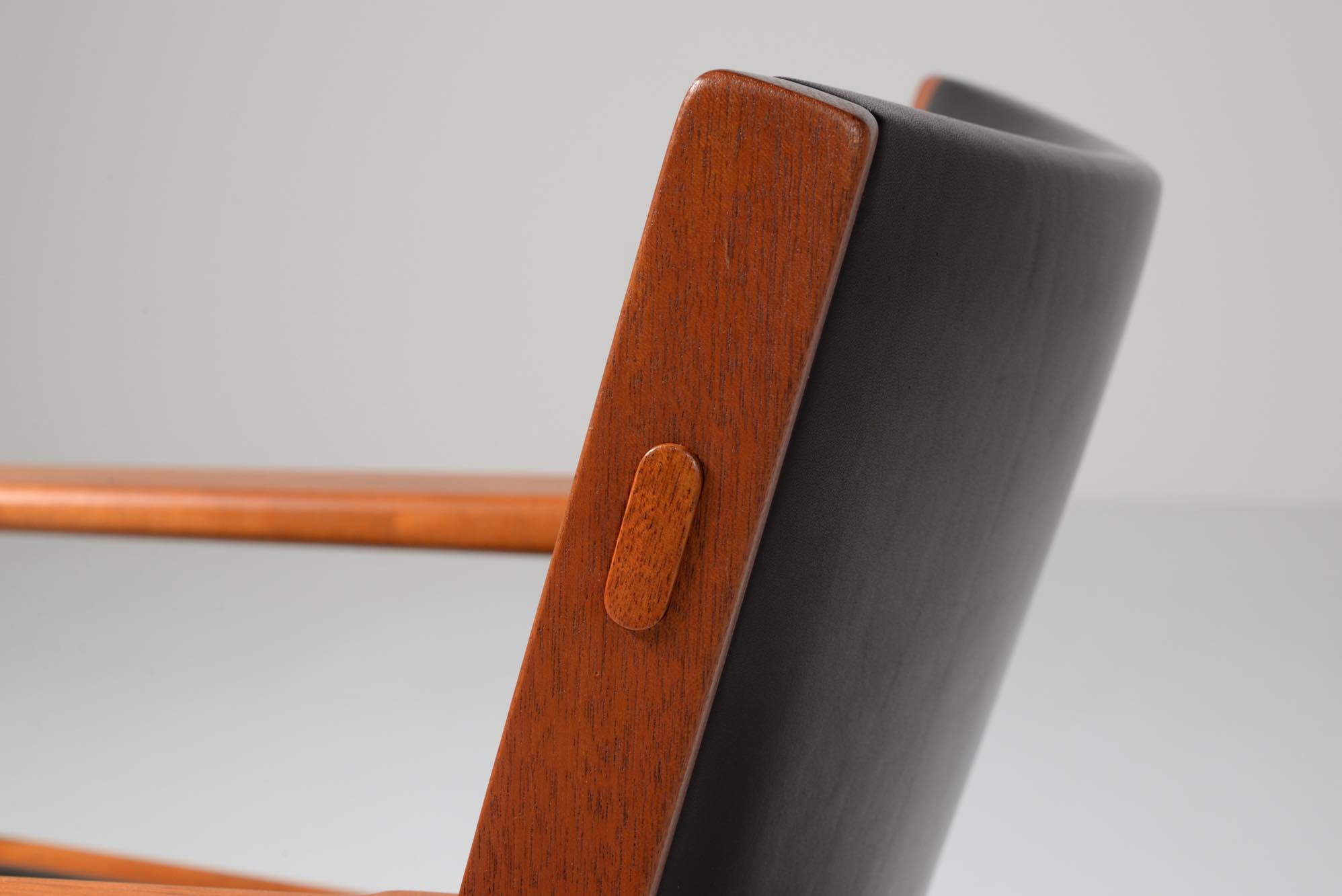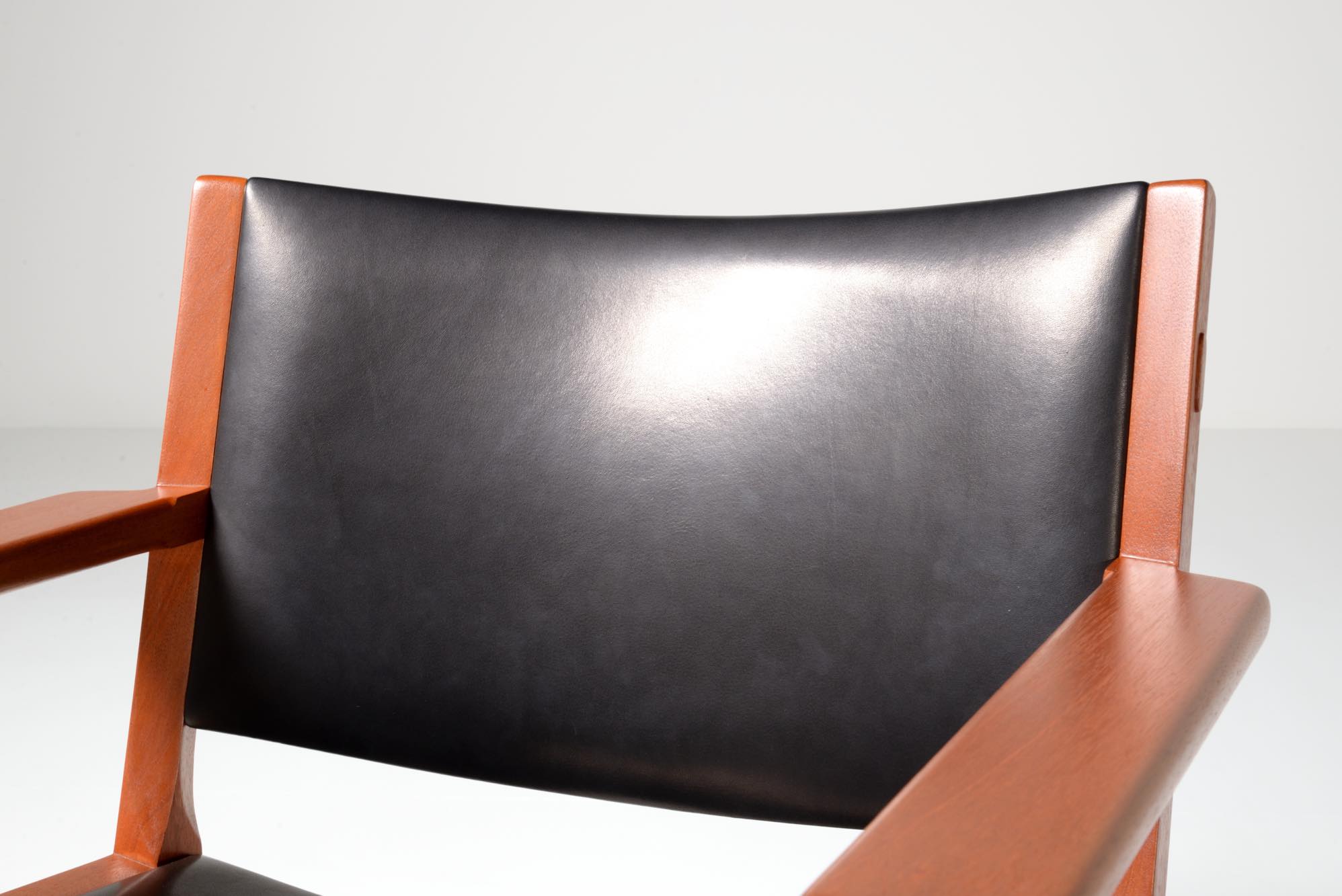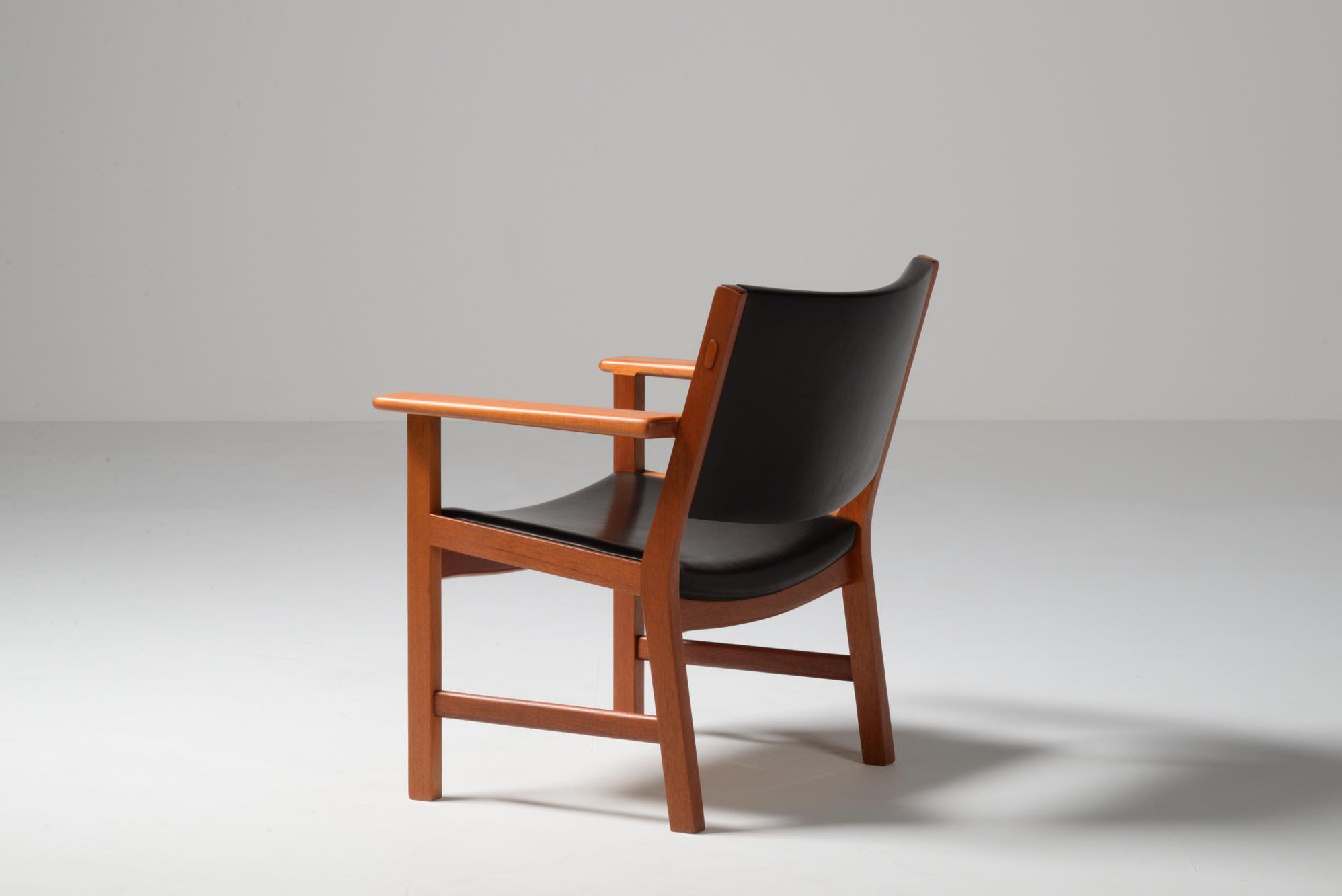 Hans J. Wegner/ハンス・ウェグナーにより1960年代に発表されたサロンチェアです。当初はAP Storenから発売されていたものですが、後にJohannes Hansenが生産を引き継いだようです。座面はイージーチェアよりはやや高く、サロンチェアかカンファレンスチェアと思われ、装飾を省いたシンプルなデザインです。本体はマホガニー材が用いられており、皮革は新たに張り替えました。
