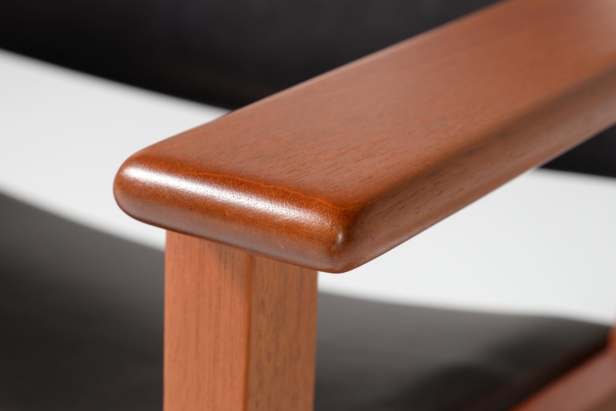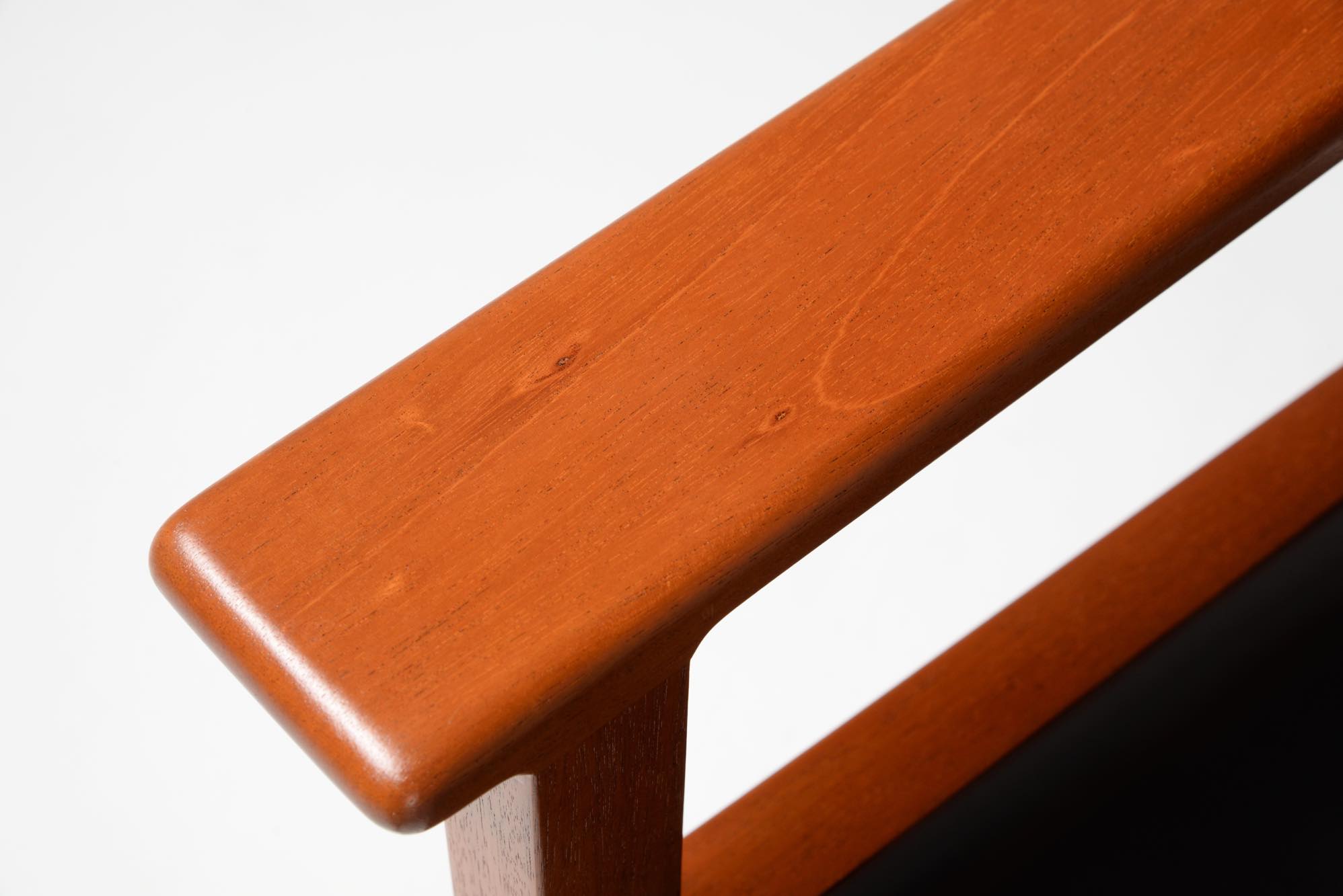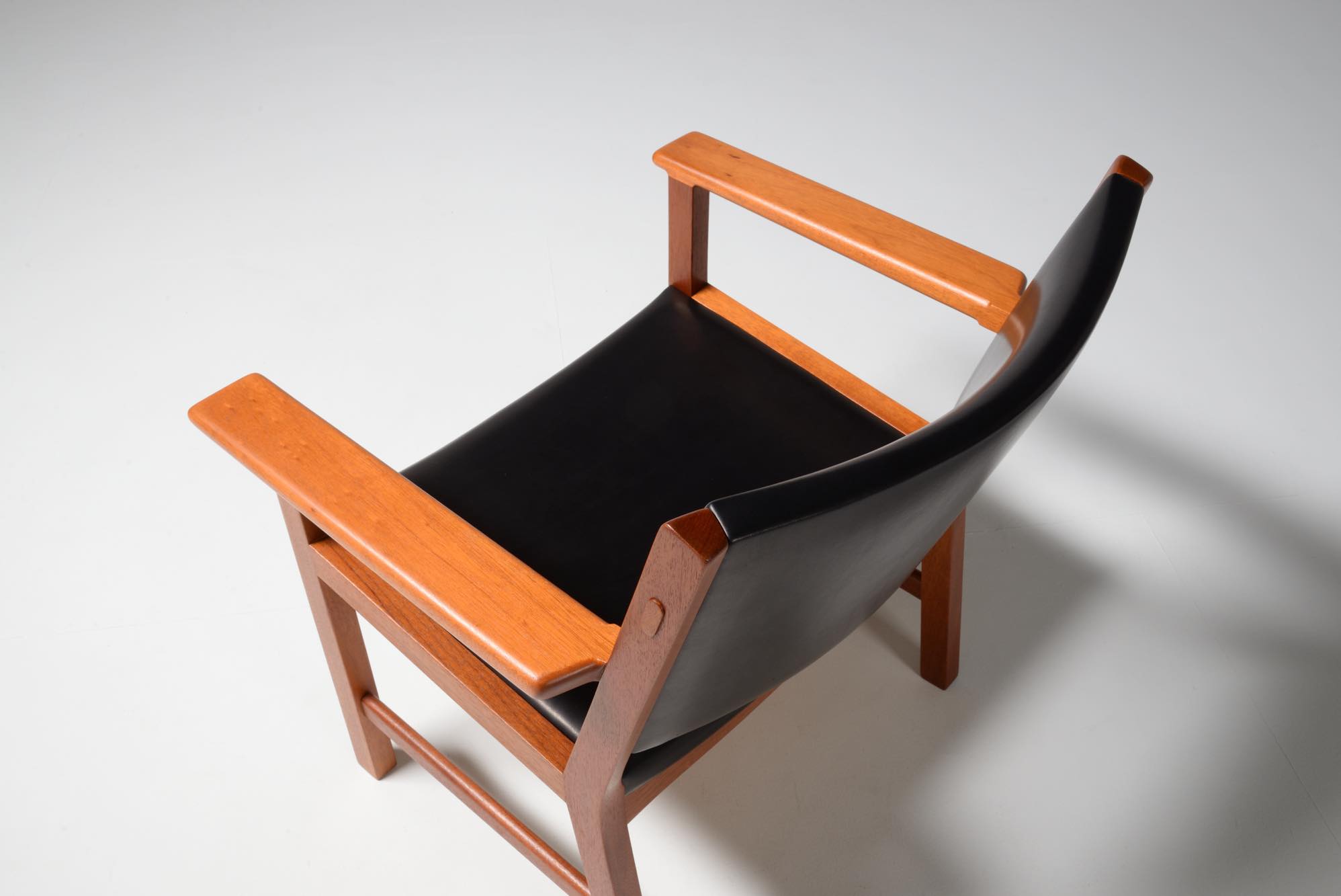 Hans J. Wegner/ハンス・ウェグナーにより1960年代に発表されたサロンチェアです。当初はAP Storenから発売されていたものですが、後にJohannes Hansenが生産を引き継いだようです。座面はイージーチェアよりはやや高く、サロンチェアかカンファレンスチェアと思われ、装飾を省いたシンプルなデザインです。本体はマホガニー材が用いられており、皮革は新たに張り替えました。