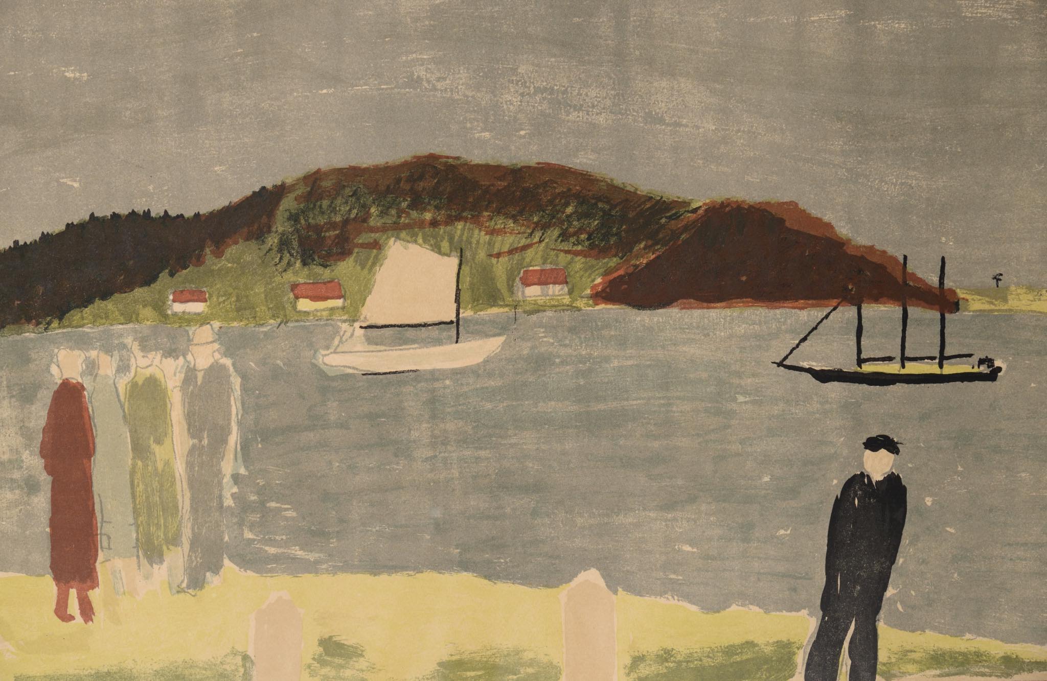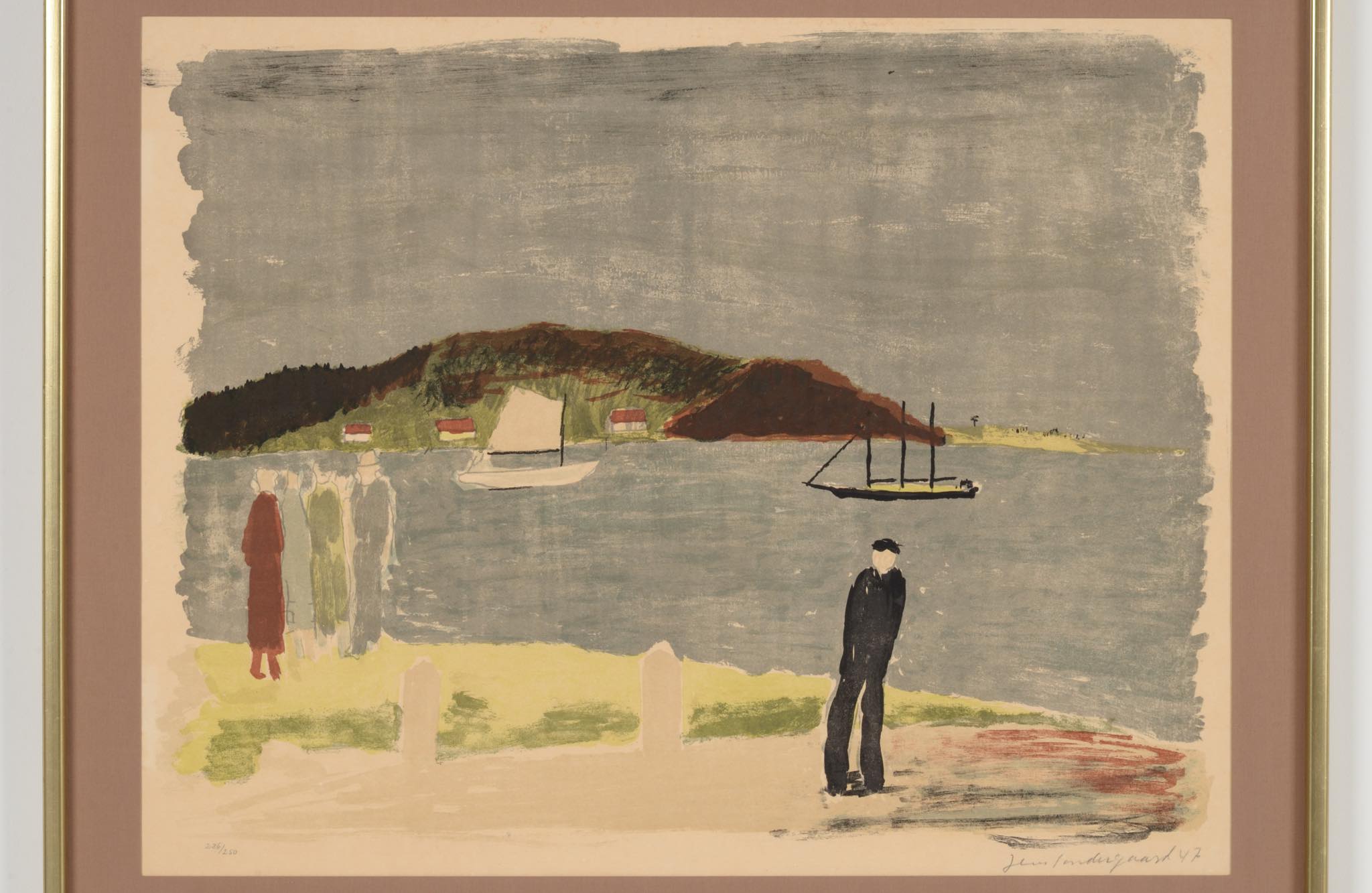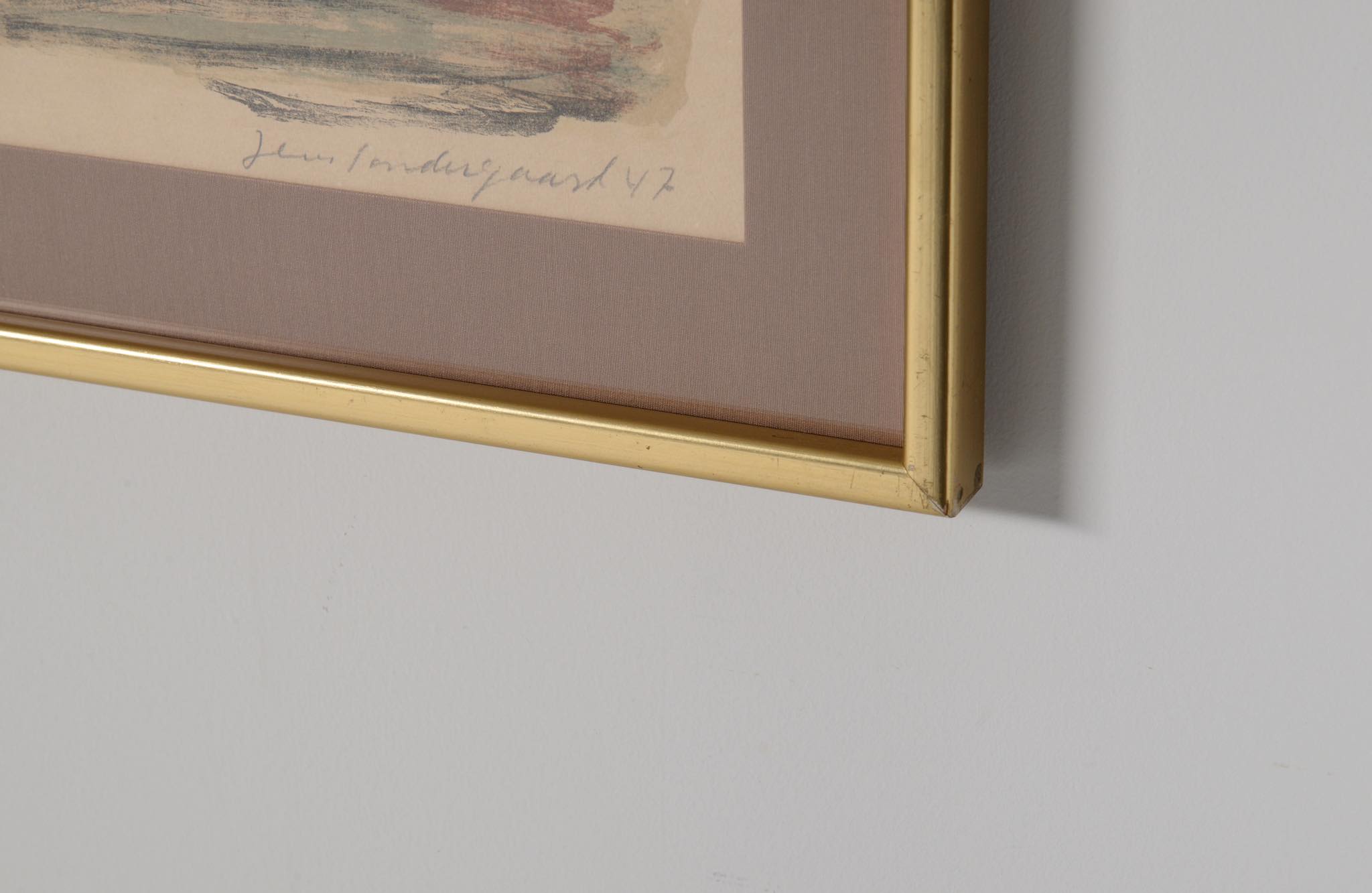 20世紀前葉に活躍したデンマークの画家、Jens Søndergaard/イェンス・ソンダーゴーによるリトグラフ作品です。1947年に刷られたもので、入り江に佇む人々の姿が独自の世界観で描かれています。金箔のフレームはオリジナルで、布被せのマットは新たに制作しました。コンディションは良好です。