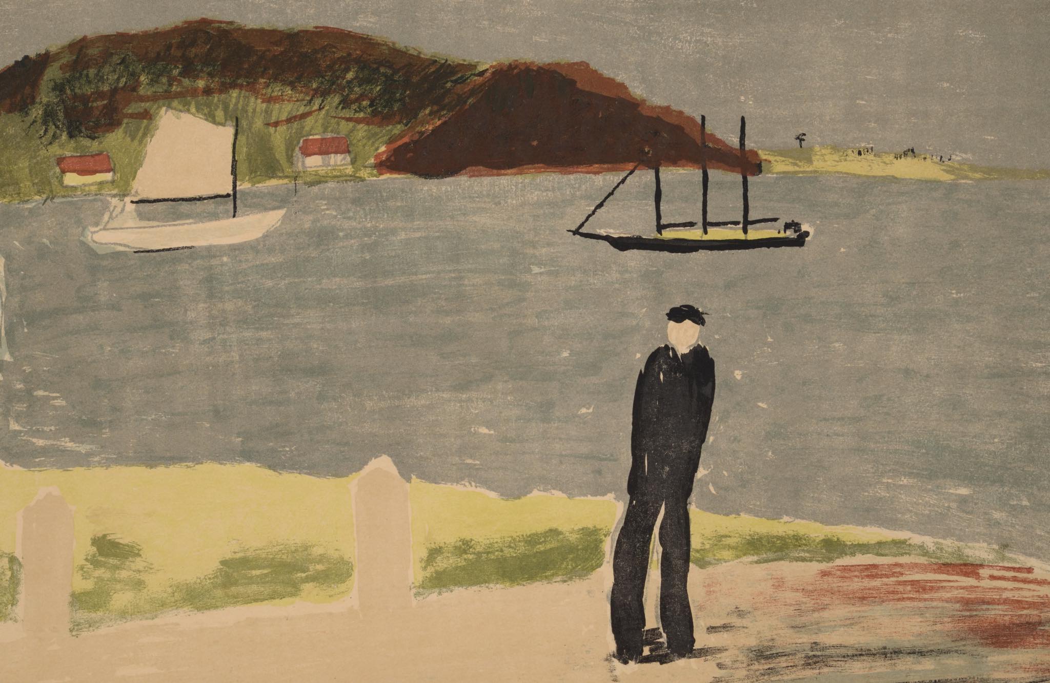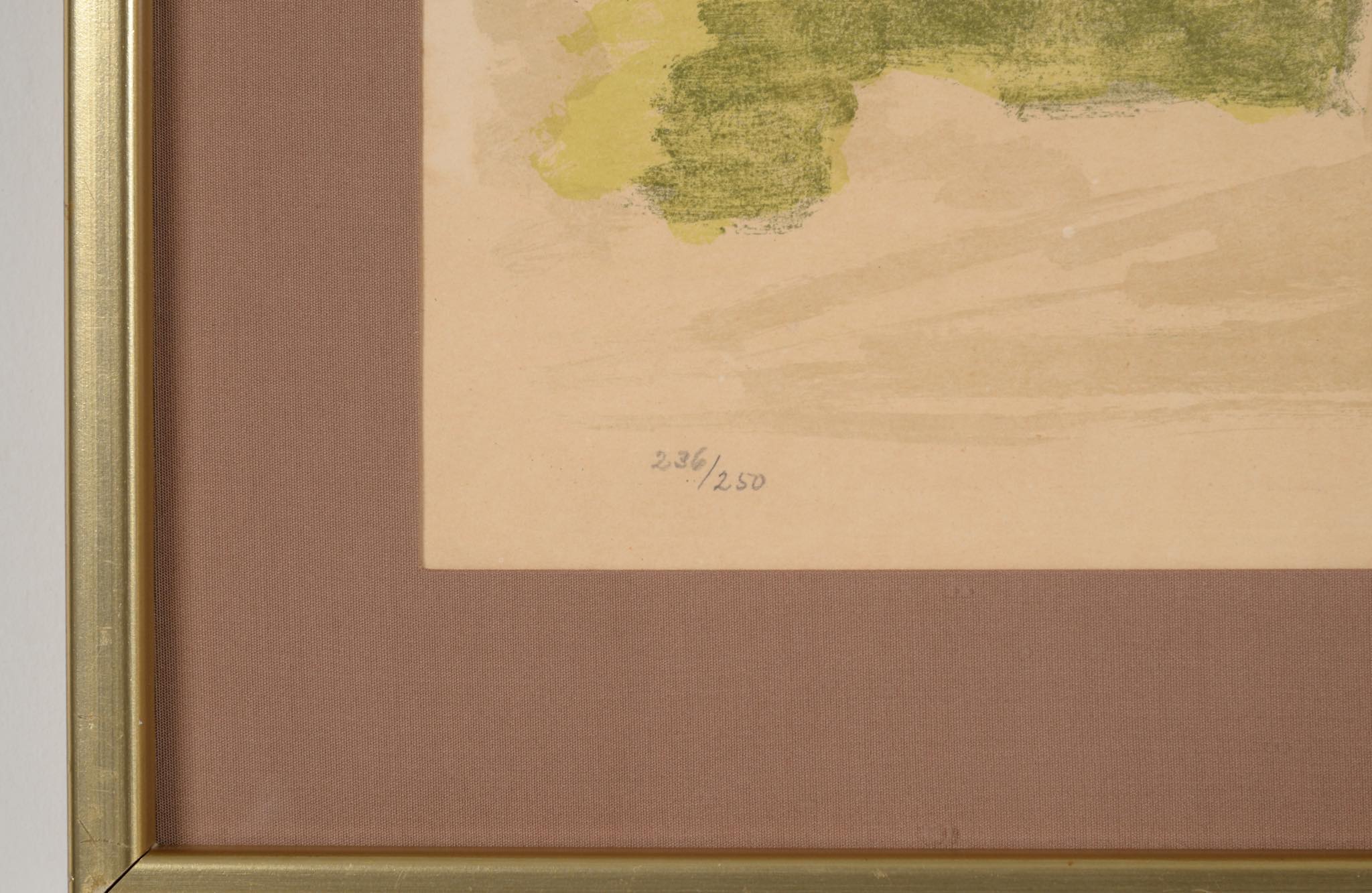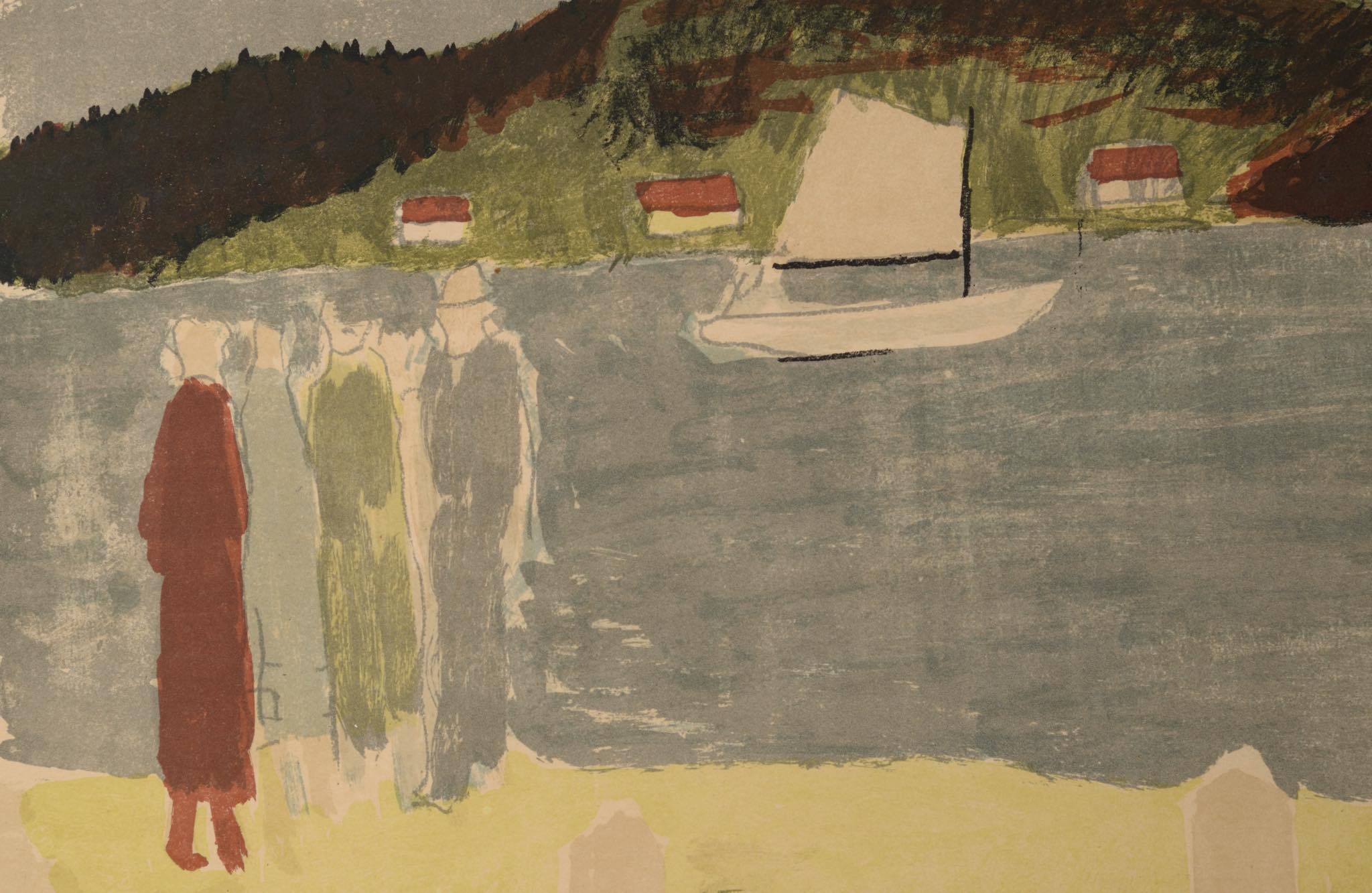 20世紀前葉に活躍したデンマークの画家、Jens Søndergaard/イェンス・ソンダーゴーによるリトグラフ作品です。1947年に刷られたもので、入り江に佇む人々の姿が独自の世界観で描かれています。金箔のフレームはオリジナルで、布被せのマットは新たに制作しました。コンディションは良好です。