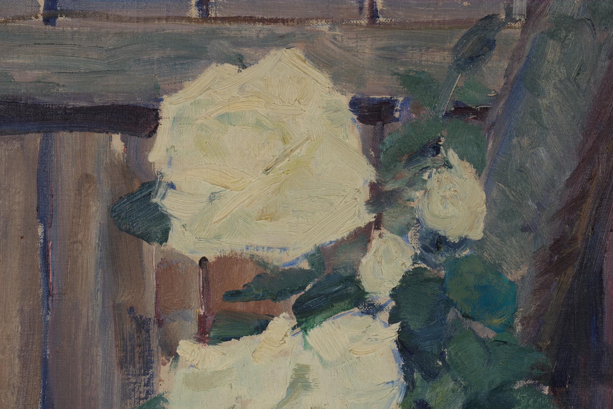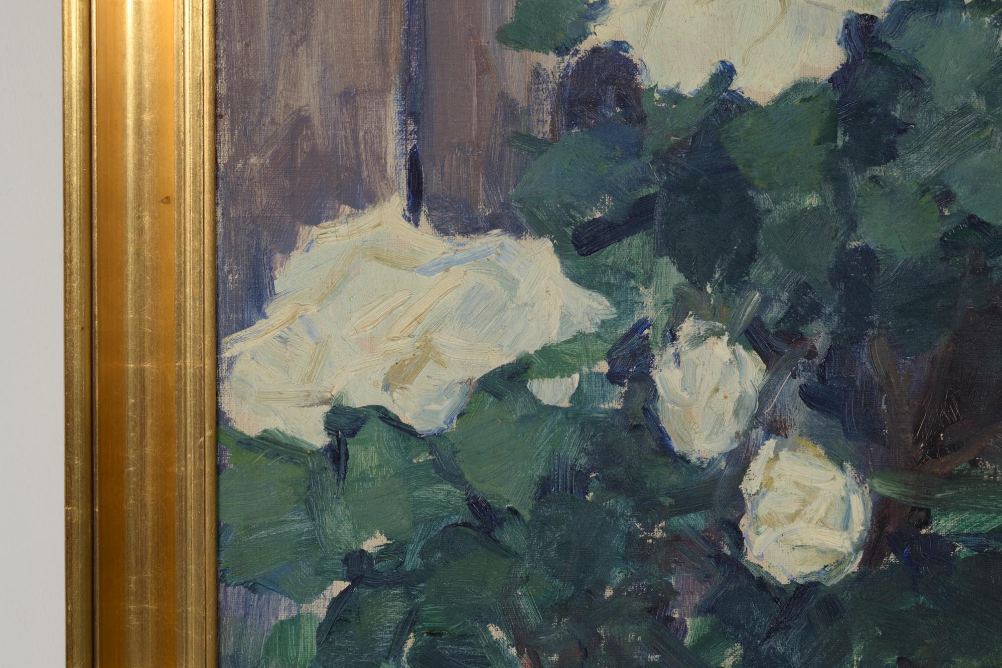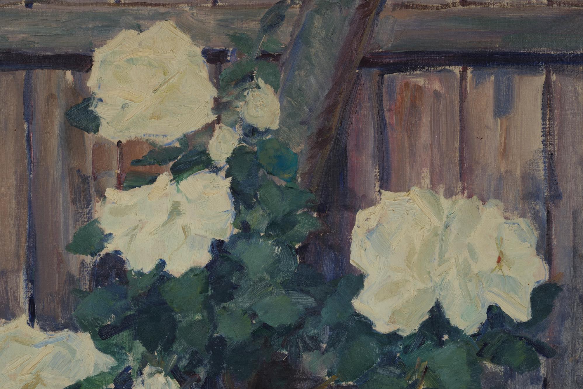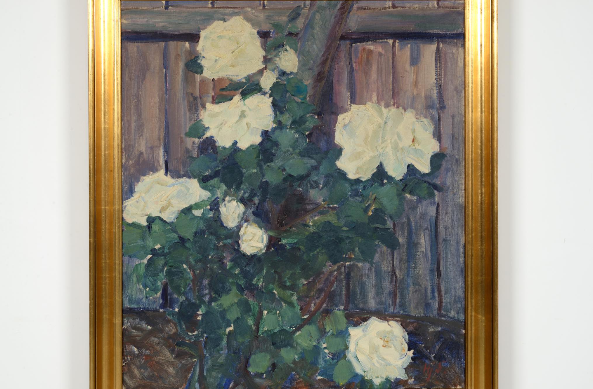 19世紀生まれのデンマーク人画家、Hjalmar Sørensen/ヒャルマー・ソーレンセンによる油彩作品です。庭の垣根に咲き乱れる白い薔薇を、生命感溢れる独自のタッチで描いています。金箔のフレームはオリジナルとなり、コンディションは良好です。
