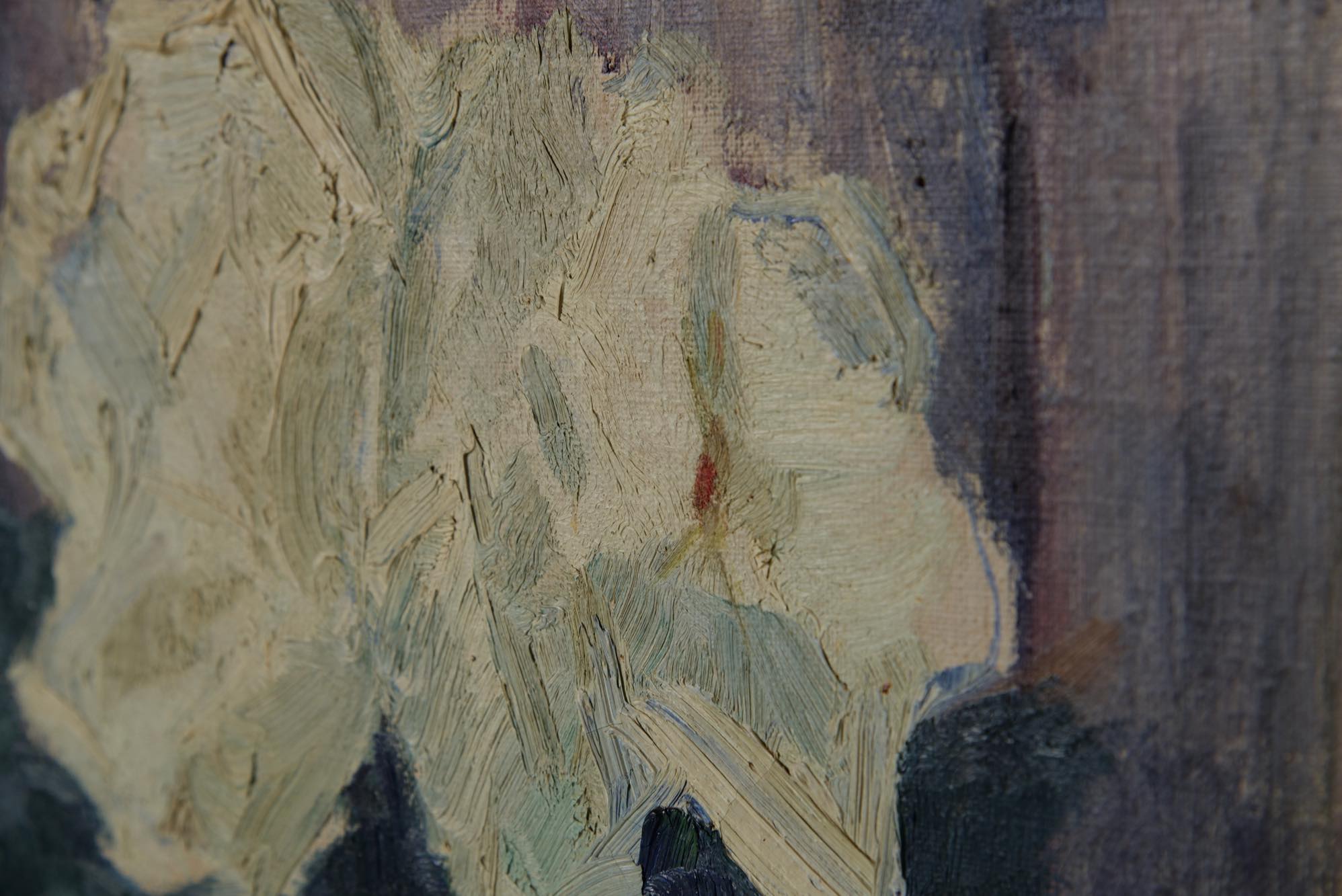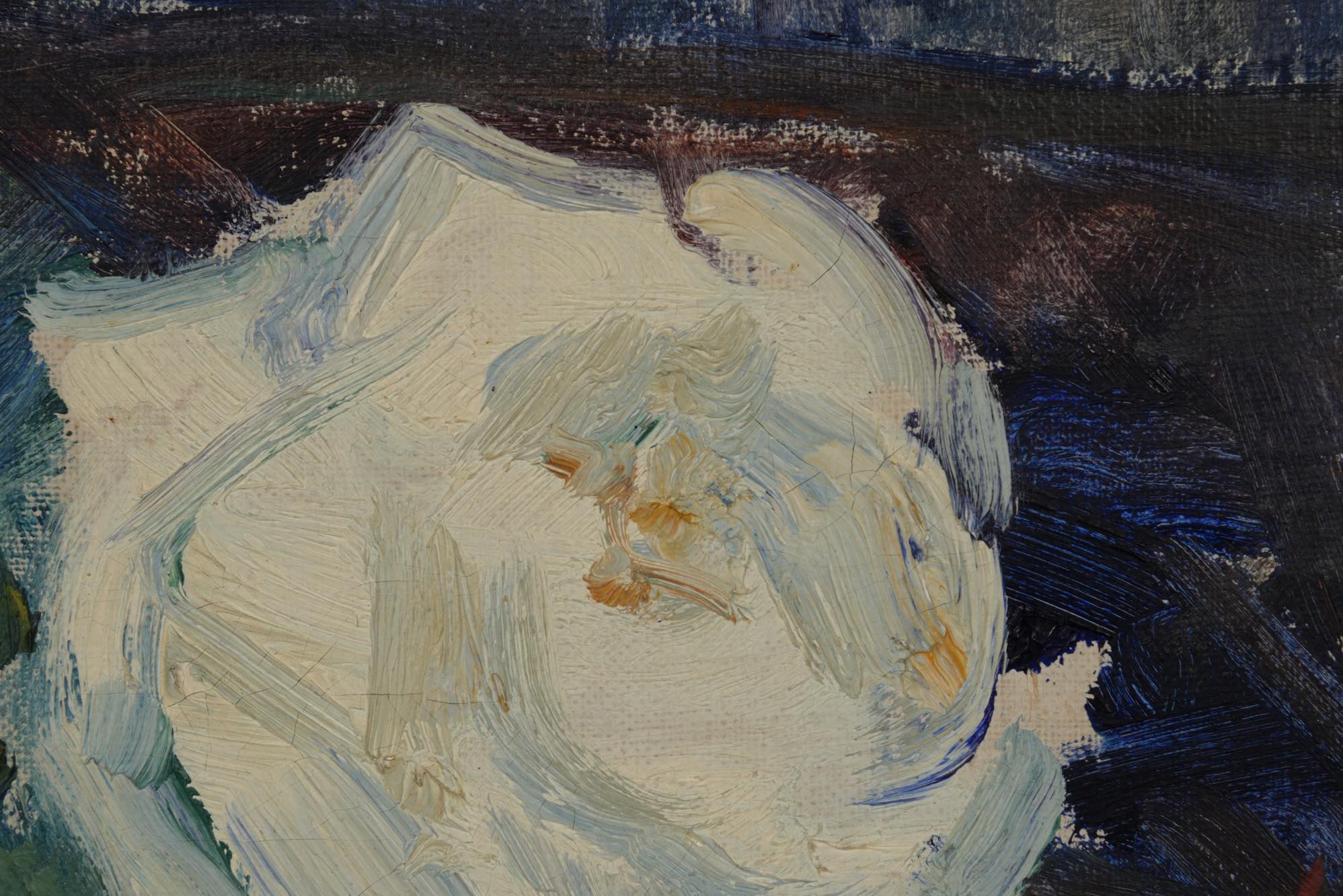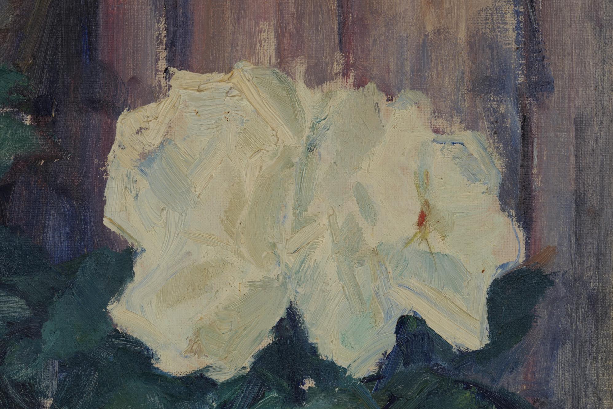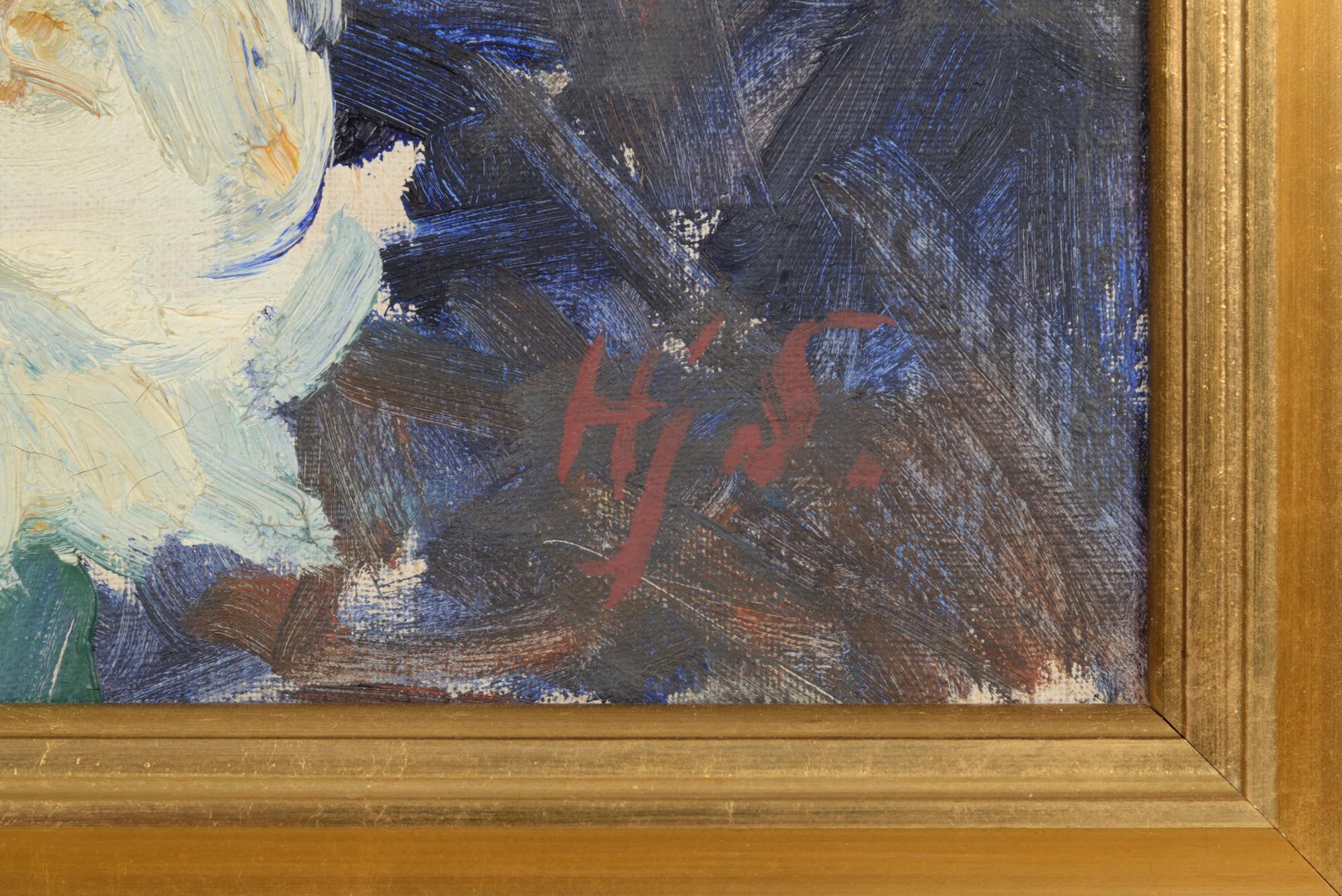 19世紀生まれのデンマーク人画家、Hjalmar Sørensen/ヒャルマー・ソーレンセンによる油彩作品です。庭の垣根に咲き乱れる白い薔薇を、生命感溢れる独自のタッチで描いています。金箔のフレームはオリジナルとなり、コンディションは良好です。