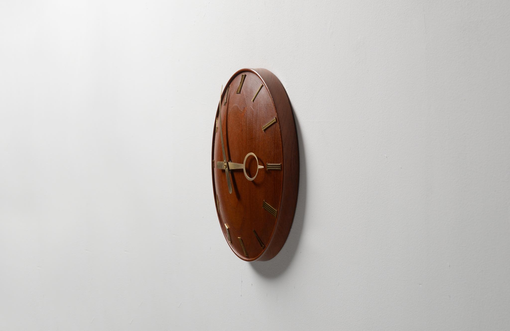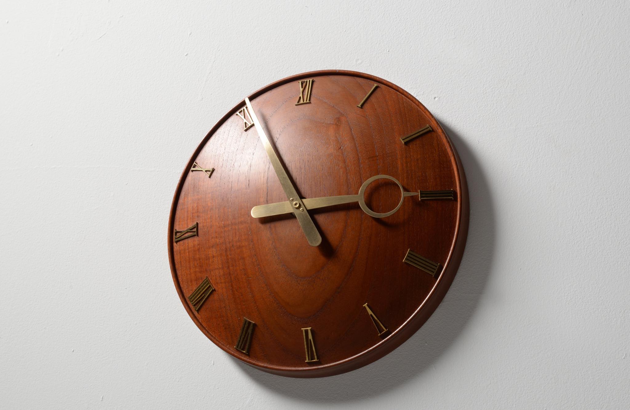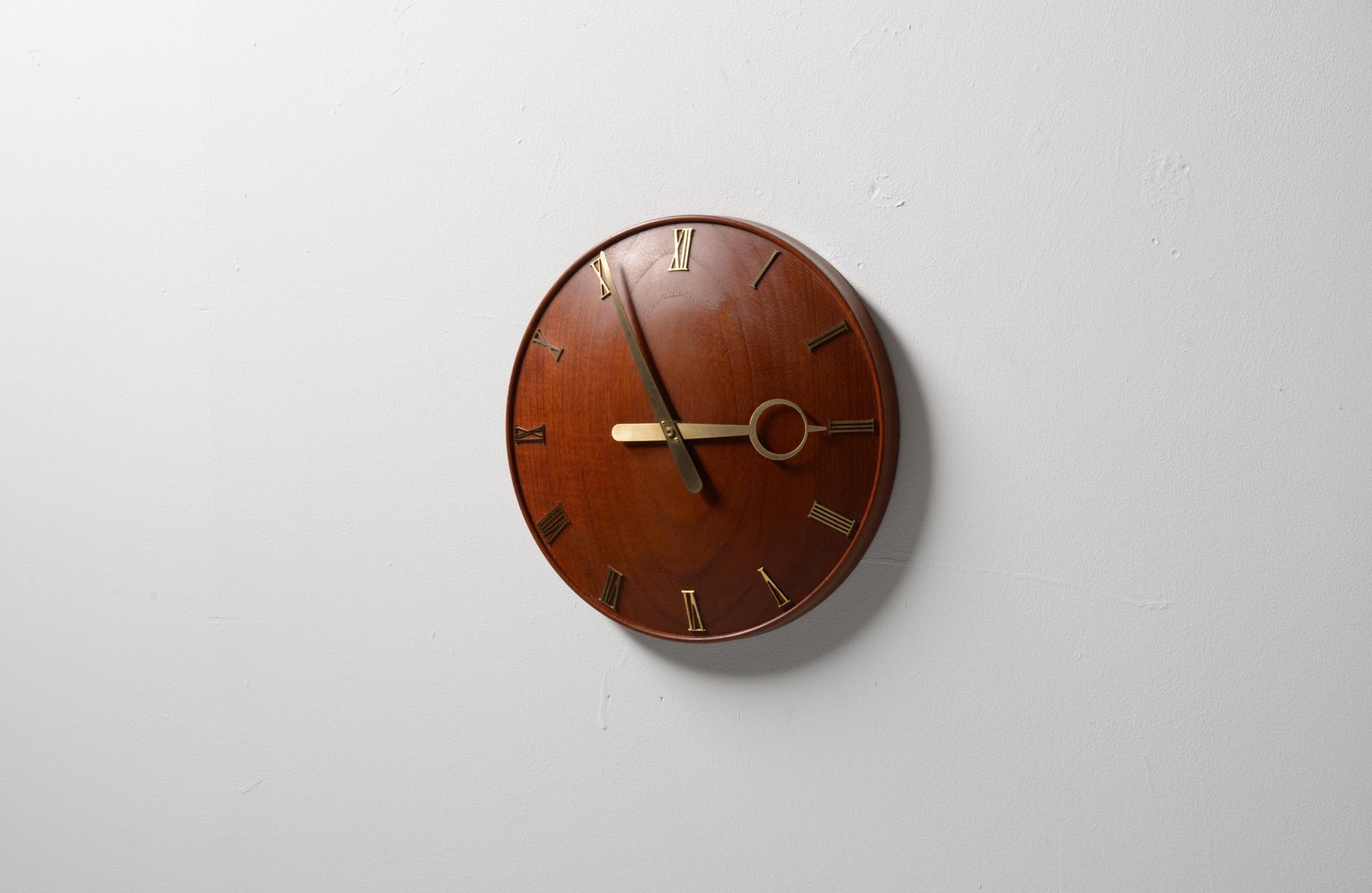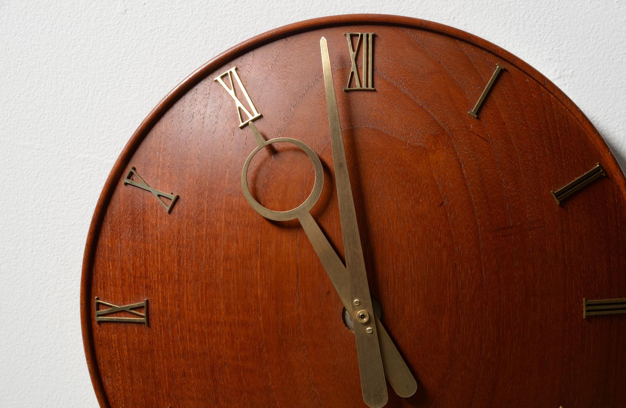 20世紀初頭に活躍したデンマークを代表する建築家、Kaj Gottlob/カイ・ゴットロブによる掛時計です。材は無垢削り出しのチーク材、針や文字、枠は真鍮製で、ガラスが備わります。手の込んだ丁寧な仕事で作られています。ムーブメントはオリジナルの電気式が既に故障していたため、電池式クォーツに差し替えました。故に正確に時を刻んでいます。小傷等見られますがとてもきれいな状態です。