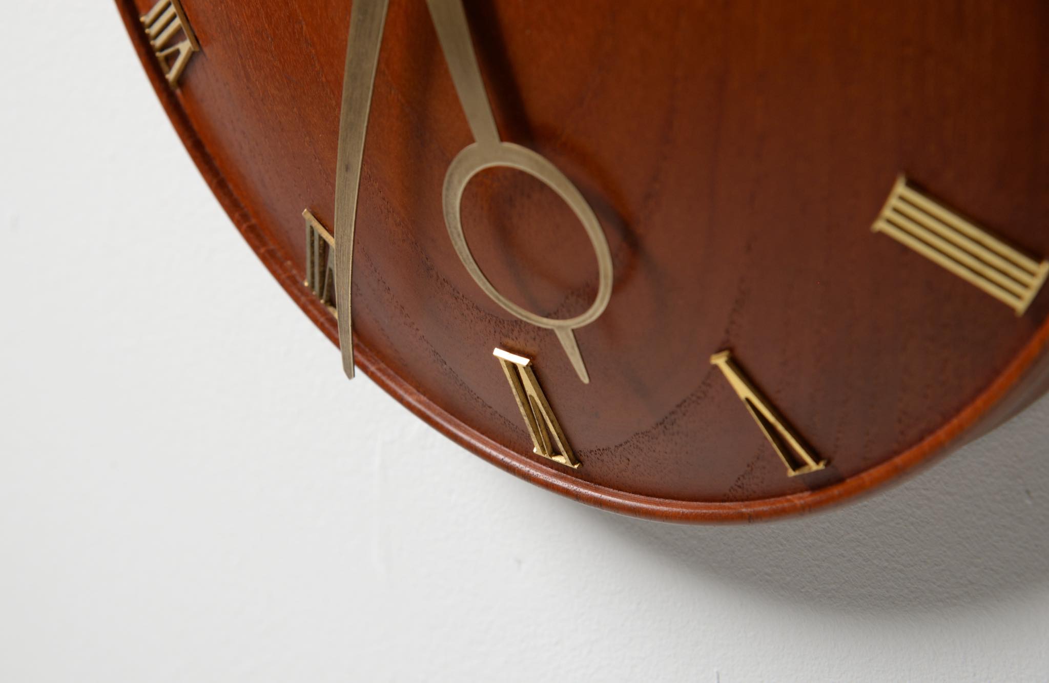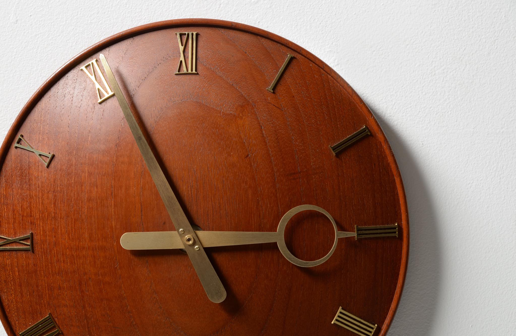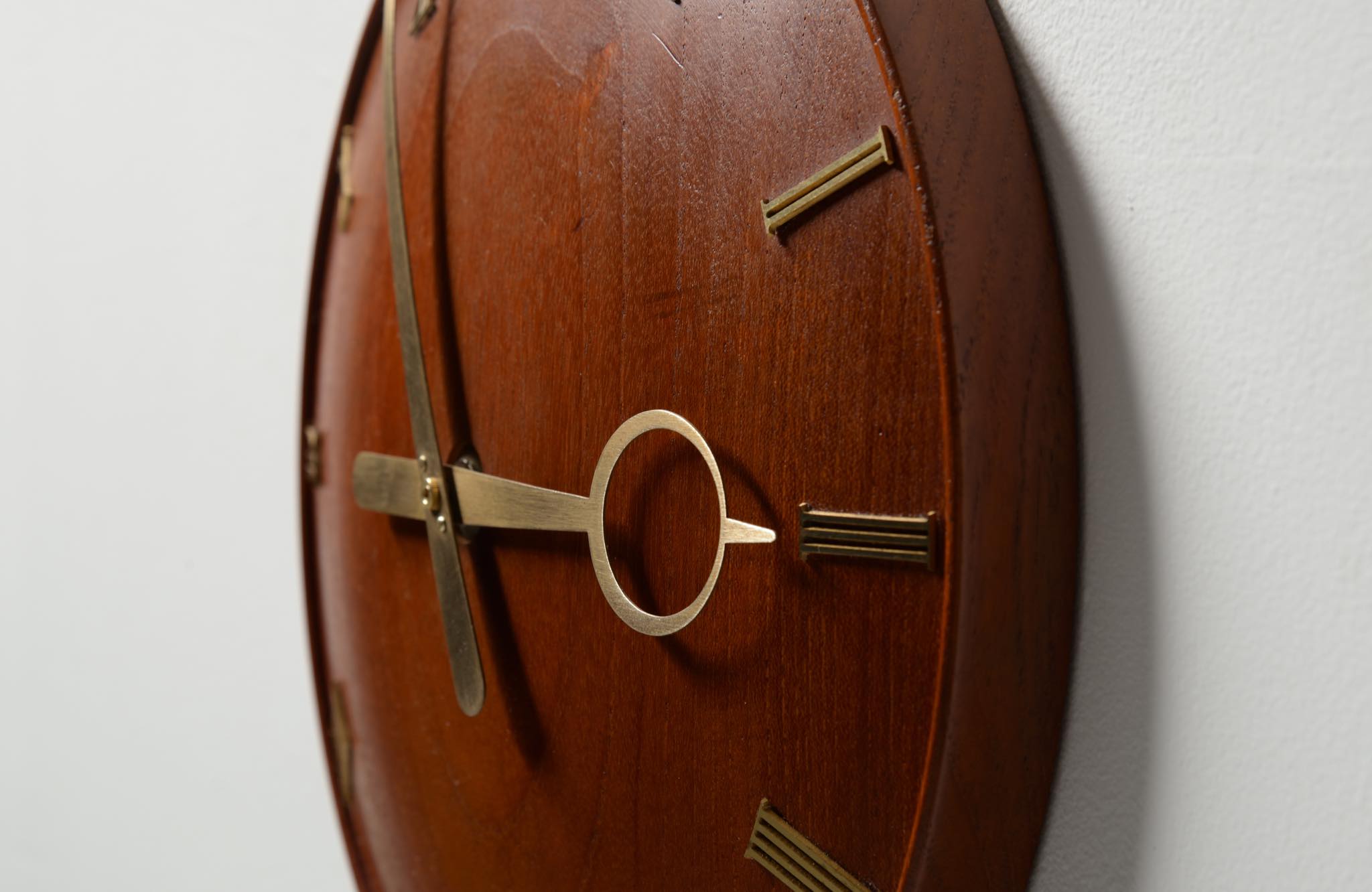 20世紀初頭に活躍したデンマークを代表する建築家、Kaj Gottlob/カイ・ゴットロブによる掛時計です。材は無垢削り出しのチーク材、針や文字、枠は真鍮製で、ガラスが備わります。手の込んだ丁寧な仕事で作られています。ムーブメントはオリジナルの電気式が既に故障していたため、電池式クォーツに差し替えました。故に正確に時を刻んでいます。小傷等見られますがとてもきれいな状態です。