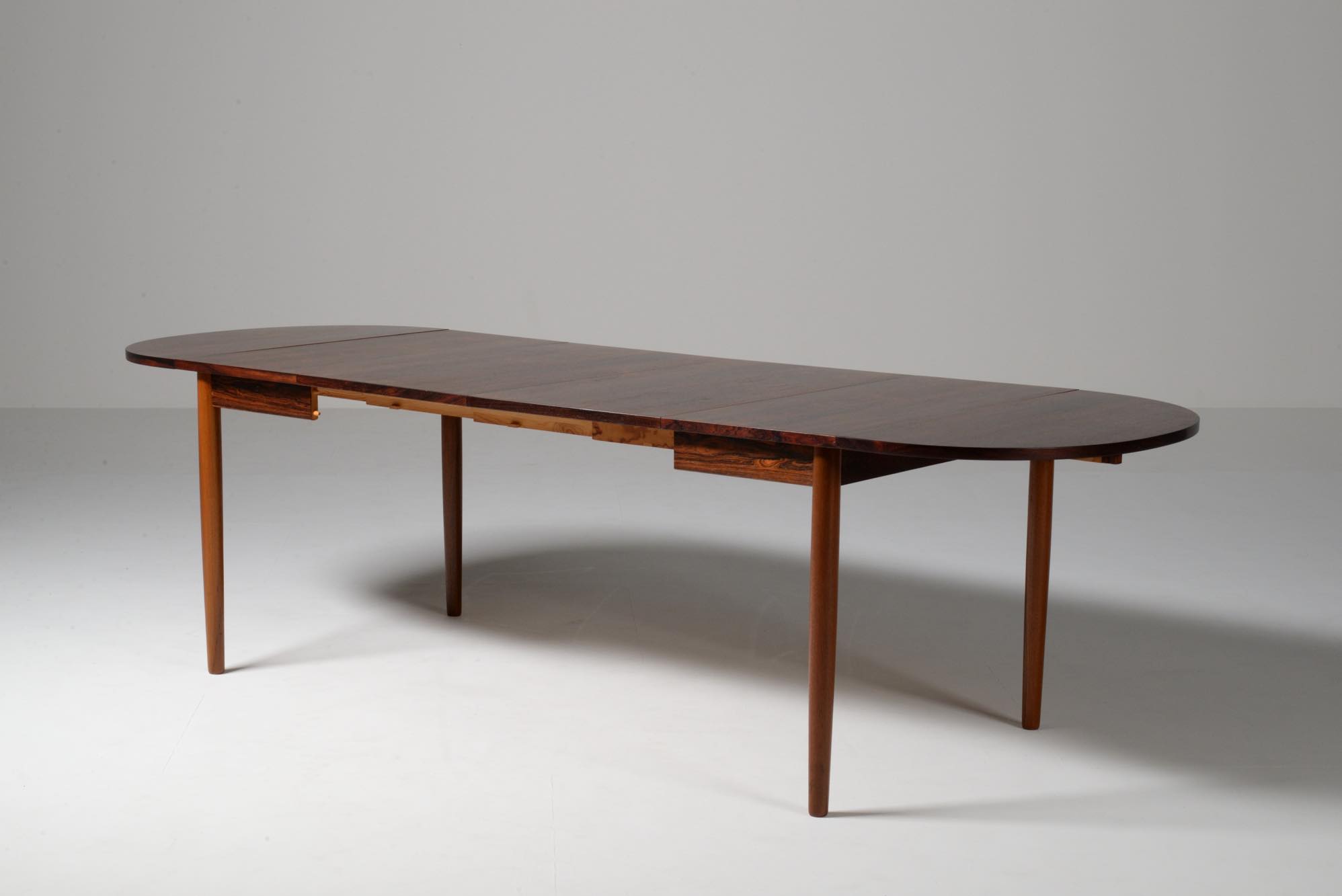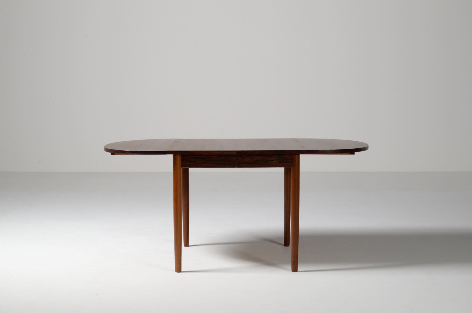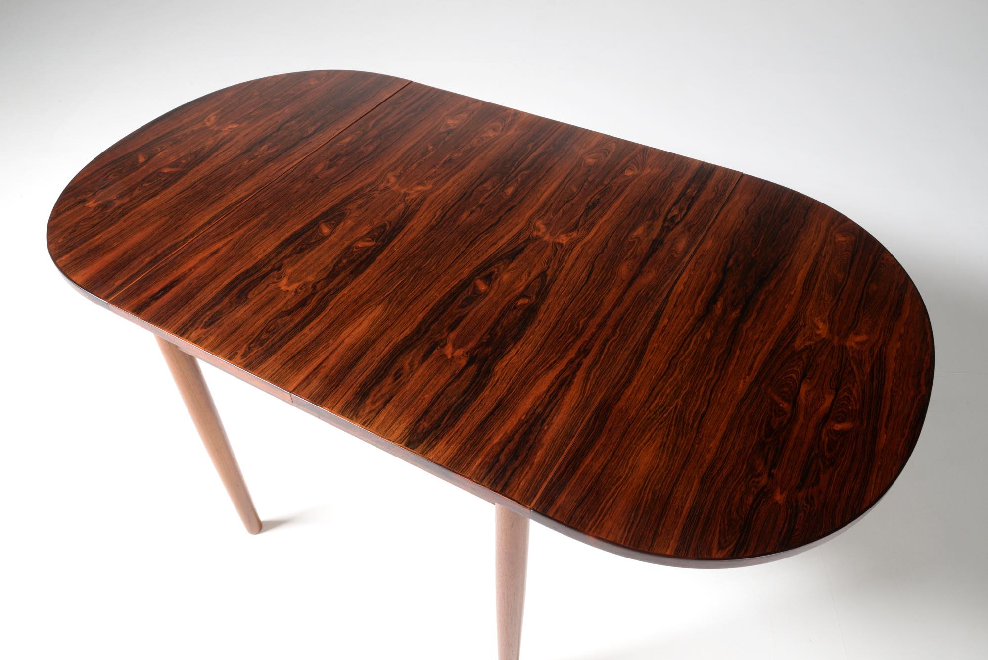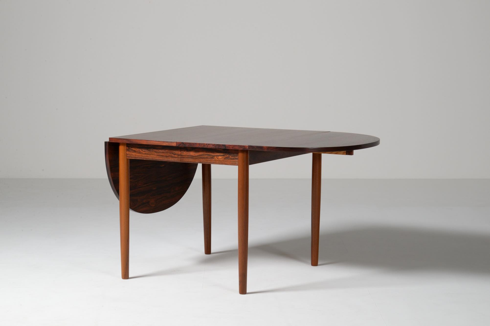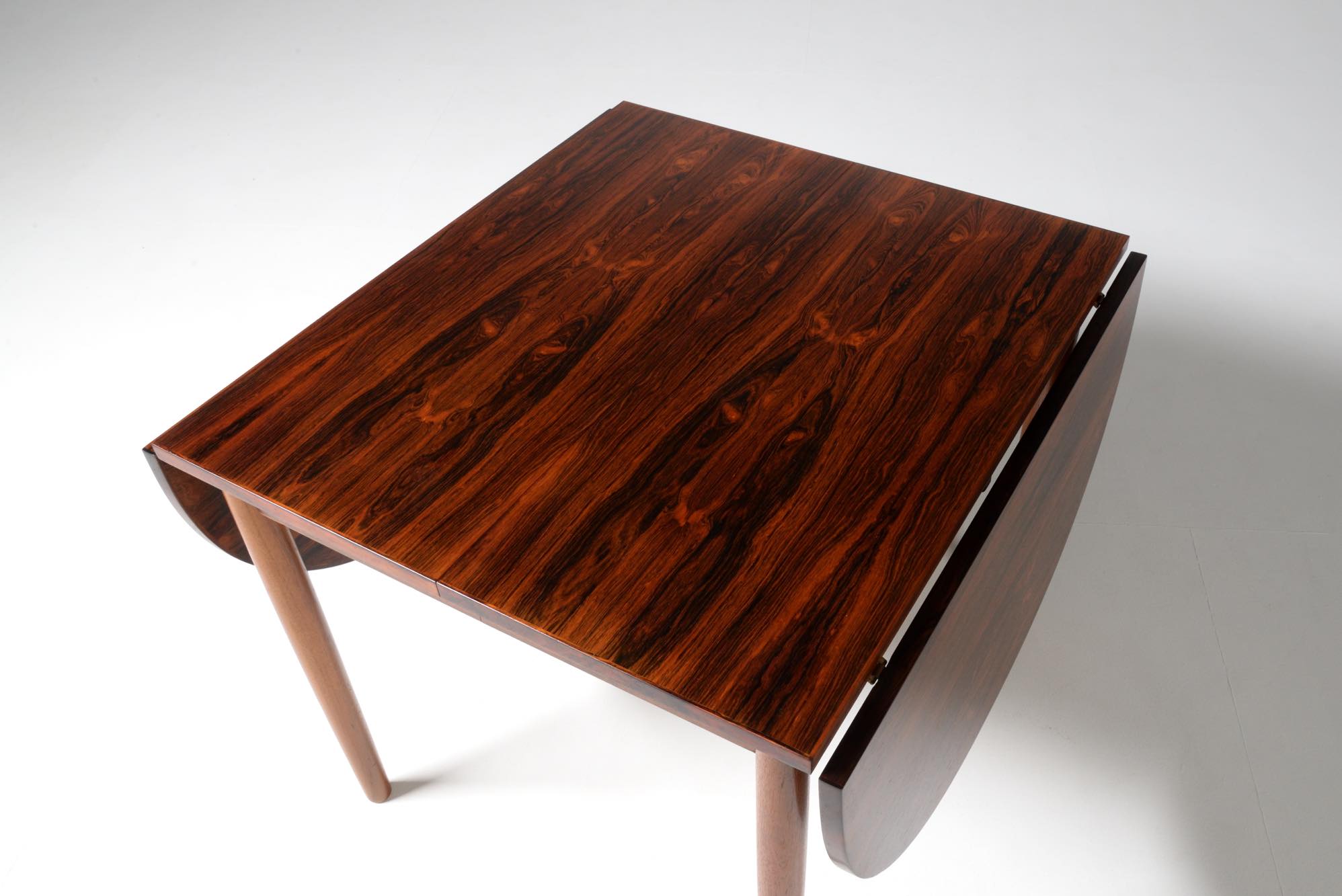 丁寧に作られたデンマーク製のバタフライ式ダイニングテーブルです。1960年代頃に作られたものでしょう。天板はローズウッド材、脚部はマホガニー材が用いられております。天板には半円形のバタフライリーフが左右に備わり、中央にはめ込むタイプのエクステンションリーフが2枚付属するので、最大で264センチまで拡張します。エクステンションリーフのエッジに僅かな欠けがありますが綺麗な状態です。