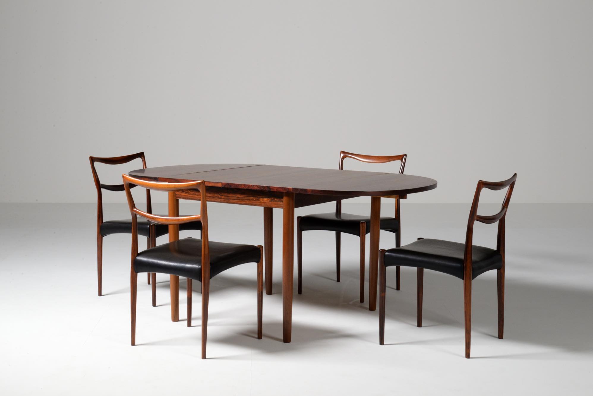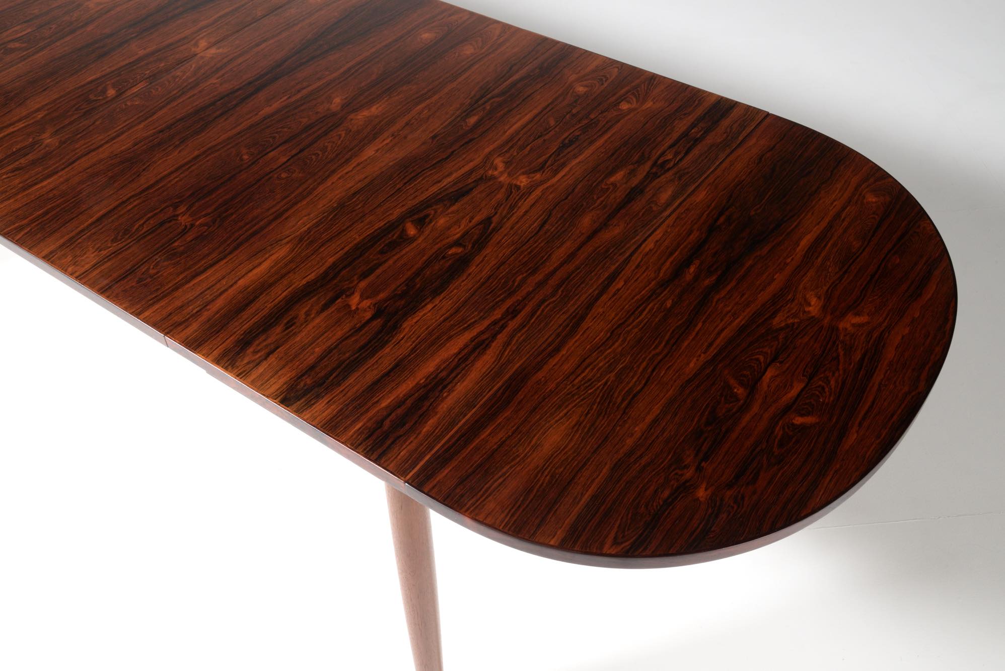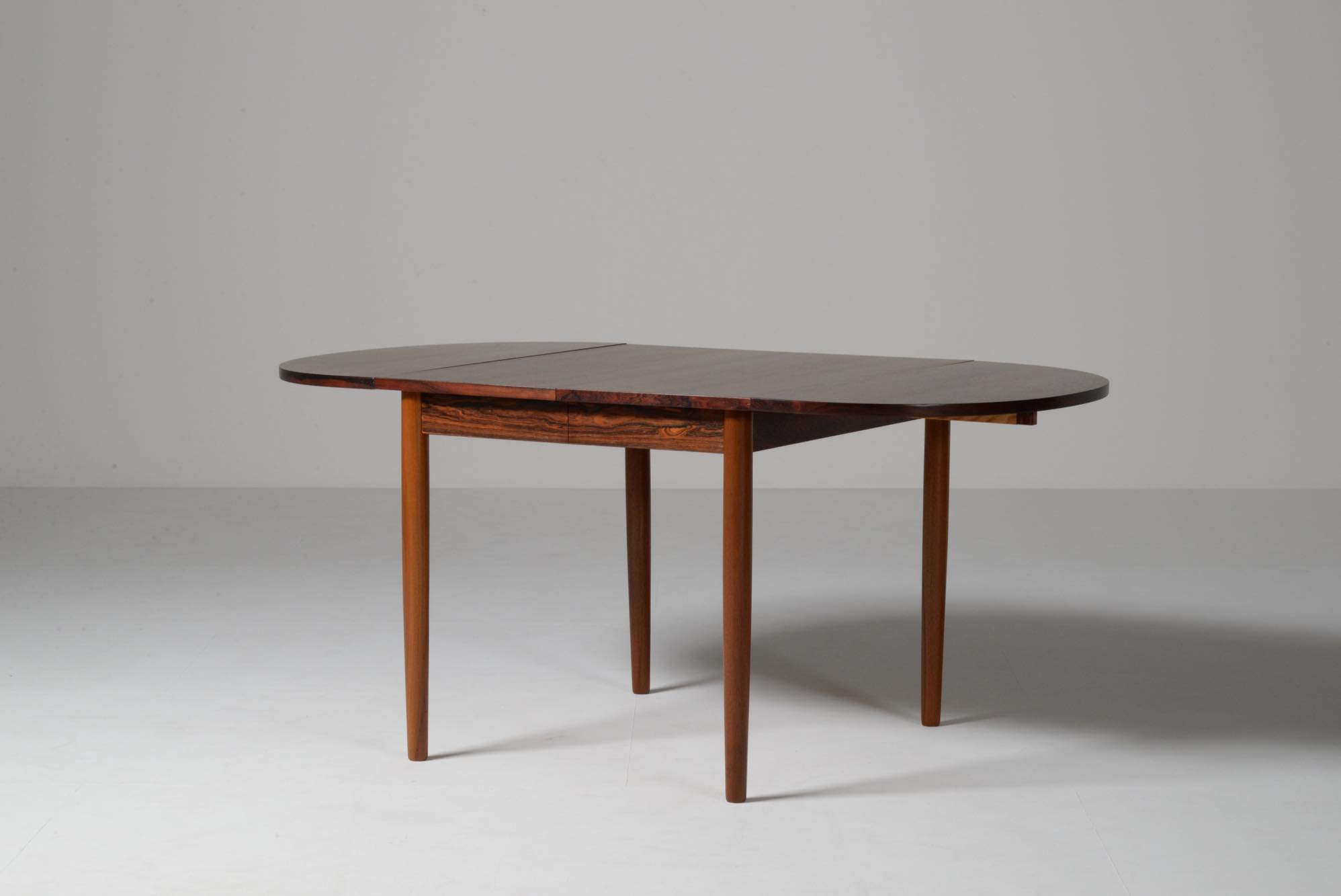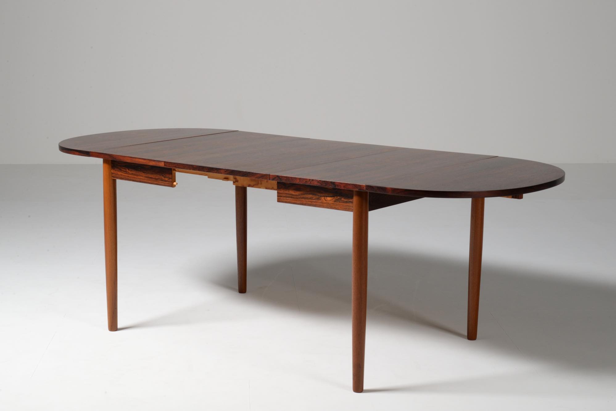 丁寧に作られたデンマーク製のバタフライ式ダイニングテーブルです。1960年代頃に作られたものでしょう。天板はローズウッド材、脚部はマホガニー材が用いられております。天板には半円形のバタフライリーフが左右に備わり、中央にはめ込むタイプのエクステンションリーフが2枚付属するので、最大で264センチまで拡張します。エクステンションリーフのエッジに僅かな欠けがありますが綺麗な状態です。