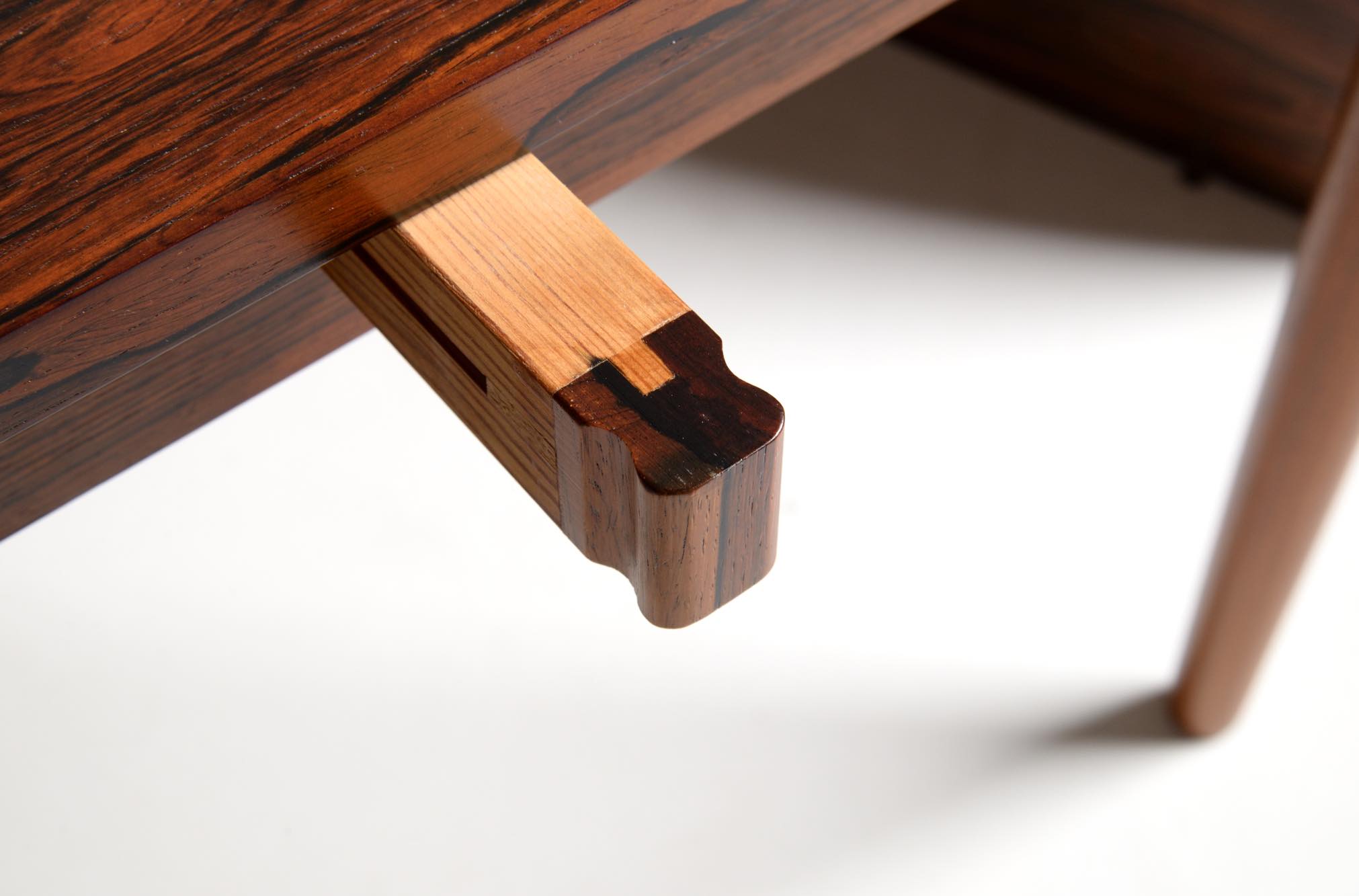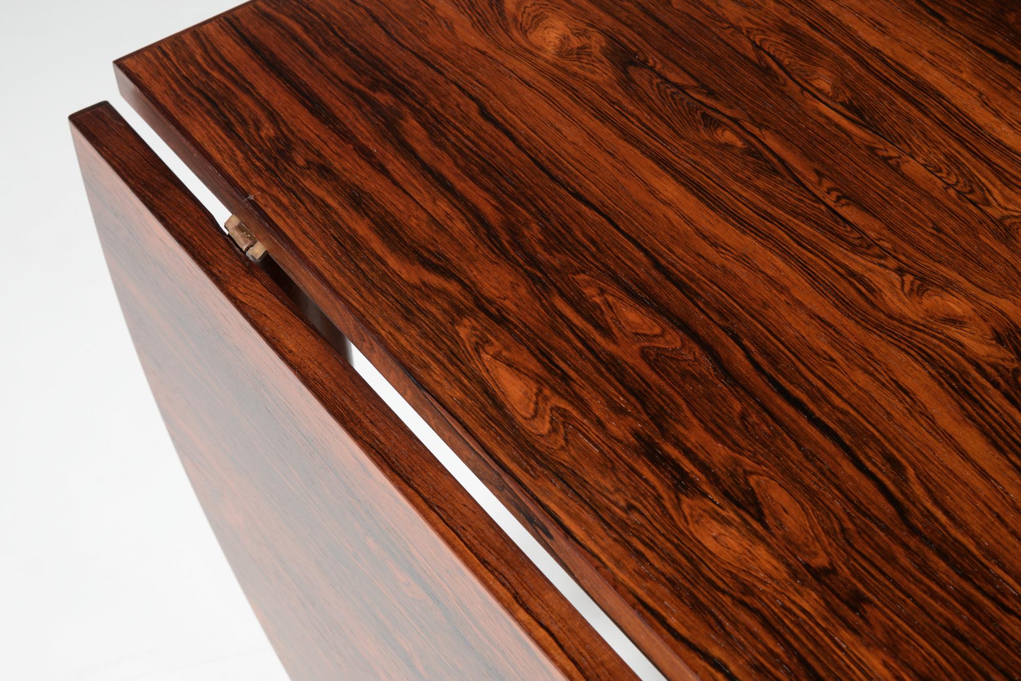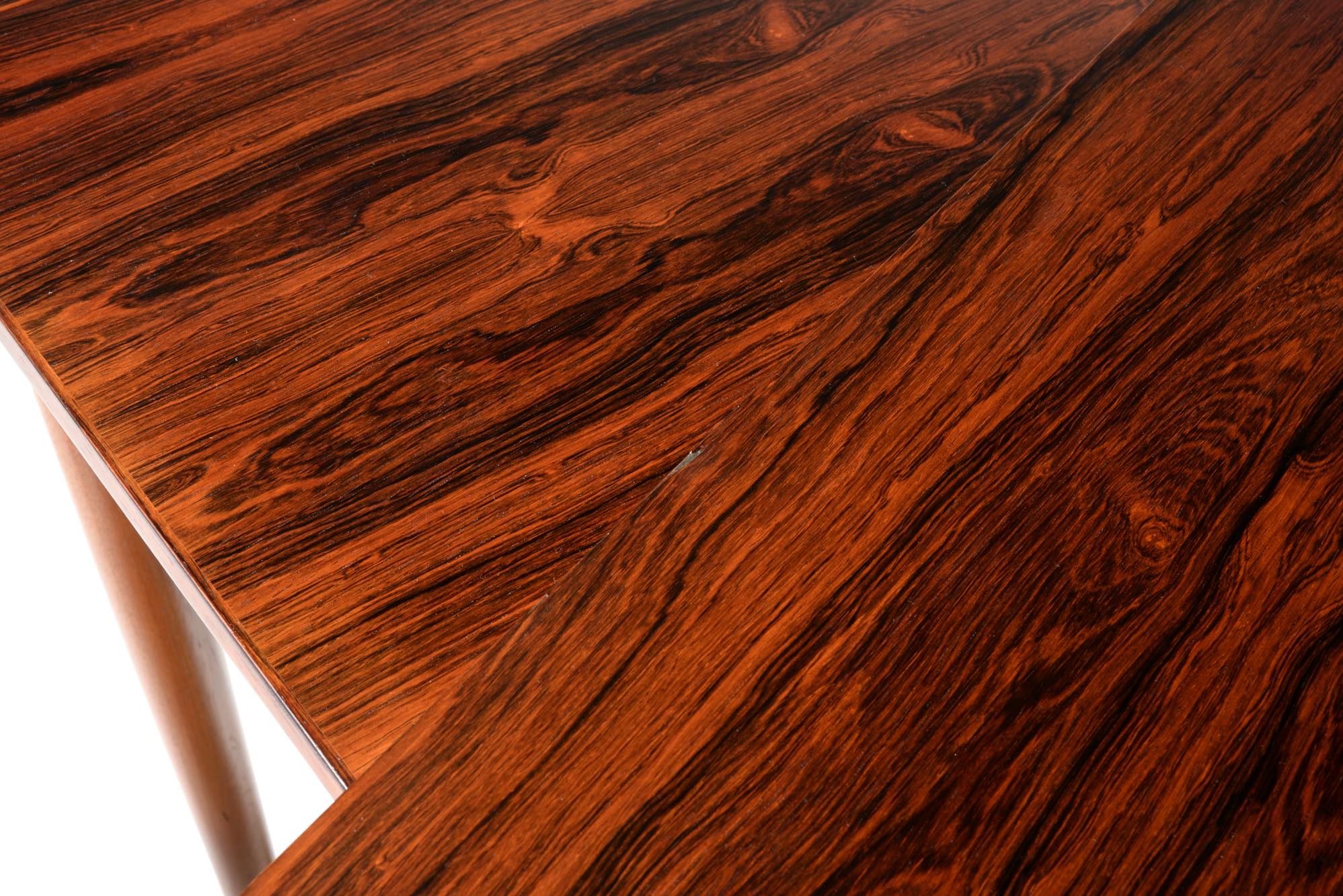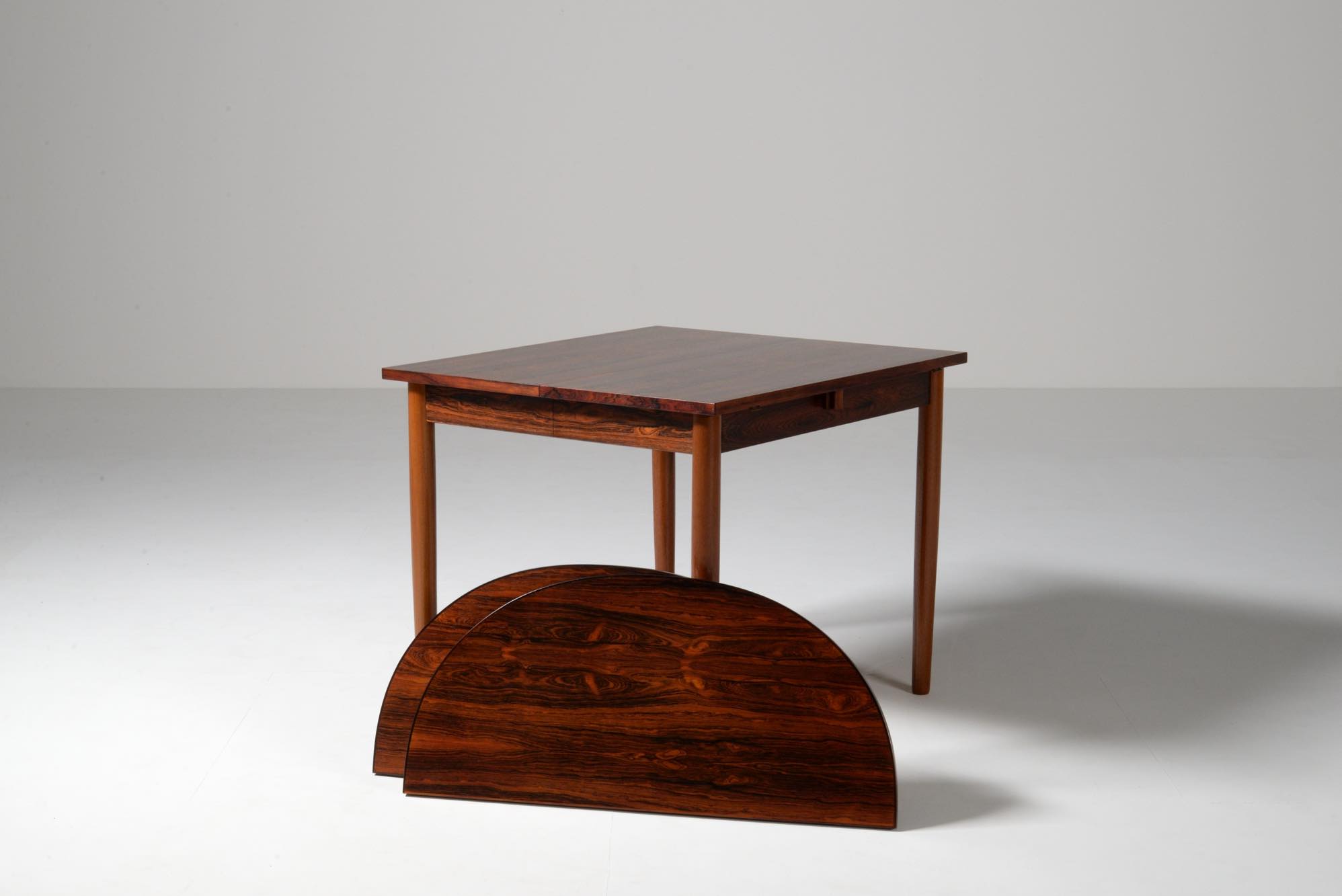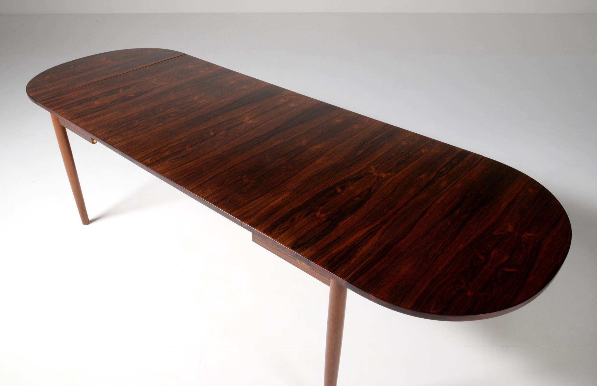丁寧に作られたデンマーク製のバタフライ式ダイニングテーブルです。1960年代頃に作られたものでしょう。天板はローズウッド材、脚部はマホガニー材が用いられております。天板には半円形のバタフライリーフが左右に備わり、中央にはめ込むタイプのエクステンションリーフが2枚付属するので、最大で264センチまで拡張します。エクステンションリーフのエッジに僅かな欠けがありますが綺麗な状態です。