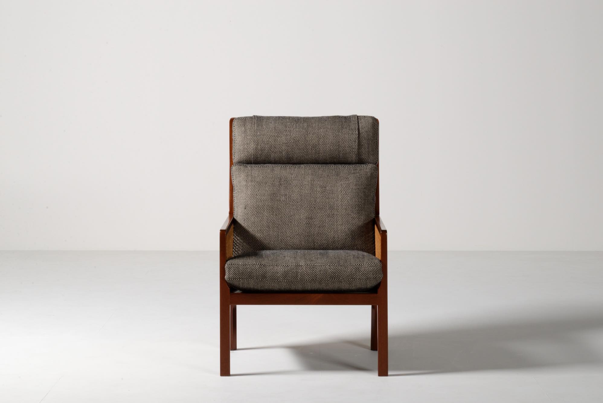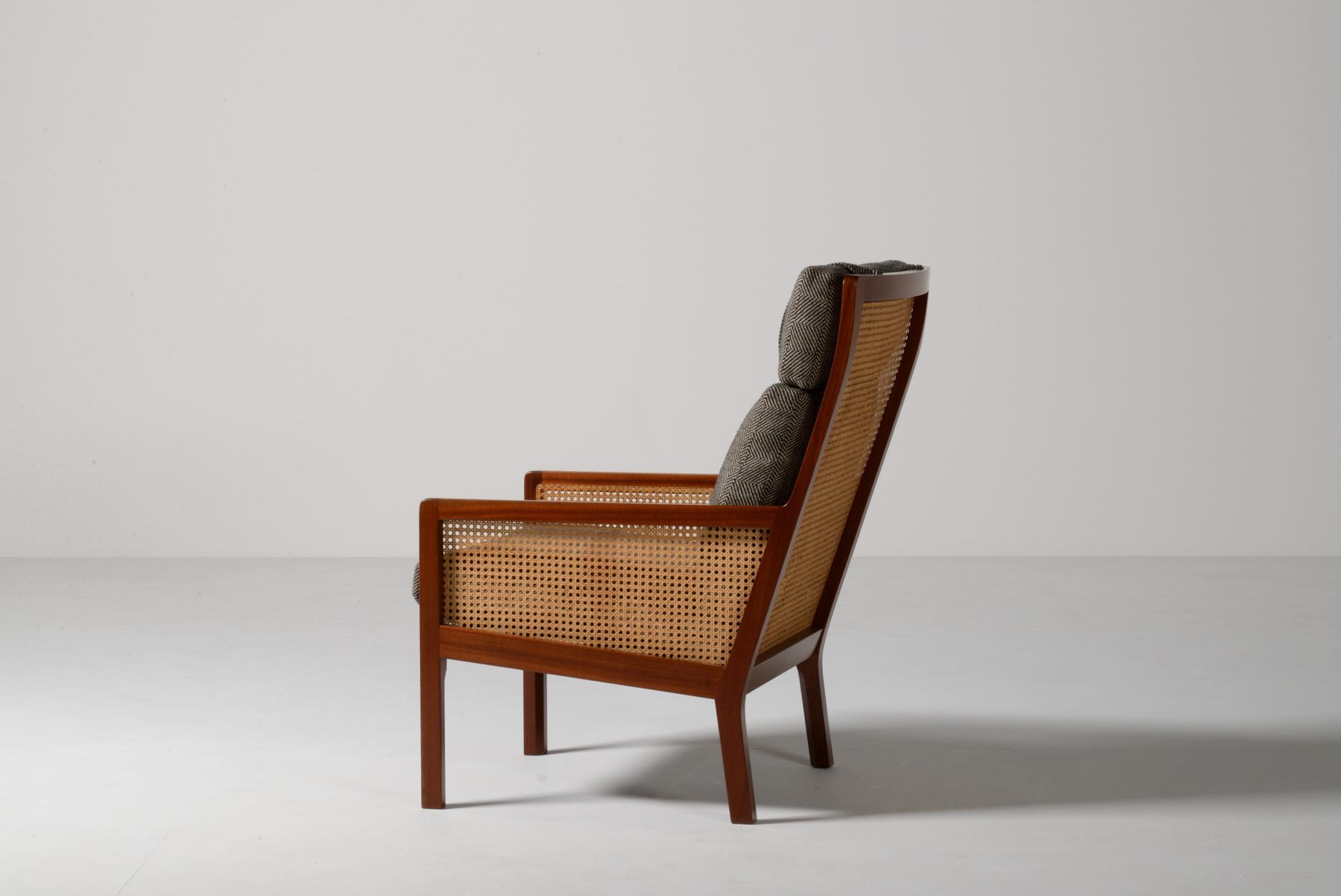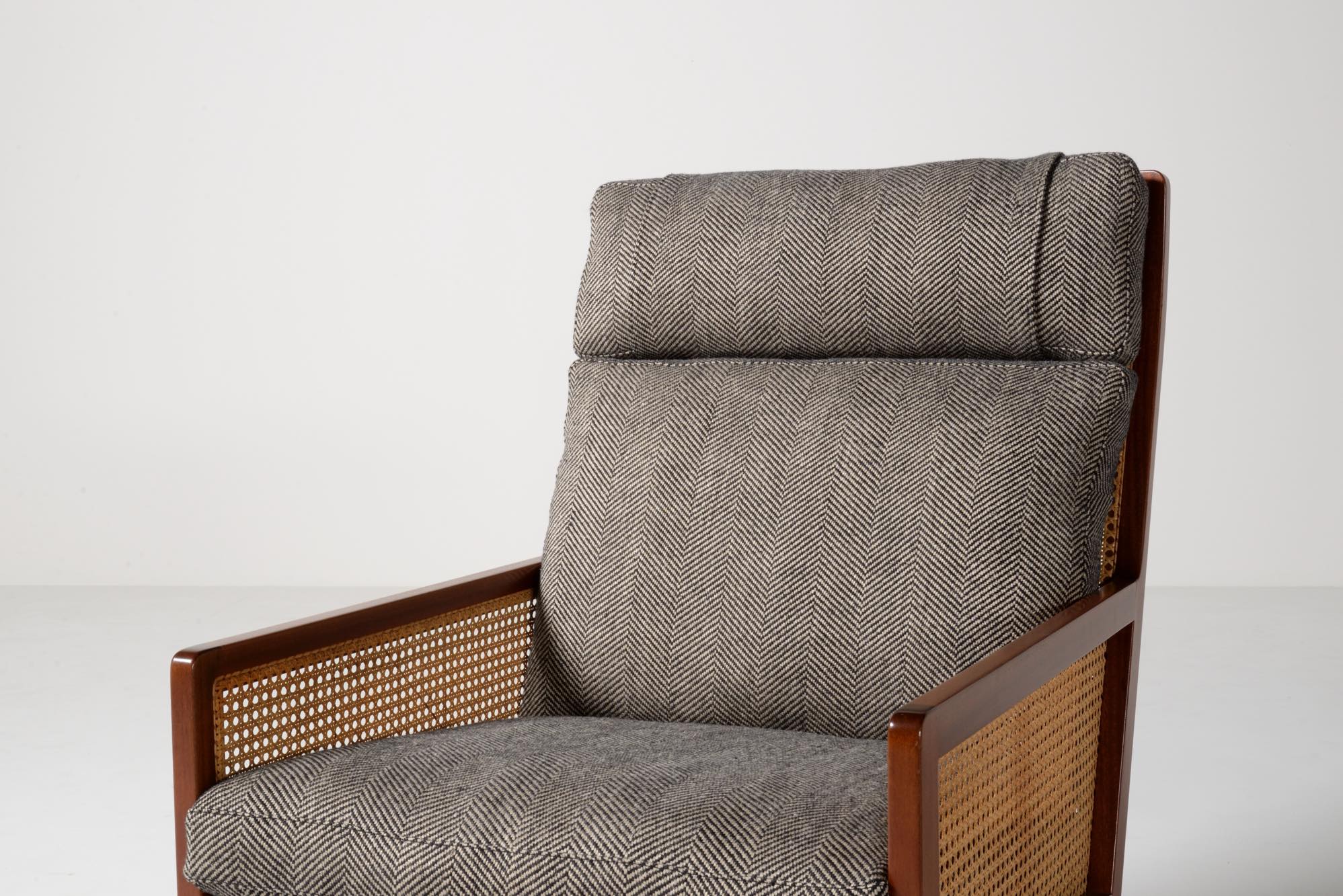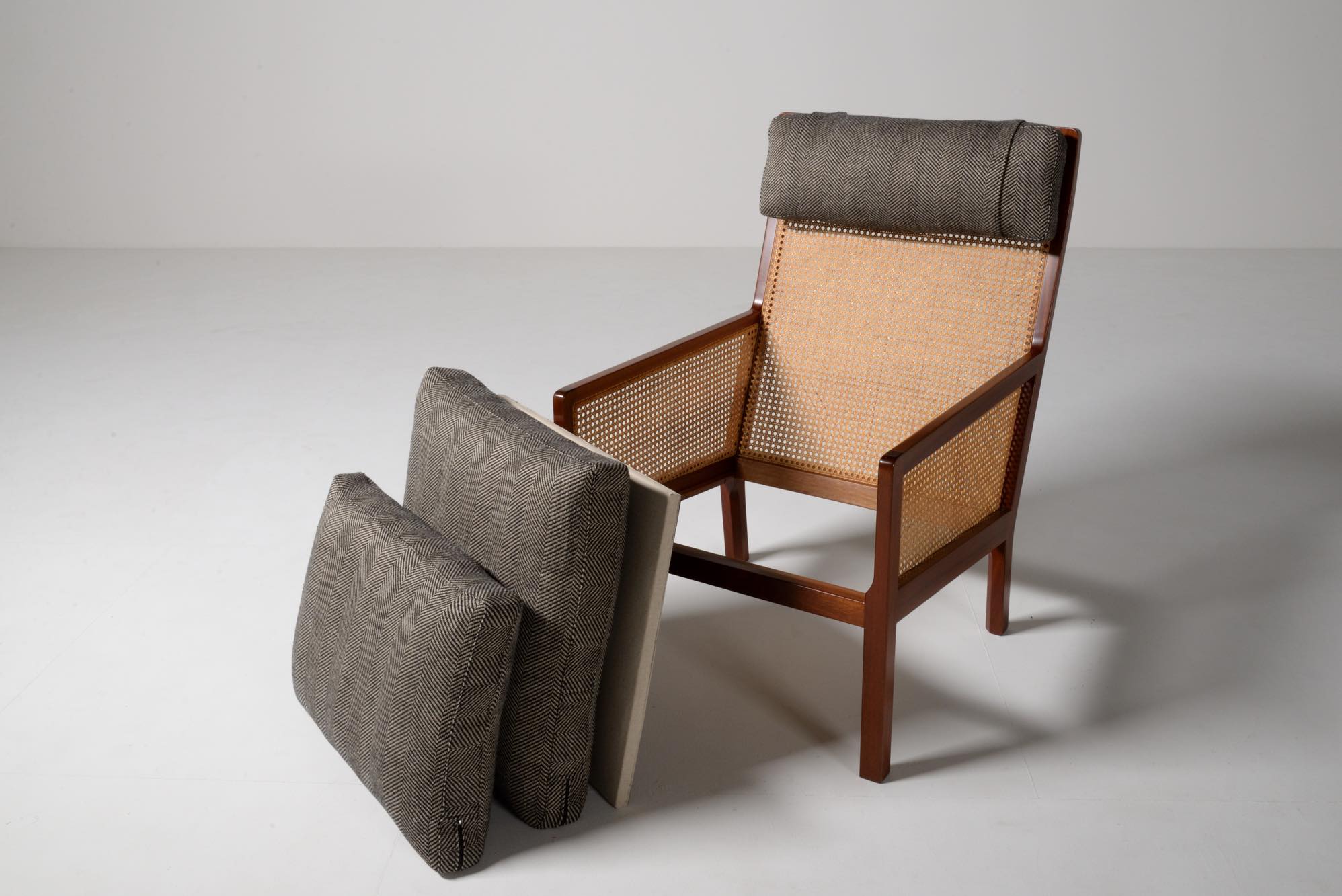 デンマークのデザイナー、Bernt Petersen/ベアント・ピーターセンによる籐張りのハイバックイージーチェアです。1964年に発表されたシリーズで、こちらもその頃に作られたものでしょう。頭部に枕の備わるハイバックのタイプです。フレームはマホガニー材が用いられており、背もたれとアーム下には籐張りが施されています。羽毛クッションを新たに作り、ファブリックはイタリアのロロ・ピアーナ・インテリアのリネンの椅子張り用生地にて張り替えました。とても綺麗な状態です。