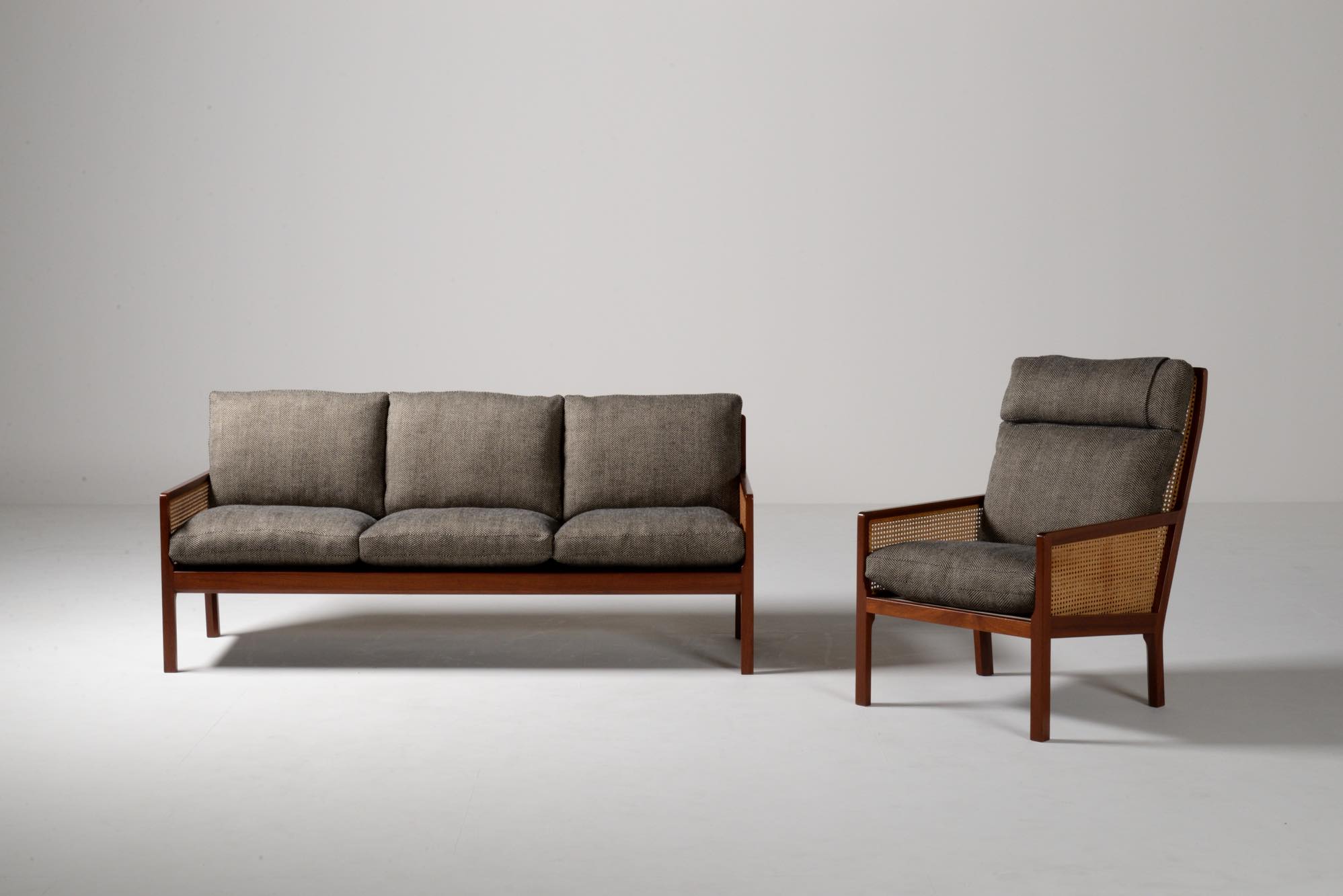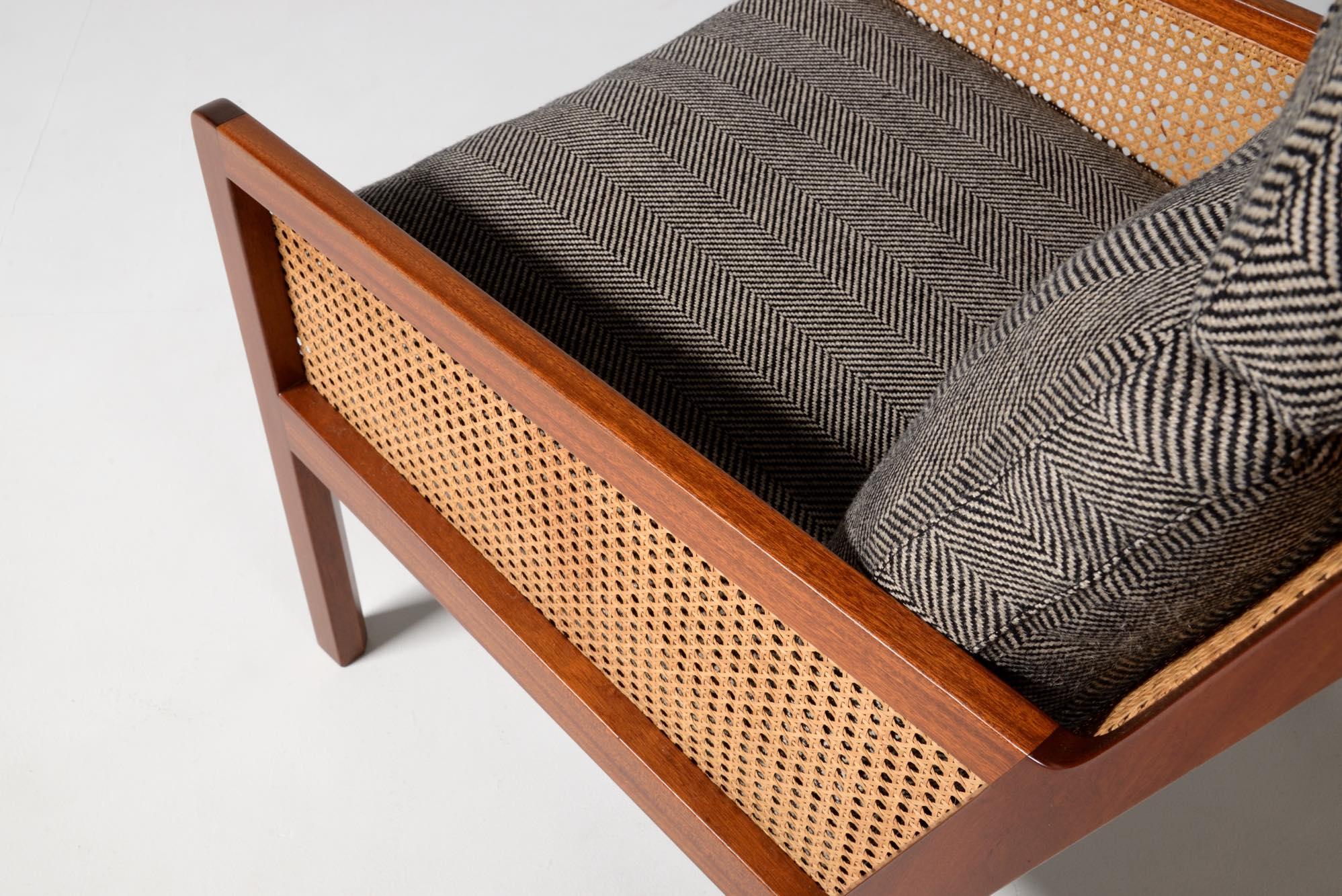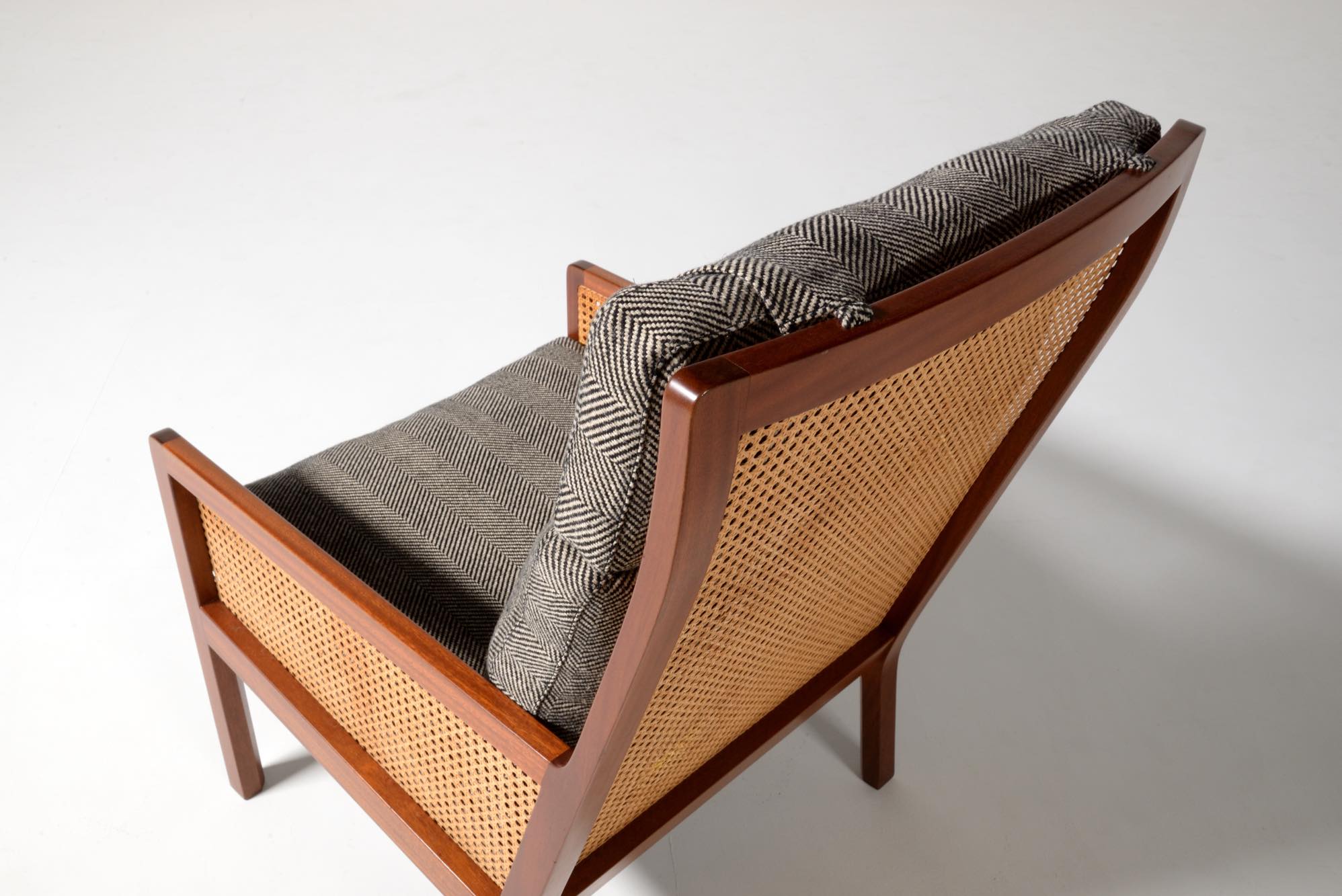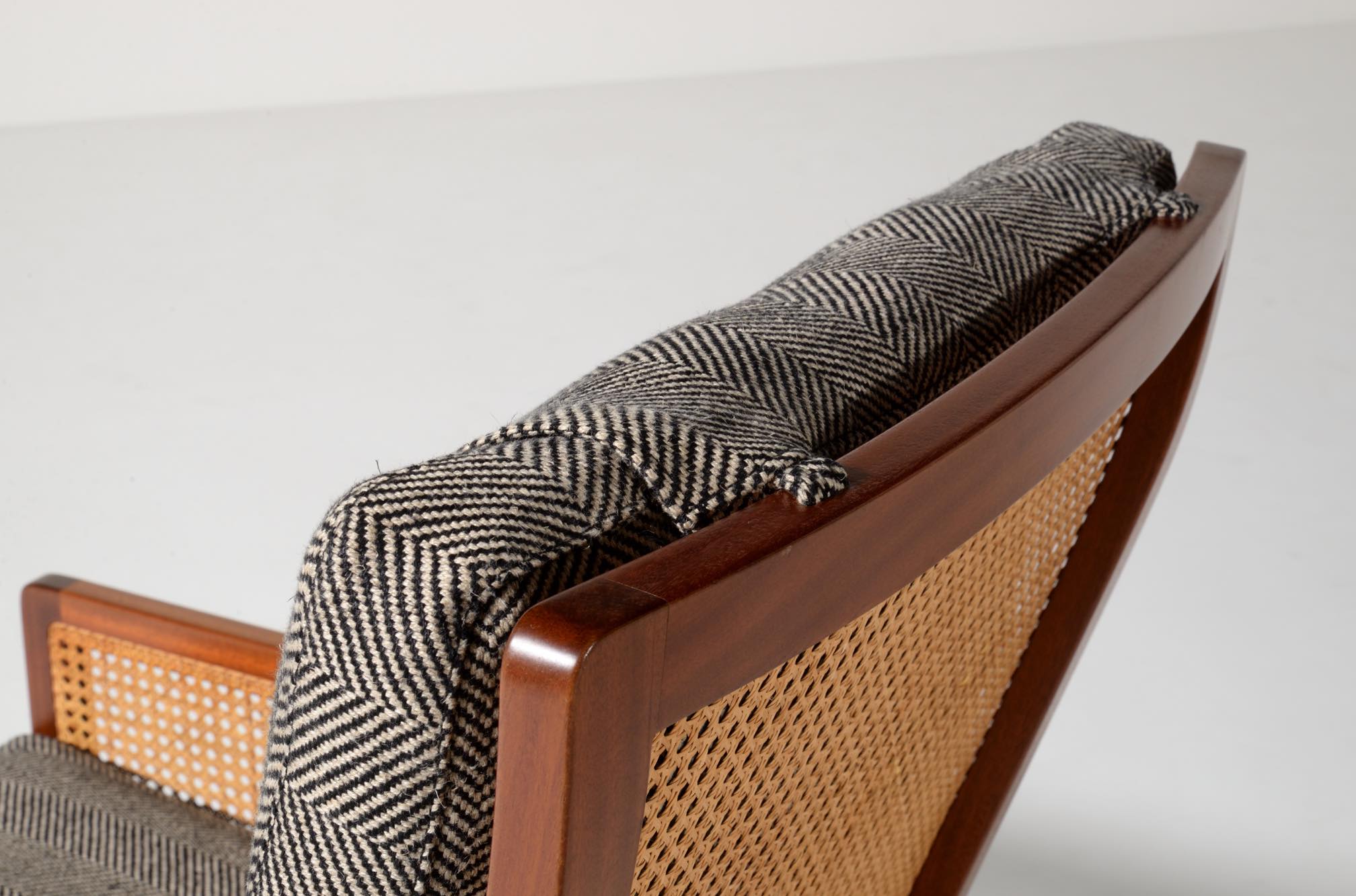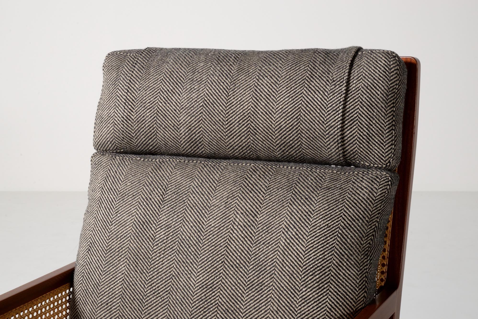 デンマークのデザイナー、Bernt Petersen/ベアント・ピーターセンによる籐張りのハイバックイージーチェアです。1964年に発表されたシリーズで、こちらもその頃に作られたものでしょう。頭部に枕の備わるハイバックのタイプです。フレームはマホガニー材が用いられており、背もたれとアーム下には籐張りが施されています。羽毛クッションを新たに作り、ファブリックはイタリアのロロ・ピアーナ・インテリアのリネンの椅子張り用生地にて張り替えました。とても綺麗な状態です。