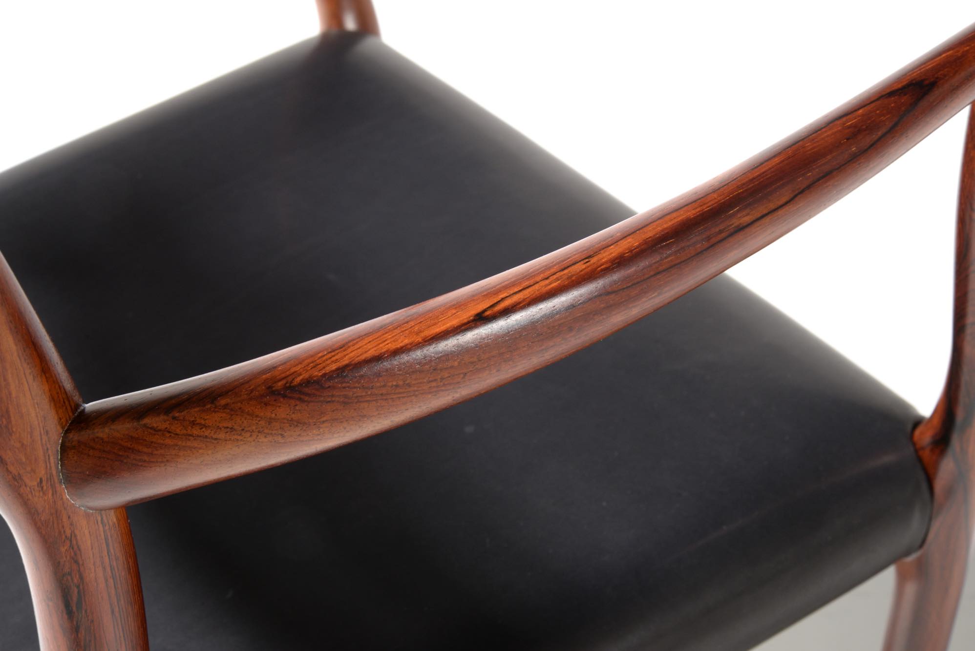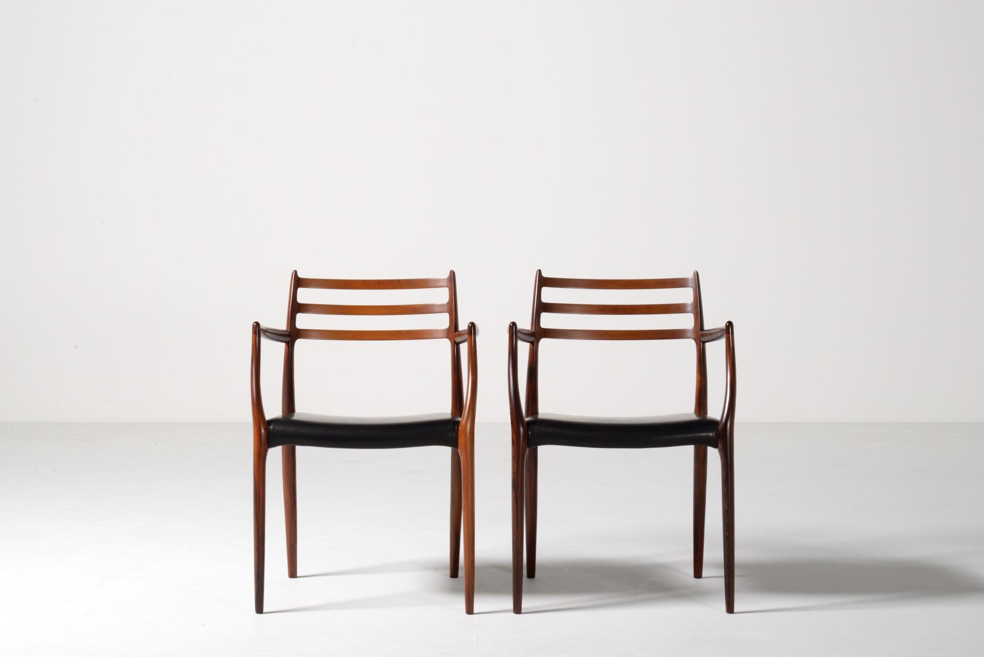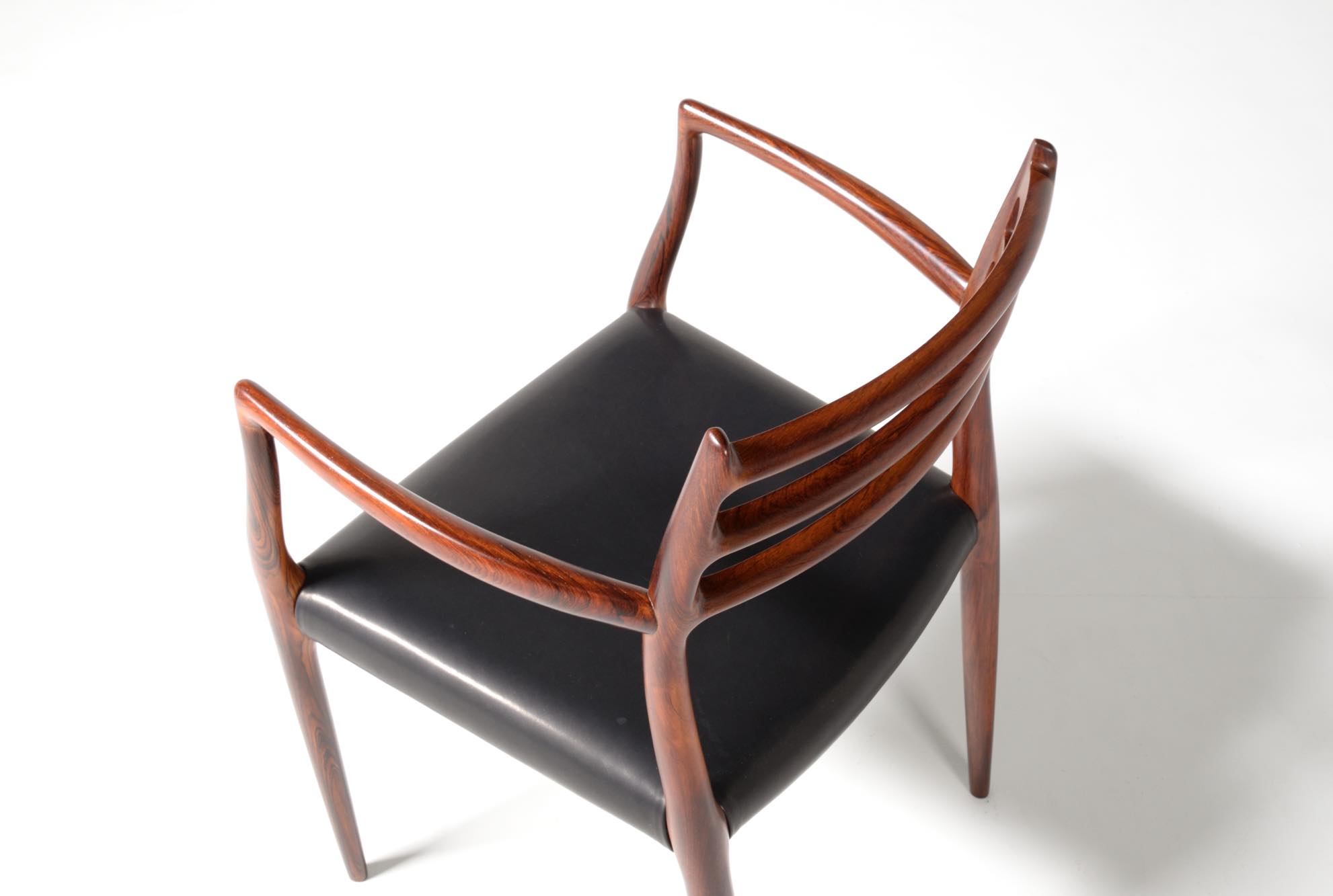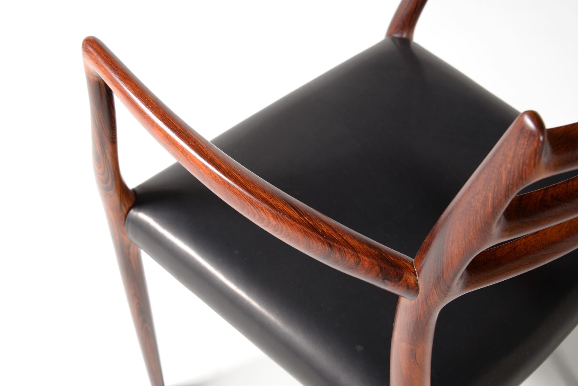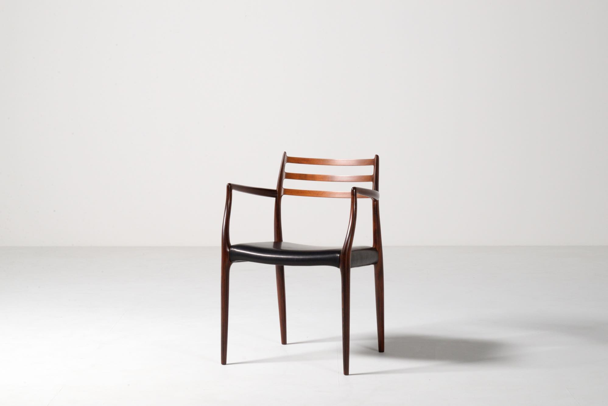 J.L. Møllerの名作椅子 "Model 62" アームチェア、1960年代に同じロットで作られたものです。ブラジリアンと思しきローズウッドが用いられており、細く削り出されたフレームは天然木ならではの賜物です。シートは黒皮革で張り替えました。2脚のうち1脚のアーム先端に僅かな小傷がございますが、全体のコンディションは共に良好です。1脚ずつ販売いたします。