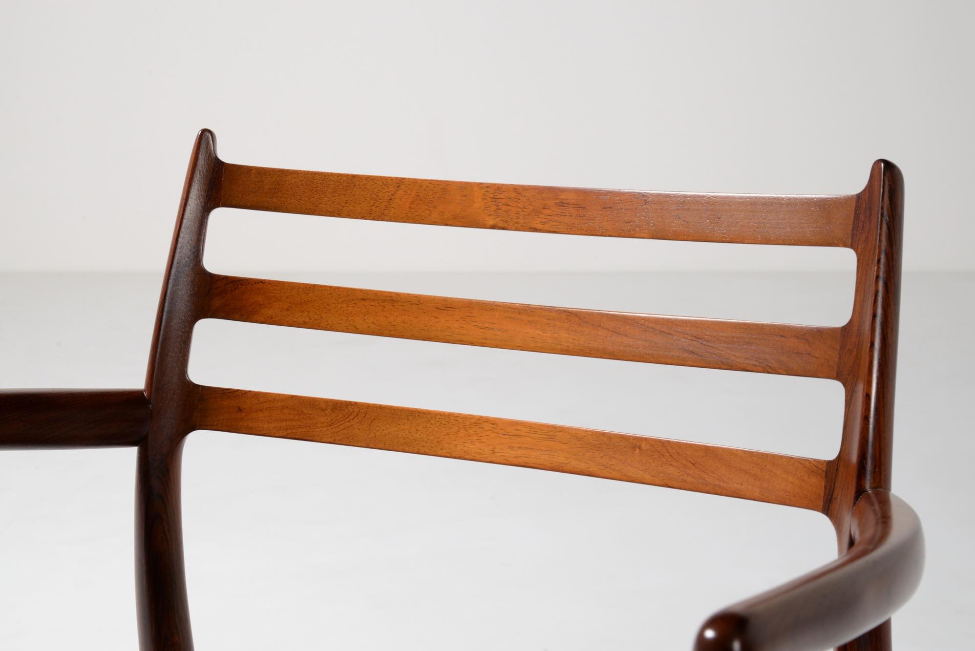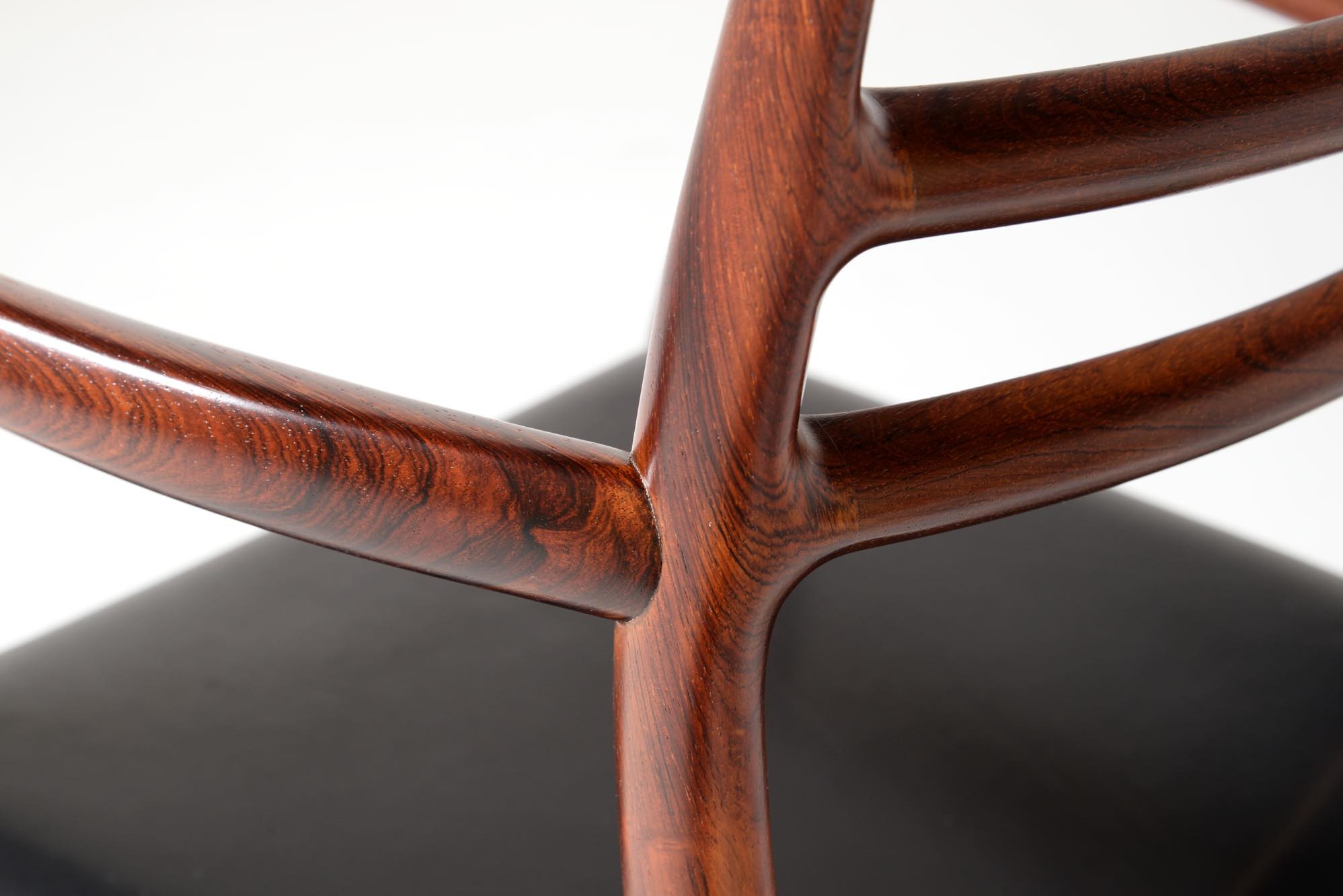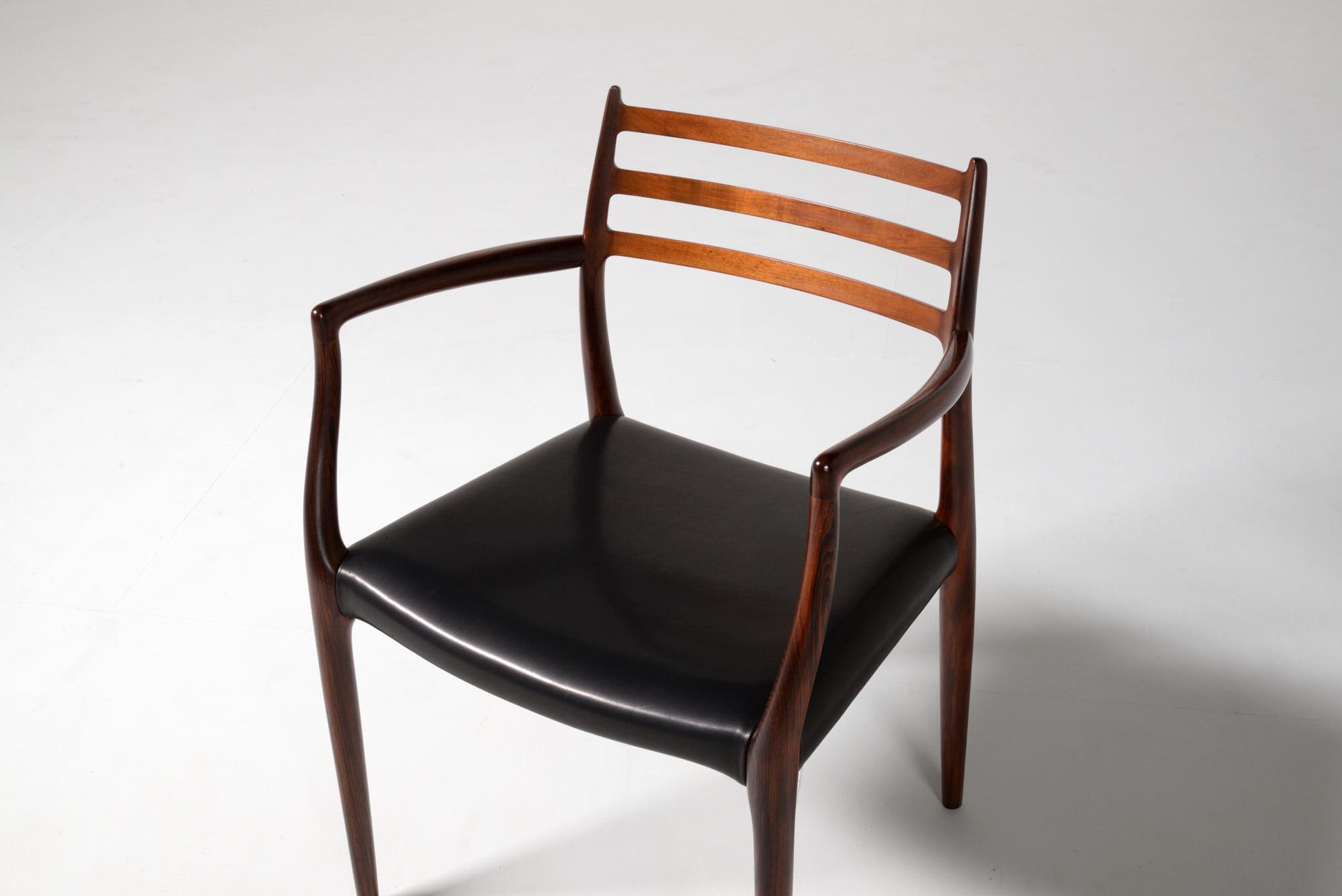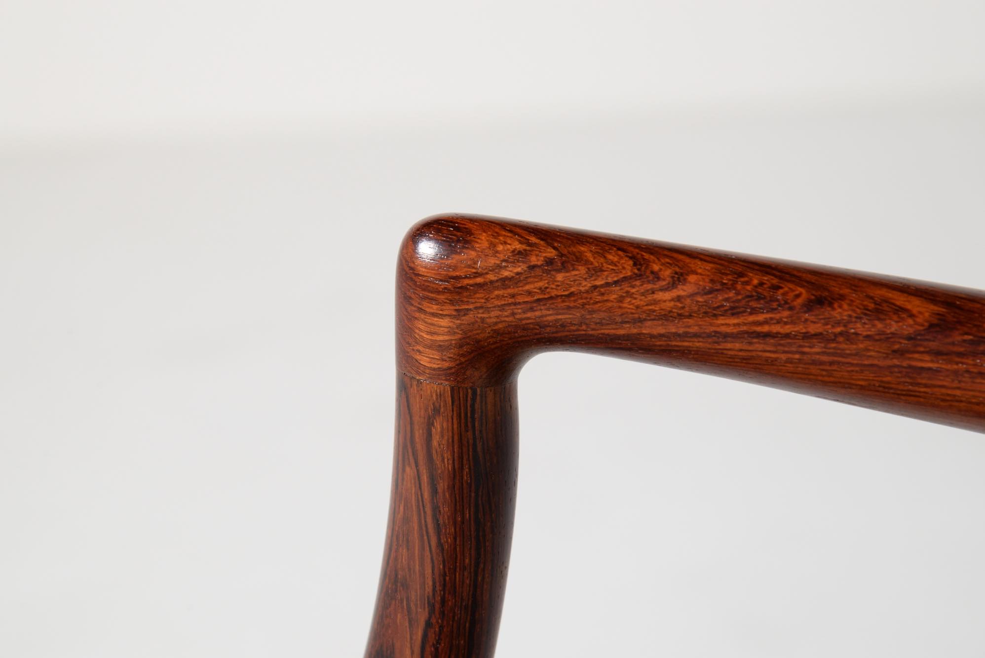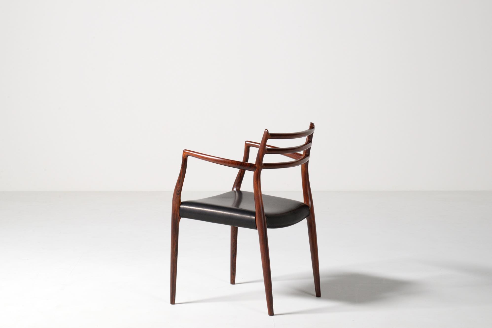 J.L. Møllerの名作椅子 "Model 62" アームチェア、1960年代に同じロットで作られたものです。ブラジリアンと思しきローズウッドが用いられており、細く削り出されたフレームは天然木ならではの賜物です。シートは黒皮革で張り替えました。2脚のうち1脚のアーム先端に僅かな小傷がございますが、全体のコンディションは共に良好です。1脚ずつ販売いたします。