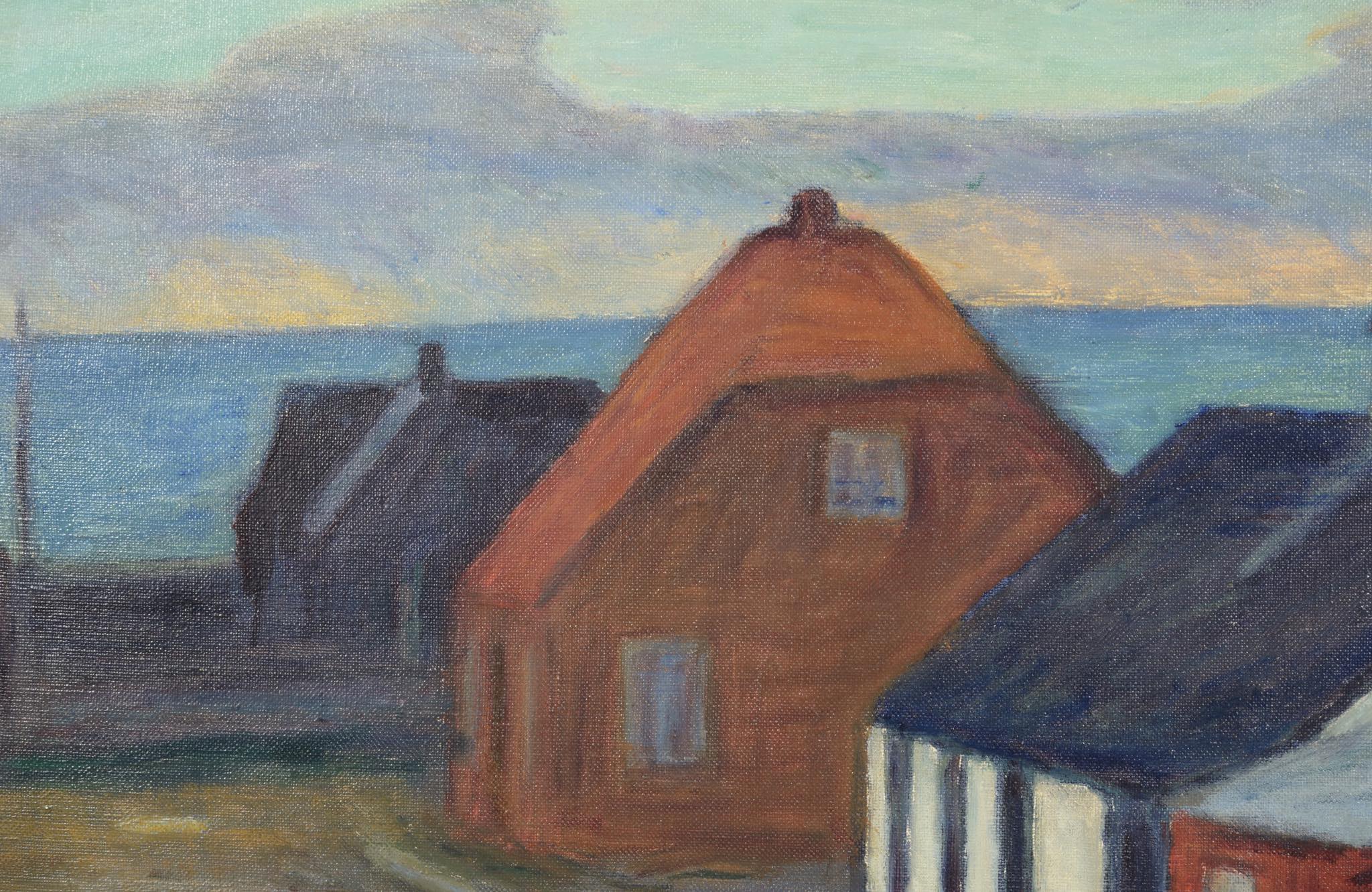 デンマークの画家、Niels Bjerre/ニールス・ビェールによる風景画油彩作品です。1939年の作品で、北ユトランド半島の壮大な風景が穏やかな筆致で描かれており、風景と時間を切り取ったような表現がなされています。金箔のフレームはオリジナルで、きれいな状態です。