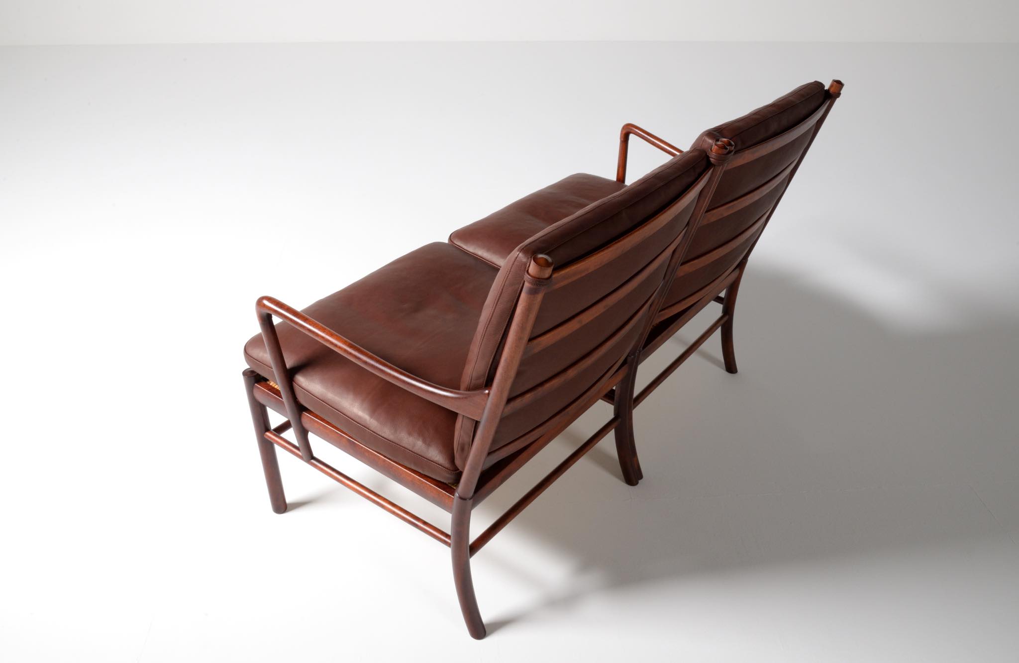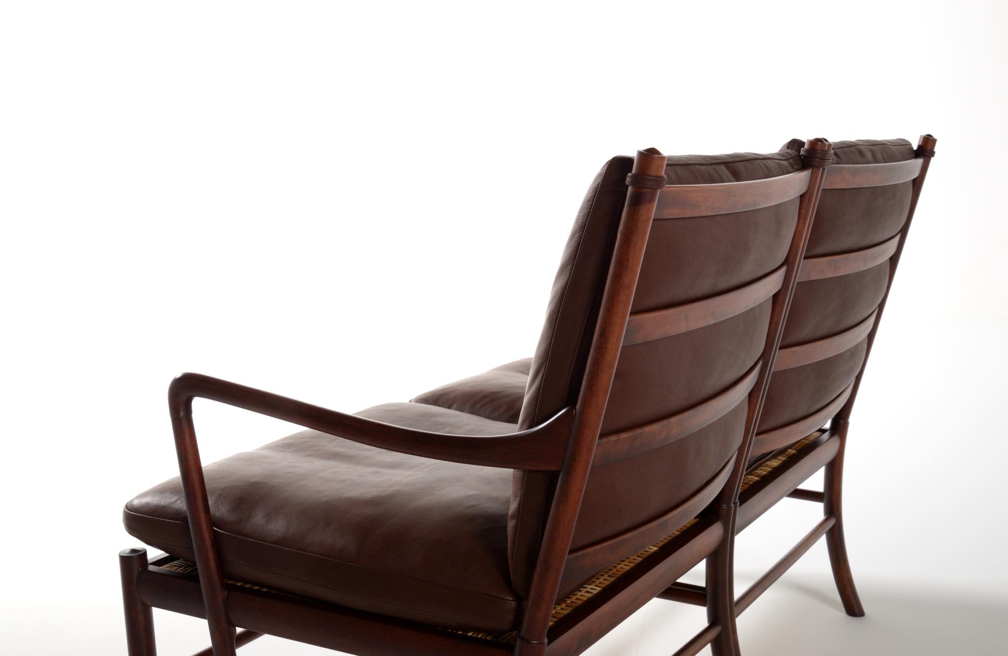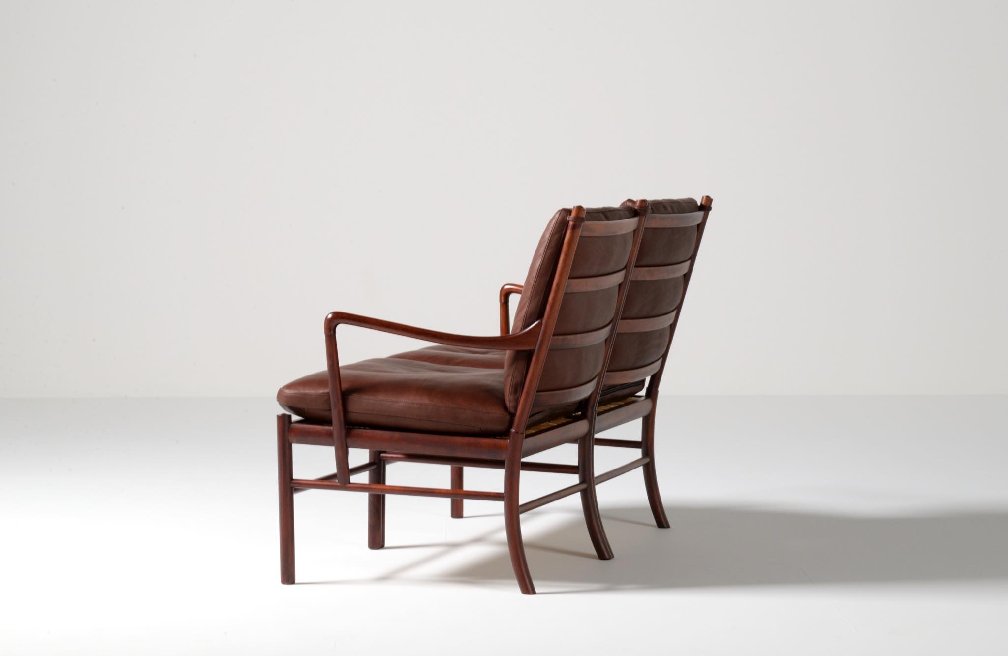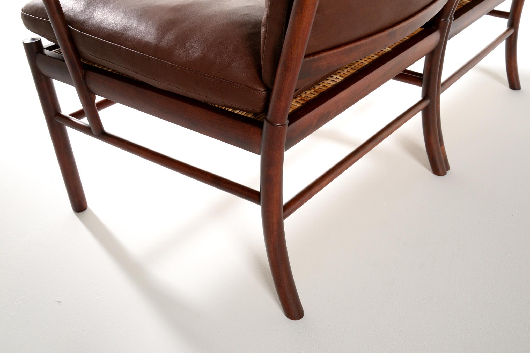 20世紀のデンマークを代表する家具デザイナーで、王立アカデミー家具科の主任教授も務めた、Ole Wanscher/オーレ・ヴァンシャーによる名作椅子、コロニアルチェアの2人掛けセッティです。1970~80年代に作られたものと思われ、マホガニー材が用いられています。クッションには劣化が見られたため、緩衝材には多めの羽毛を用いてつぶれにくいように製作しました。皮革はデンマークのCAMOレザーを用いています。座面下の籐を含めコンディションは良好です。