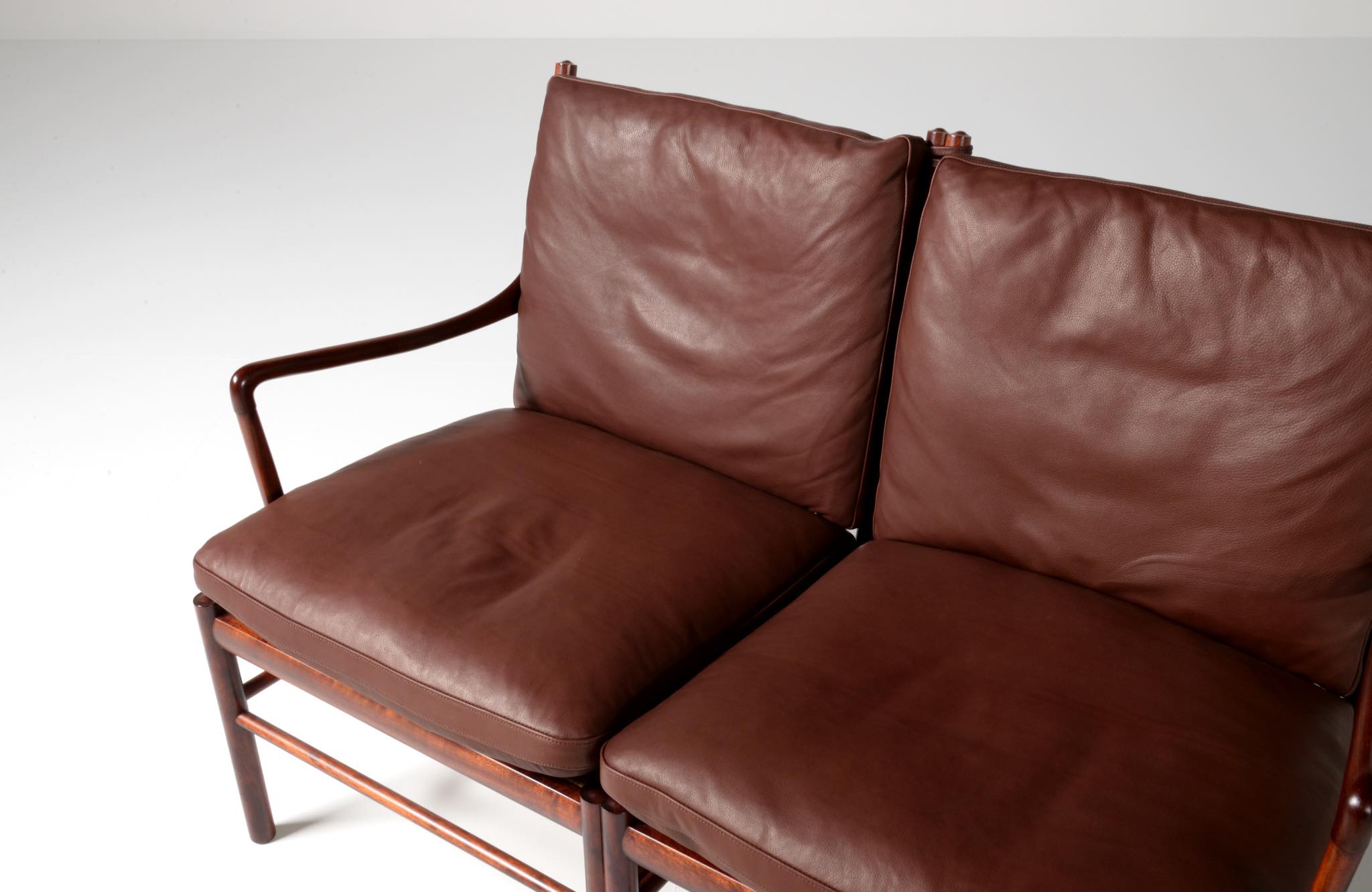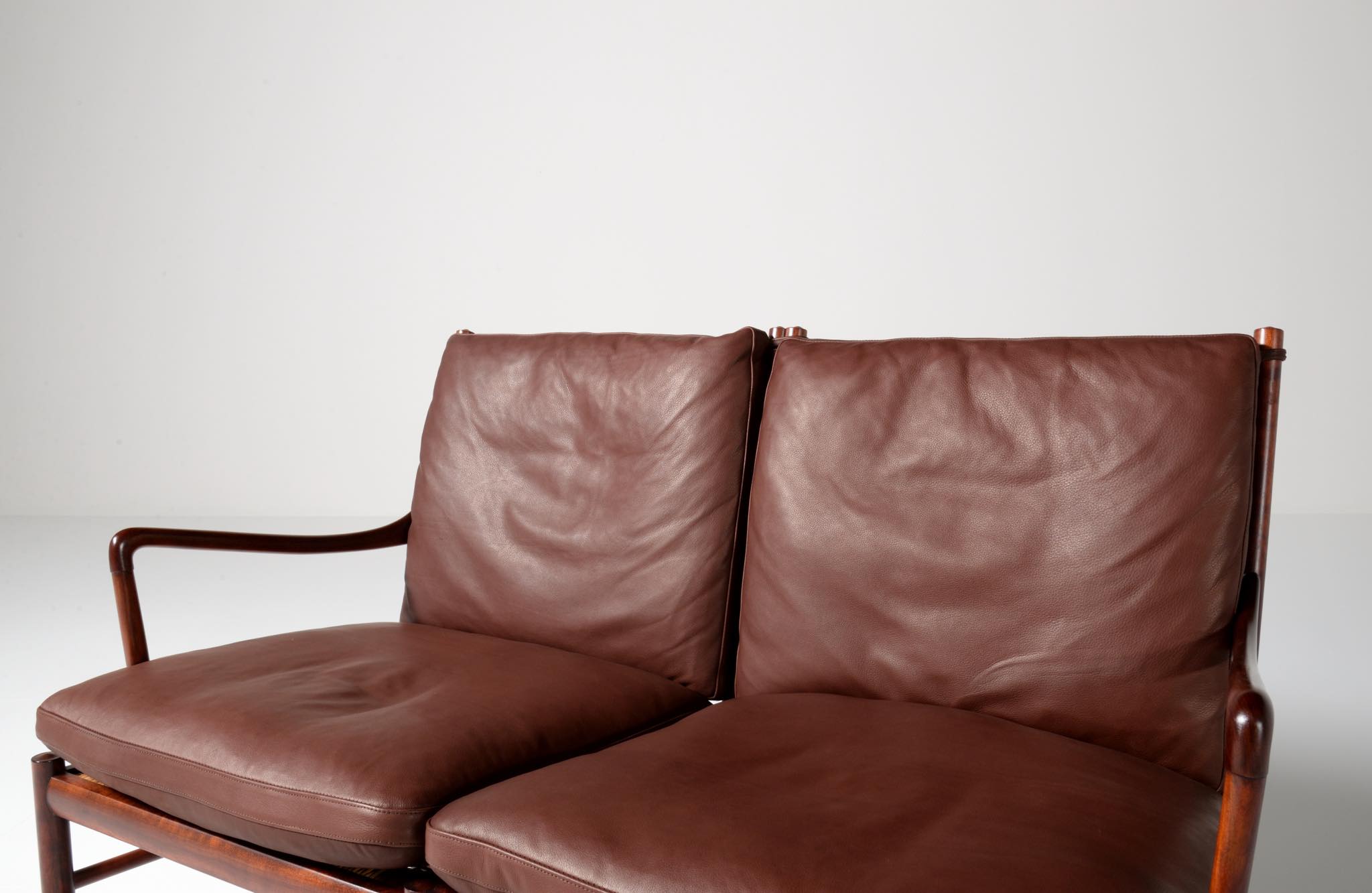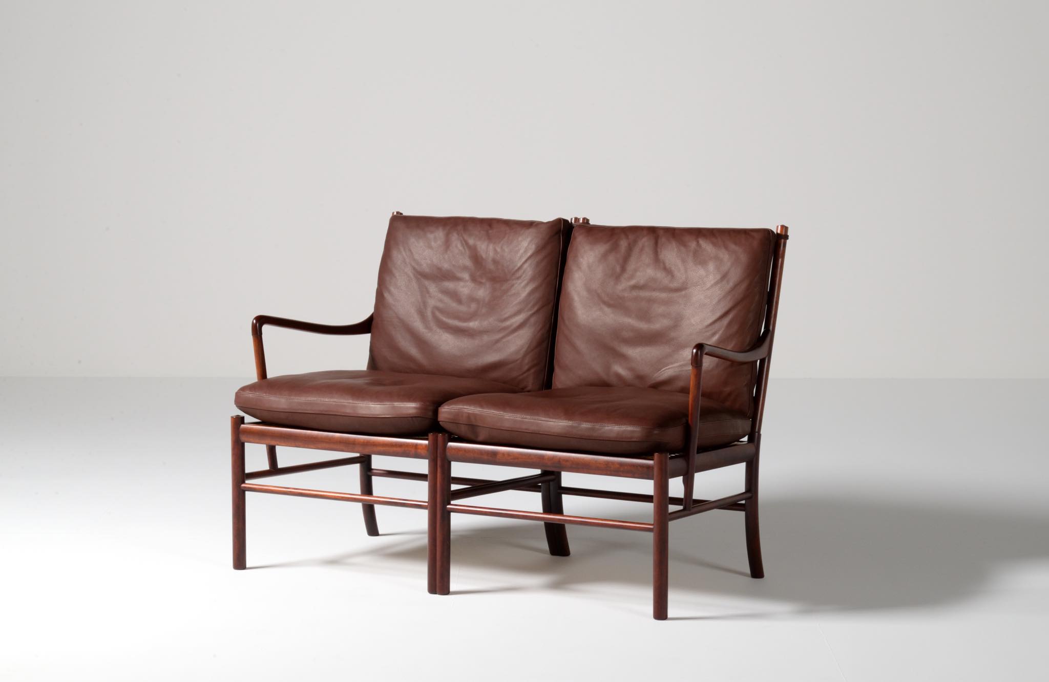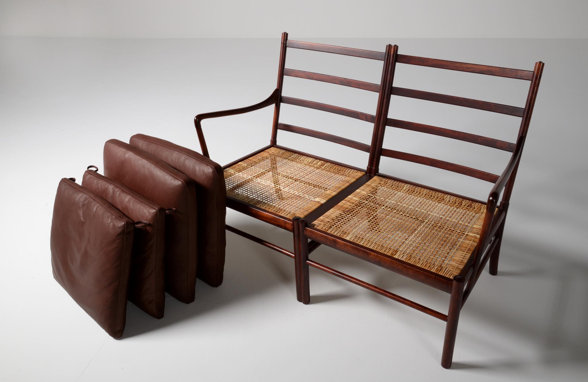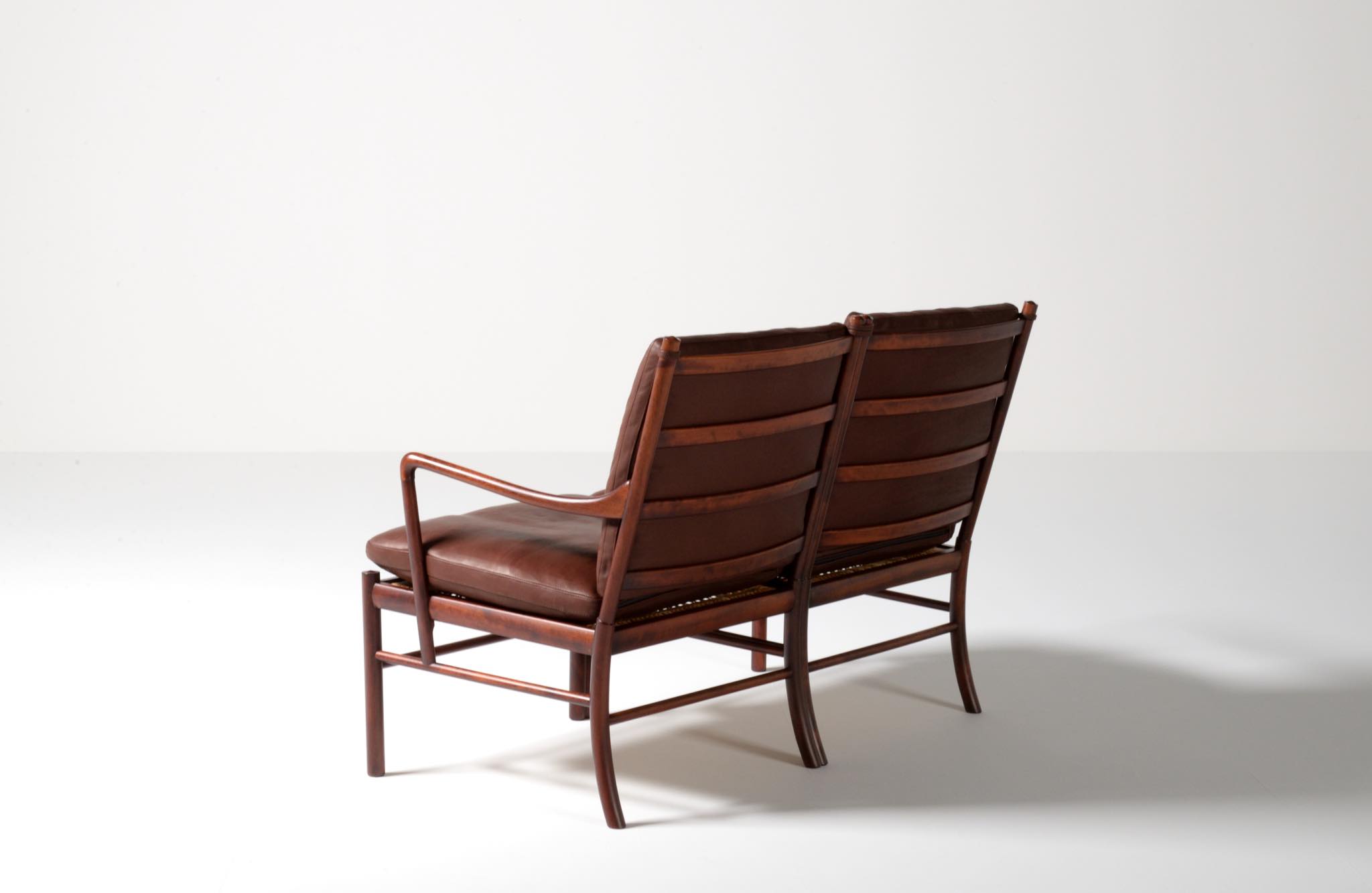 20世紀のデンマークを代表する家具デザイナーで、王立アカデミー家具科の主任教授も務めた、Ole Wanscher/オーレ・ヴァンシャーによる名作椅子、コロニアルチェアの2人掛けセッティです。1970~80年代に作られたものと思われ、マホガニー材が用いられています。クッションには劣化が見られたため、緩衝材には多めの羽毛を用いてつぶれにくいように製作しました。皮革はデンマークのCAMOレザーを用いています。座面下の籐を含めコンディションは良好です。