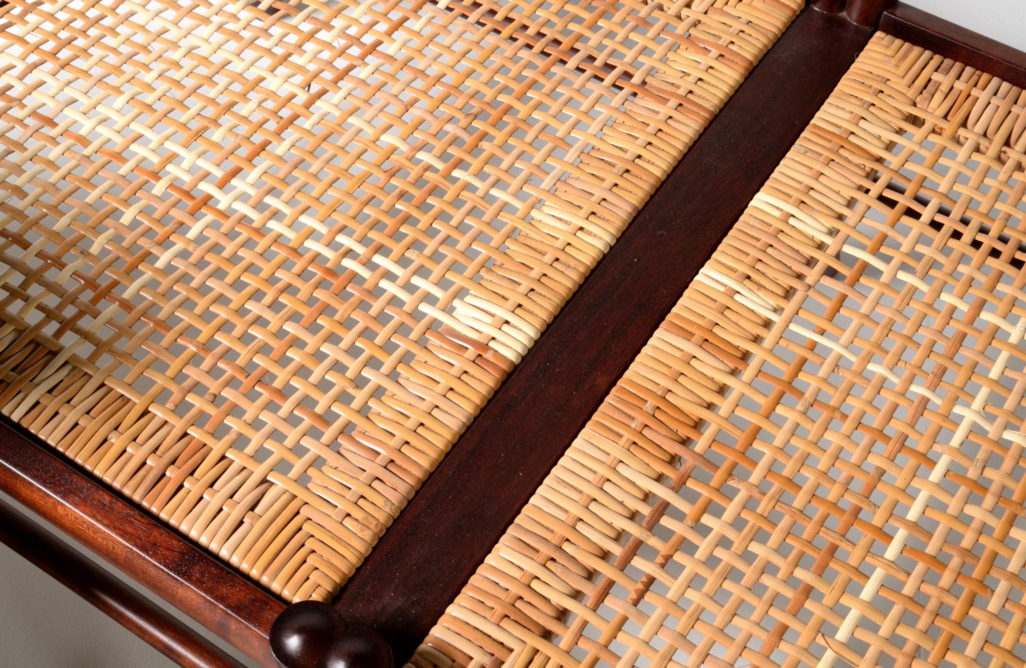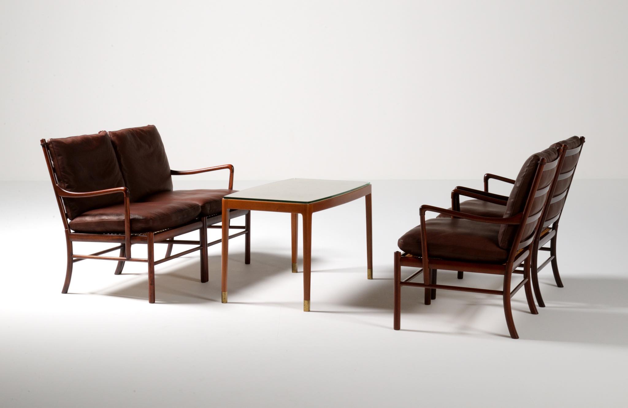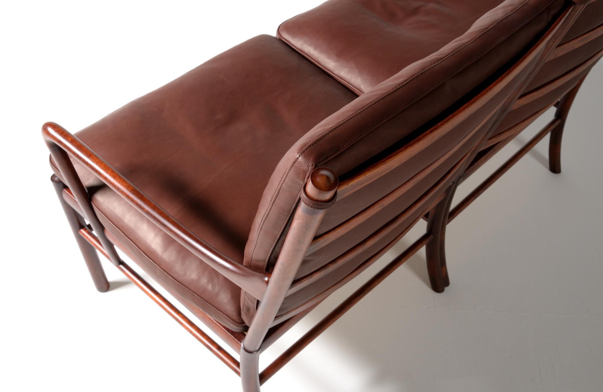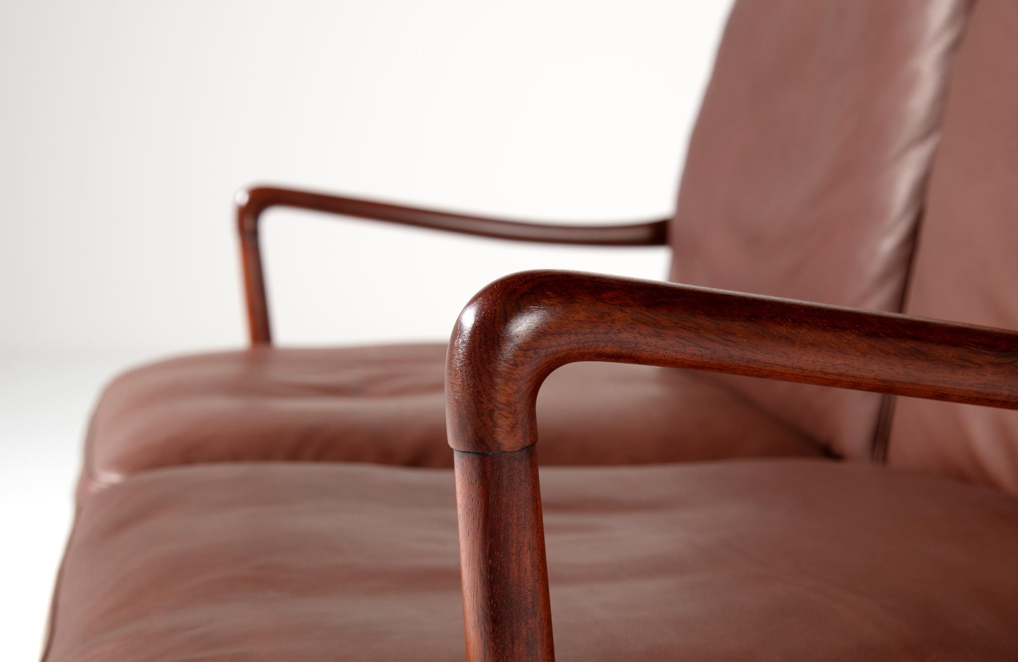 20世紀のデンマークを代表する家具デザイナーで、王立アカデミー家具科の主任教授も務めた、Ole Wanscher/オーレ・ヴァンシャーによる名作椅子、コロニアルチェアの2人掛けセッティです。1970~80年代に作られたものと思われ、マホガニー材が用いられています。クッションには劣化が見られたため、緩衝材には多めの羽毛を用いてつぶれにくいように製作しました。皮革はデンマークのCAMOレザーを用いています。座面下の籐を含めコンディションは良好です。