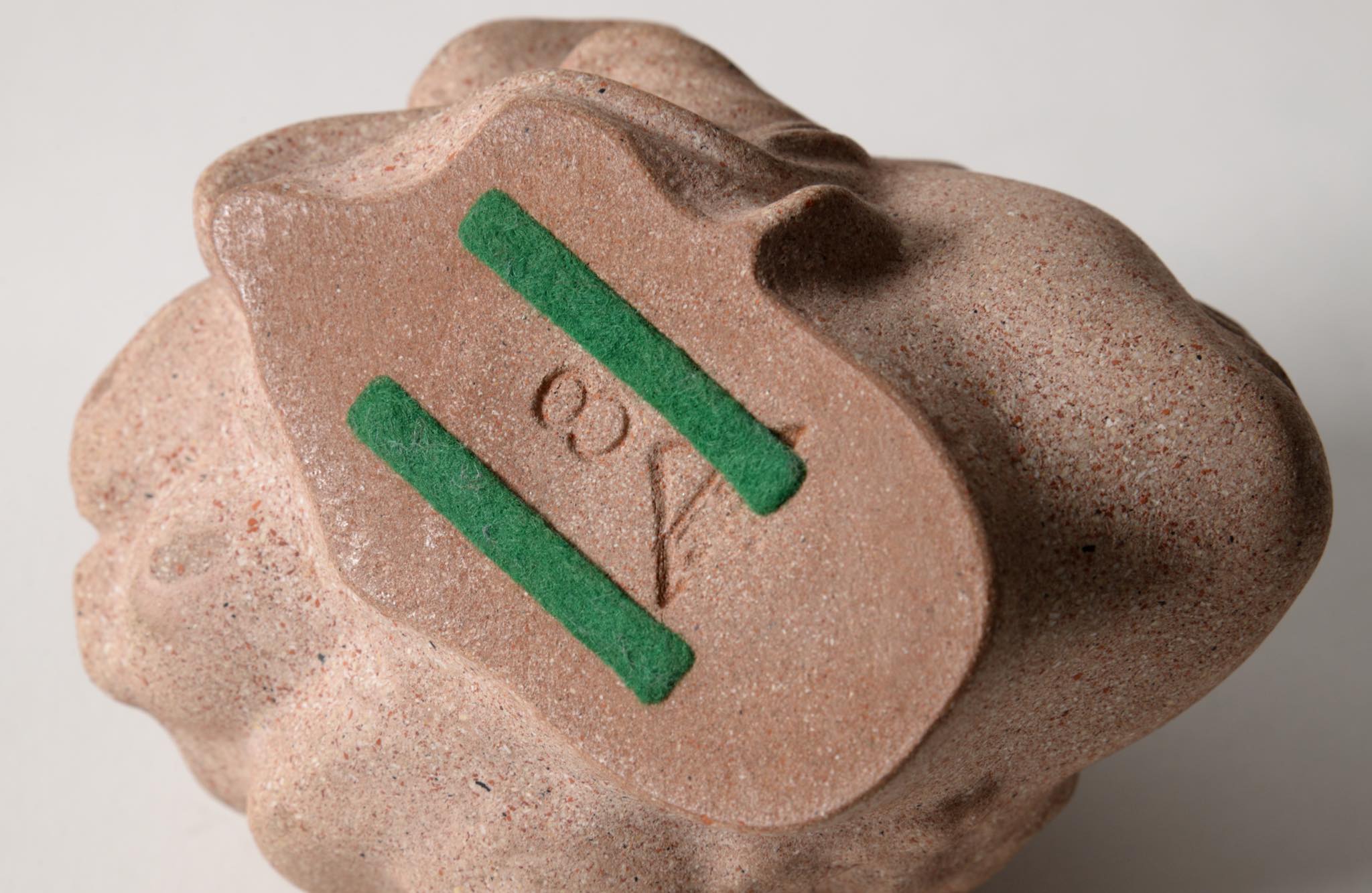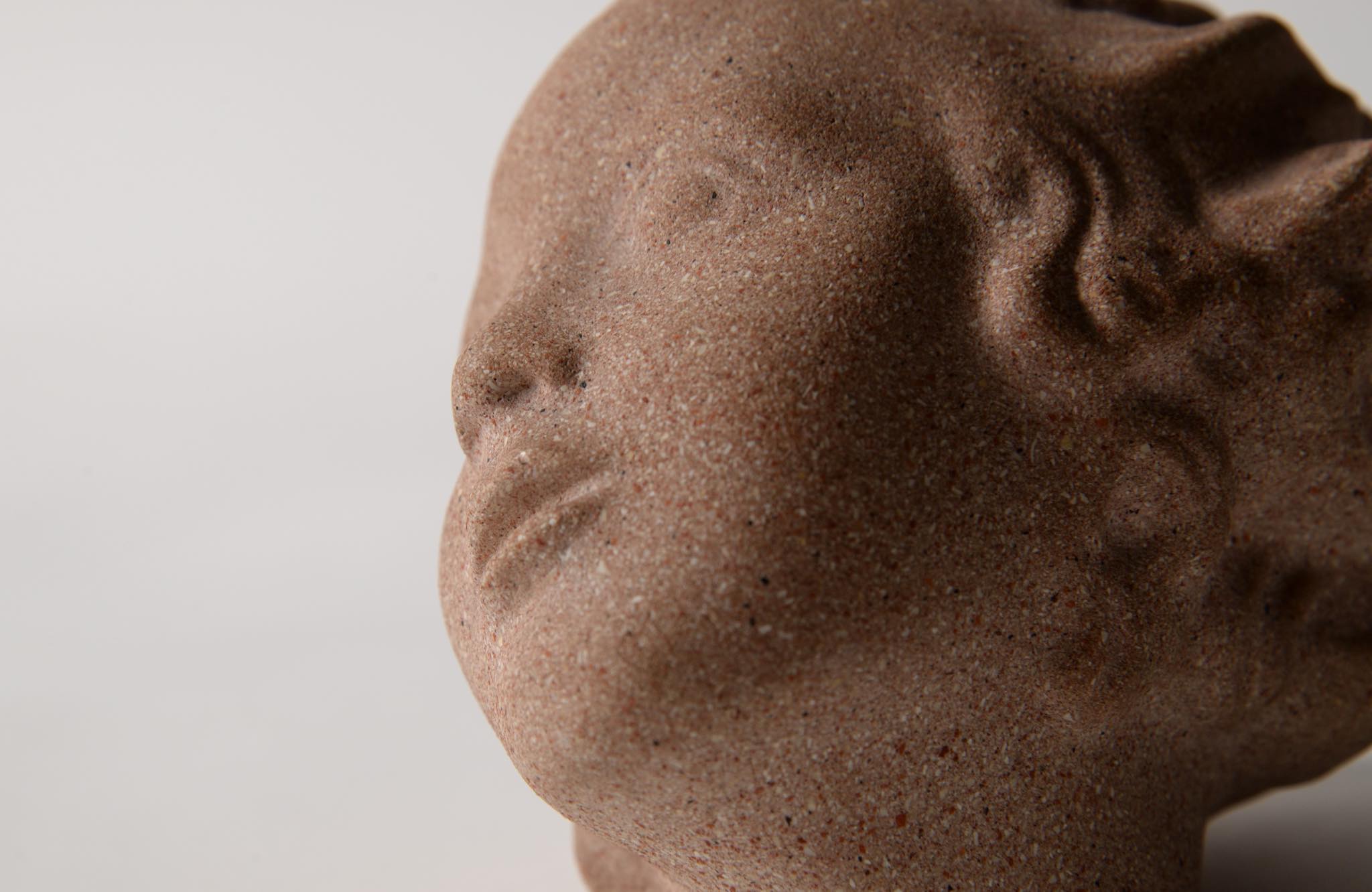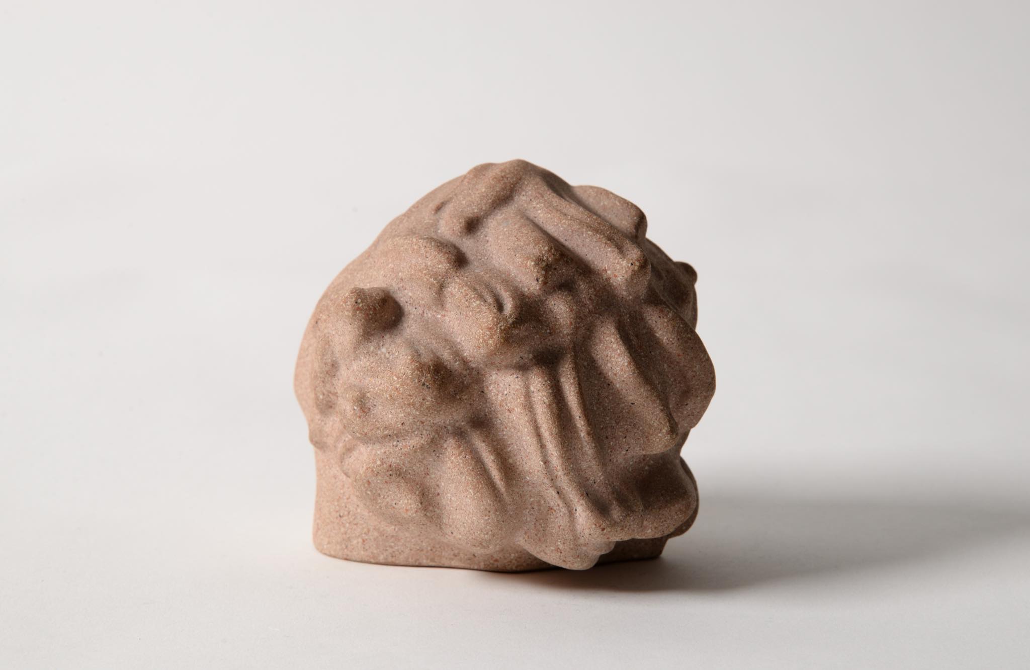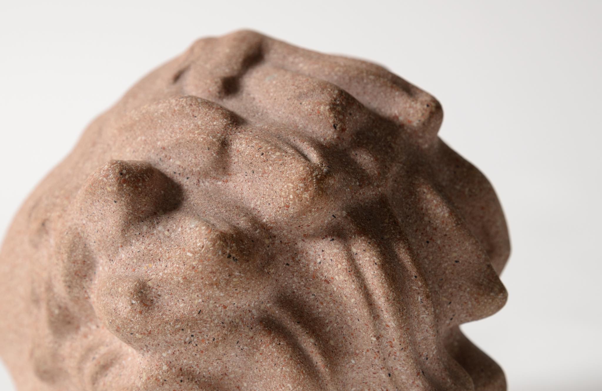デンマークの金工作家、Just Andersen/ユスト・アナセンによる、Nexøsten/サンドストーン素材のスカルプチャー作品です。開戦の気配漂う1940年頃に敷かれた金属流通量の制限を躱すために砂類を用いて考案されたシリーズで、1941~43年頃に作られたものです。サンドストーン作品には素材の持つ独自の柔らかな質感や、儚さのようなものも備わり、作られた数量も限定されるため珍重されています。こちらの作品は女性の頭部を表現したもので、どこか明るい未来を望むような表情にも見て取れます。