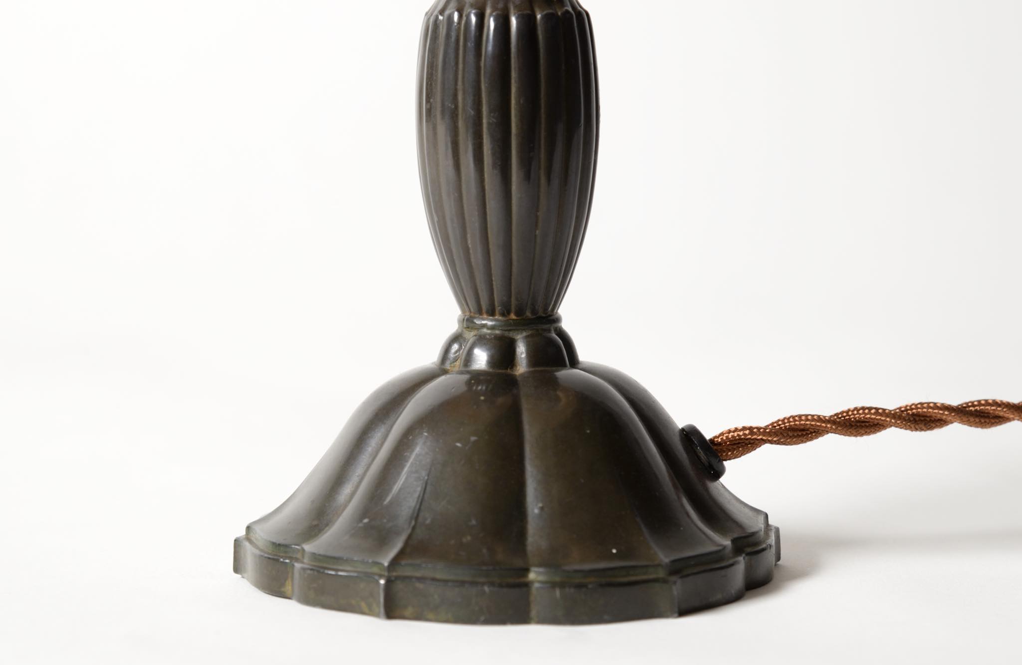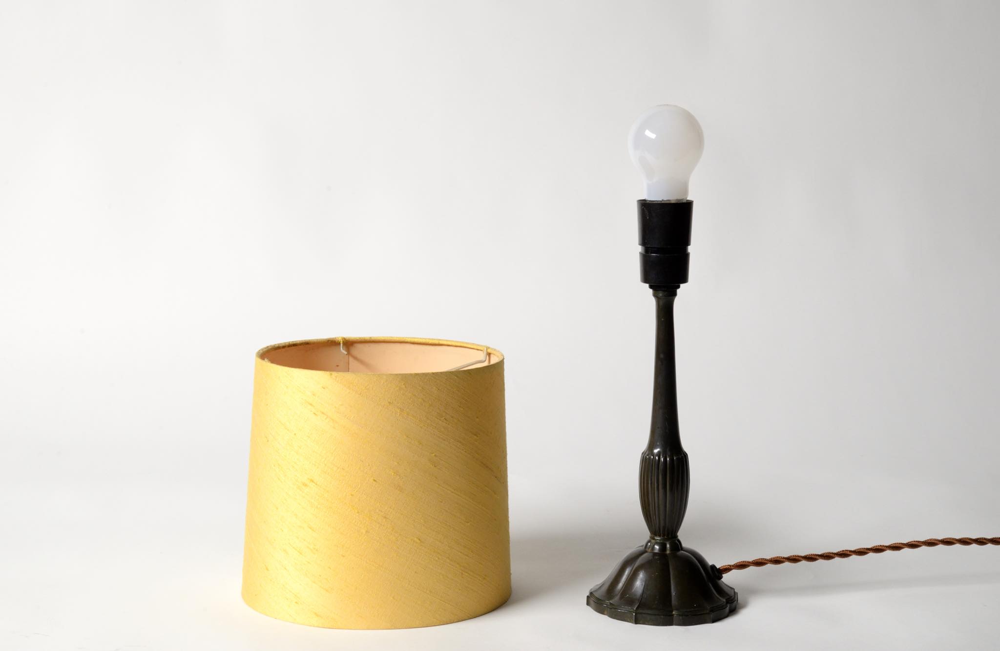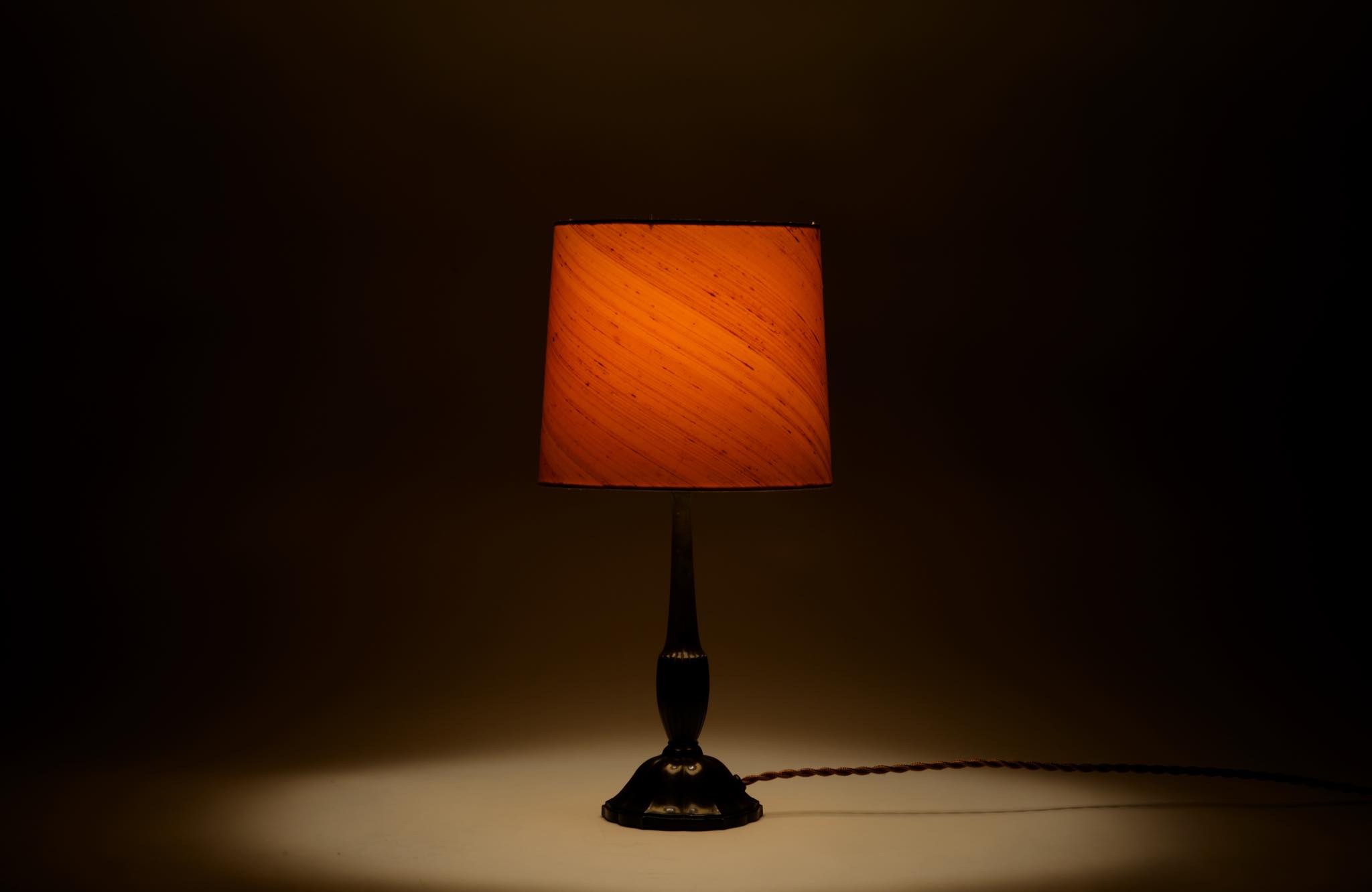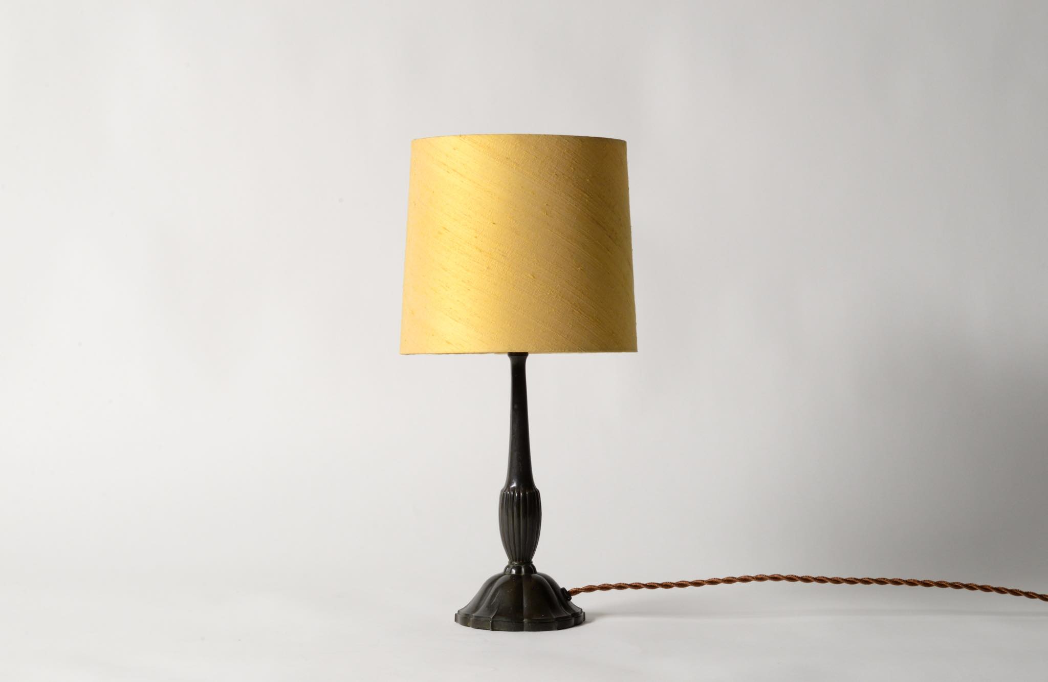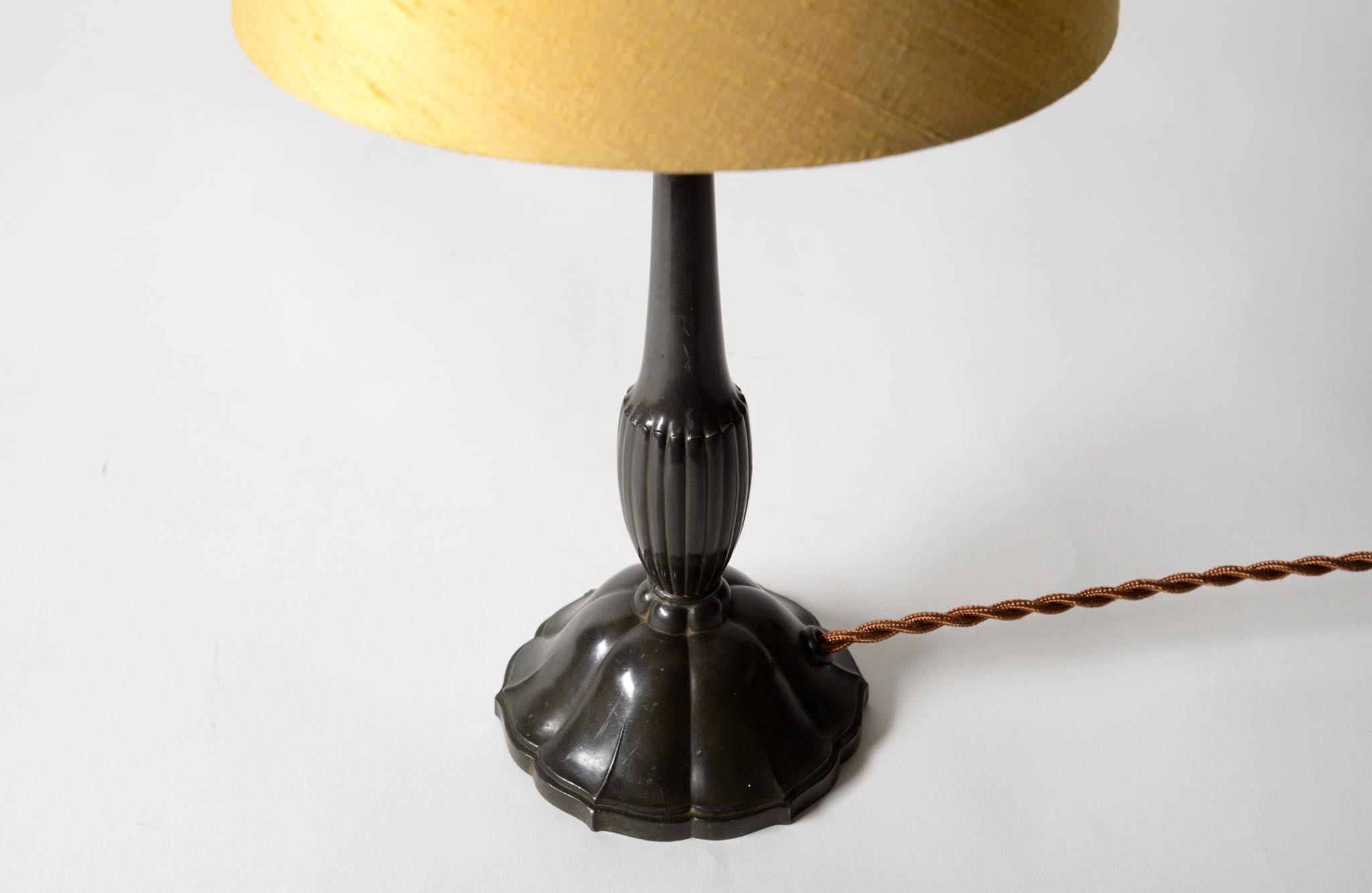 デンマークの金工作家、Just Andersen/ユスト・アナセンによるディスコメタル製のテーブルランプです。やや装飾的なアール・デコの様式で、小振りなつくりのものです。本体に小傷が少々見られますが、凹みや歪みなどなく綺麗な状態です。シェードはデンマークの古いシルキー張りのものを合わせました。