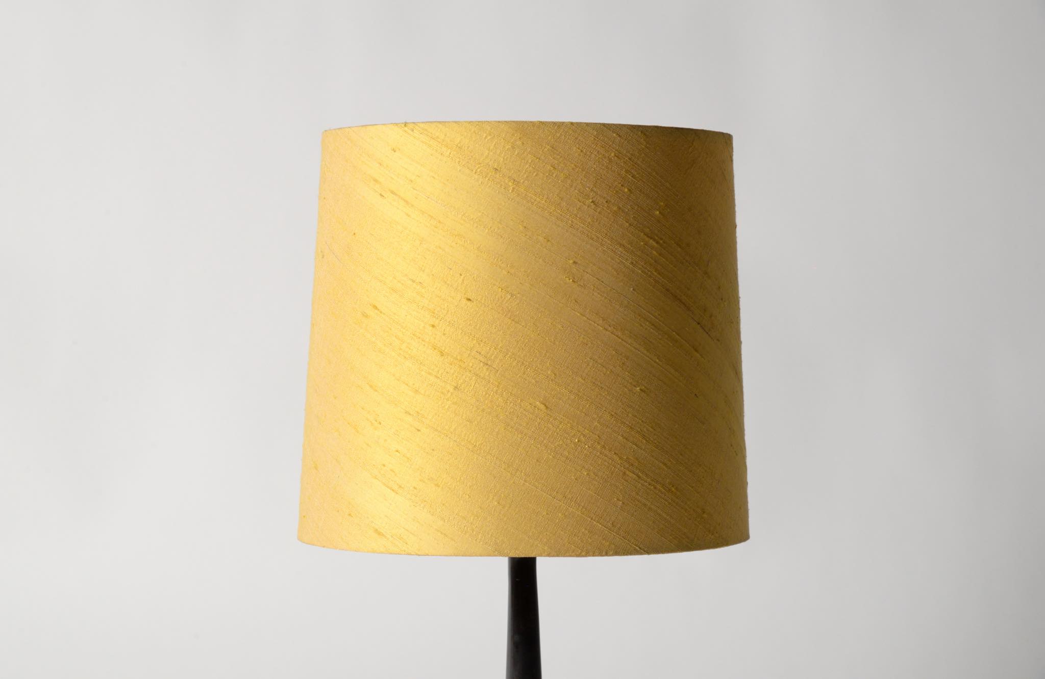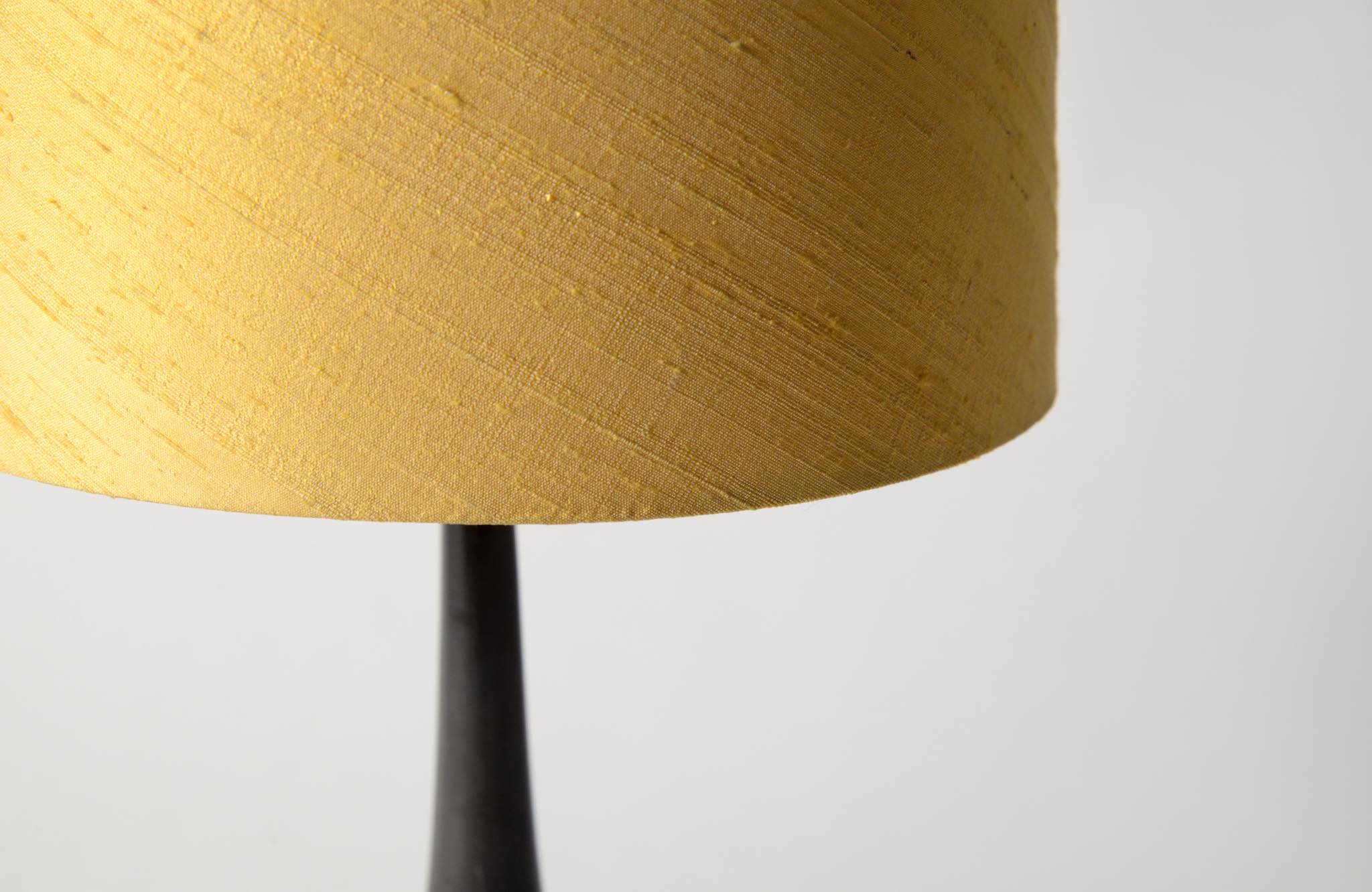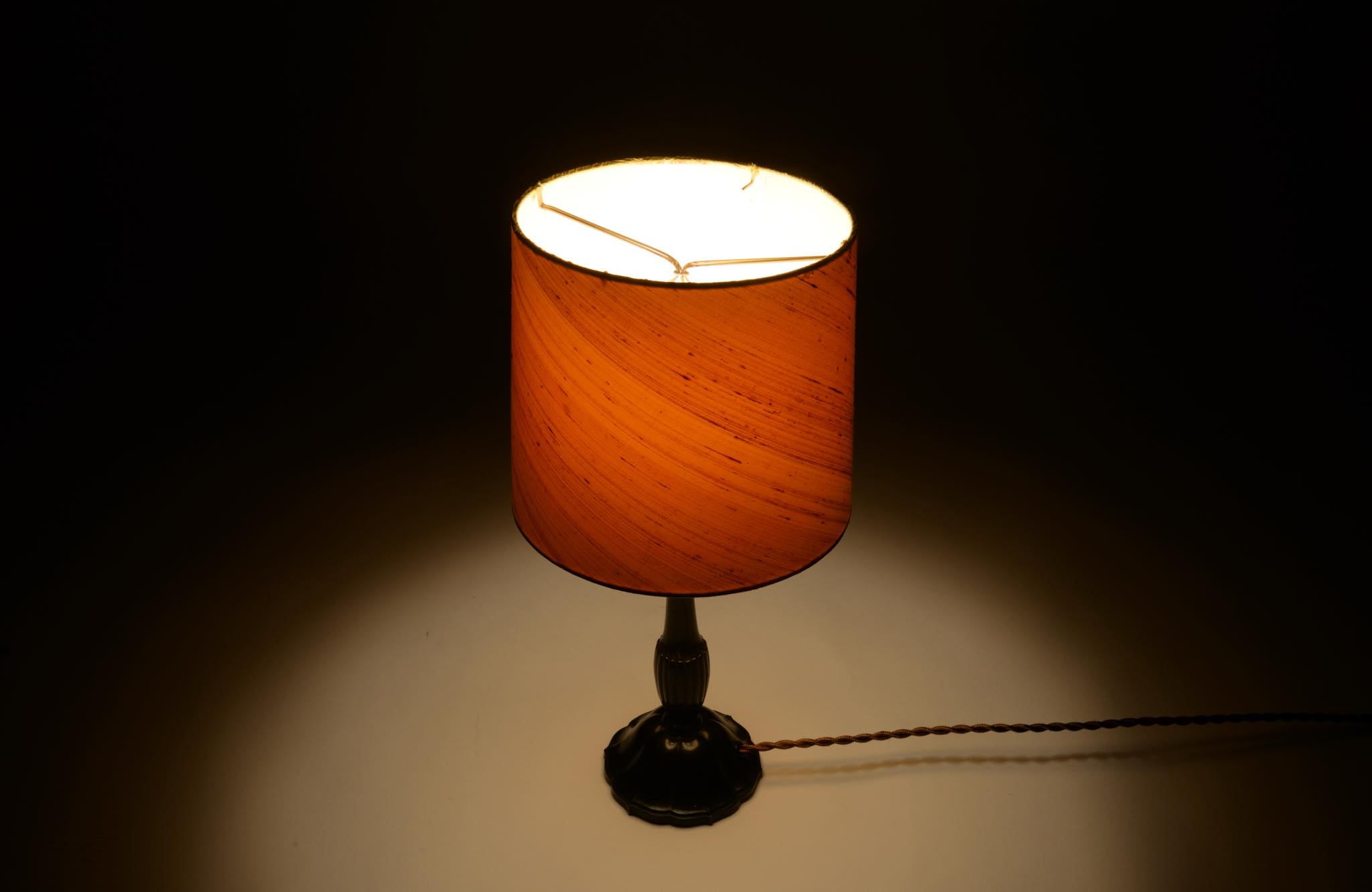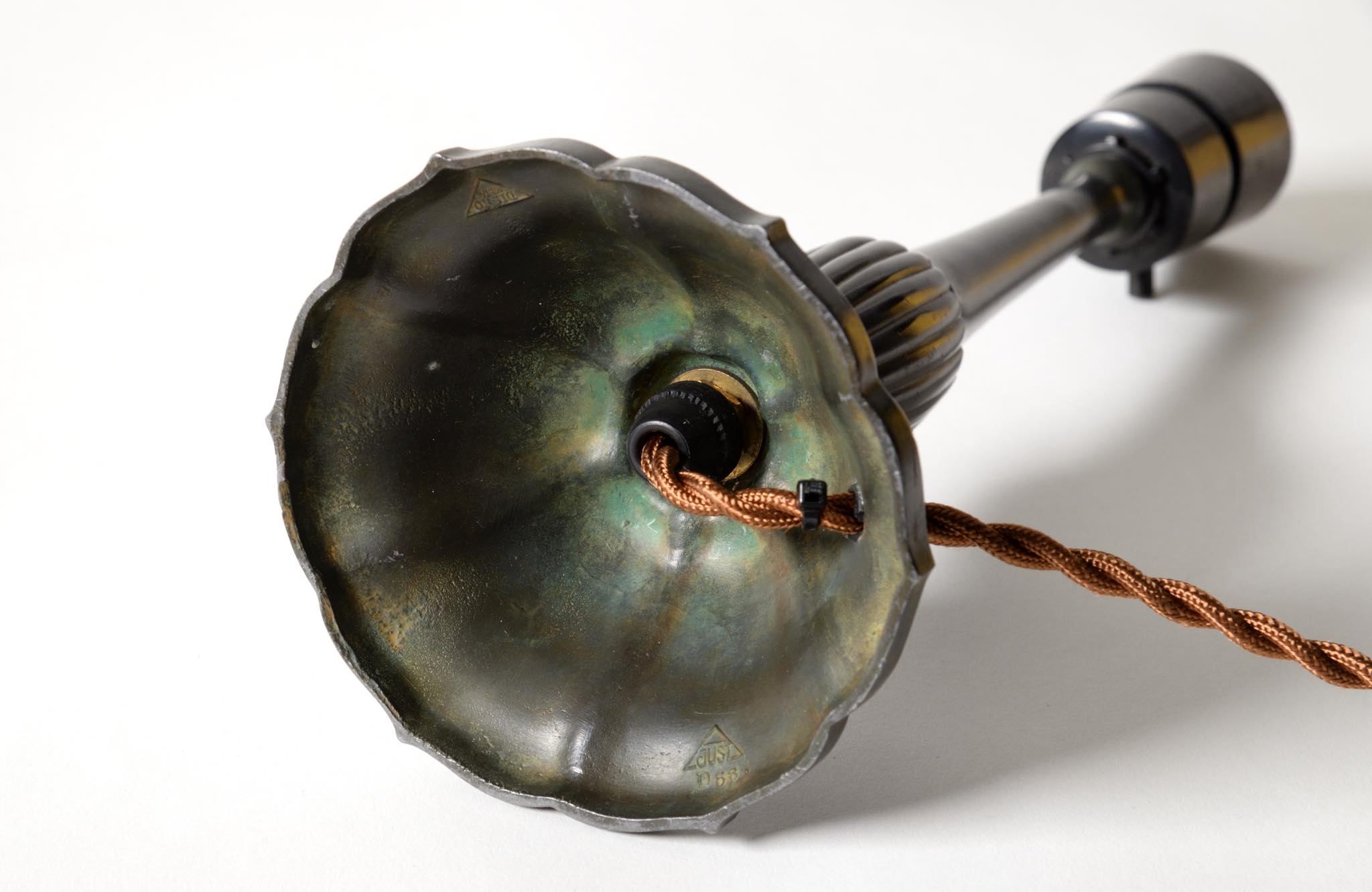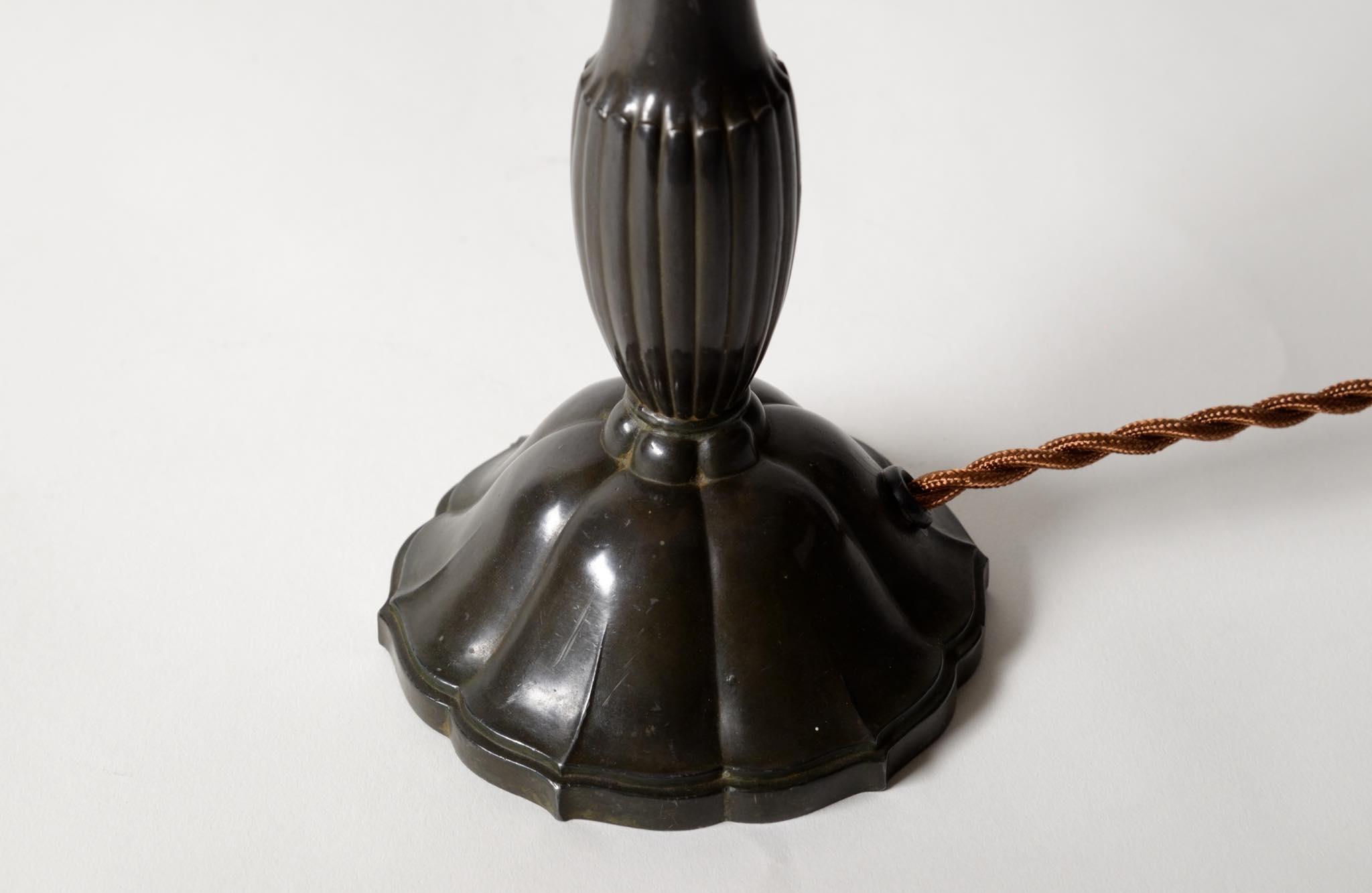 デンマークの金工作家、Just Andersen/ユスト・アナセンによるディスコメタル製のテーブルランプです。やや装飾的なアール・デコの様式で、小振りなつくりのものです。本体に小傷が少々見られますが、凹みや歪みなどなく綺麗な状態です。シェードはデンマークの古いシルキー張りのものを合わせました。