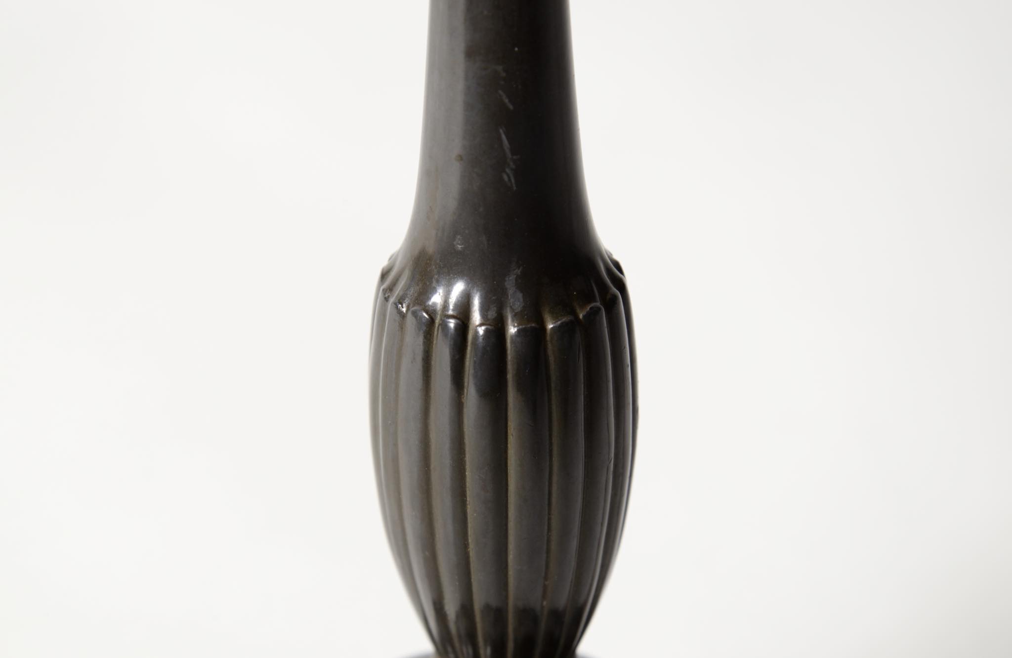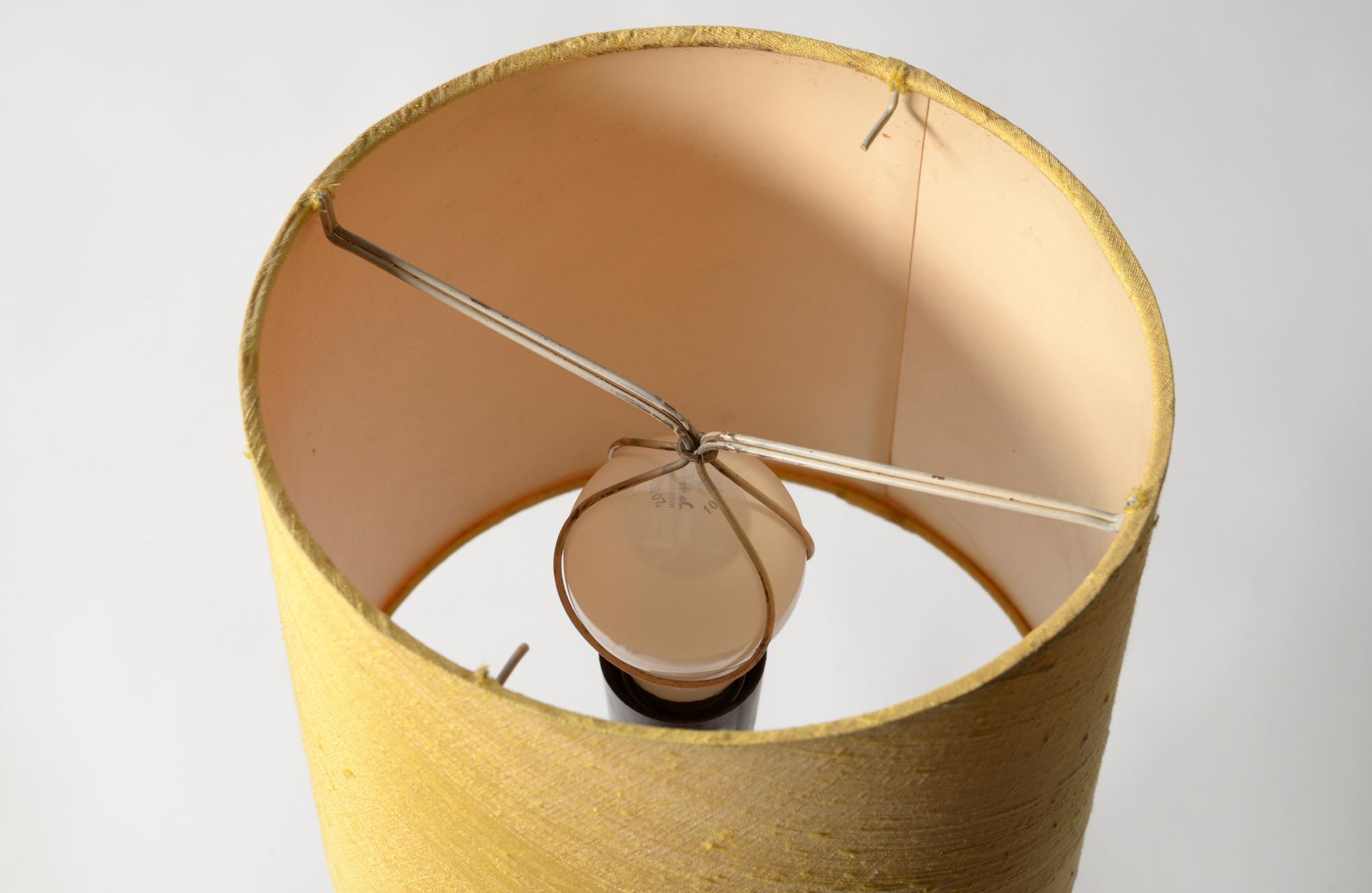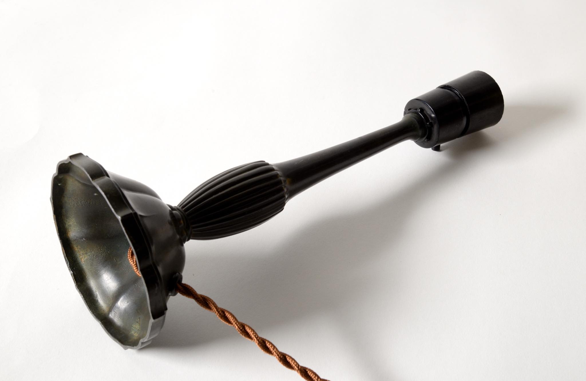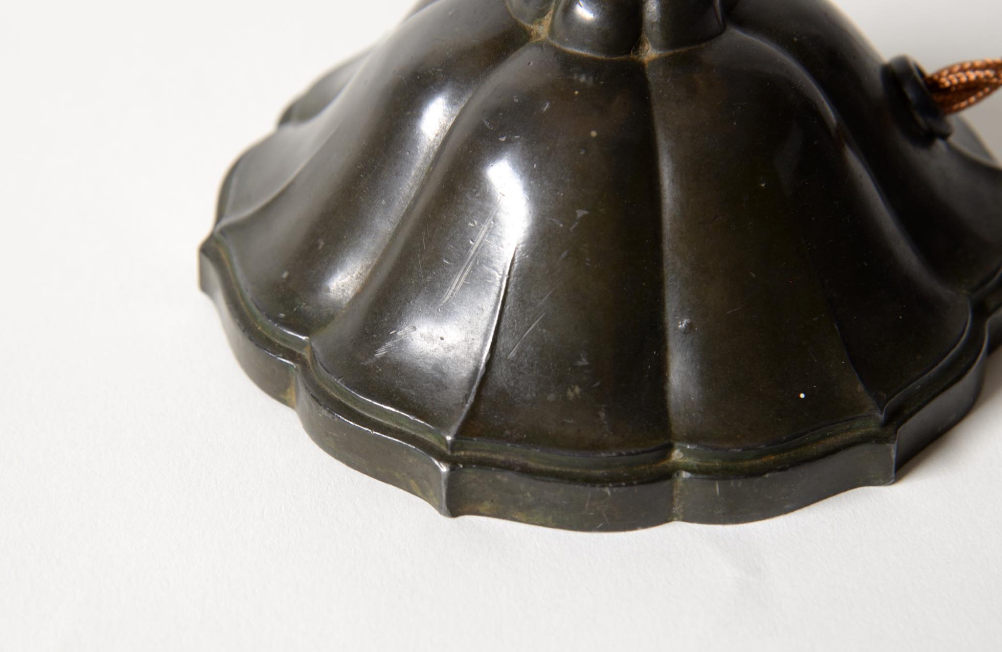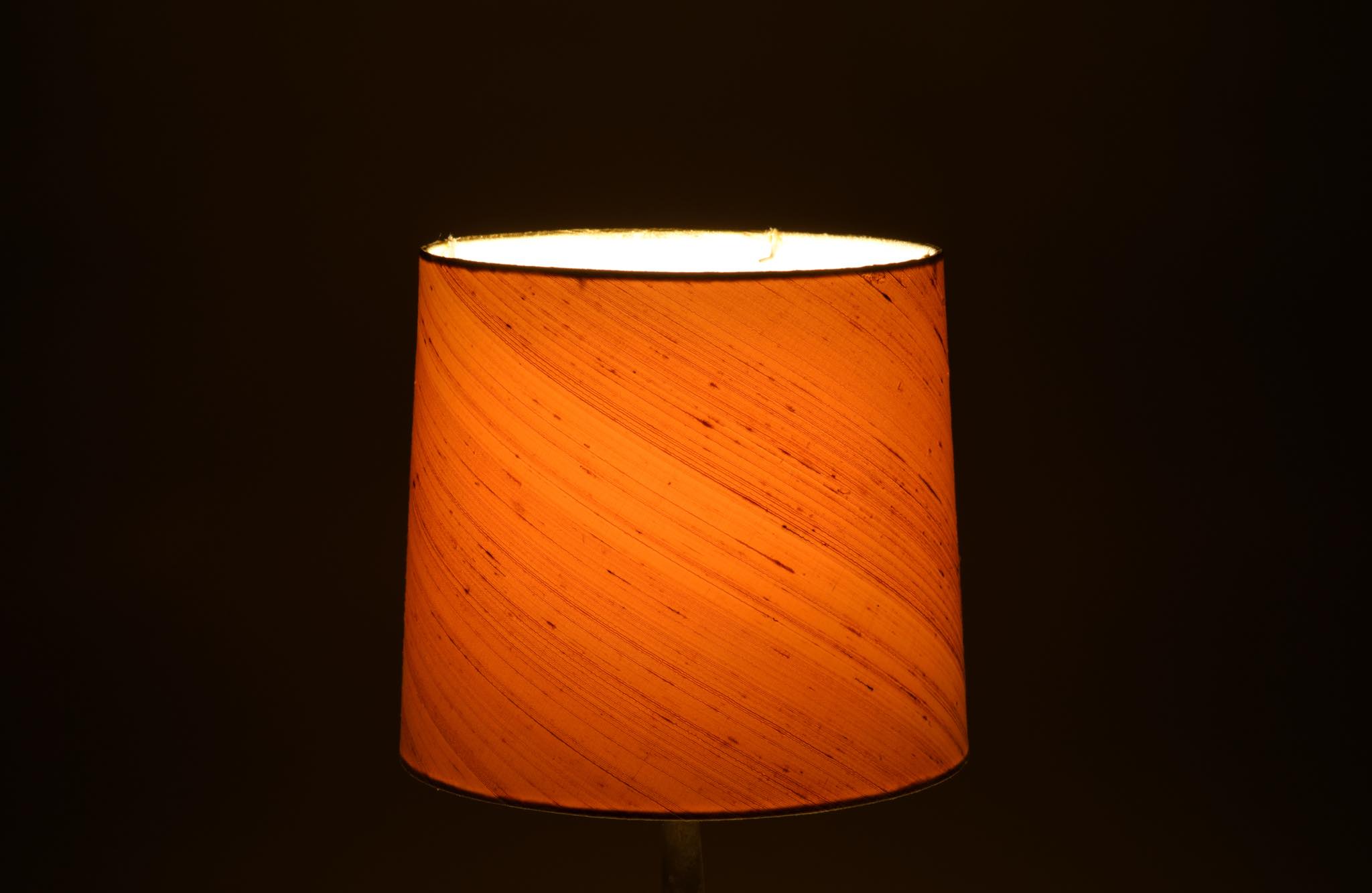 デンマークの金工作家、Just Andersen/ユスト・アナセンによるディスコメタル製のテーブルランプです。やや装飾的なアール・デコの様式で、小振りなつくりのものです。本体に小傷が少々見られますが、凹みや歪みなどなく綺麗な状態です。シェードはデンマークの古いシルキー張りのものを合わせました。