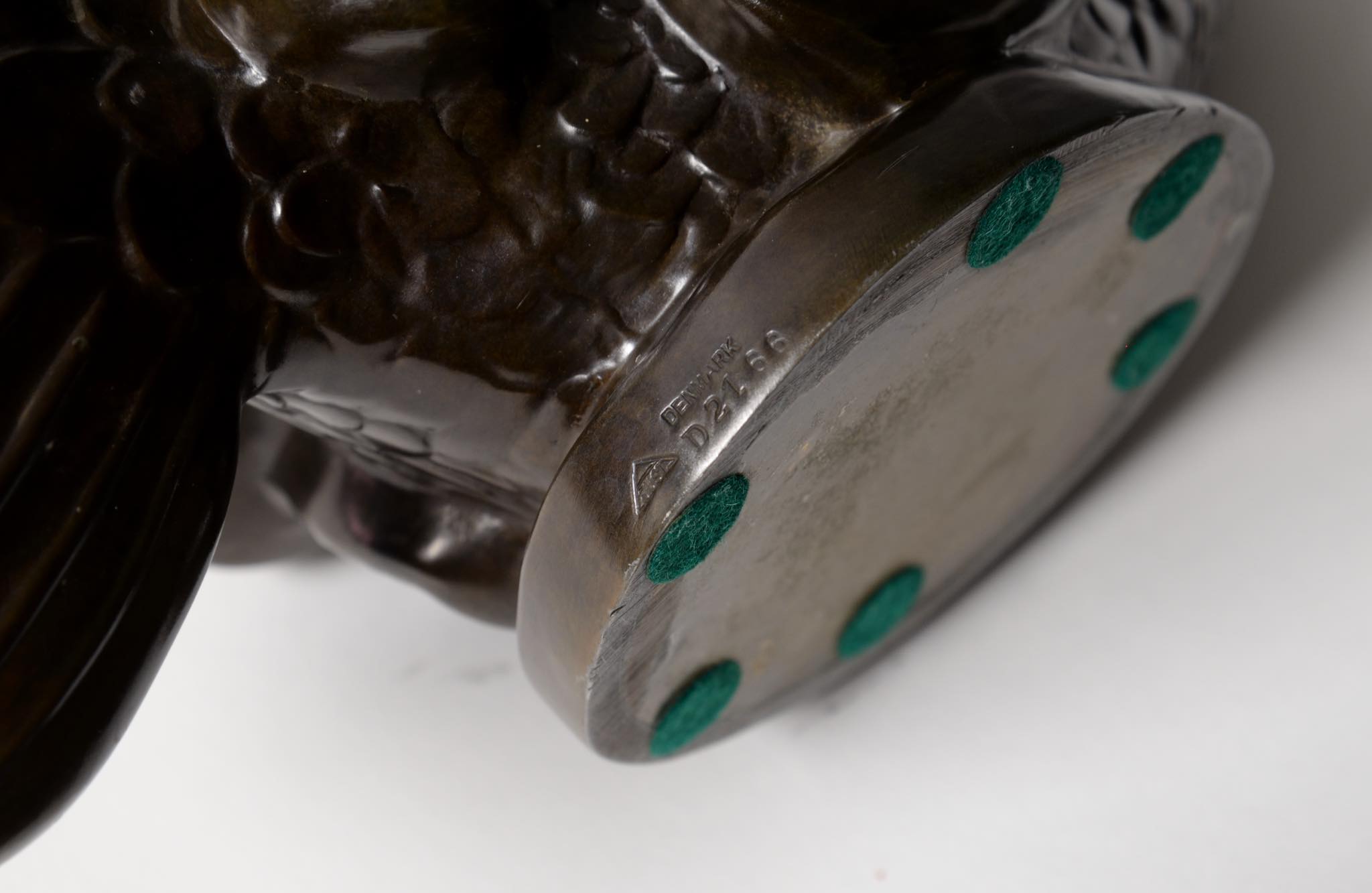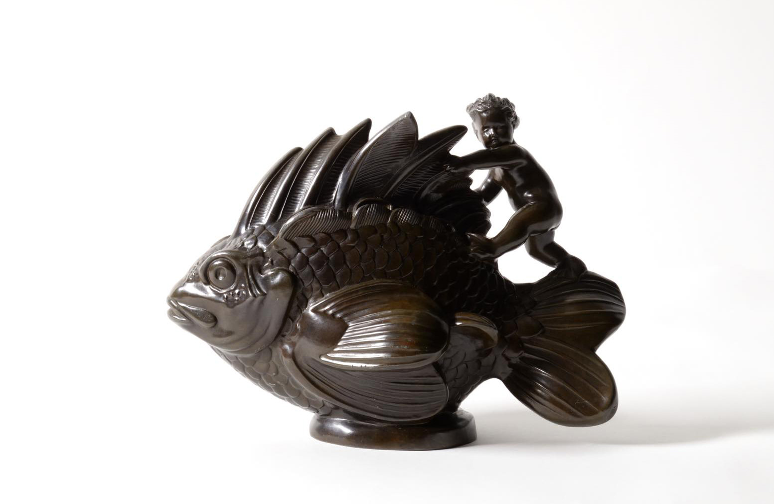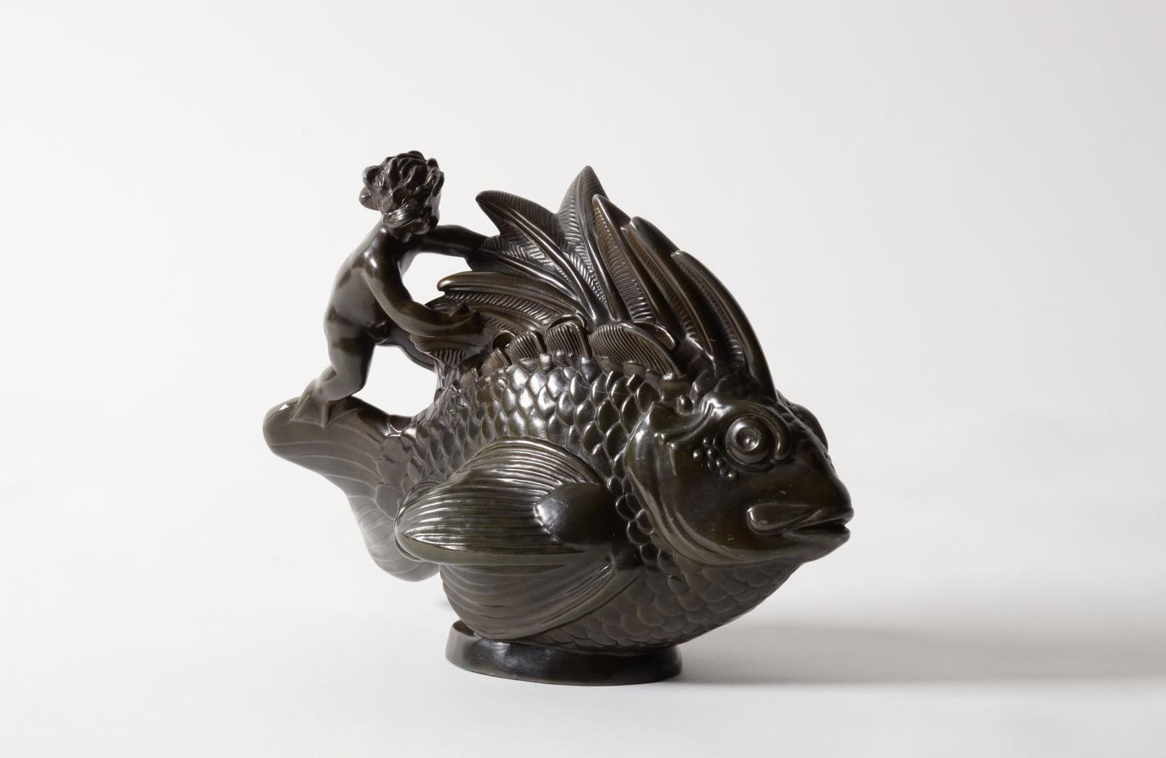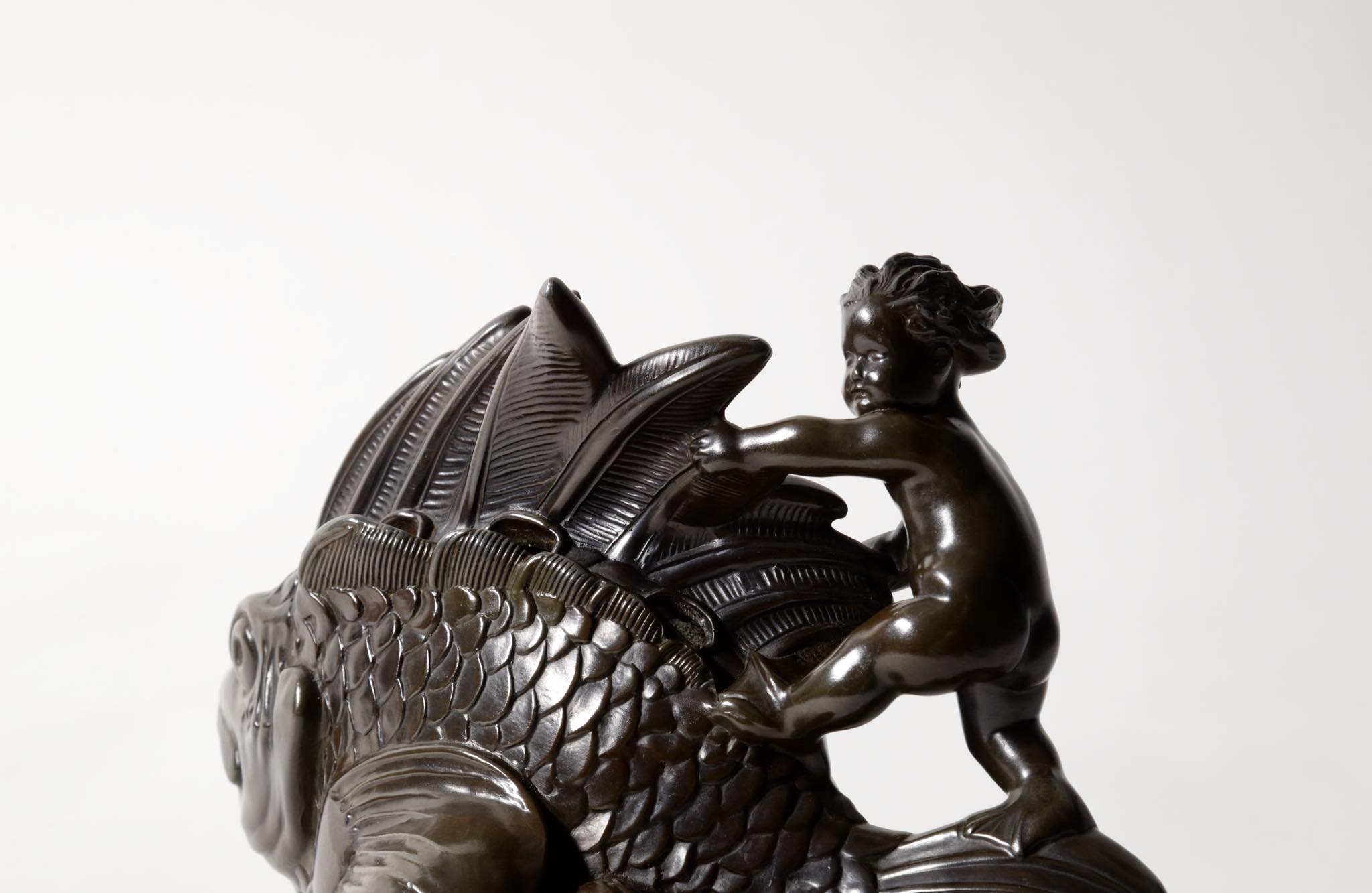デンマークの金工作家、Just Andersen/ユスト・アナセンによる大振りのスカルプチャー作品です。魚に乗る半人半魚の男児はギリシャ神話のトリトンでしょうか。トリトンは海の嵐を鎮めたり、海洋生物たちを保護するなどの役割を果たすと伝われています。ディスコメタルで作られており、コンディションは良好です。