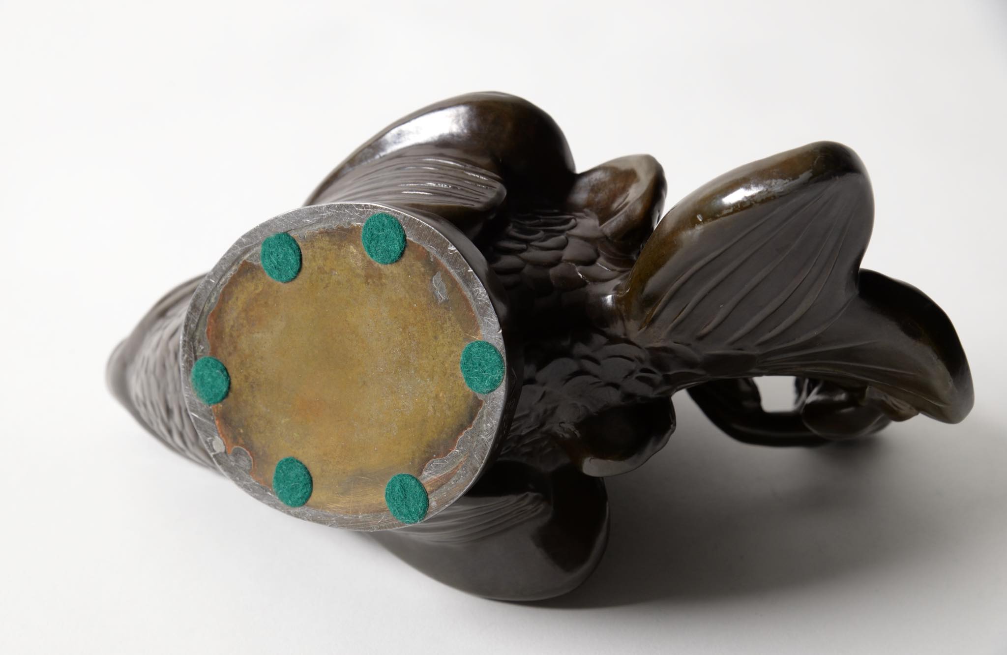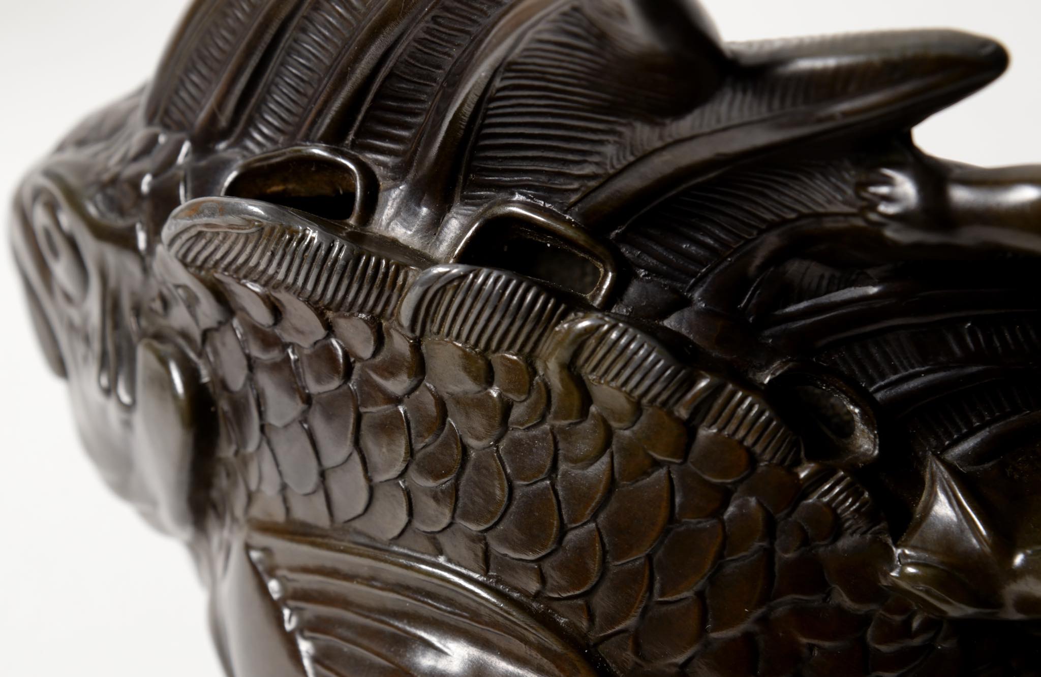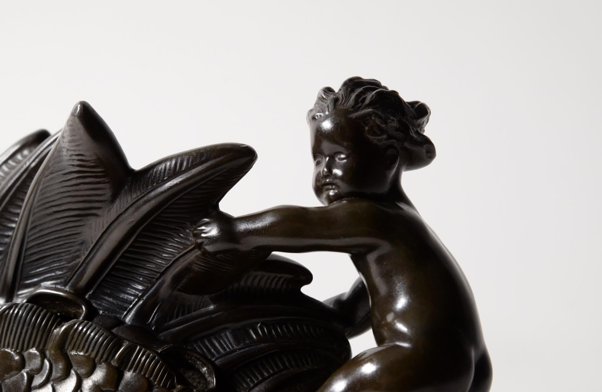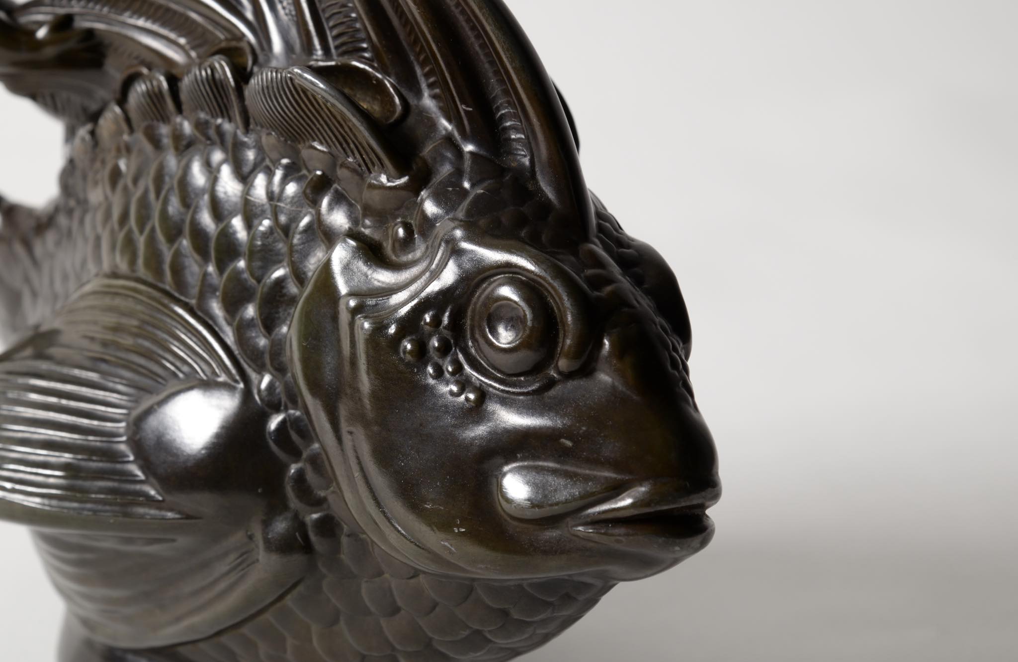 デンマークの金工作家、Just Andersen/ユスト・アナセンによる大振りのスカルプチャー作品です。魚に乗る半人半魚の男児はギリシャ神話のトリトンでしょうか。トリトンは海の嵐を鎮めたり、海洋生物たちを保護するなどの役割を果たすと伝われています。ディスコメタルで作られており、コンディションは良好です。