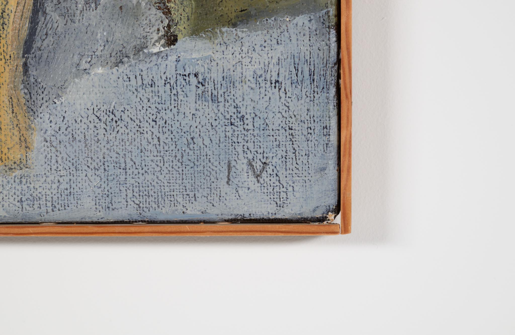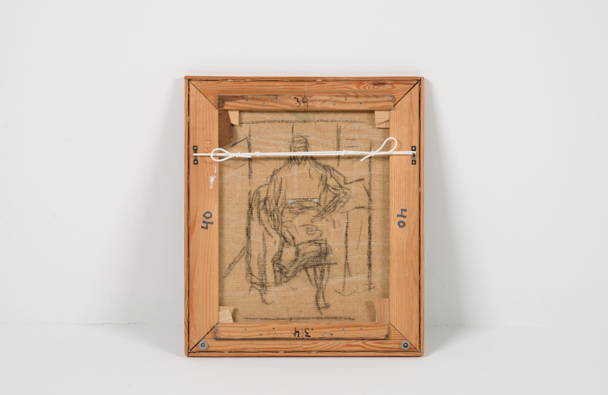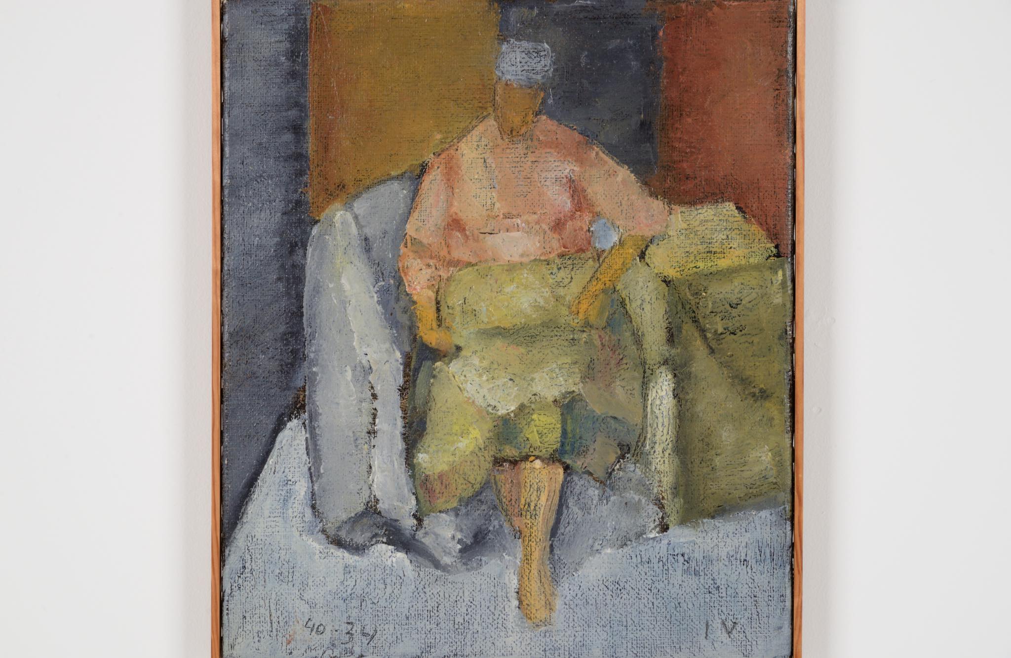 デンマーク人画家、Jeppe Vontillius/イェッペ・ヴォンティリウスによる油彩作品です。部屋に佇む女性は自身の奥方がモデルと云われており、春らしい明るい衣服を纏っています。比較的小振りな作品で、パイン材の角材を回しただけのフレームもオリジナルです。タイトルに「40・34」とありますが、これはキャンバスのサイズのようで、そのままタイトルとしたのかはわかりません。また、背面にも下書きが素描されています。コンディションは良好です。