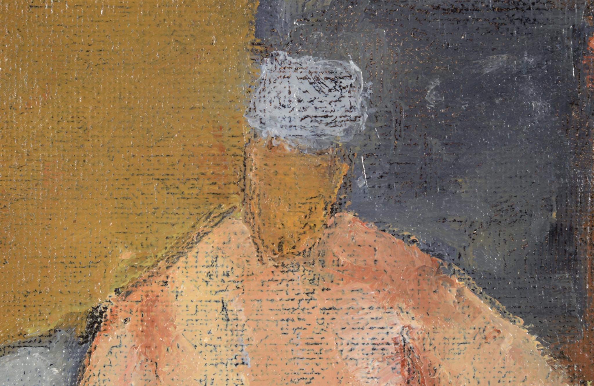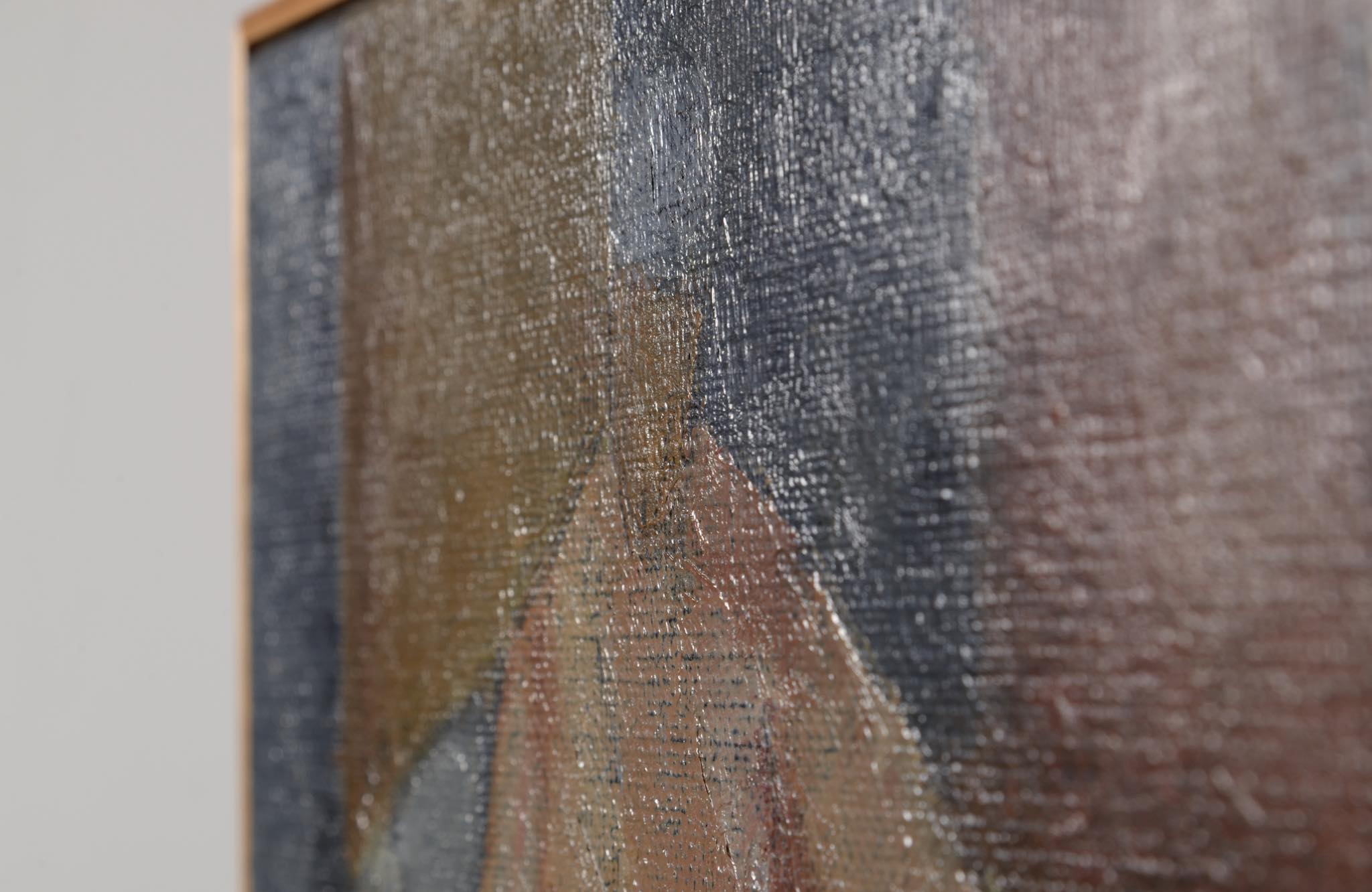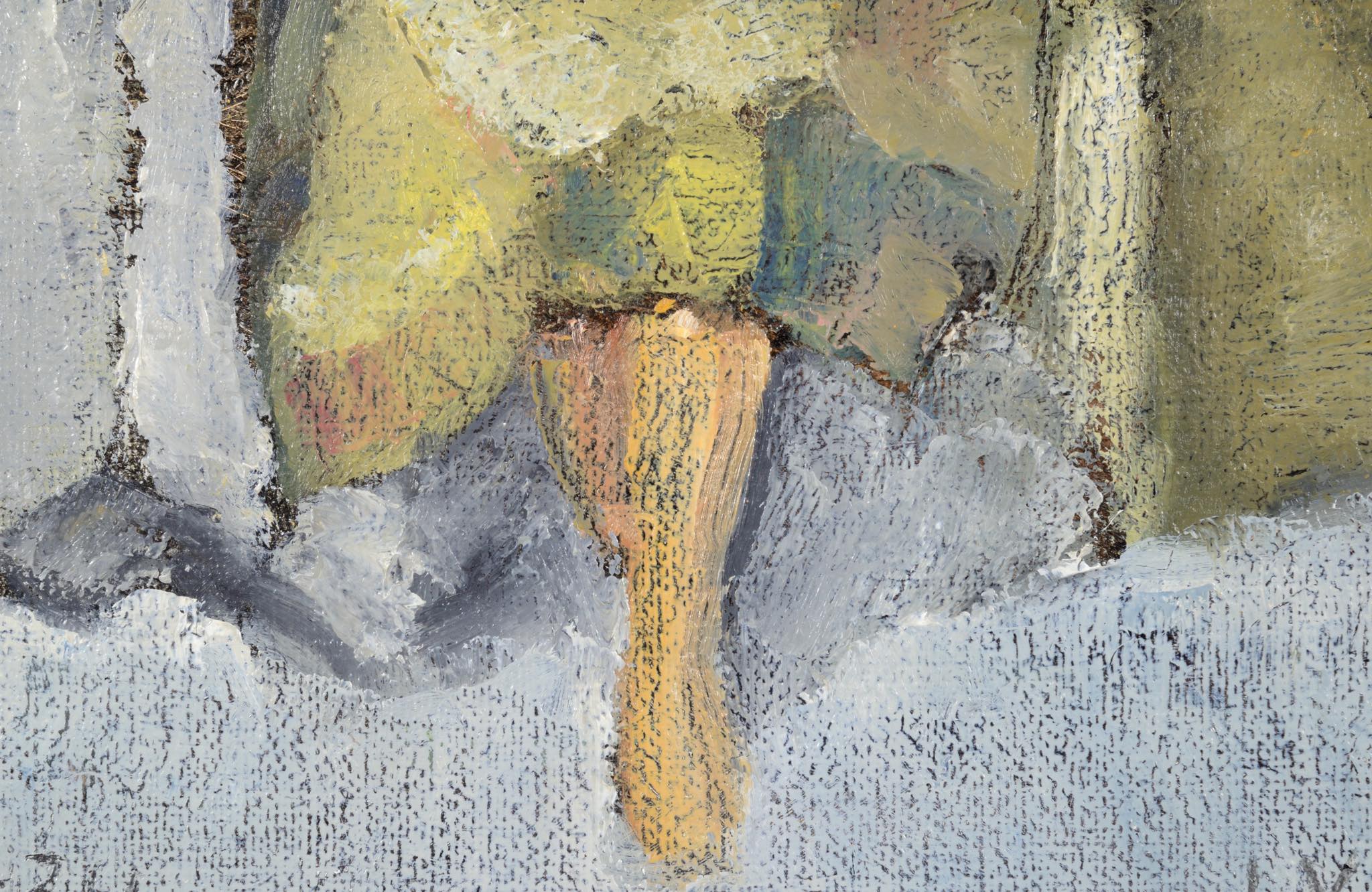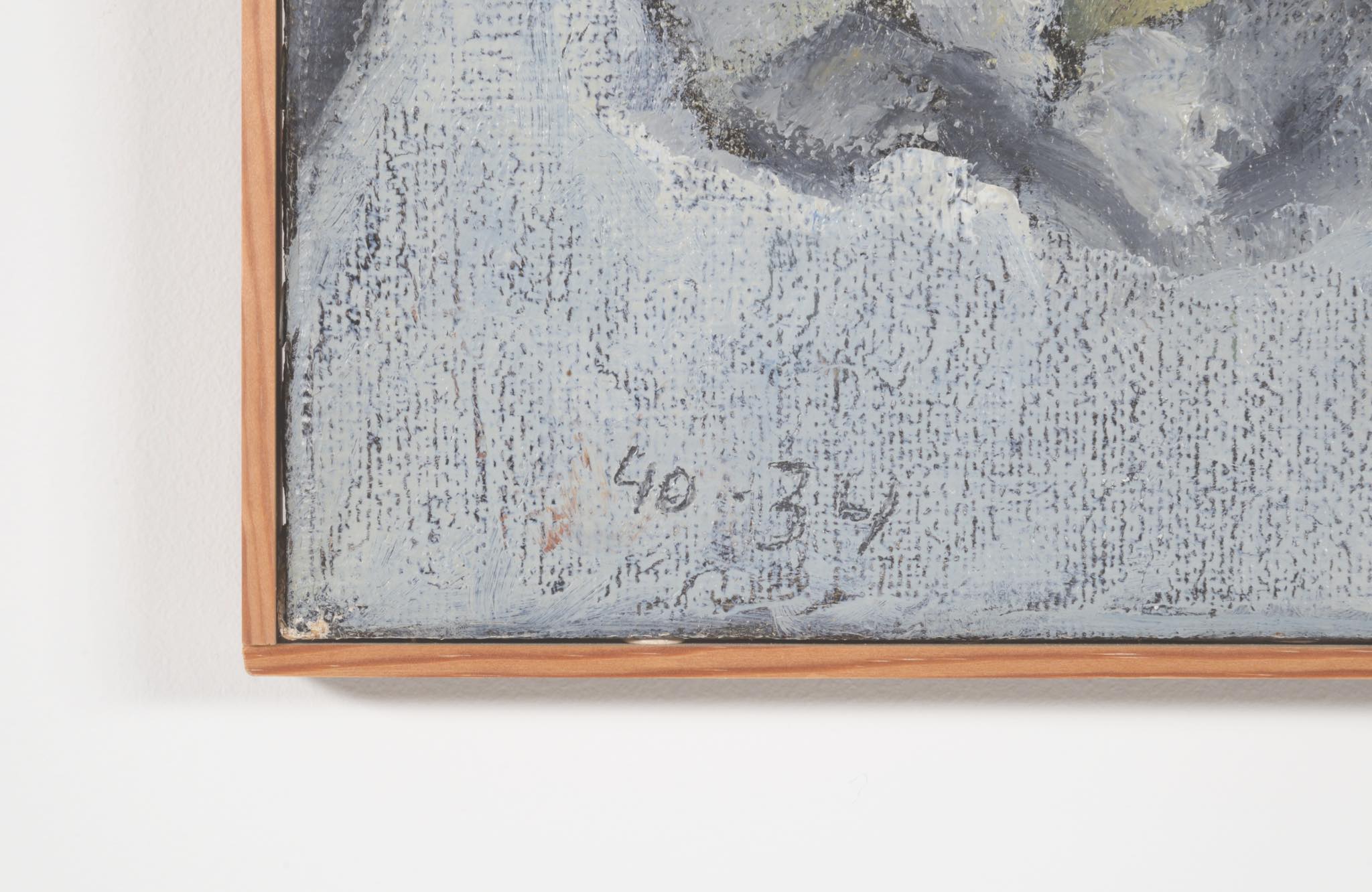 デンマーク人画家、Jeppe Vontillius/イェッペ・ヴォンティリウスによる油彩作品です。部屋に佇む女性は自身の奥方がモデルと云われており、春らしい明るい衣服を纏っています。比較的小振りな作品で、パイン材の角材を回しただけのフレームもオリジナルです。タイトルに「40・34」とありますが、これはキャンバスのサイズのようで、そのままタイトルとしたのかはわかりません。また、背面にも下書きが素描されています。コンディションは良好です。