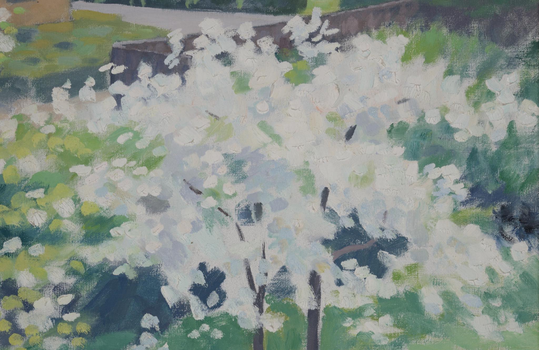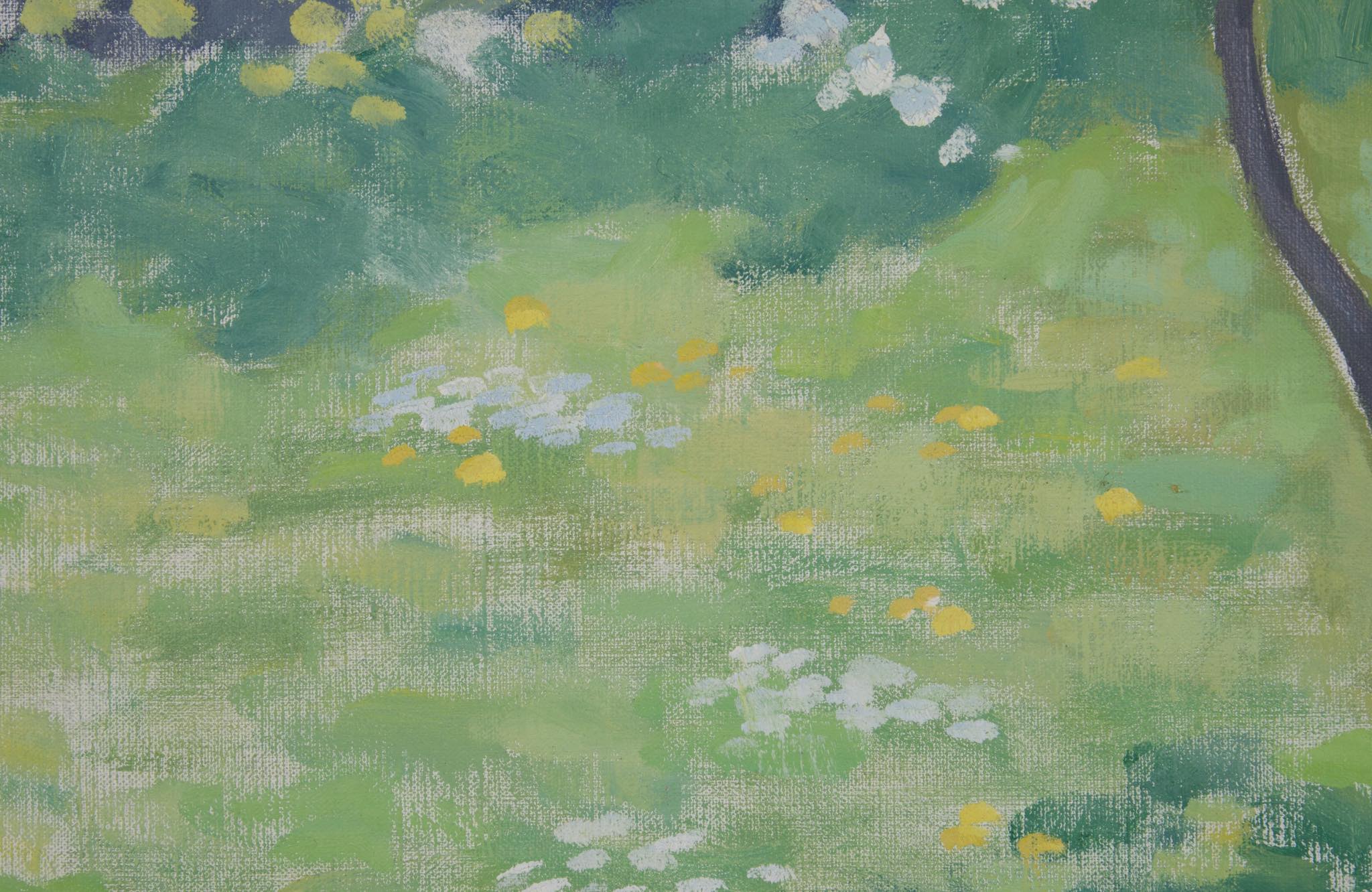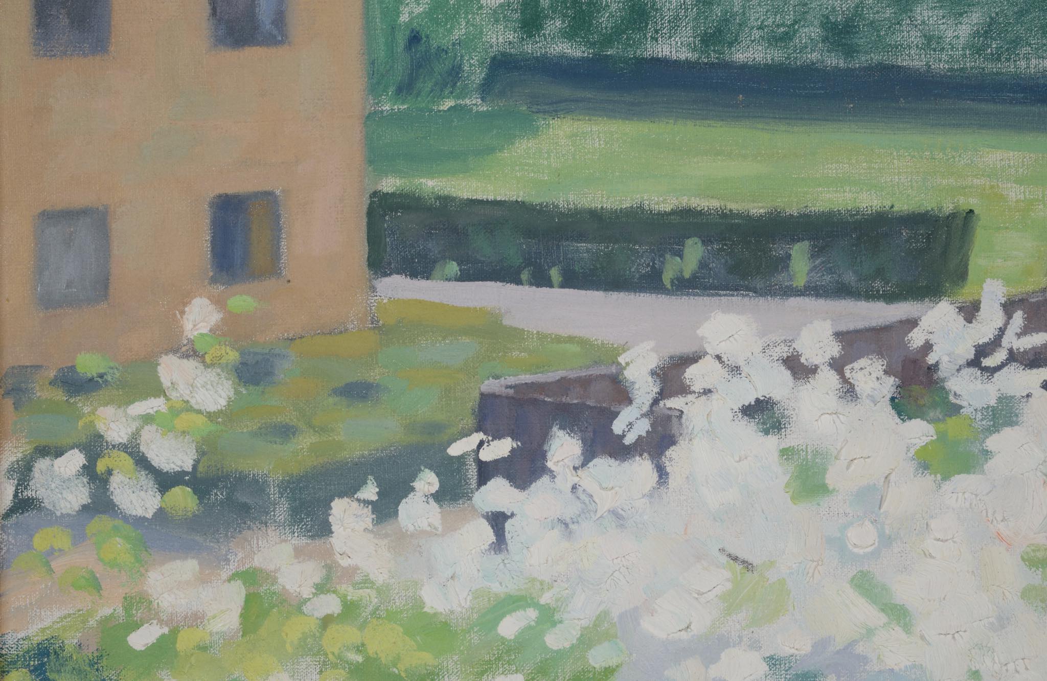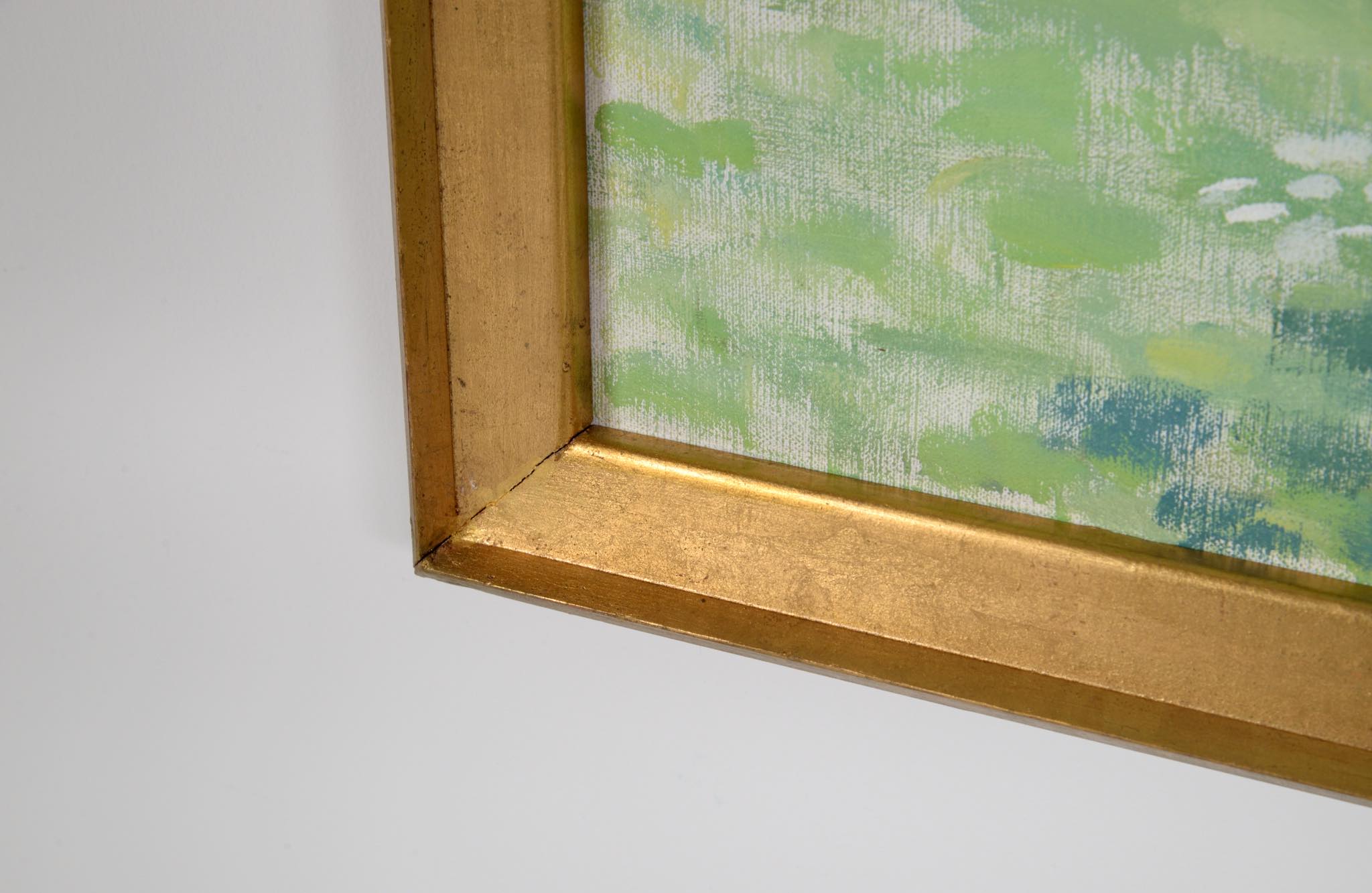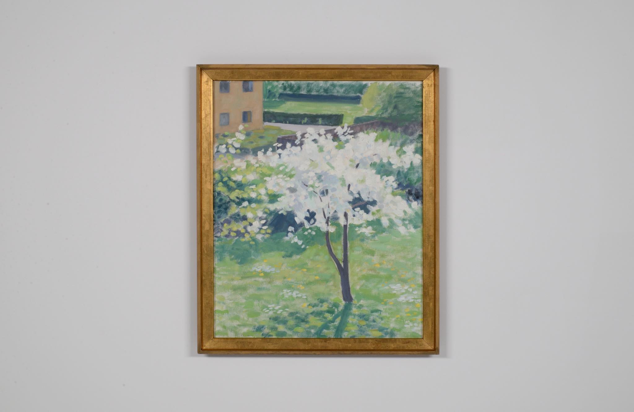 デンマーク人と思われるアーティストによる油彩作品です。サインがなく素性はわかりませんが、コペンハーゲン郊外の旧家から売り立てられた作品で、デンマーク人画家によるものと思われます。中庭の樹木をモチーフにしたもので、爽やかなタッチで咲き乱れる花々が描かれています。金泥のフレームはオリジナルで、コンディションは良好です。