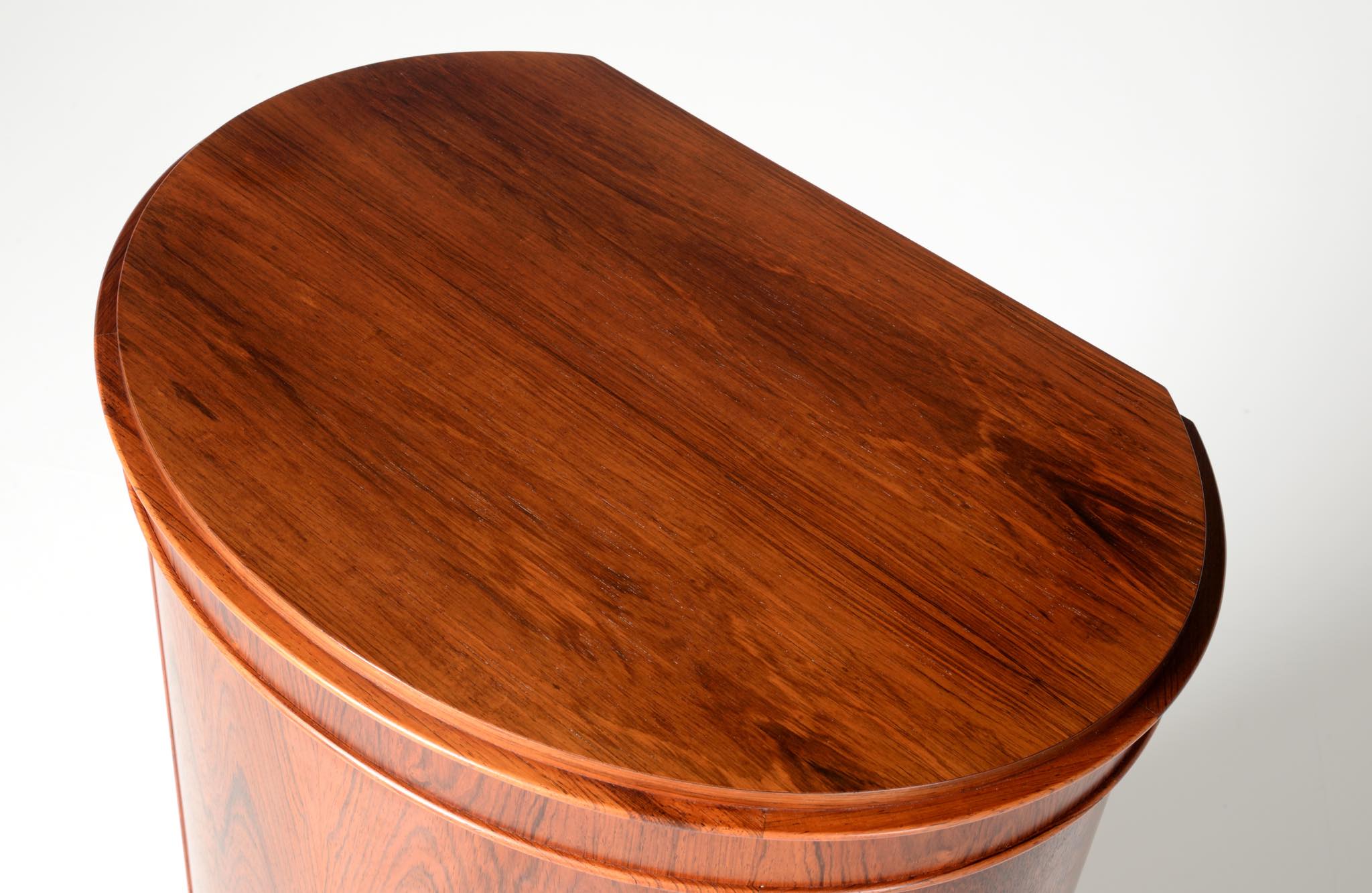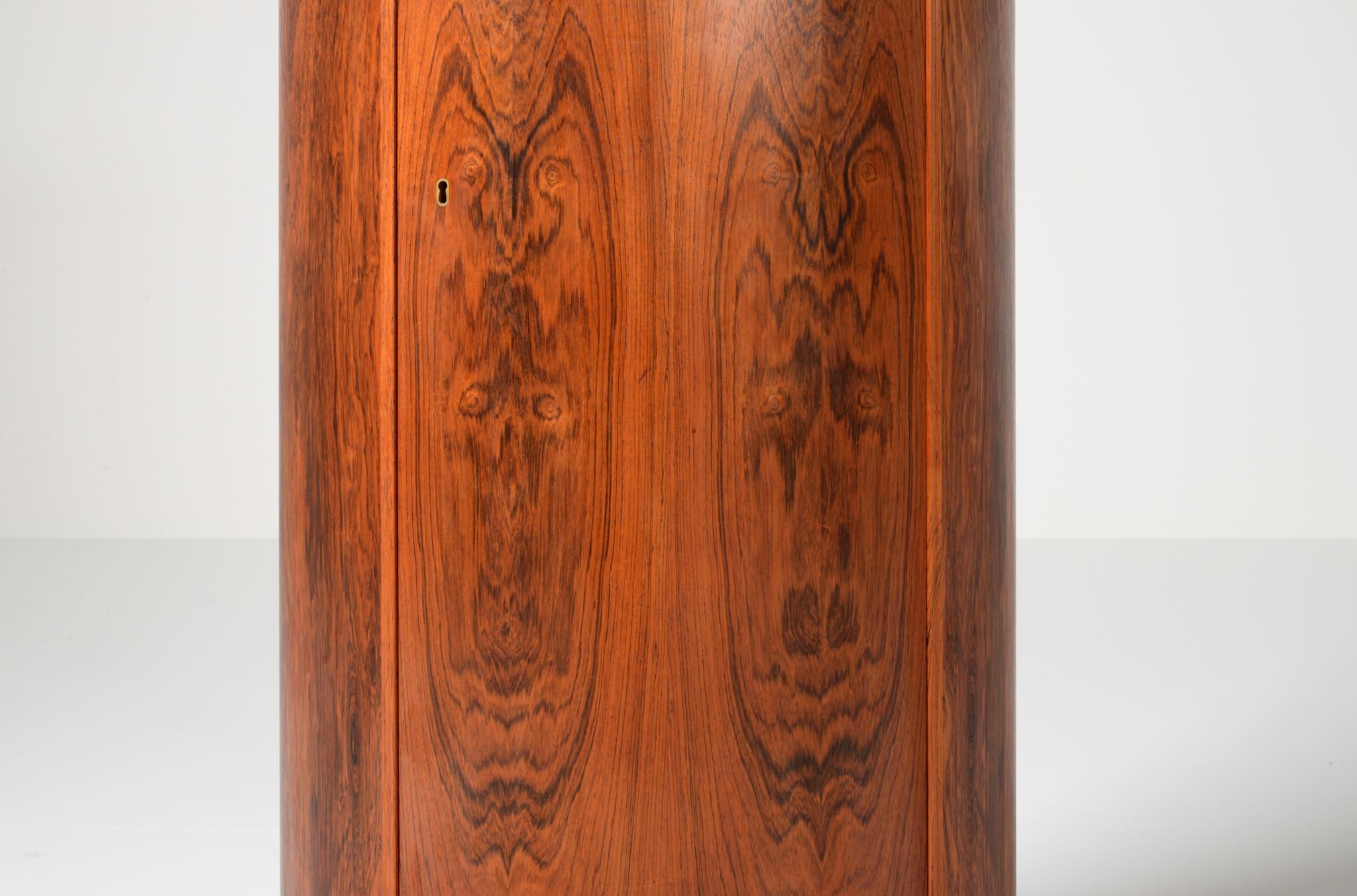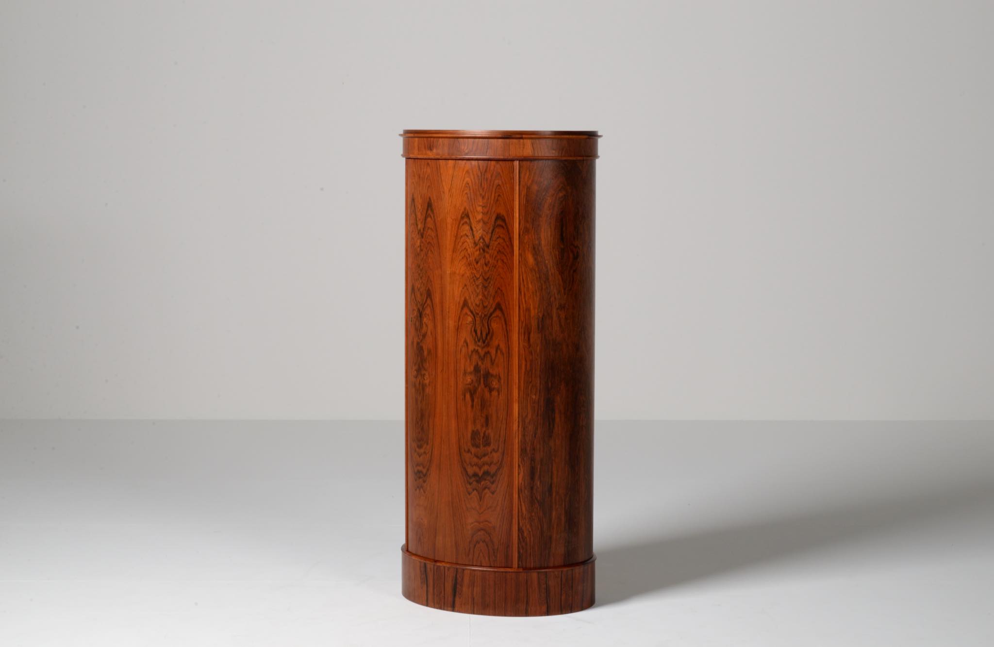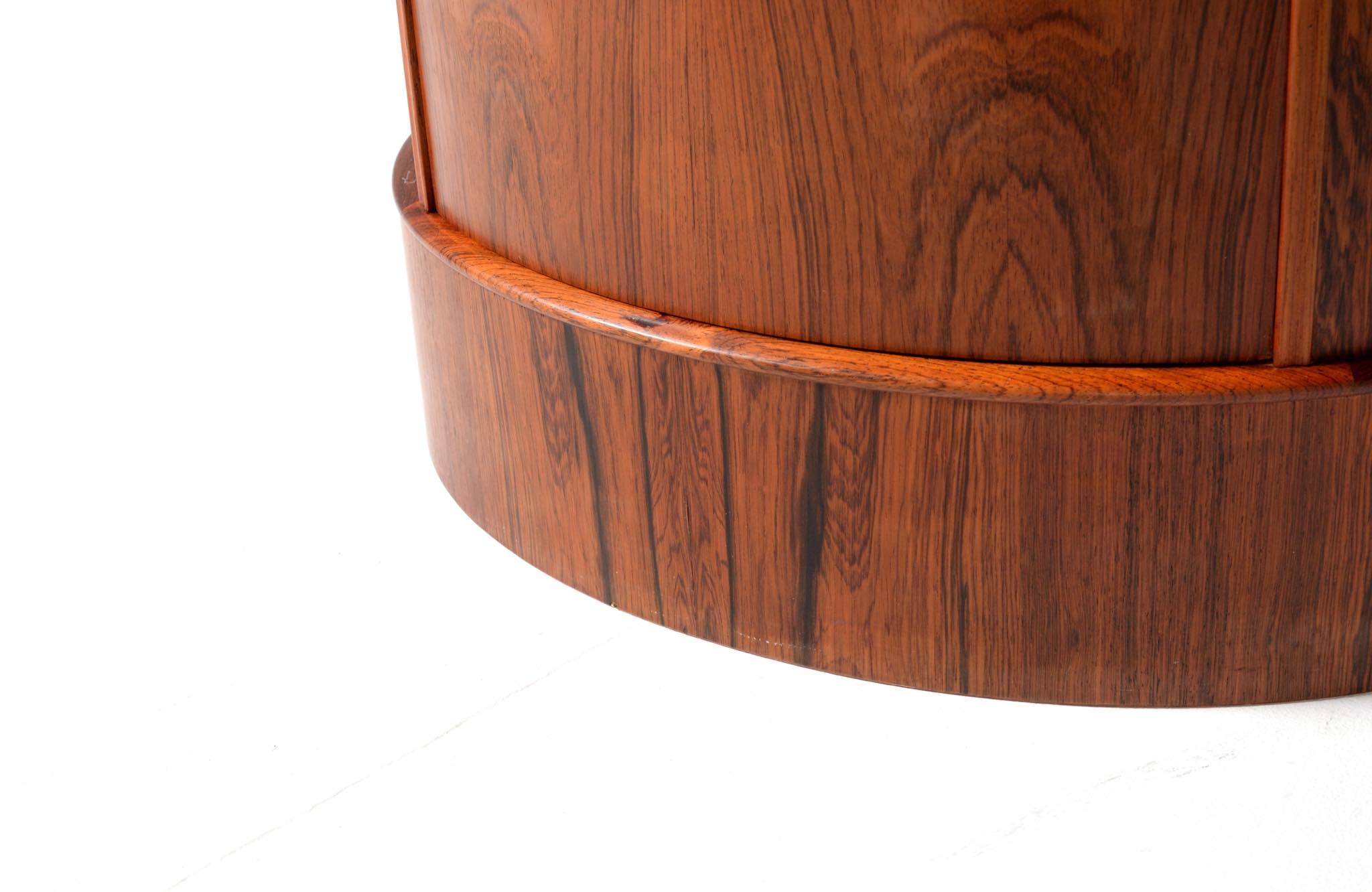 デンマークの家具工房、Bornholm mobler/ボーンホルム社によるシリンダーバーキャビネット、1967年6月13日に作られたもので、良質のローズウッド材が用いられています。シリンダーバーキャビネットはリビングに置き、酒類や、趣味の小物などを収納するキャビネットです。東洋の家具様式にはない筒型の形状が特徴的です。