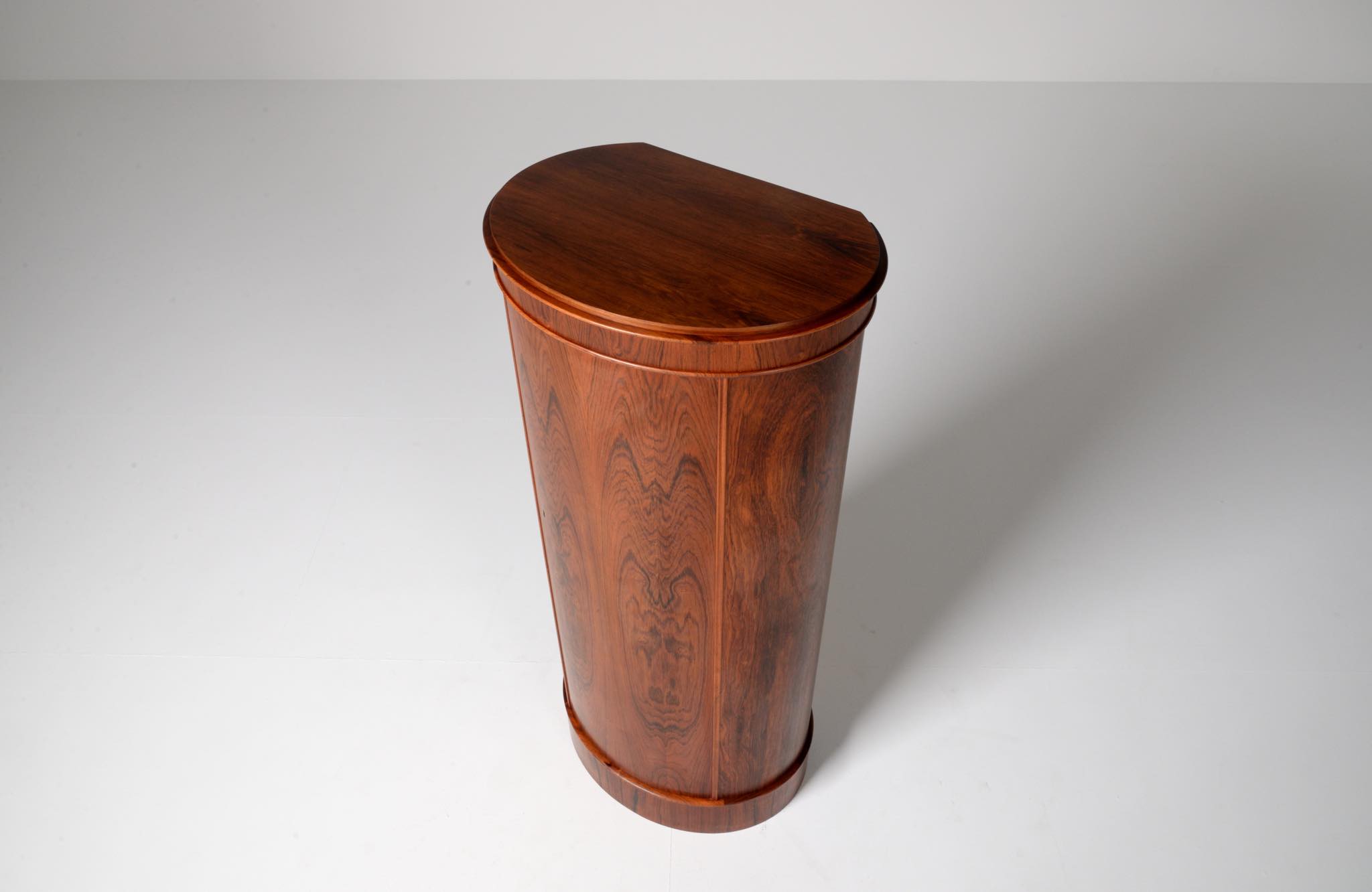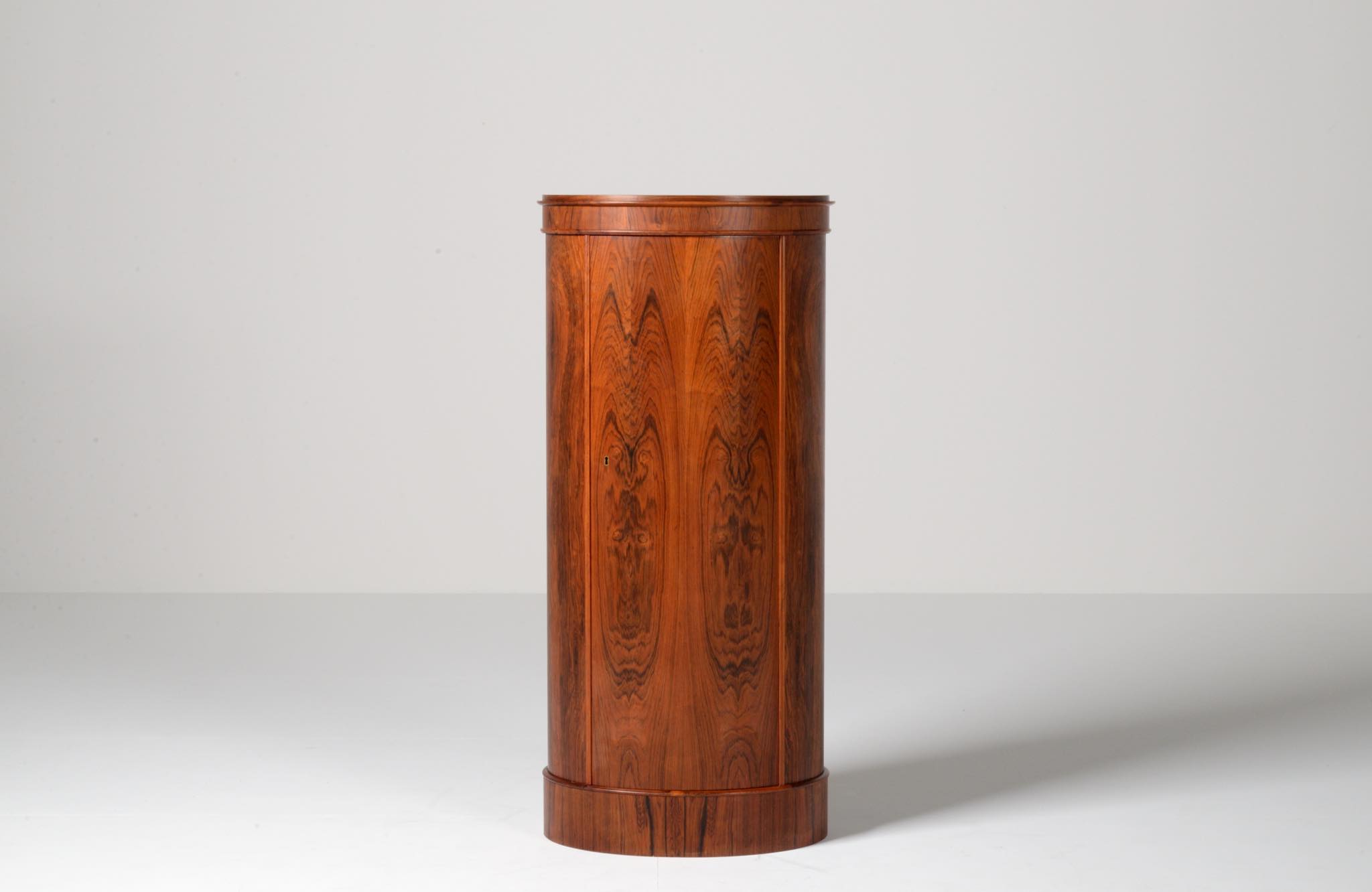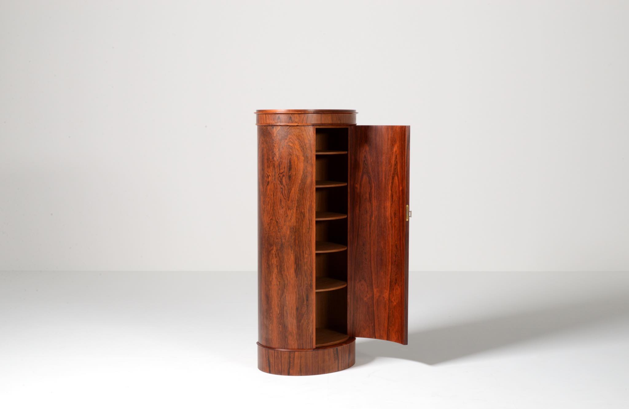 デンマークの家具工房、Bornholm mobler/ボーンホルム社によるシリンダーバーキャビネット、1967年6月13日に作られたもので、良質のローズウッド材が用いられています。シリンダーバーキャビネットはリビングに置き、酒類や、趣味の小物などを収納するキャビネットです。東洋の家具様式にはない筒型の形状が特徴的です。