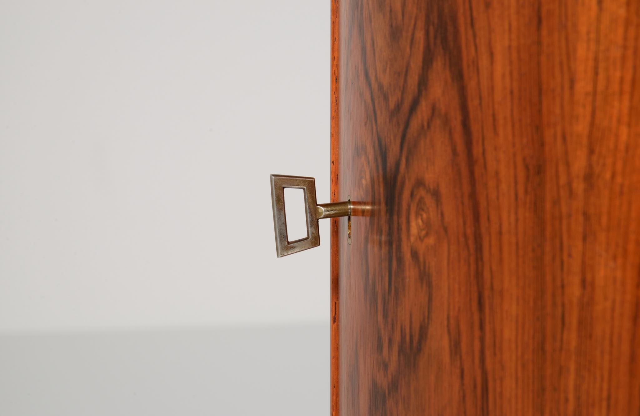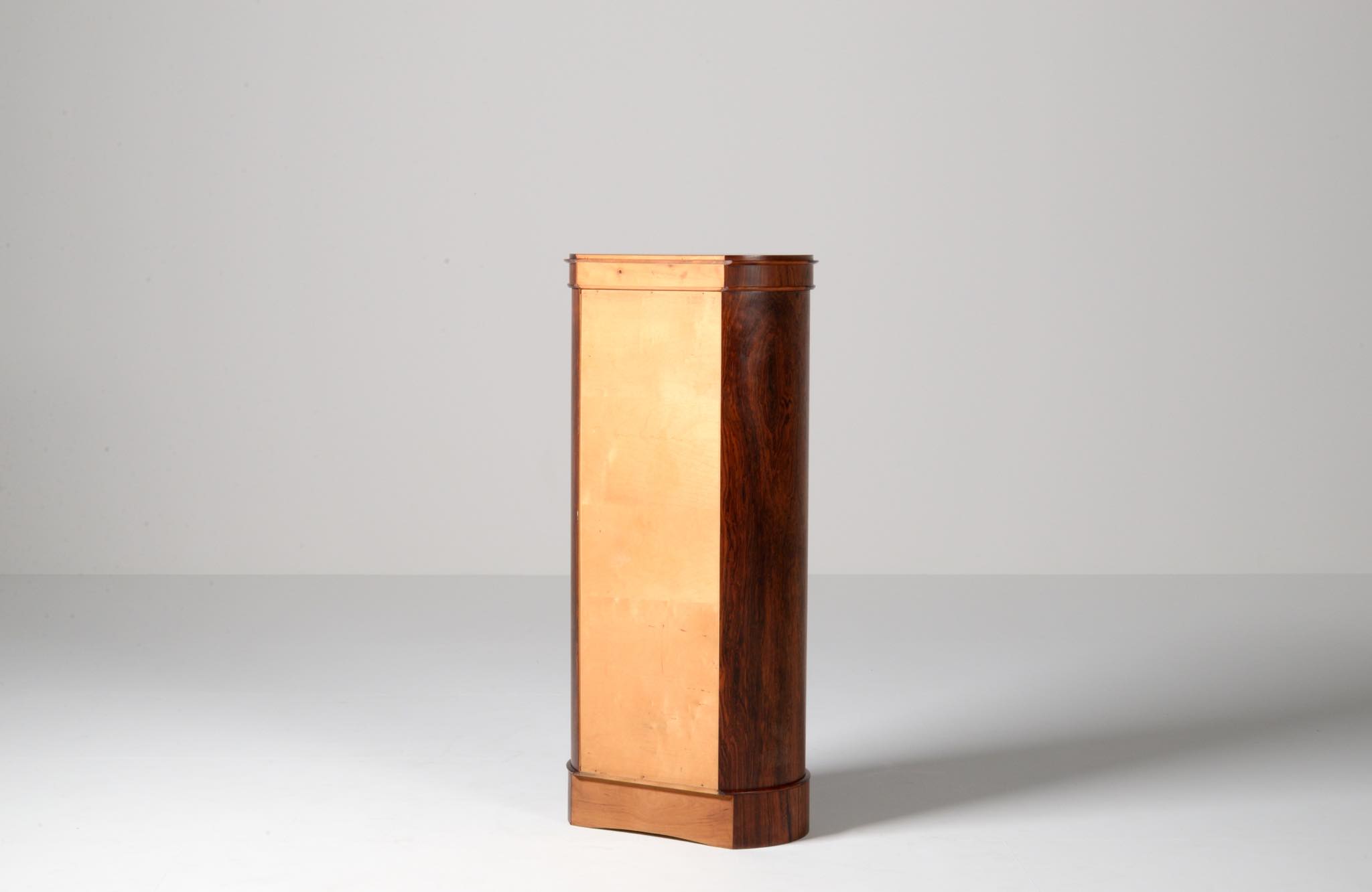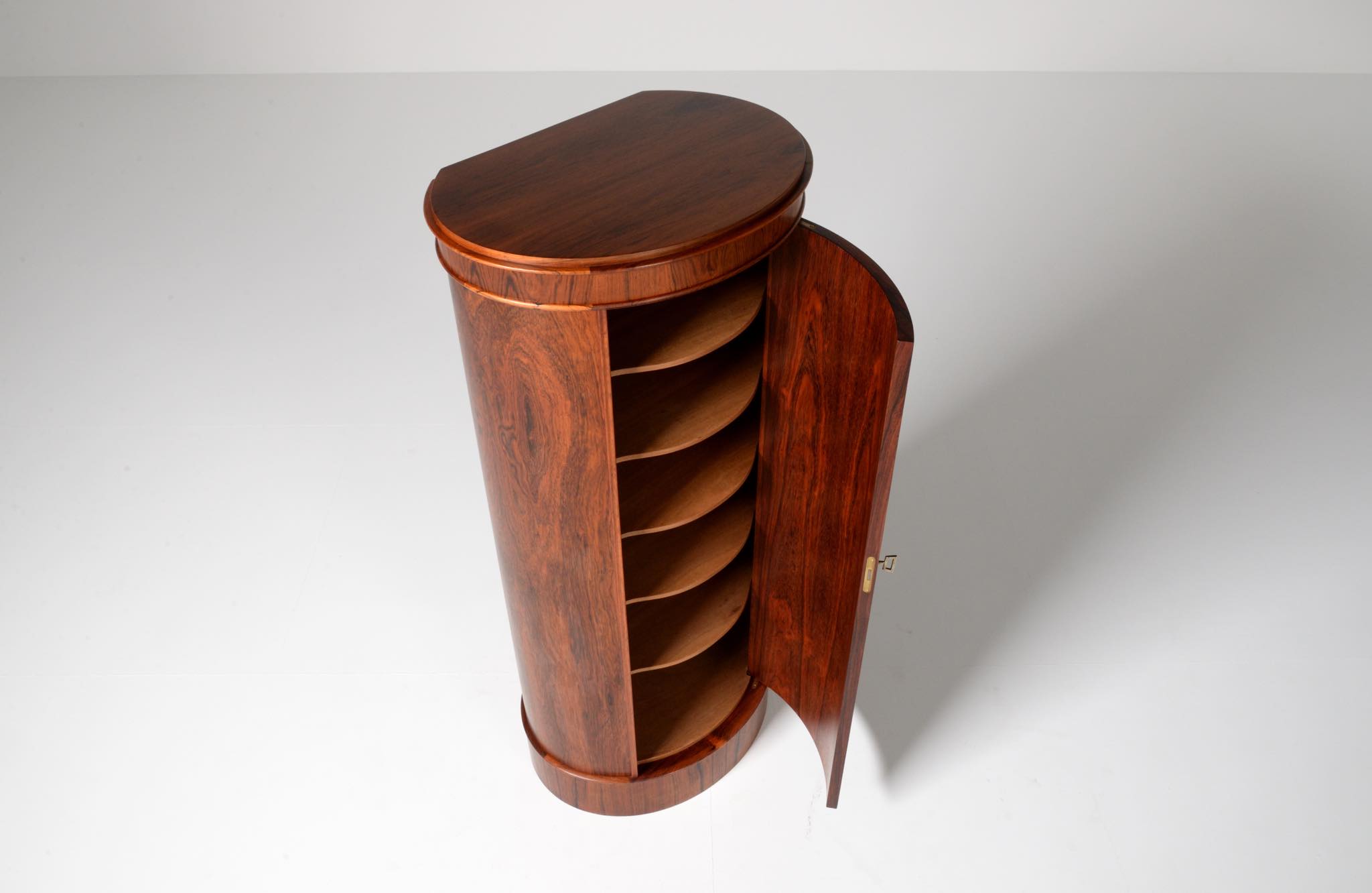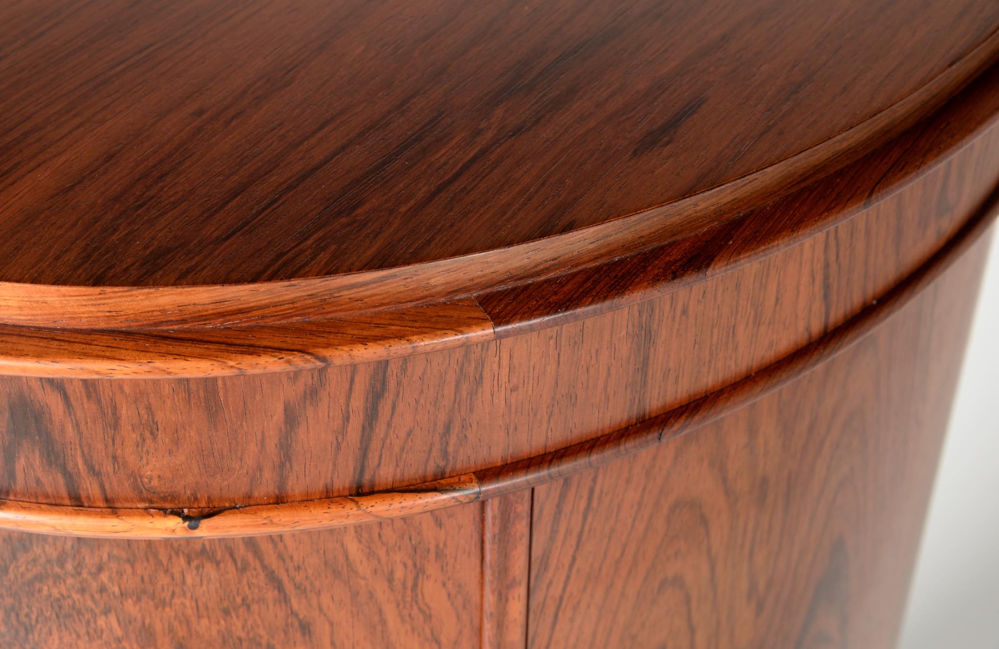 デンマークの家具工房、Bornholm mobler/ボーンホルム社によるシリンダーバーキャビネット、1967年6月13日に作られたもので、良質のローズウッド材が用いられています。シリンダーバーキャビネットはリビングに置き、酒類や、趣味の小物などを収納するキャビネットです。東洋の家具様式にはない筒型の形状が特徴的です。