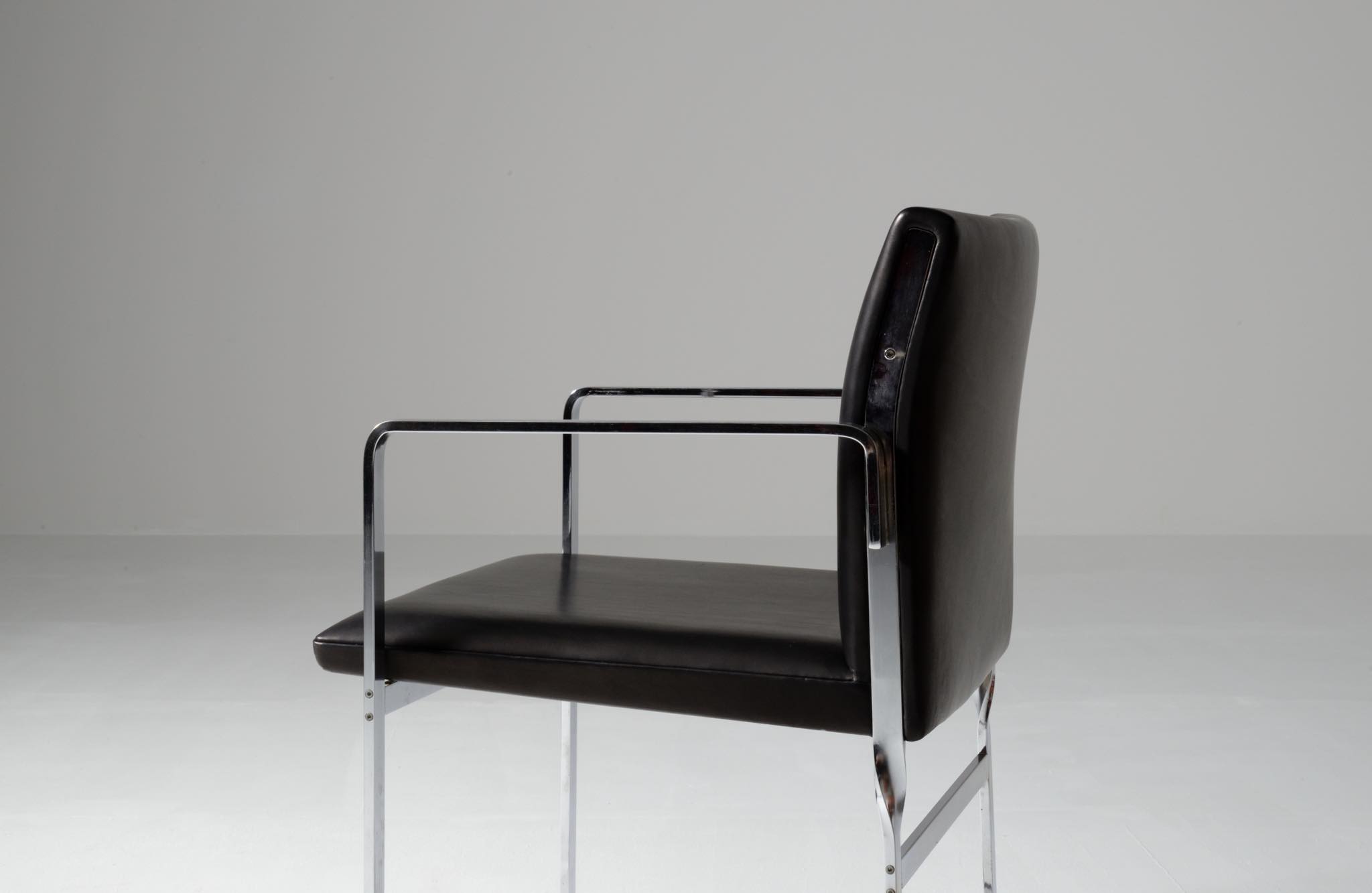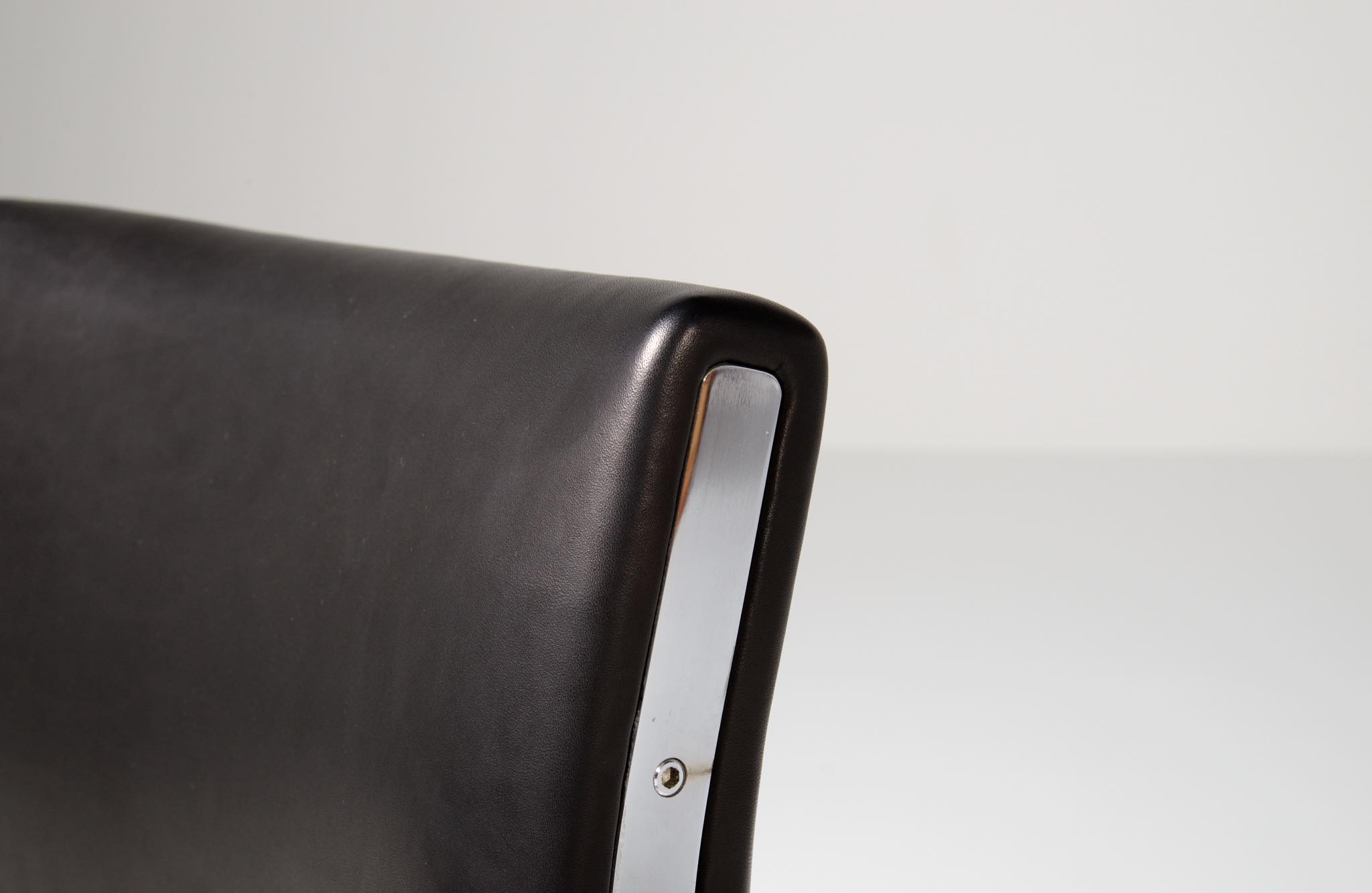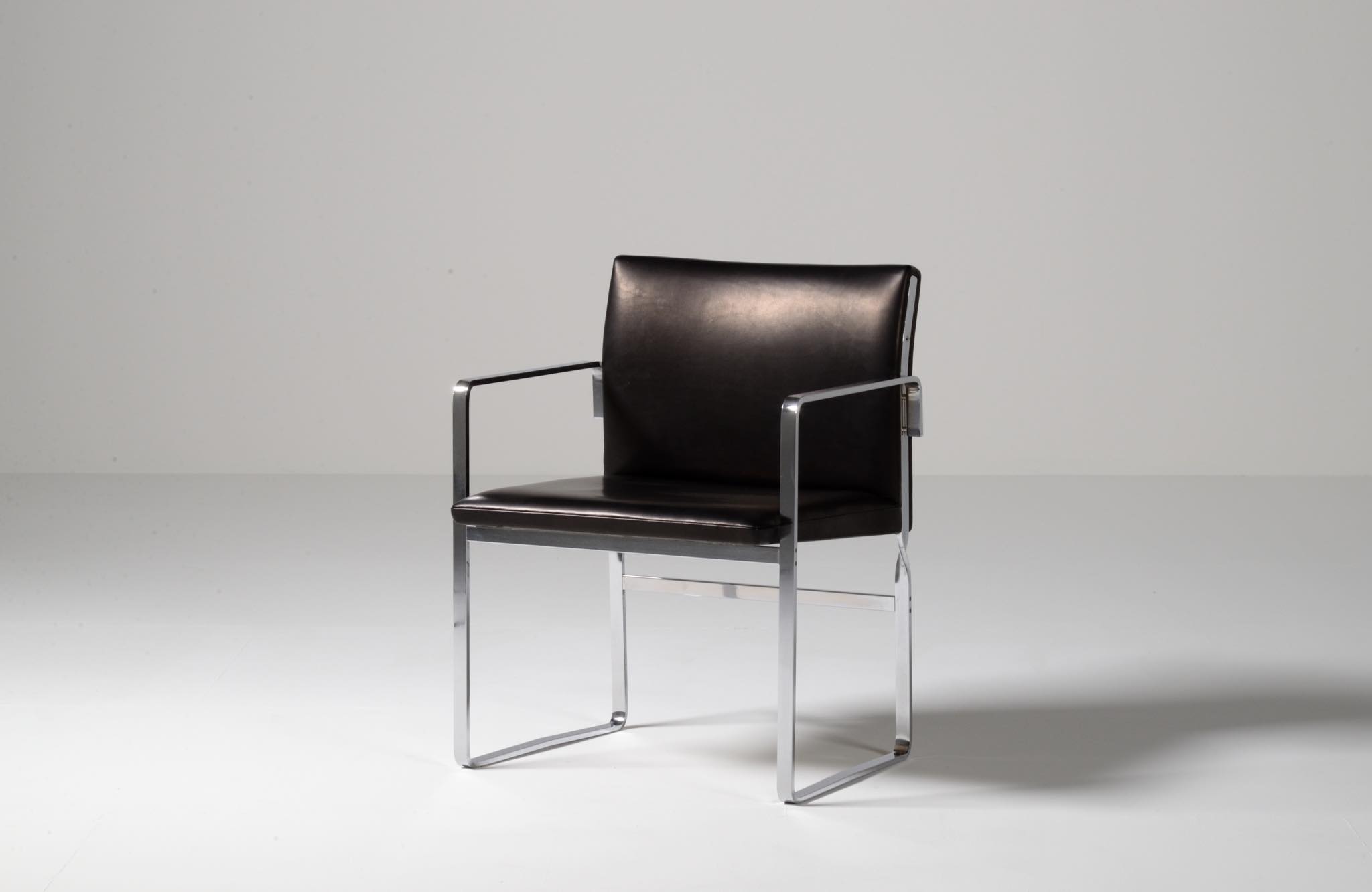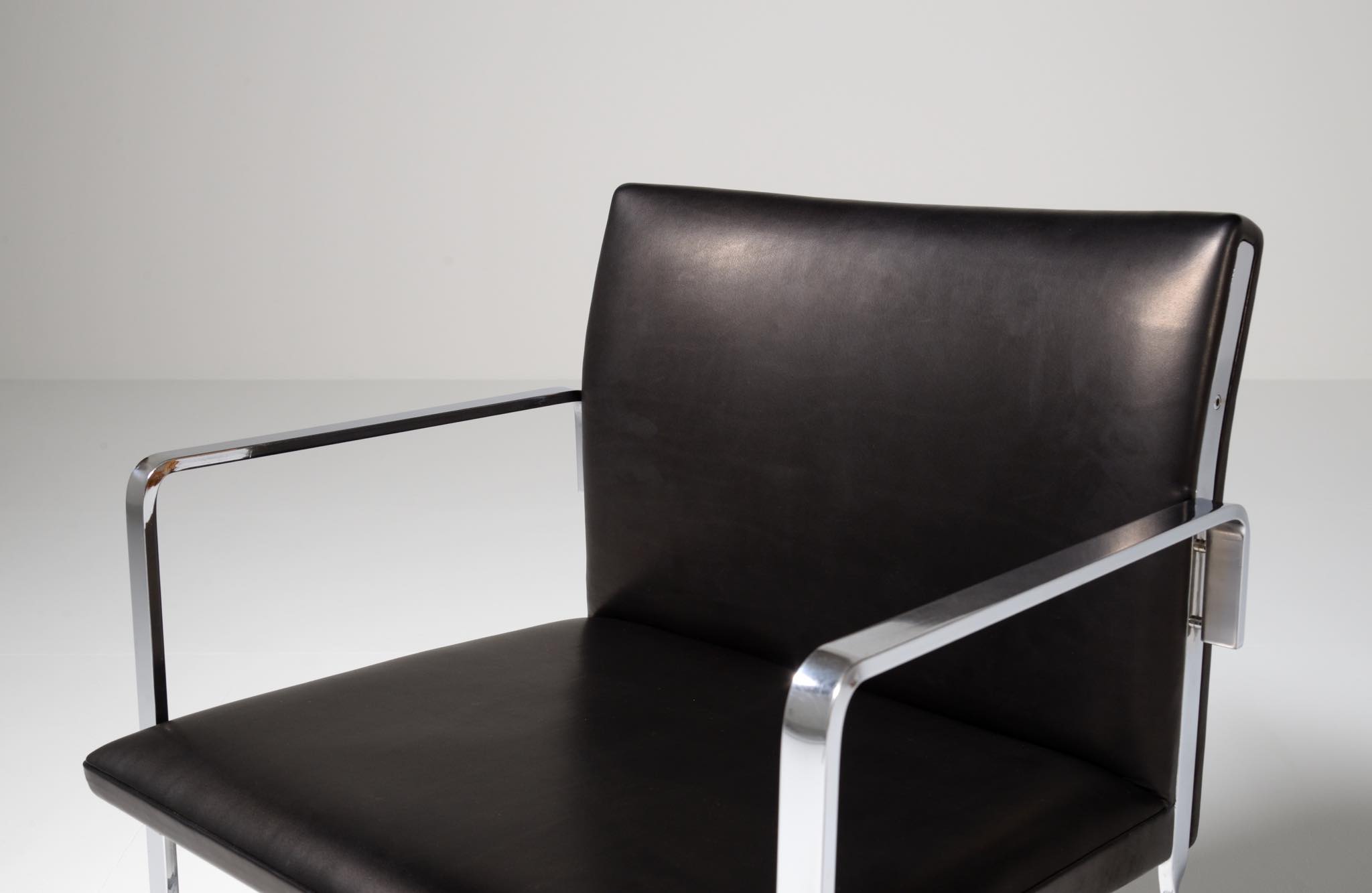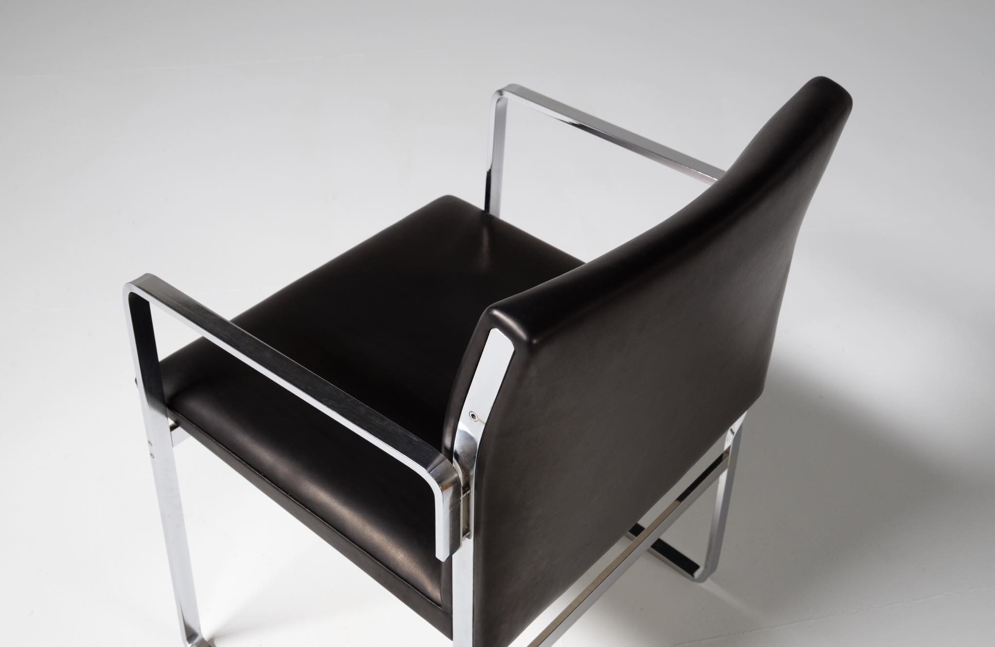 デンマークを代表する家具デザイナーの Hans J. Wegner/ハンス・ウェグナーによる ”JH811” アームチェアです。1970年代に作られたもので、フレームには重厚なクロームドスティールを用いており、後脚から背柱にかけての「捻り」がアクセントとなっています。皮革は新たに張り替えました。スティールの状態などコンディションは良好です。