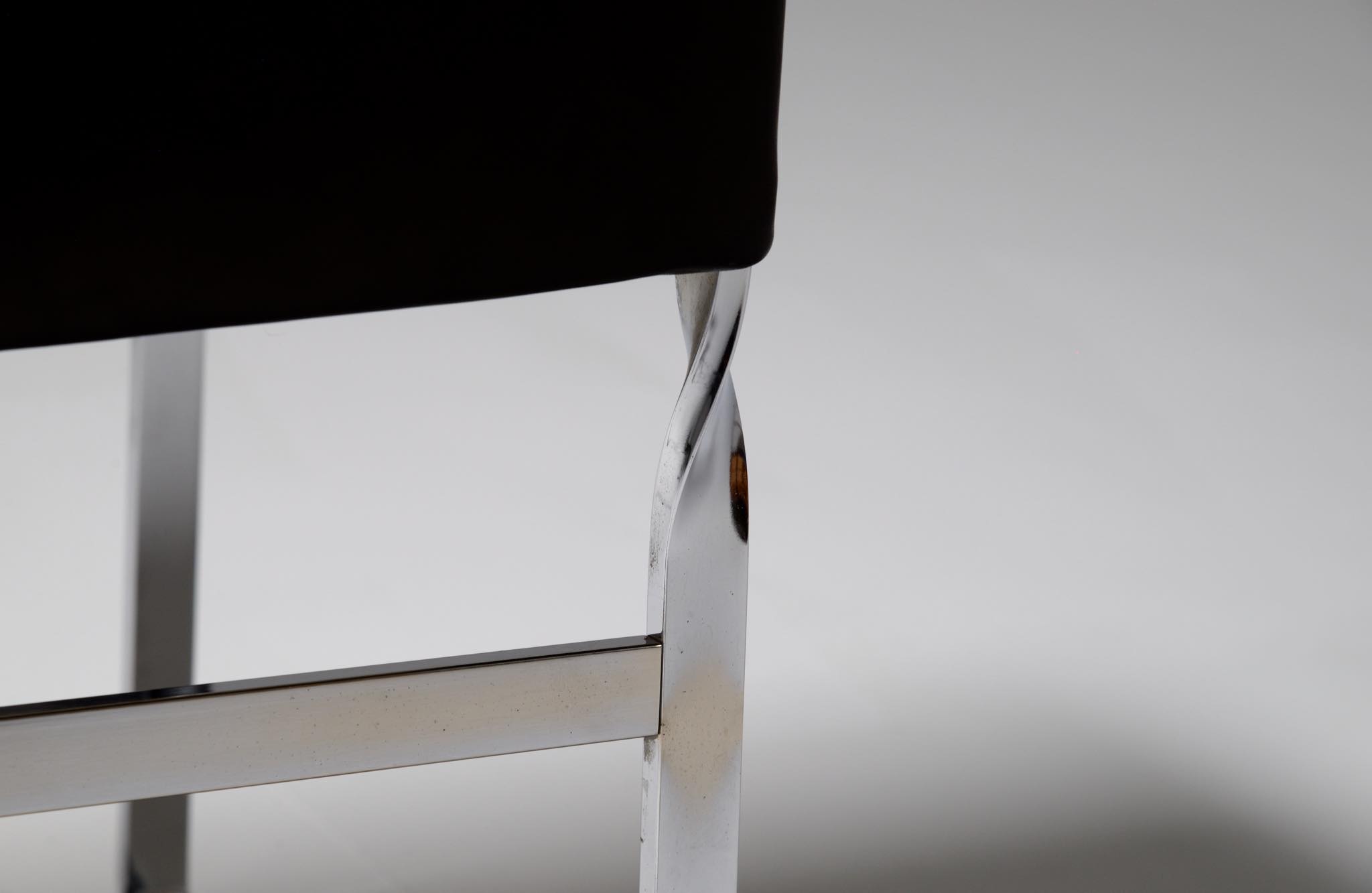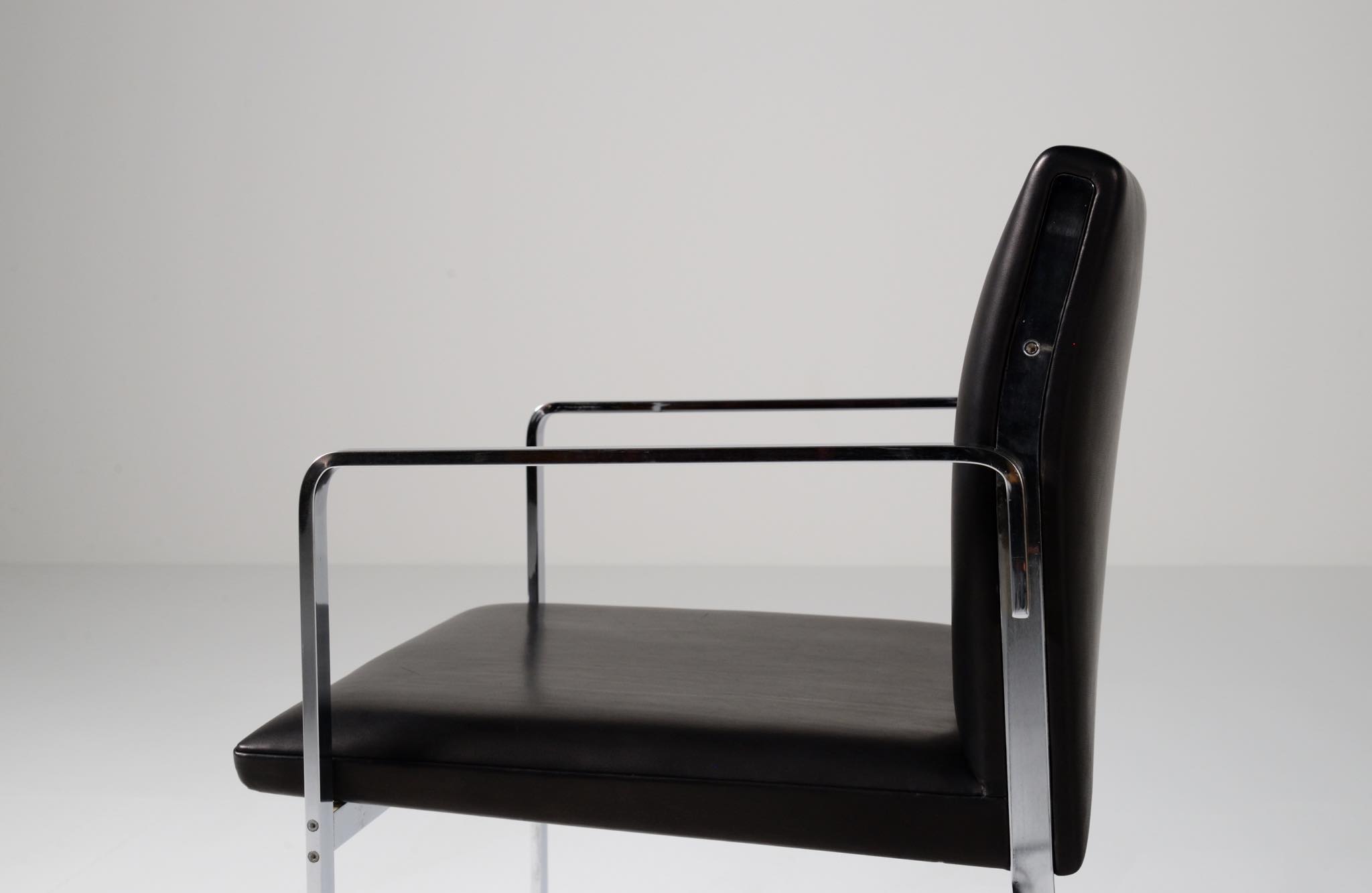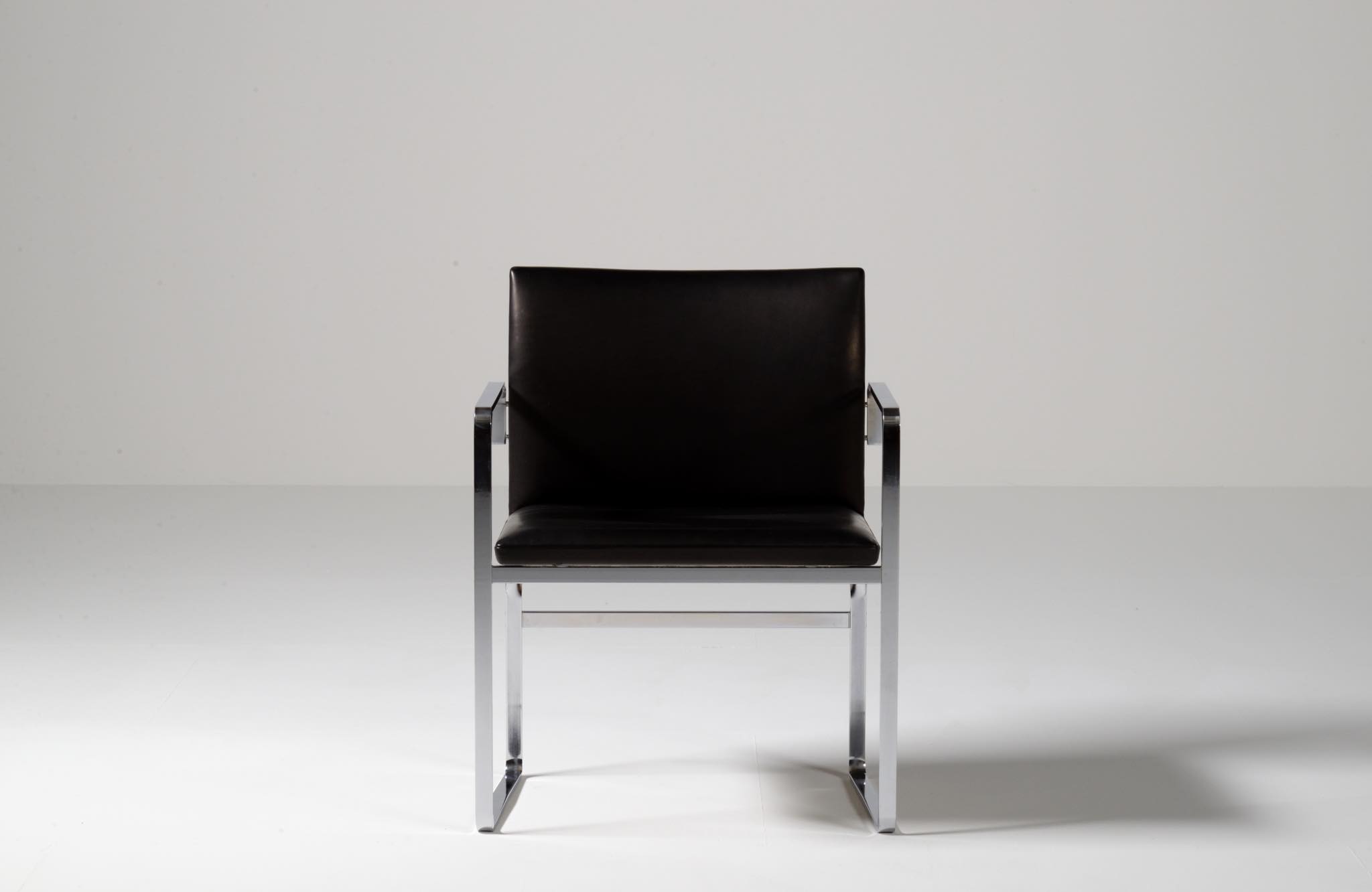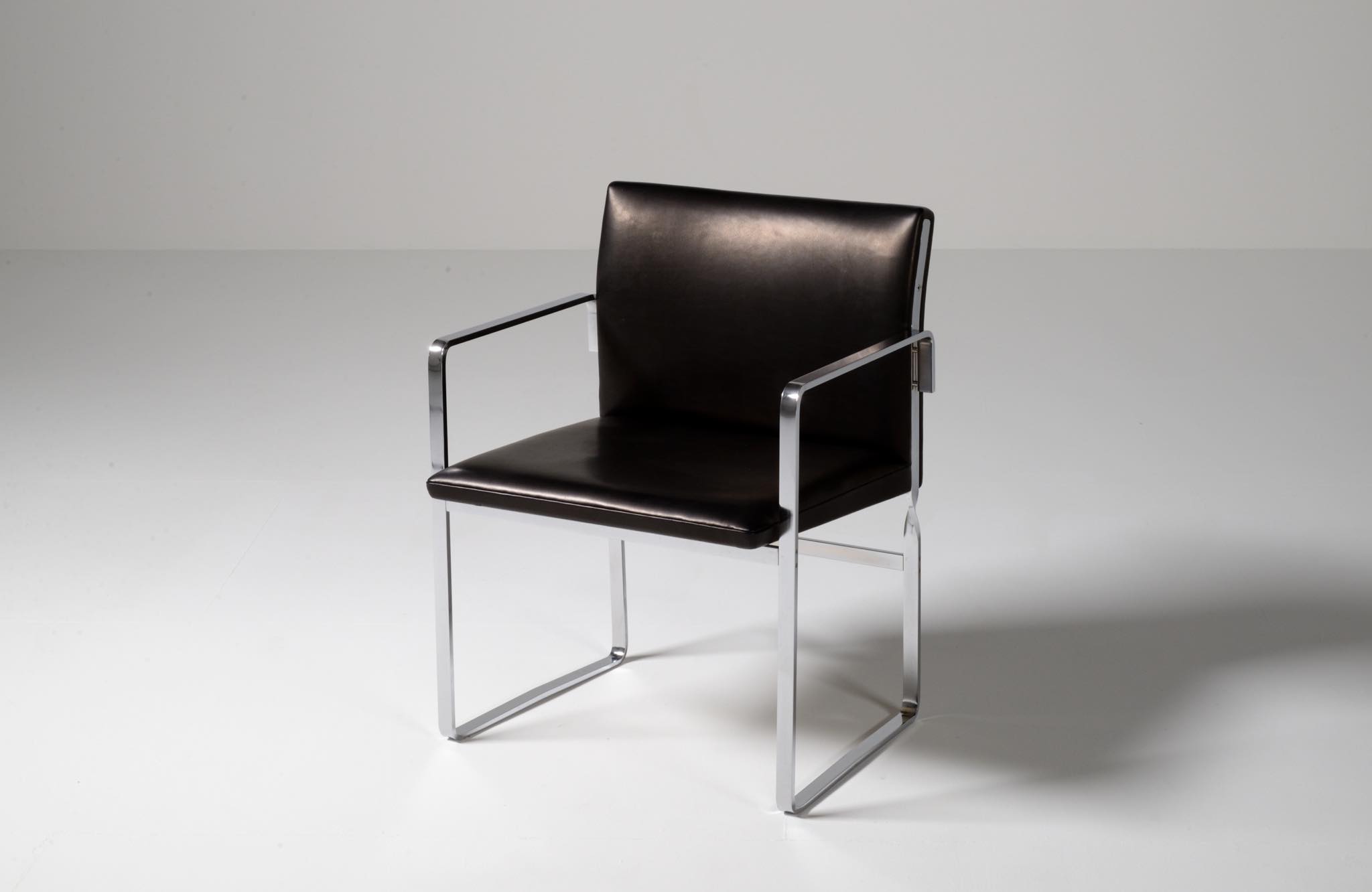 デンマークを代表する家具デザイナーの Hans J. Wegner/ハンス・ウェグナーによる ”JH811” アームチェアです。1970年代に作られたもので、フレームには重厚なクロームドスティールを用いており、後脚から背柱にかけての「捻り」がアクセントとなっています。皮革は新たに張り替えました。スティールの状態などコンディションは良好です。