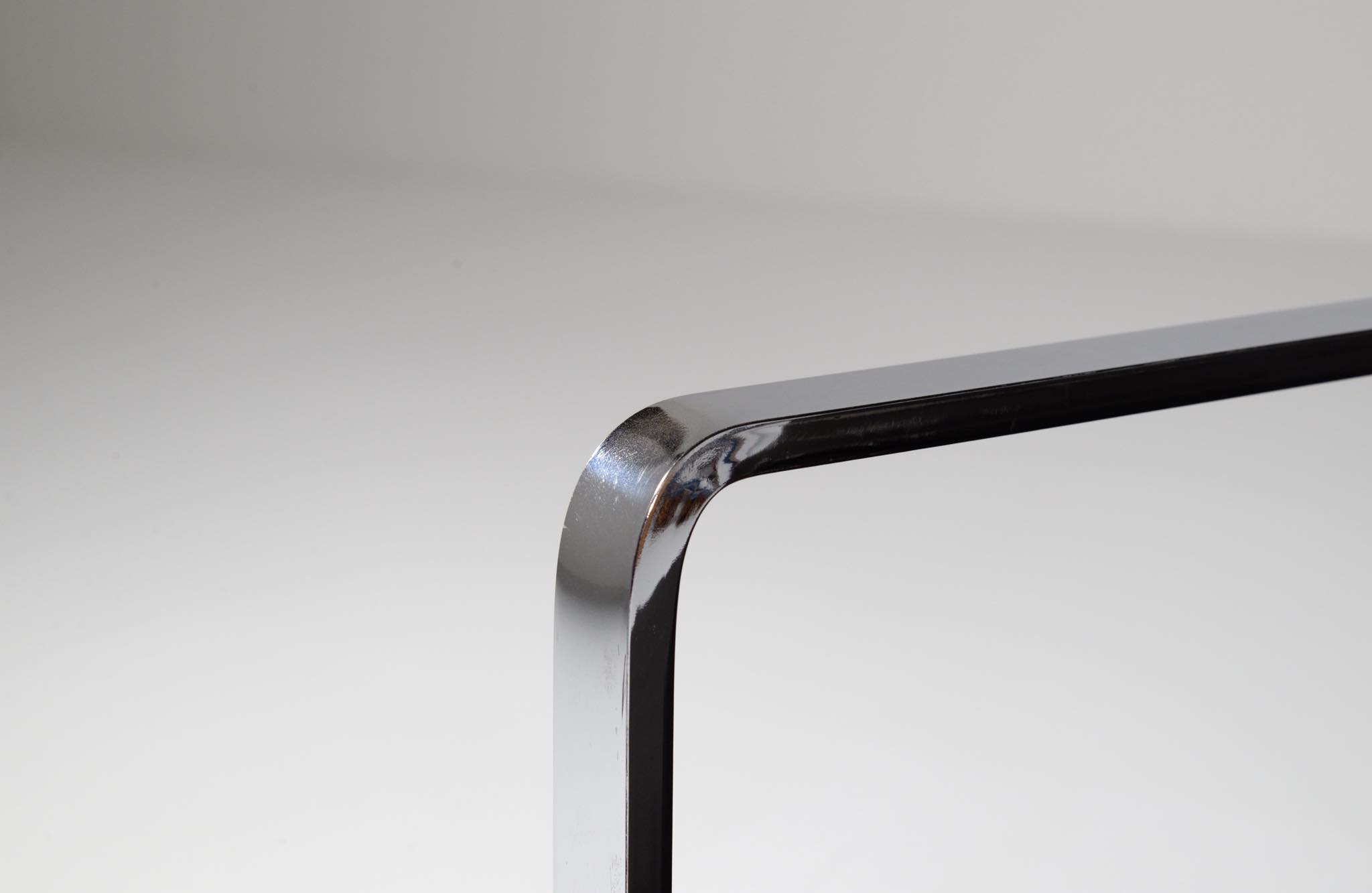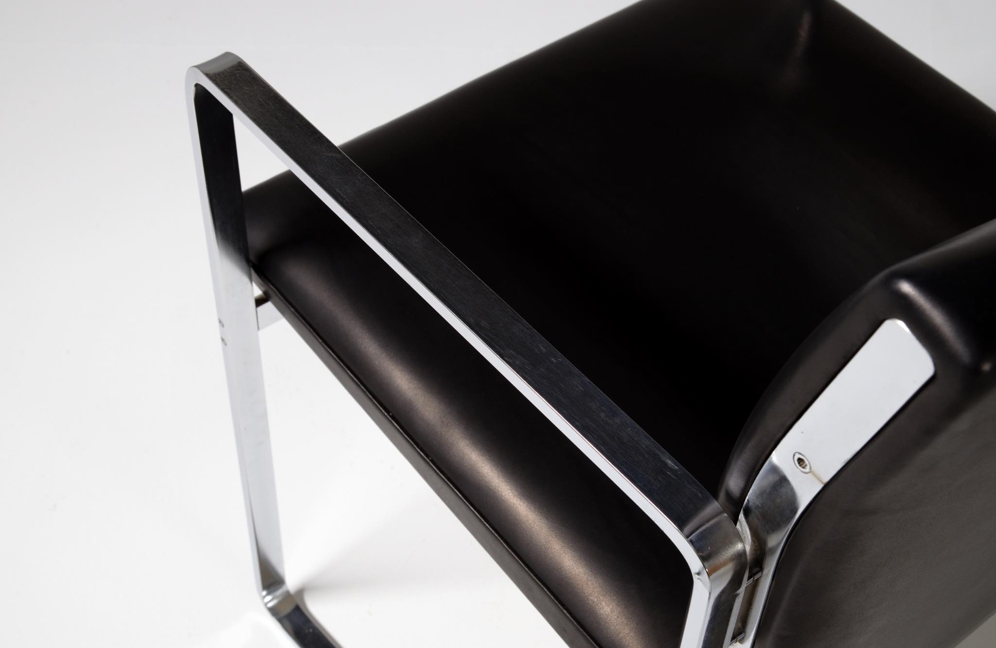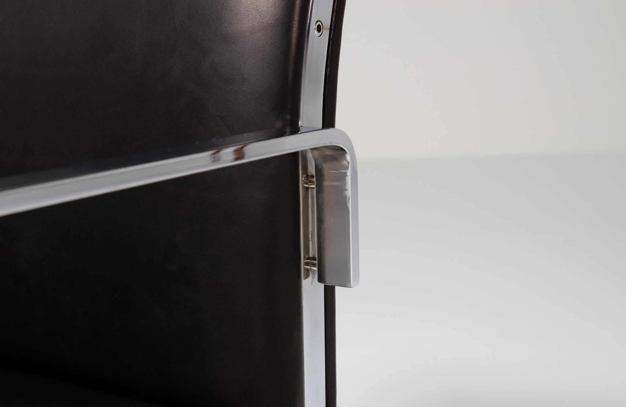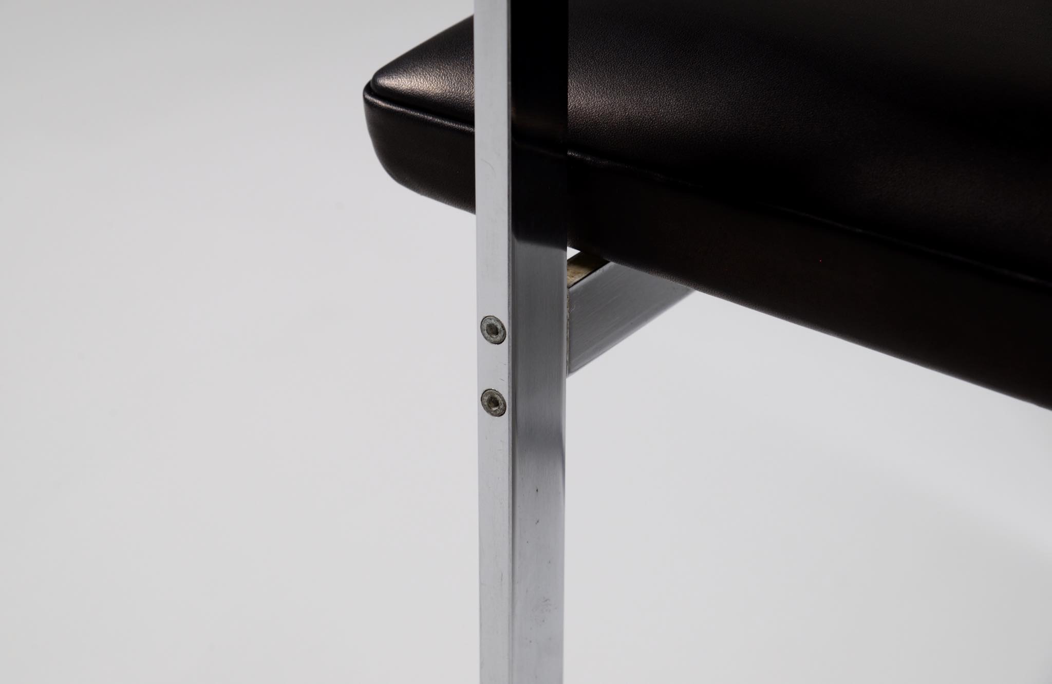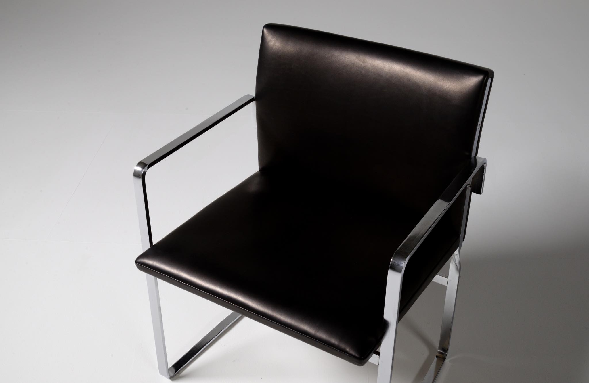 デンマークを代表する家具デザイナーの Hans J. Wegner/ハンス・ウェグナーによる ”JH811” アームチェアです。1970年代に作られたもので、フレームには重厚なクロームドスティールを用いており、後脚から背柱にかけての「捻り」がアクセントとなっています。皮革は新たに張り替えました。スティールの状態などコンディションは良好です。