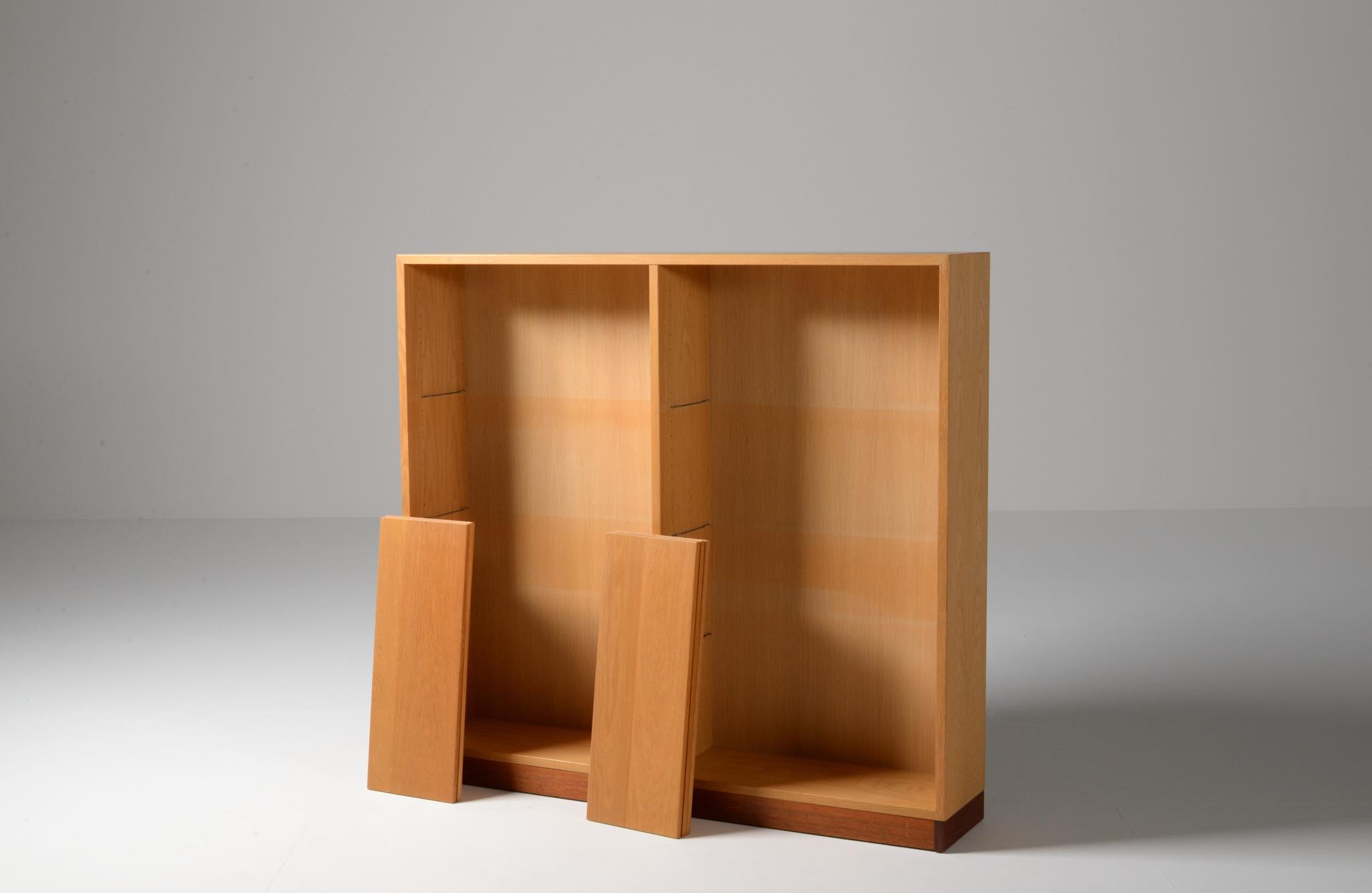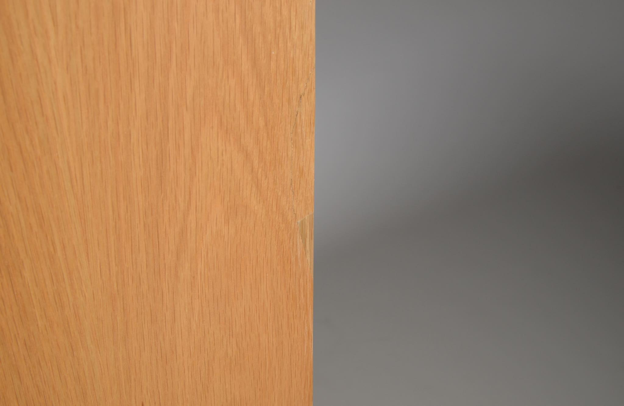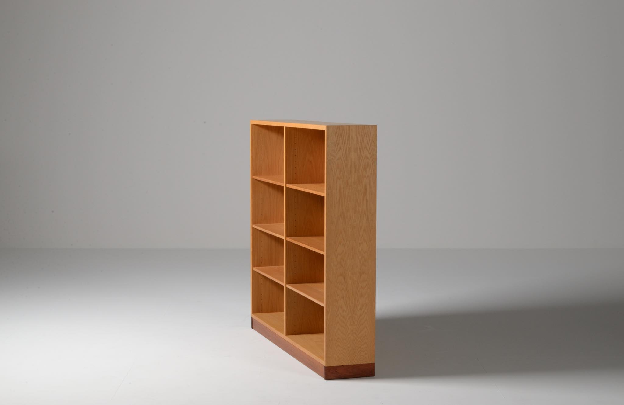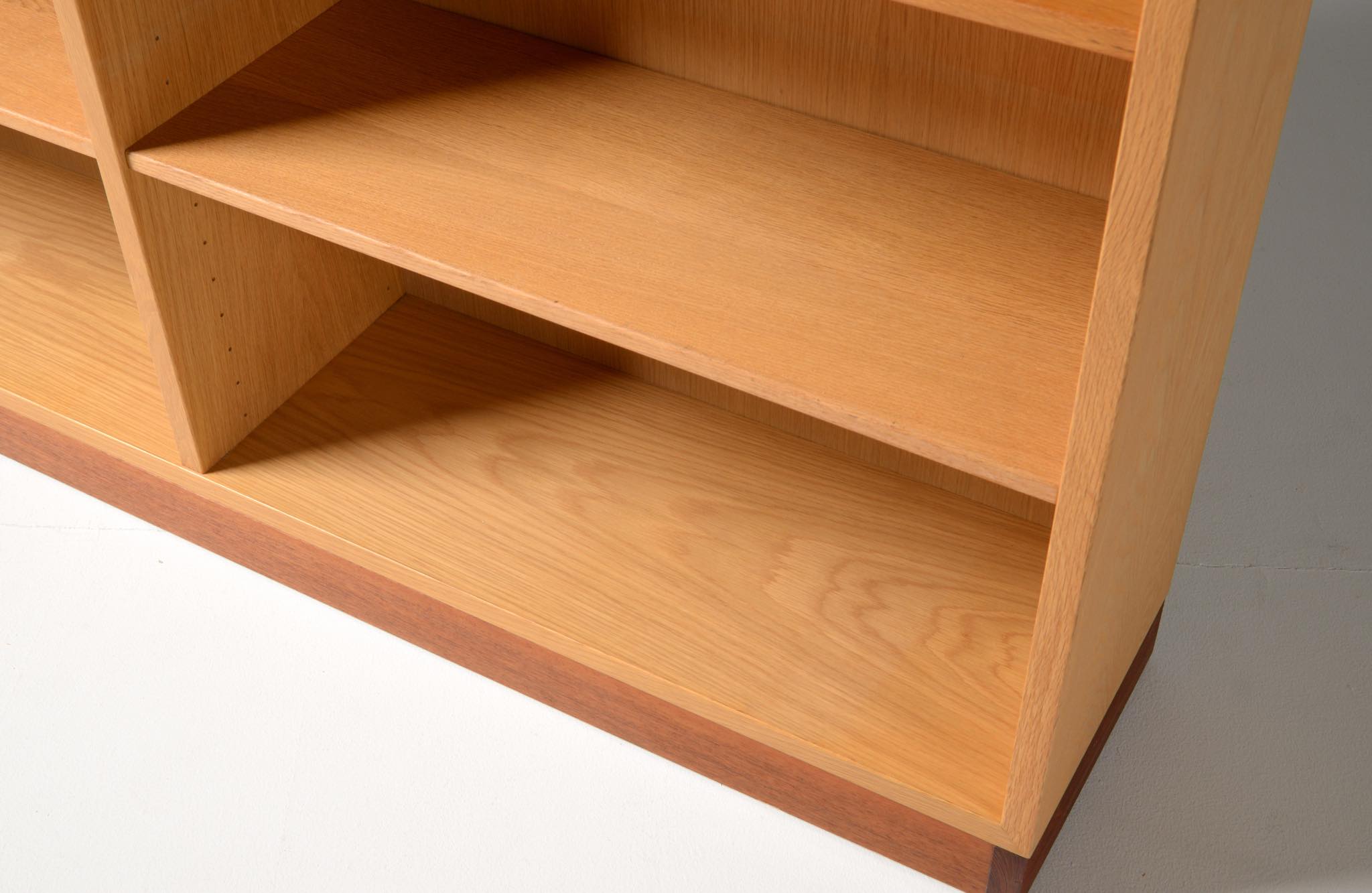 Børge Mogensen/ボーエ・ モーエンセンによる家具シリーズ Øresund/オーレスンのブックケースキャビネットです。1955年発表のこのシリーズは、スウェーデンの工房 Karl Andersson and Söner社によって近年まで生産されていました。デンマークのシェラン島から対岸のスウェーデンを望むエーレ海峡/Øresund にちなんで名付けられたそうで、オーク材の持つナチュラルで爽やかな雰囲気が印象的な家具です。当時選択のオプションがあったようで、オーク材の本体に対しチーク材のベースが備わるツートーン仕様となっています。コンディションですが、ブックシェルフ内部に日焼け退色があります。また、向かって右側面に突板の補修がありますが、全体に使用感少なく綺麗な状態です。